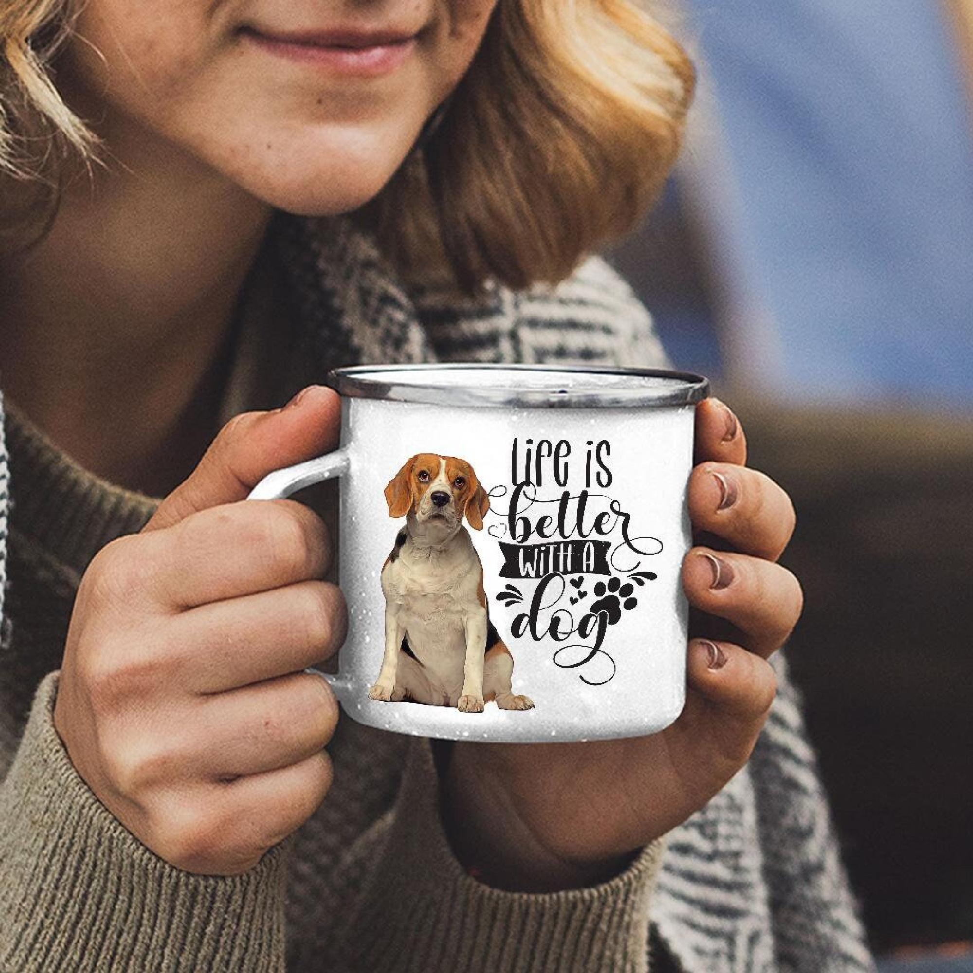 The enamel beagle camping mug features a sublimation-ready coating, which allows for vivid, full-color printing. This gives every beagle campfire mug a unique and eye-catching look, perfect for your adventures.