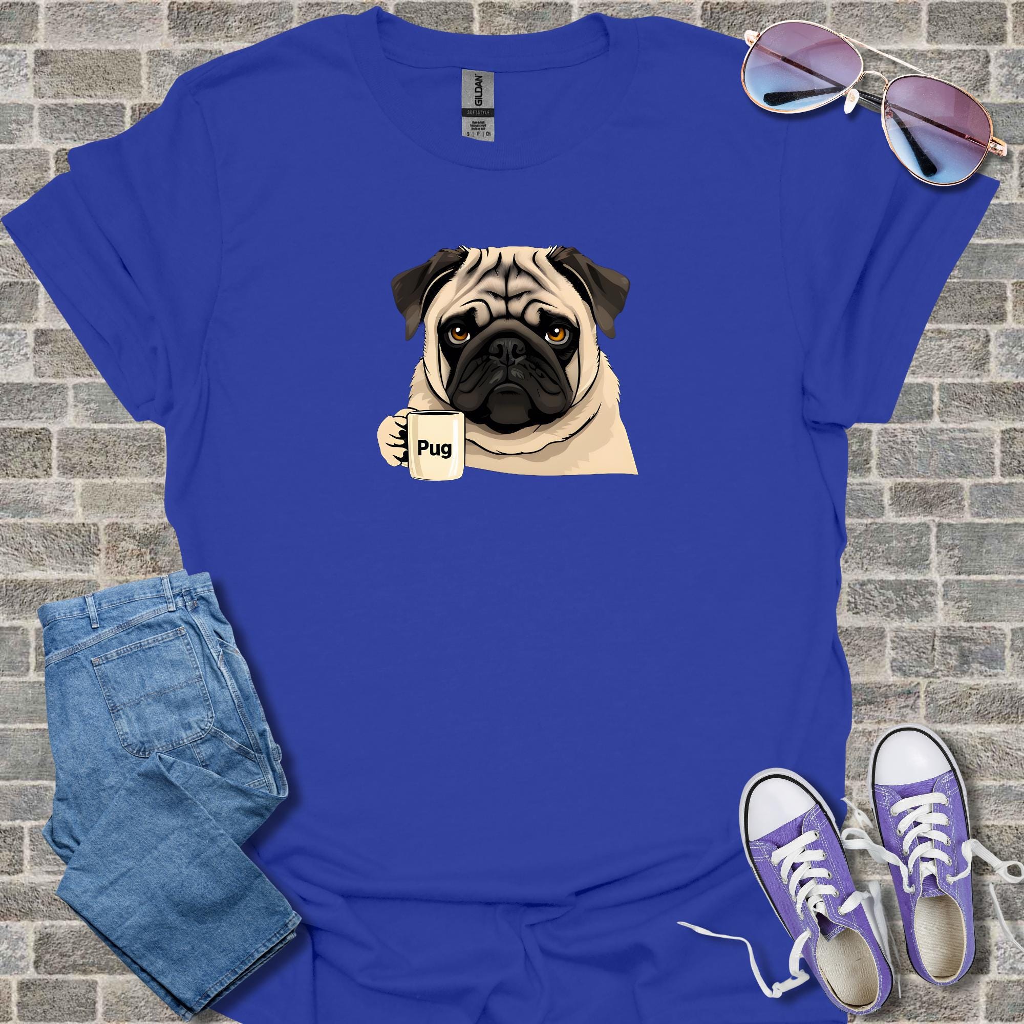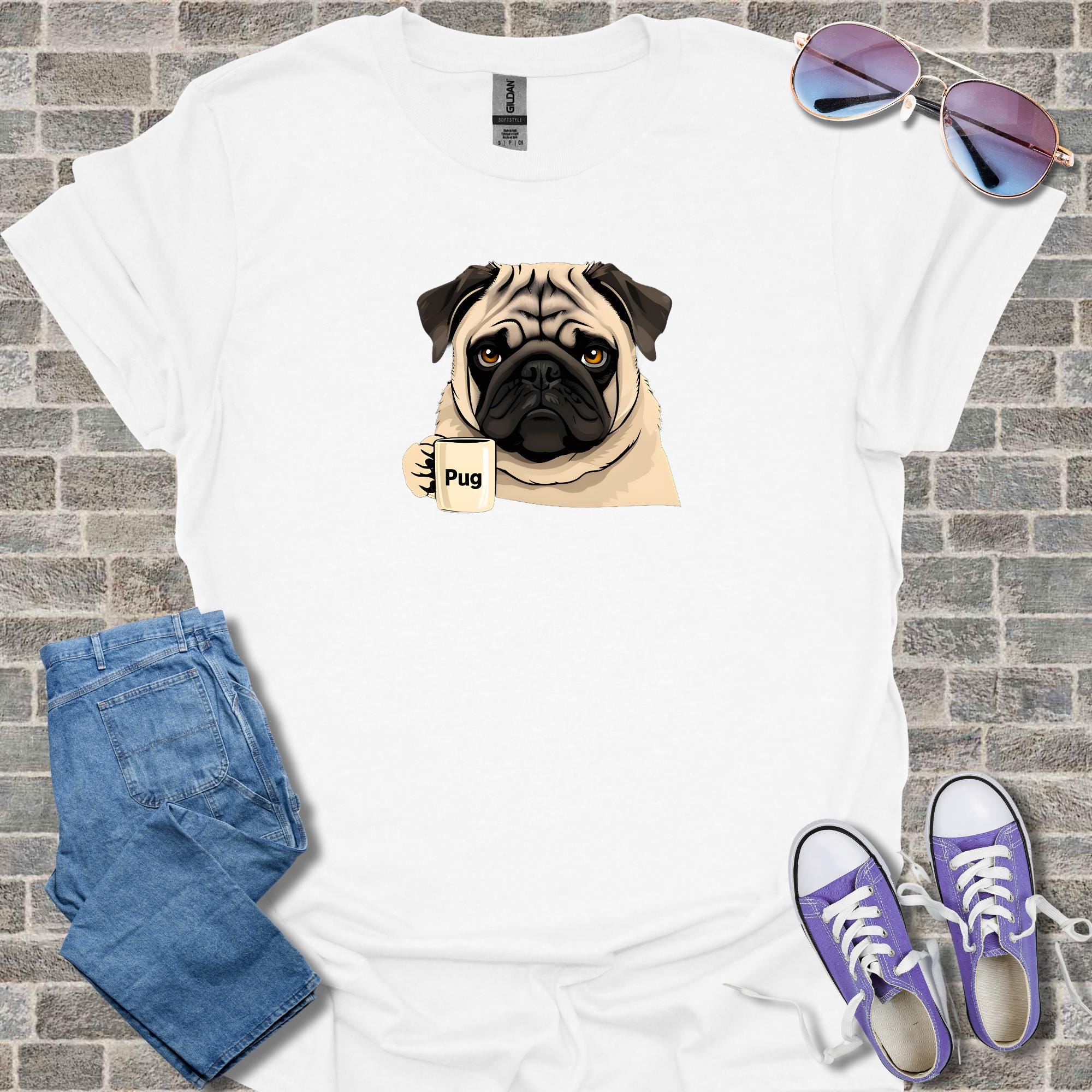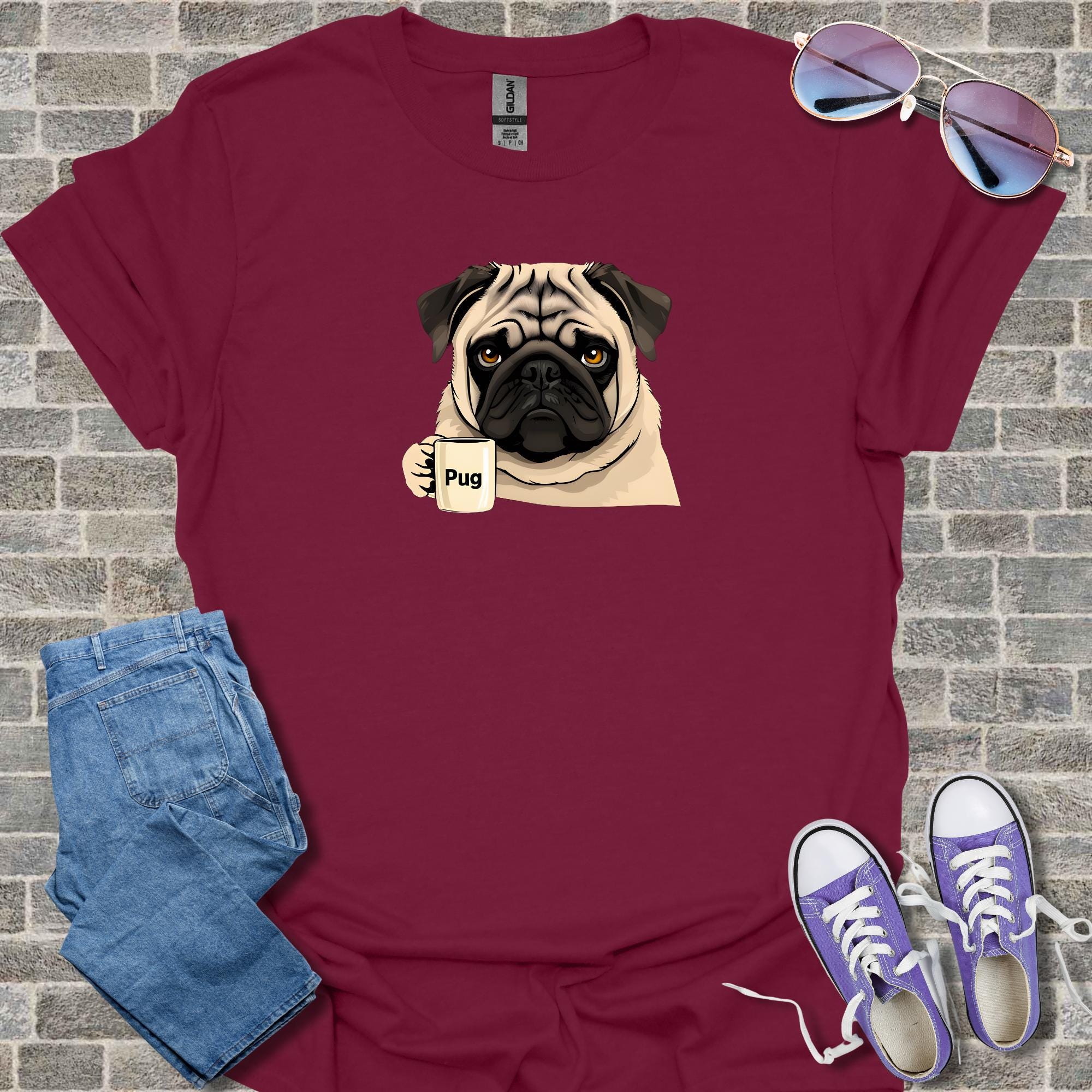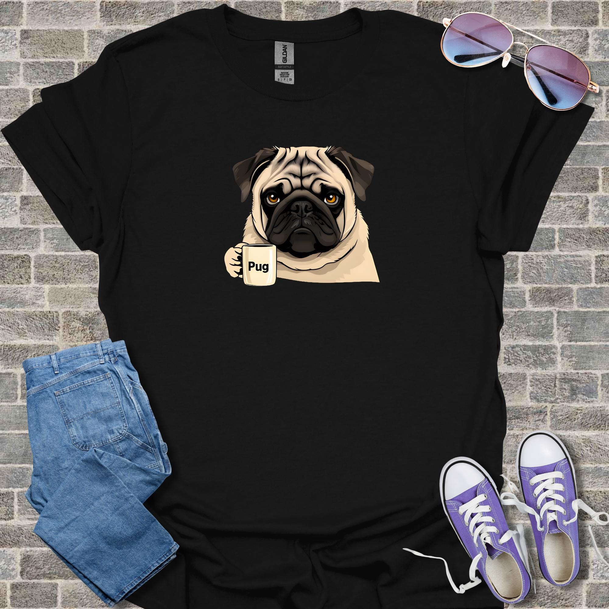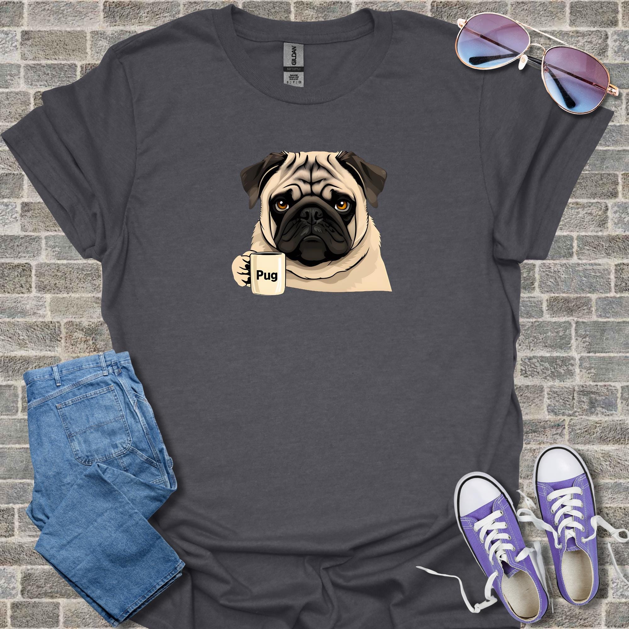 Celebrate the holiday season with this adorable pug Christmas shirt featuring a cute puppy and coffee theme design that makes a perfect funny gift for dog lovers. This cotton tee offers casual style winter wear in a festive holiday design, available as unisex apparel for comfortable everyday use.