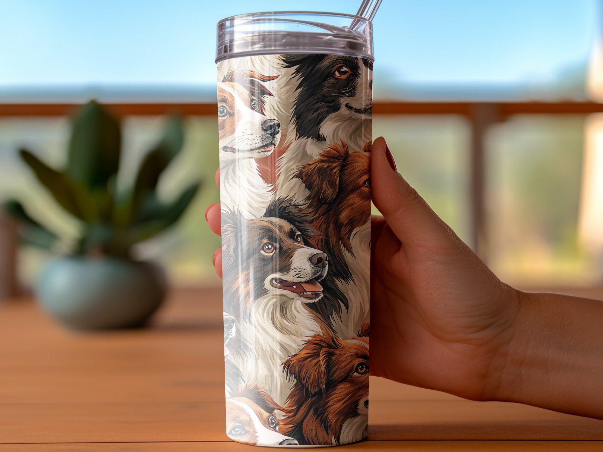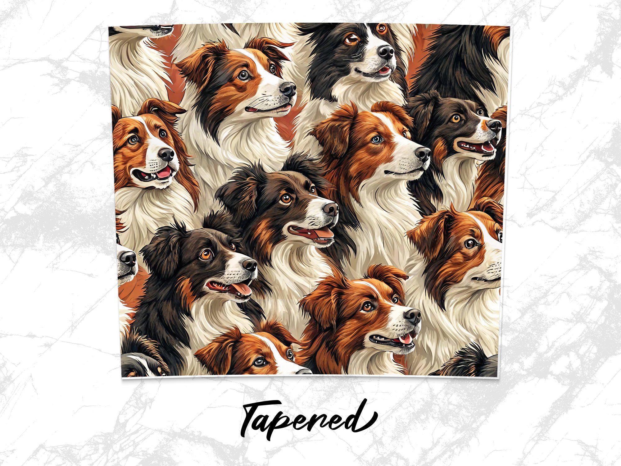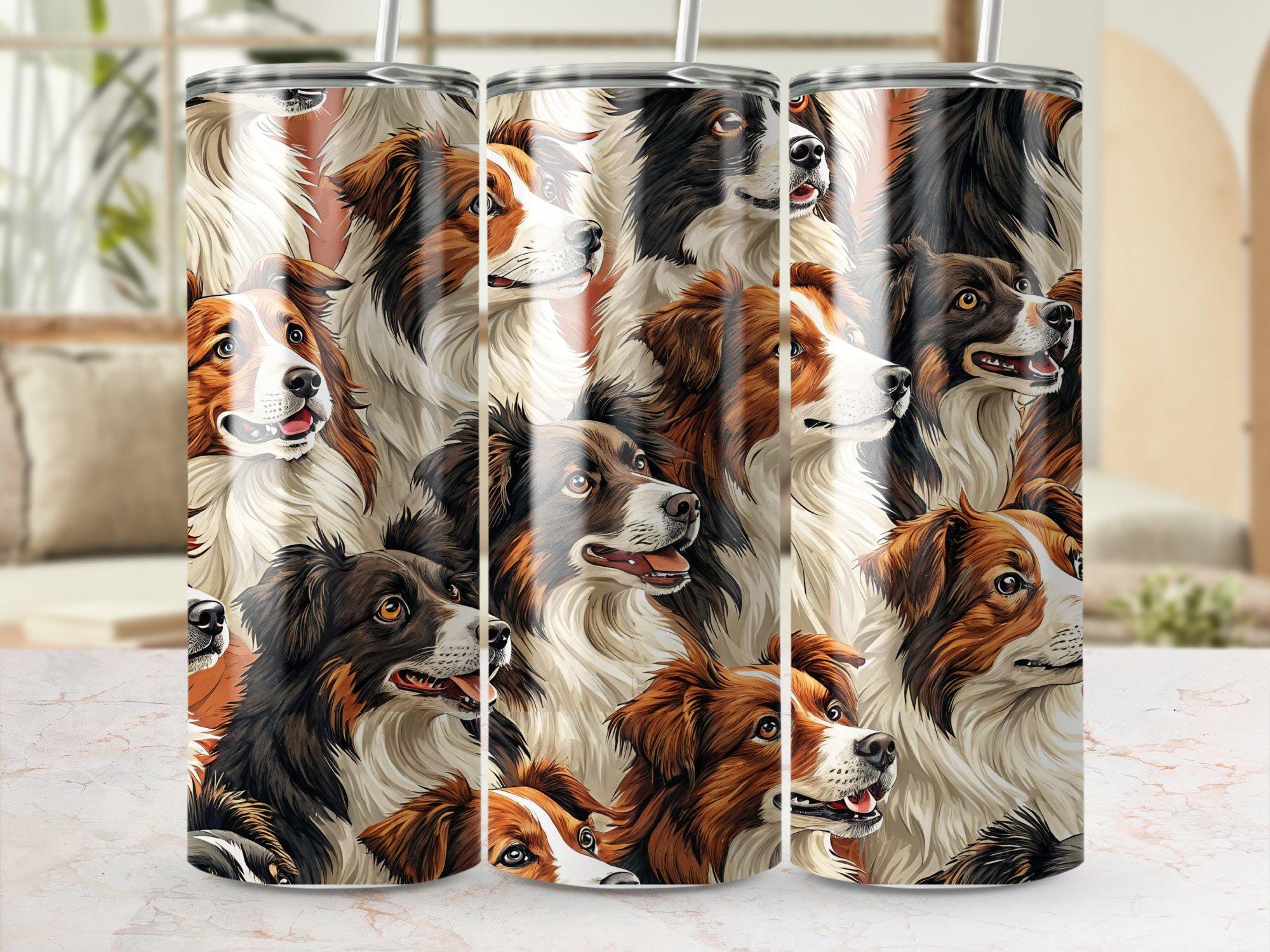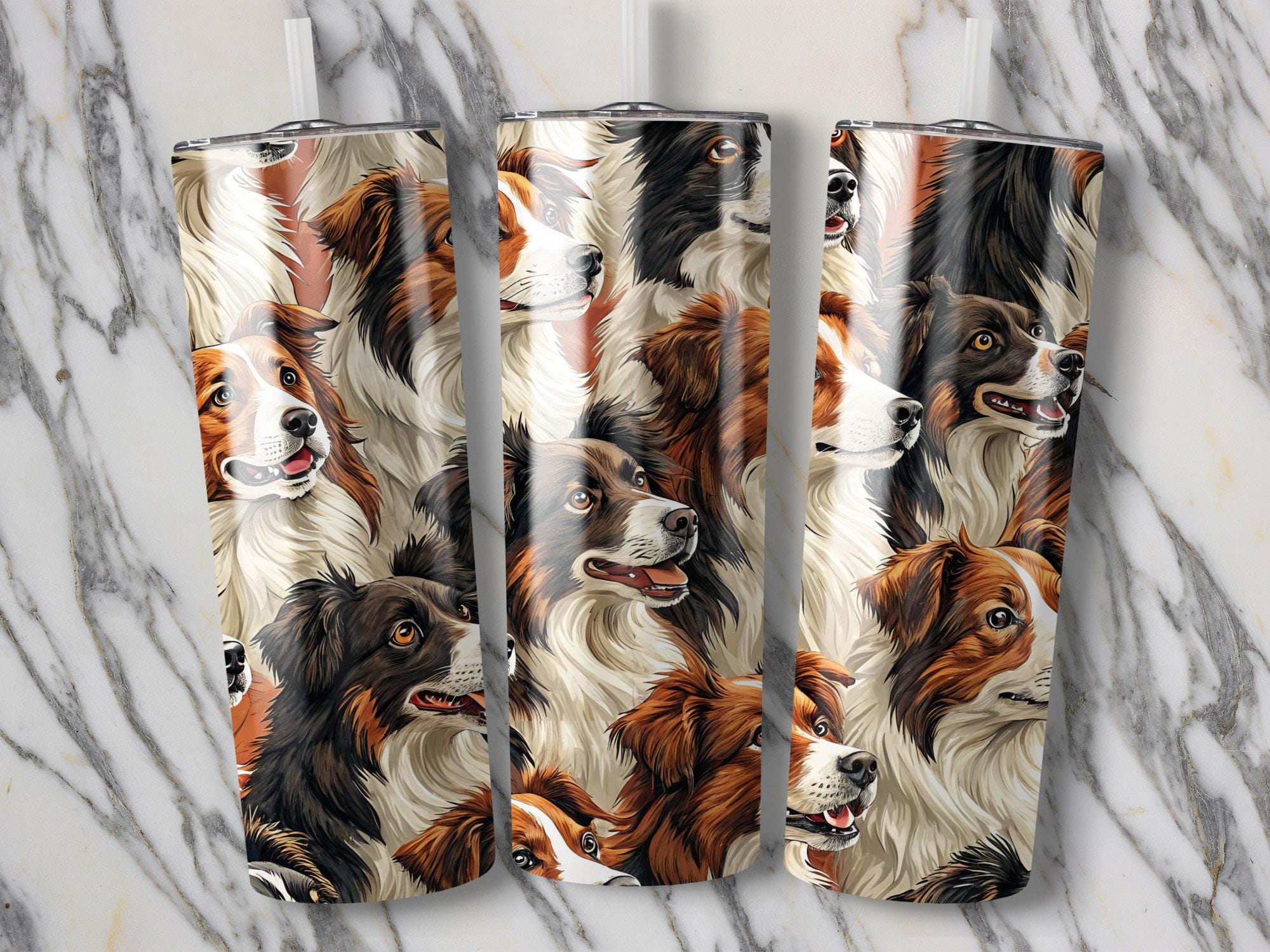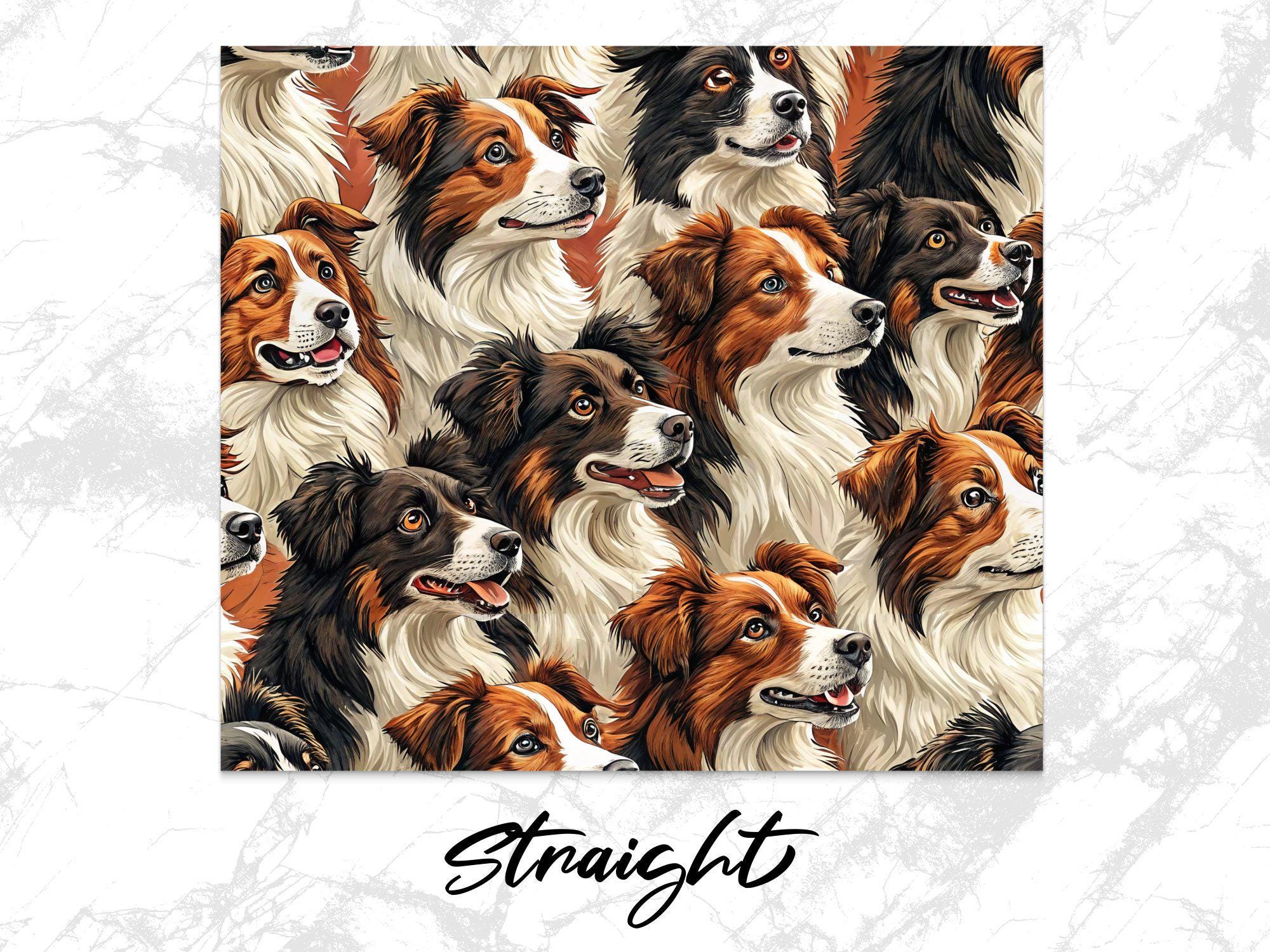 Elevate your tumbler game with this adorable Border Collie themed wrap. This design features a seamless pattern of majestic Border Collie portraits, perfect for dog lovers and pet enthusiasts alike.