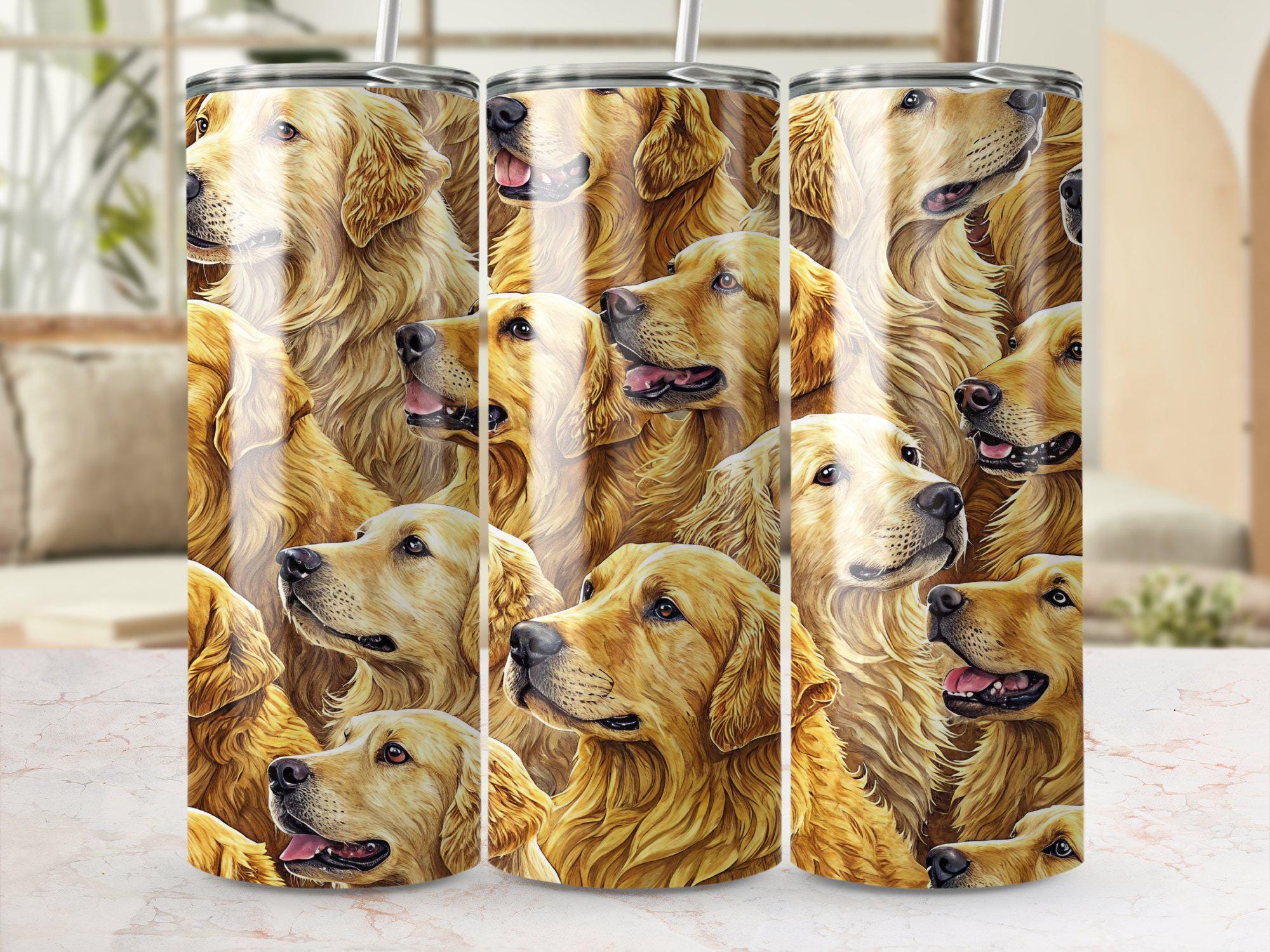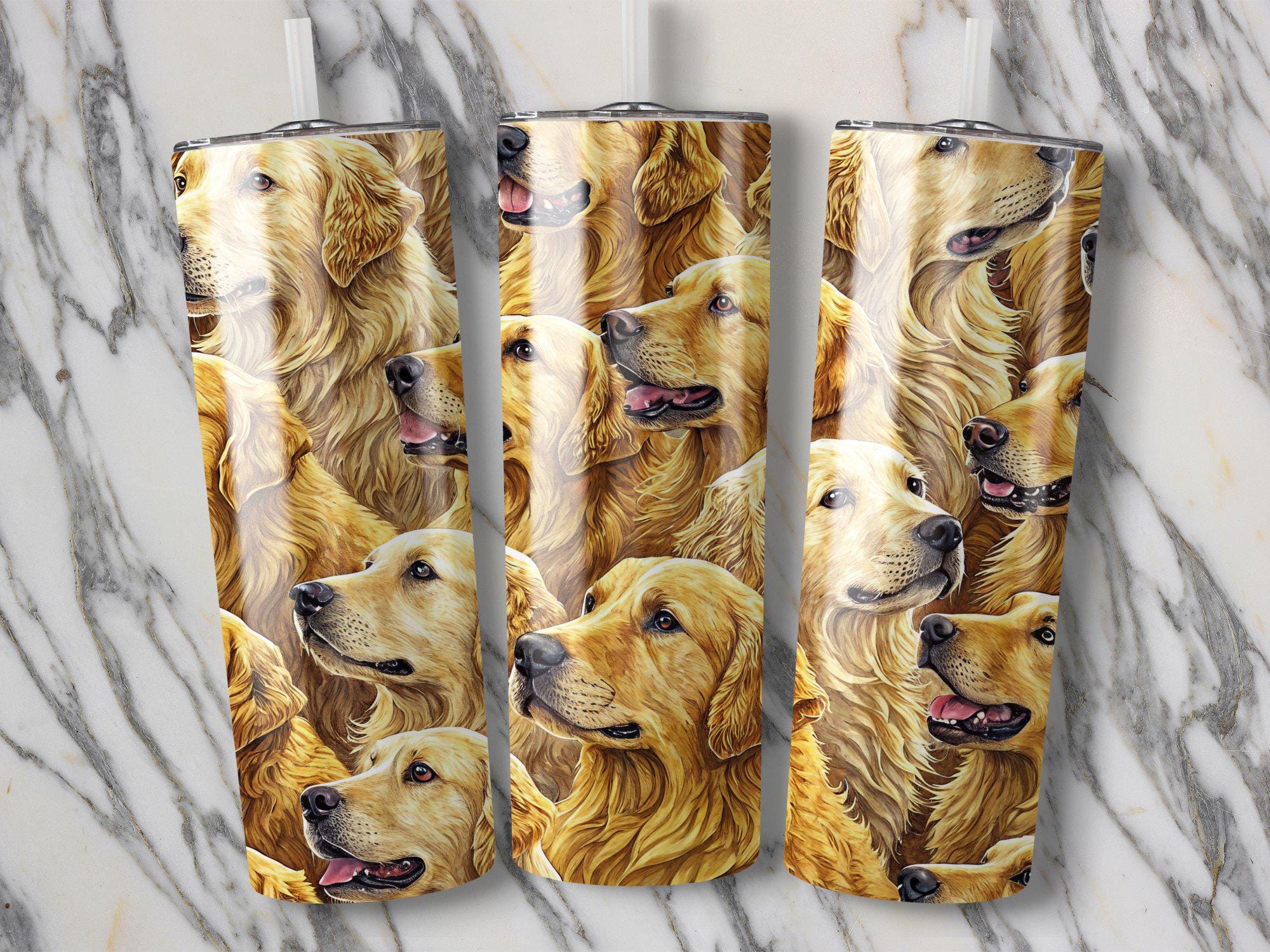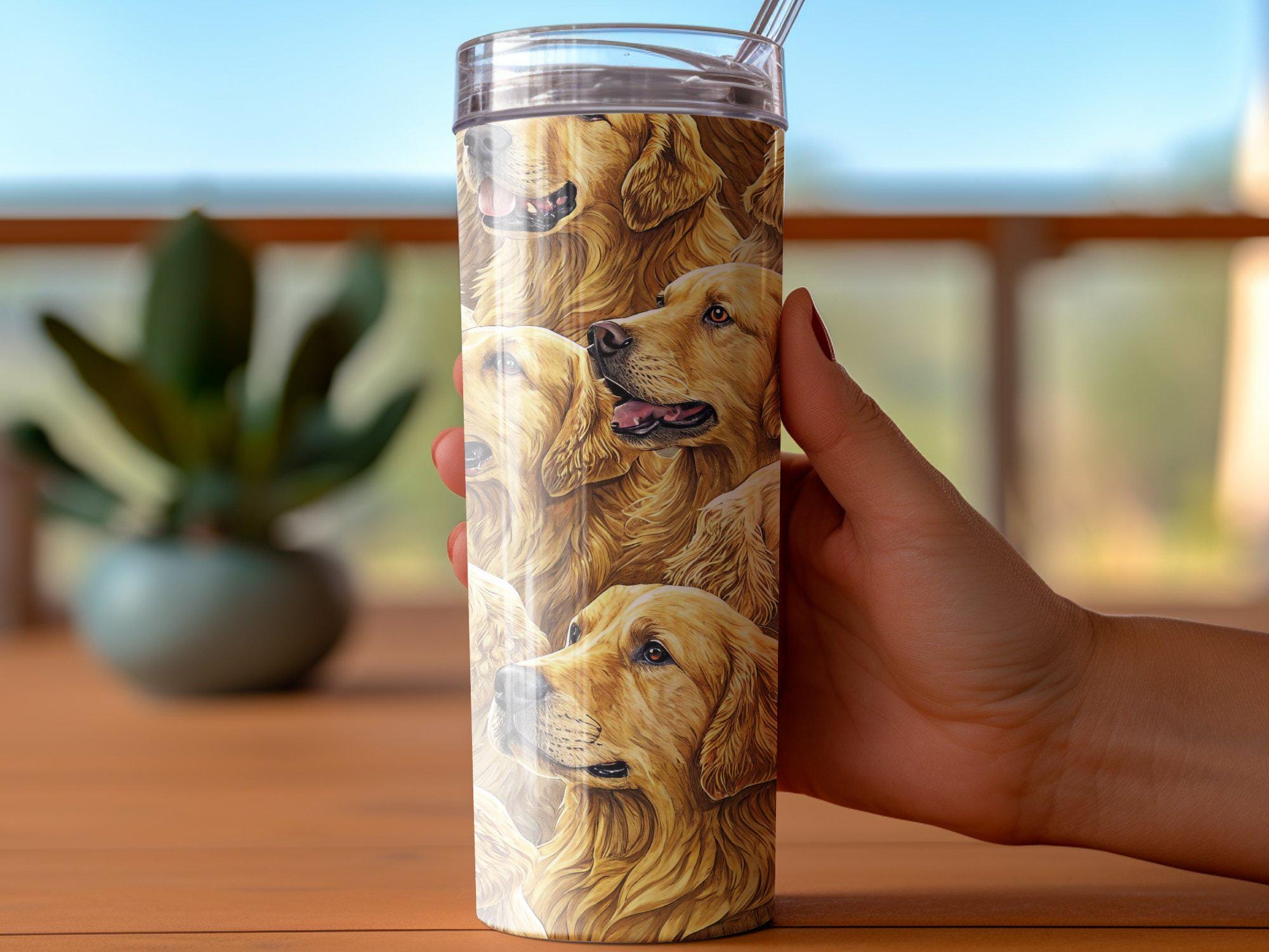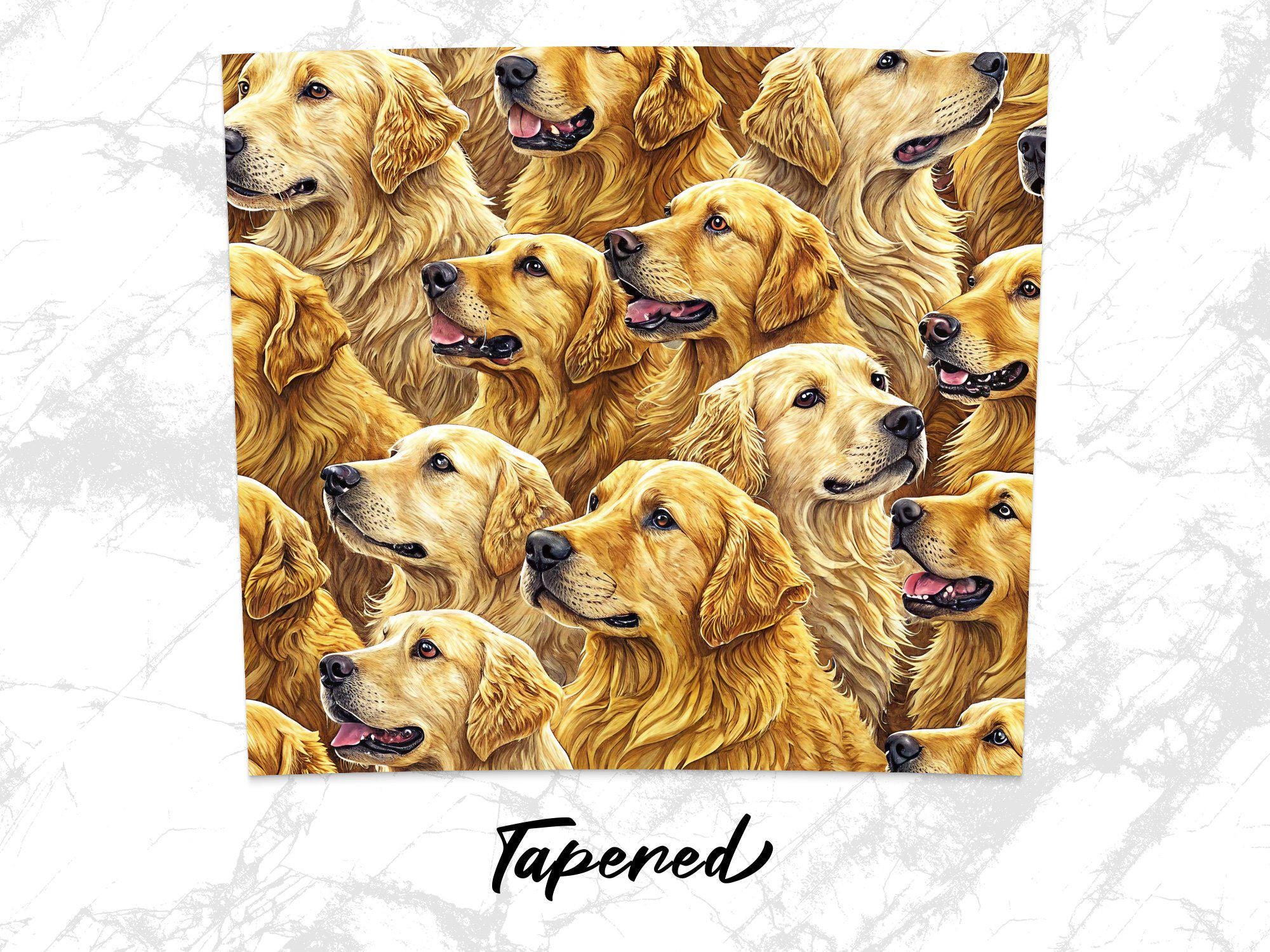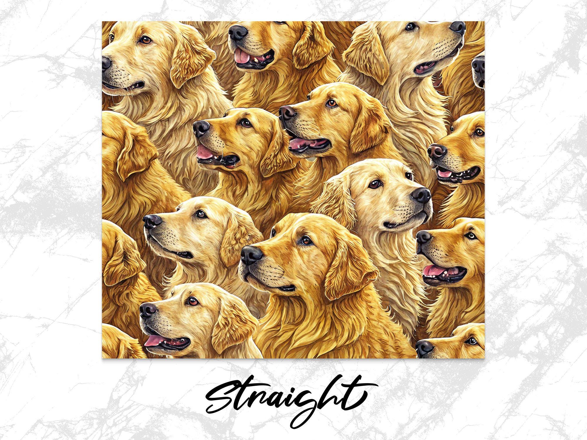 This tumbler wrap features a repeating pattern of Golden Retriever dogs. The design is perfect for dog lovers and can be used to create personalized tumblers. The high resolution PNG file is easy to use and can be resized to fit your needs. It is a great way to show off your love for Golden Retrievers.