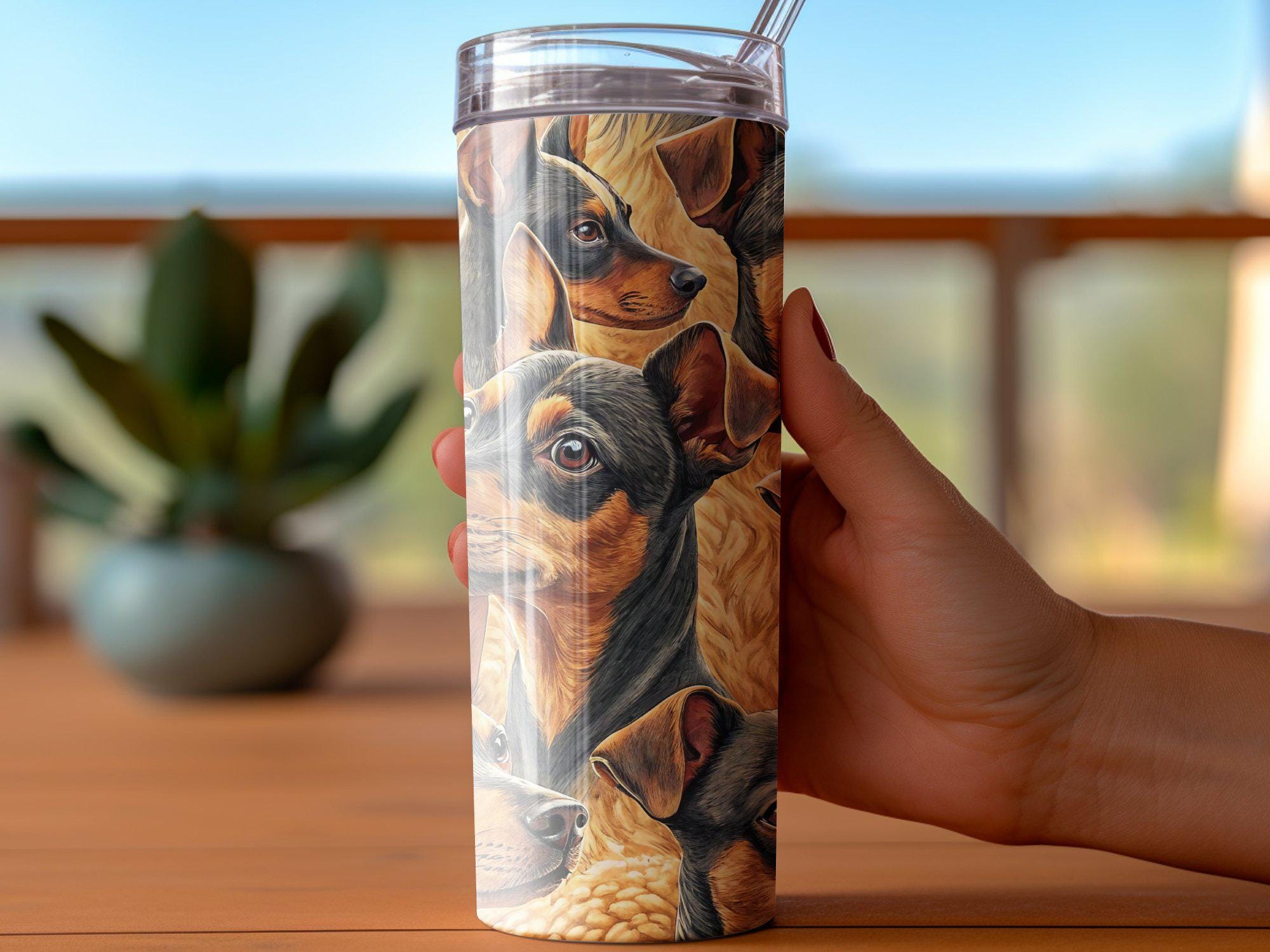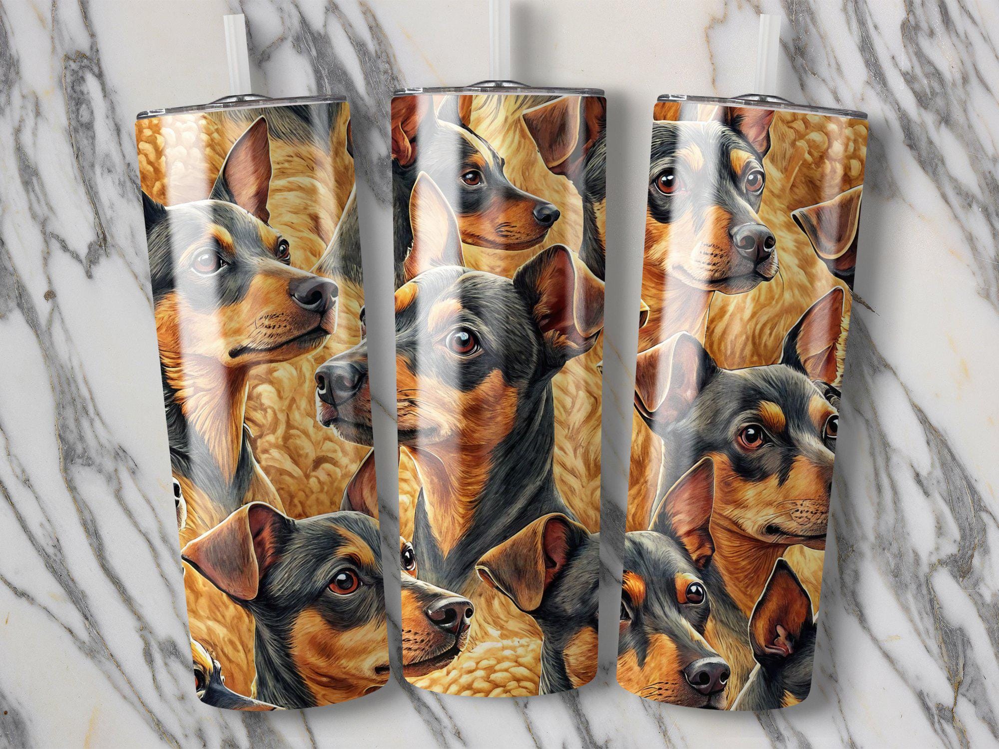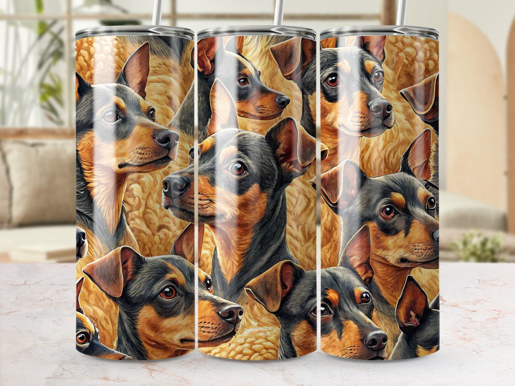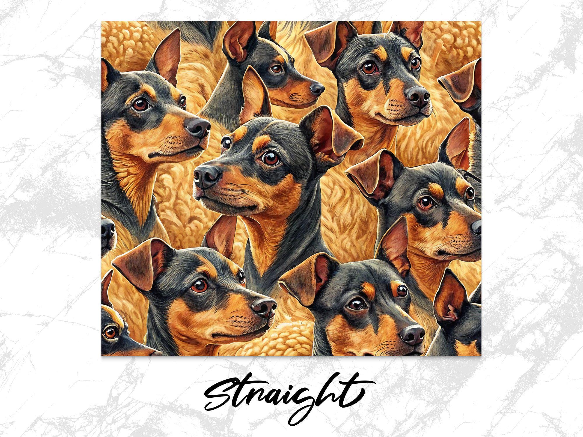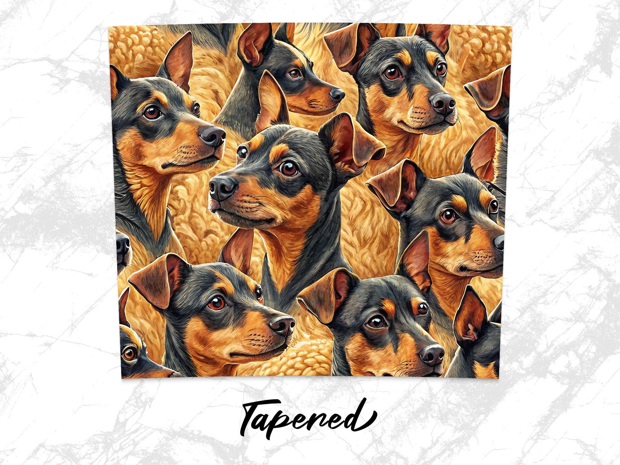 This listing features a beautiful tumbler wrap design perfect for creating personalized gifts or adding a unique touch to your own drinkware. The design showcases a captivating pattern of Miniature Pinscher dogs, offering a delightful and eye catching aesthetic. Ideal for dog lovers and anyone who appreciates intricate and artistic designs.
