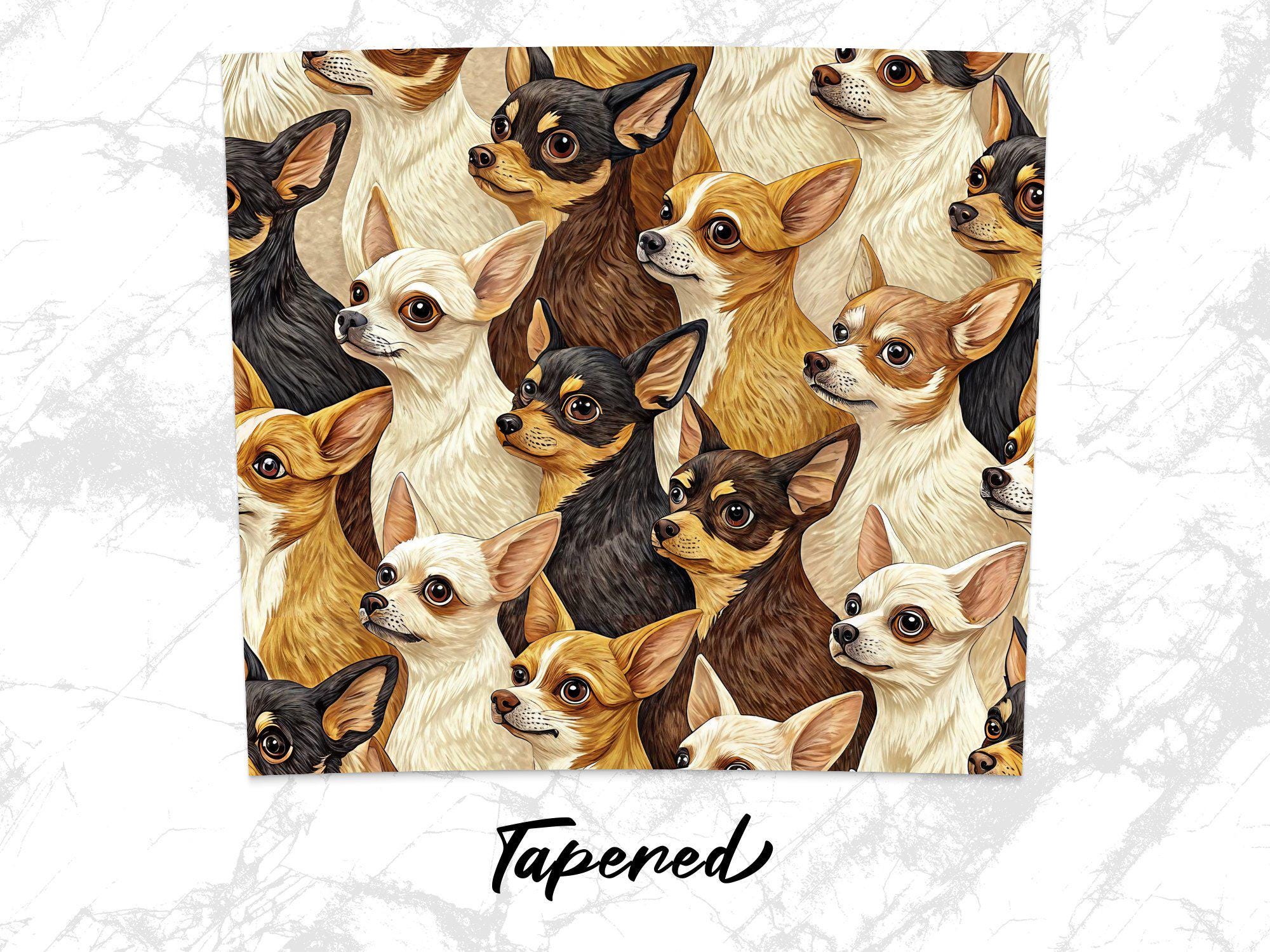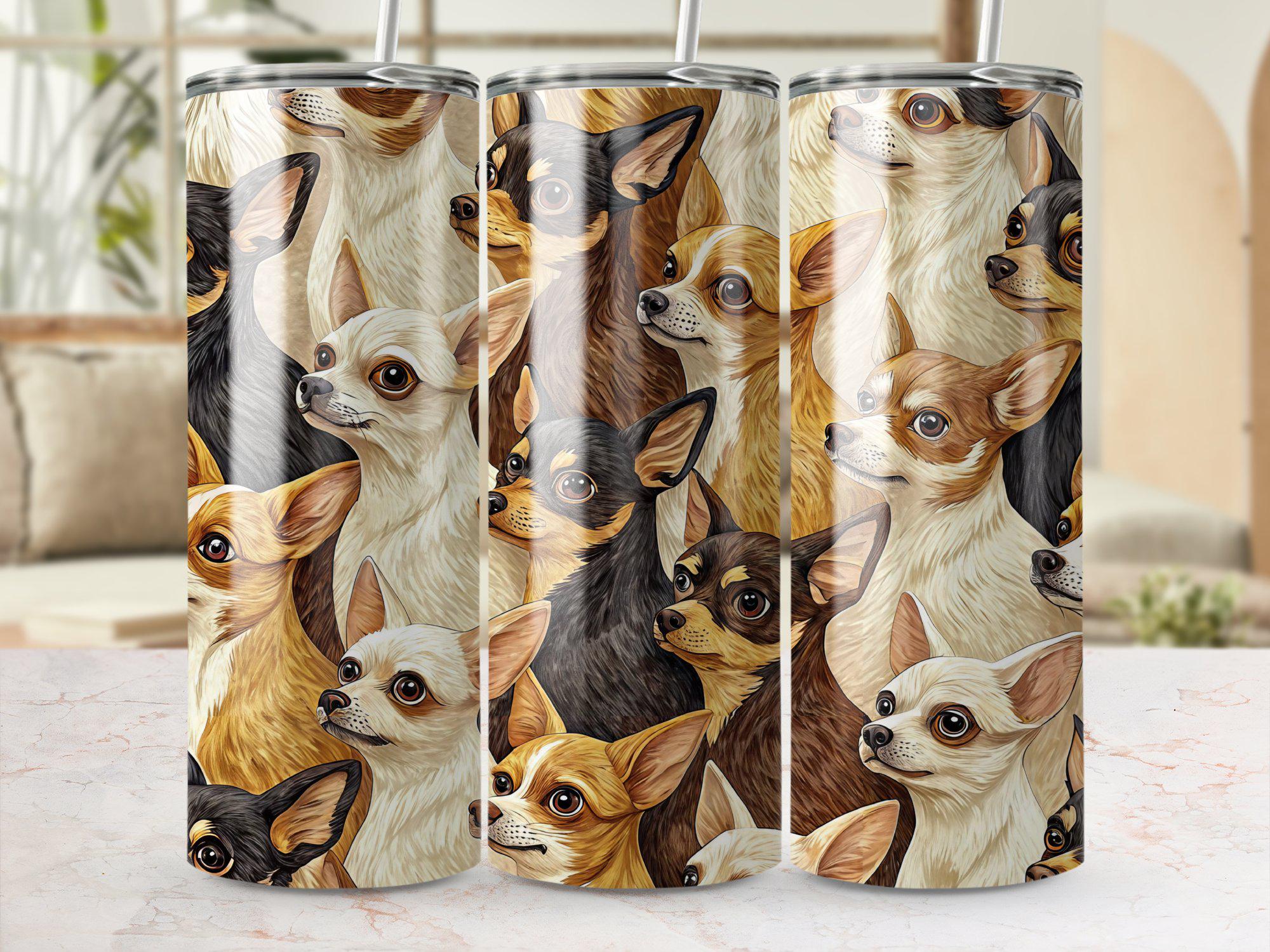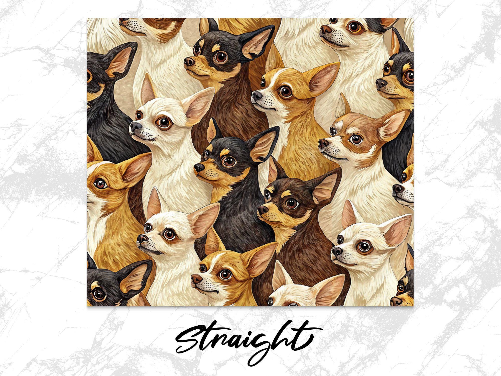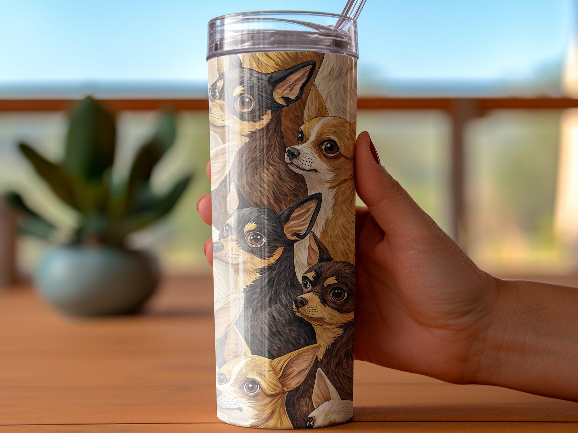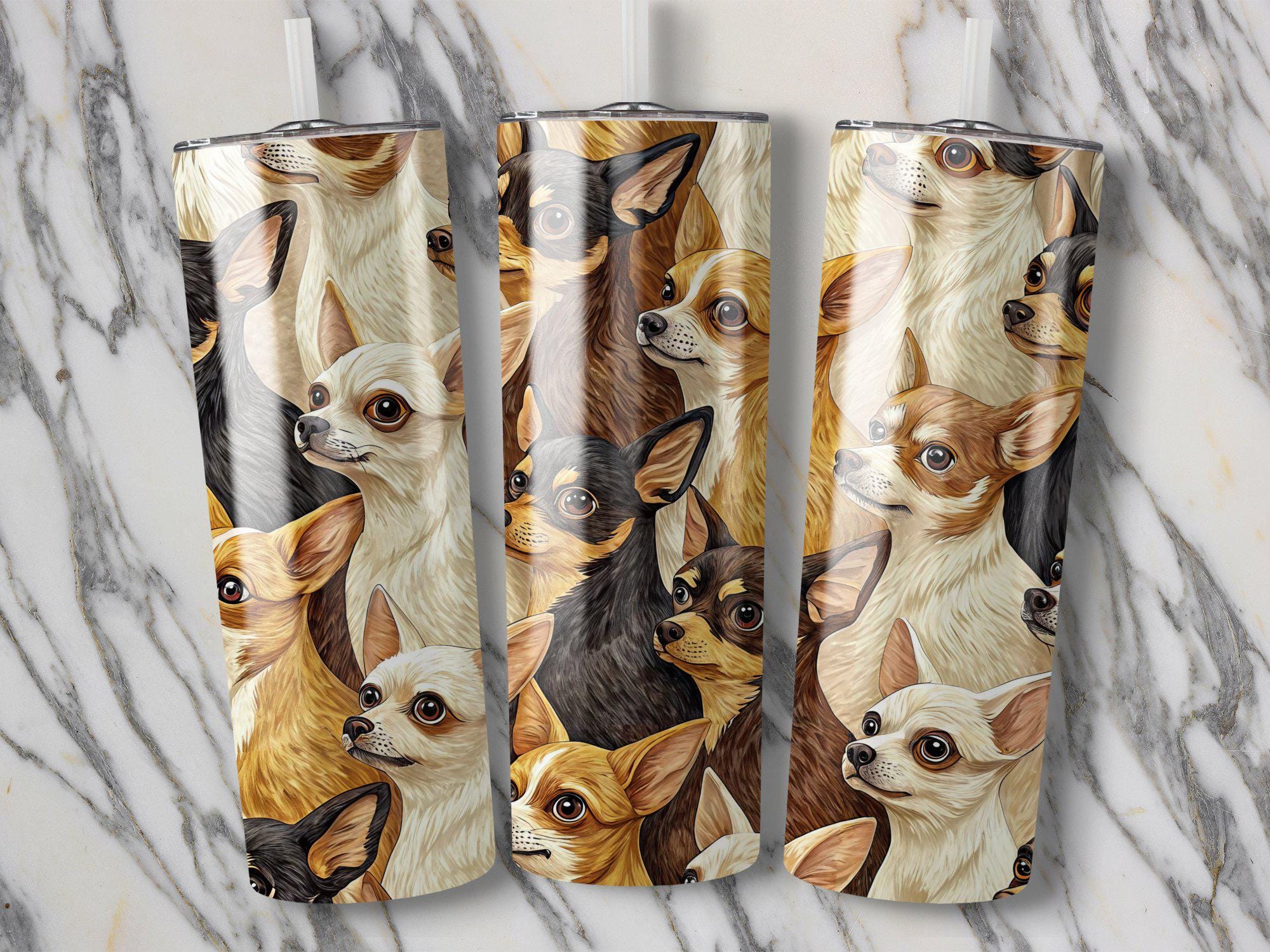 This delightful Chihuahua Tumbler Wrap features a charming collection of Chihuahua dogs in various coat colors and patterns, perfect for any dog lover. This 20oz skinny tumbler PNG design is ready for sublimation, allowing you to create a personalized and unique gift. The high resolution ensures a vibrant and detailed print every time.