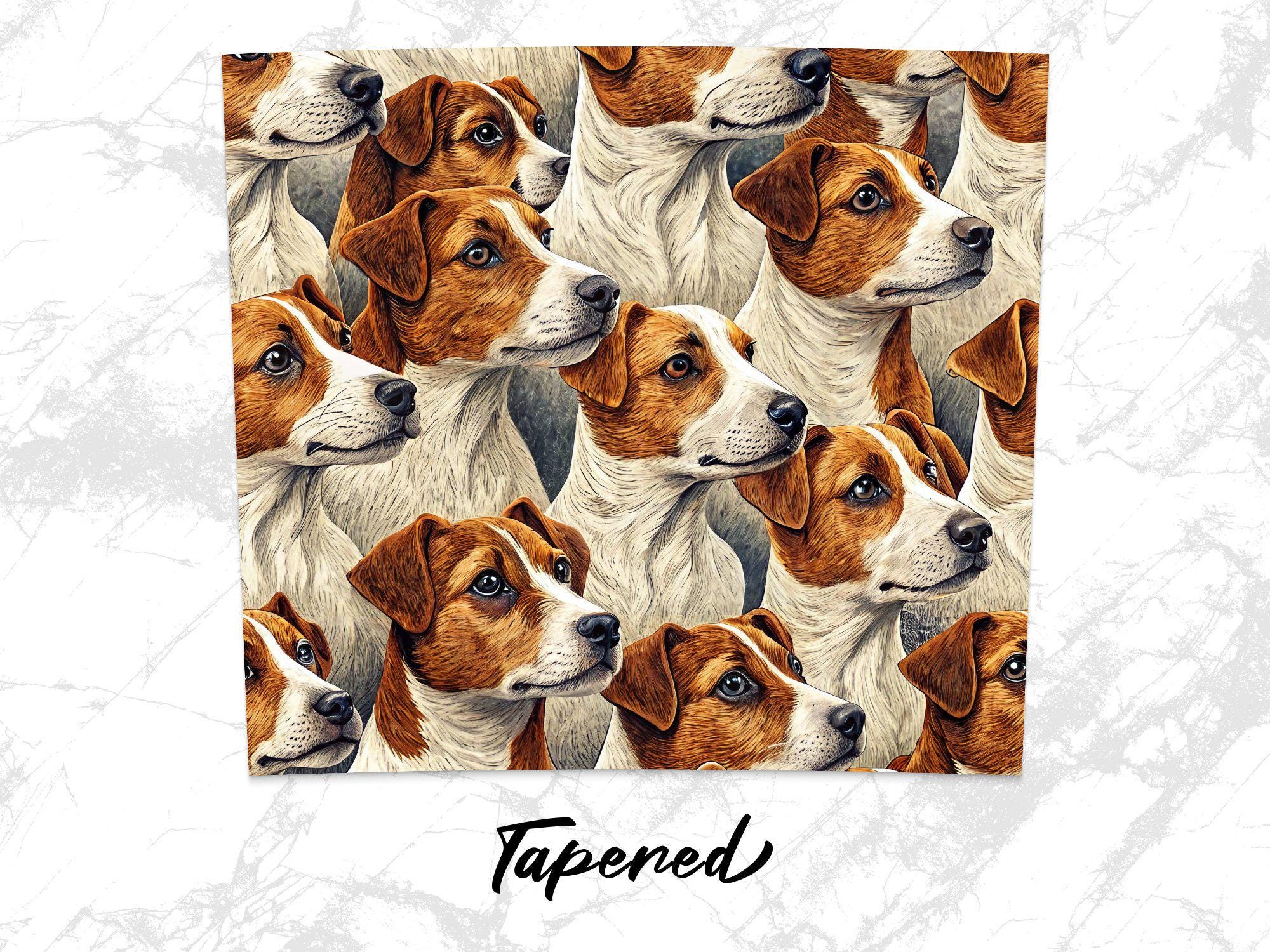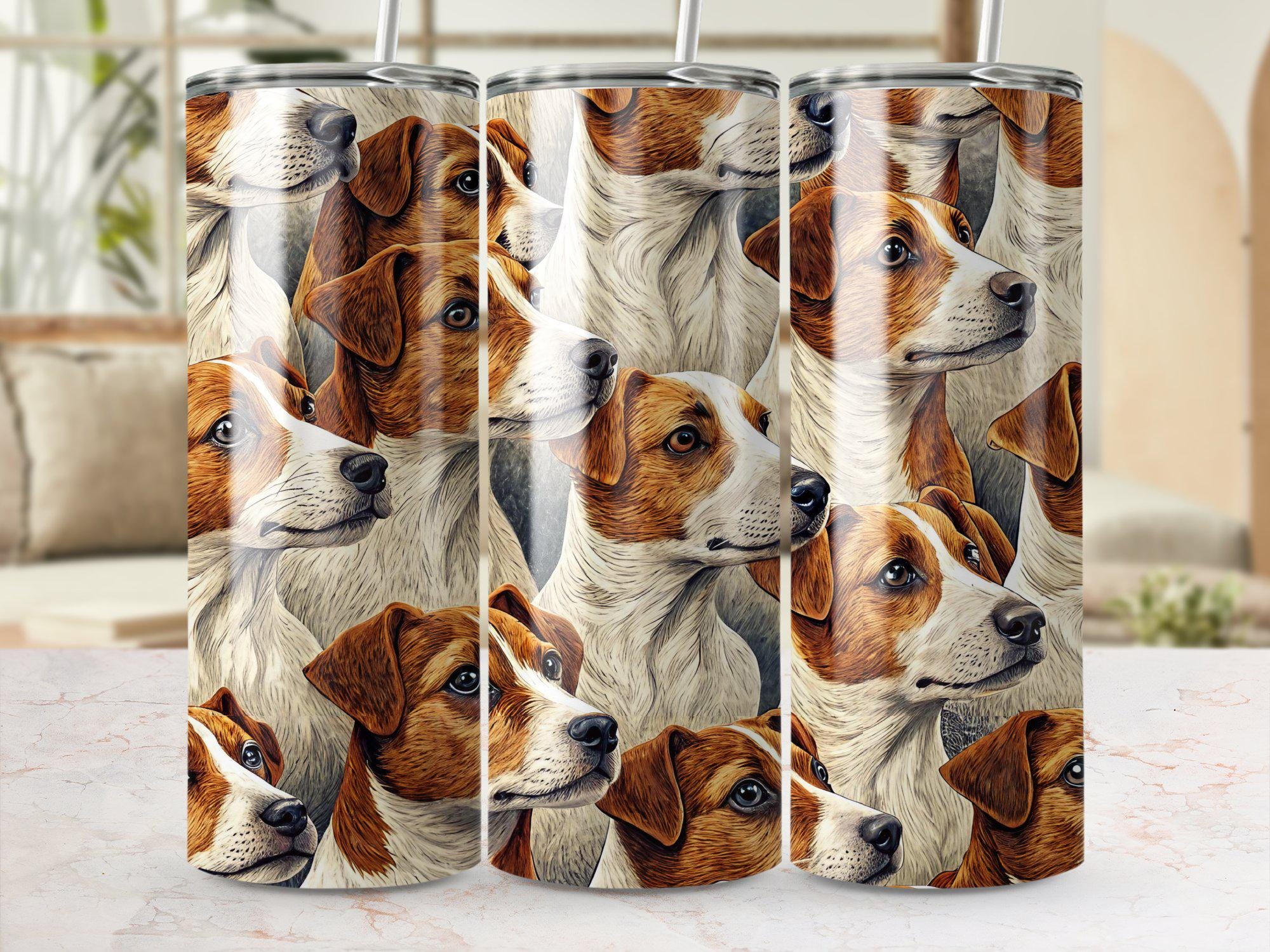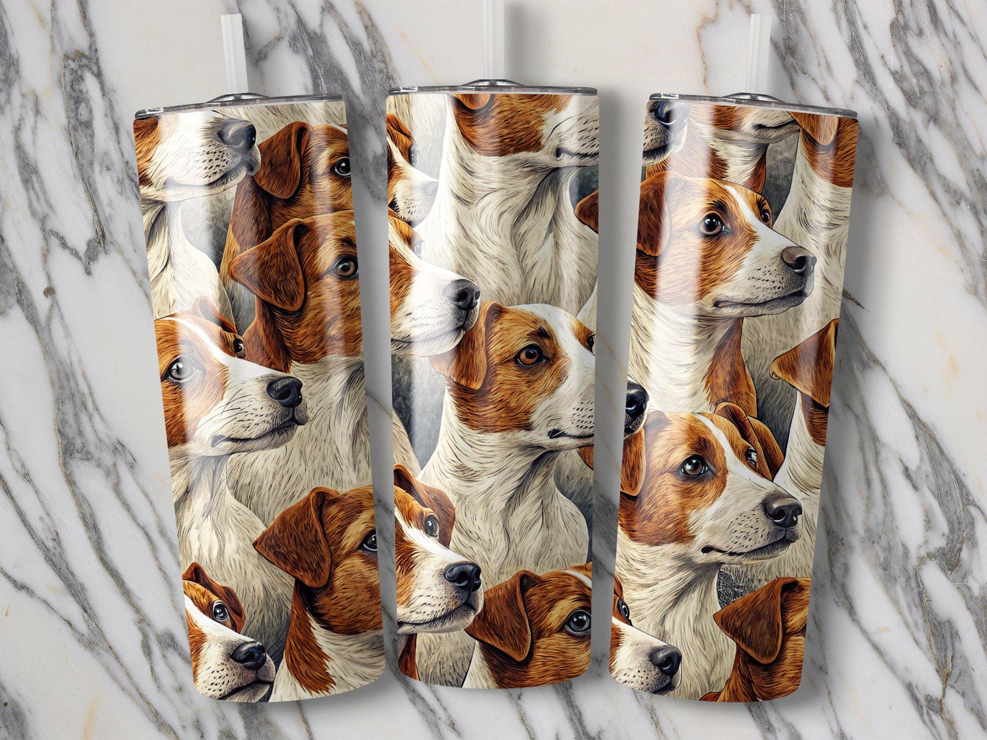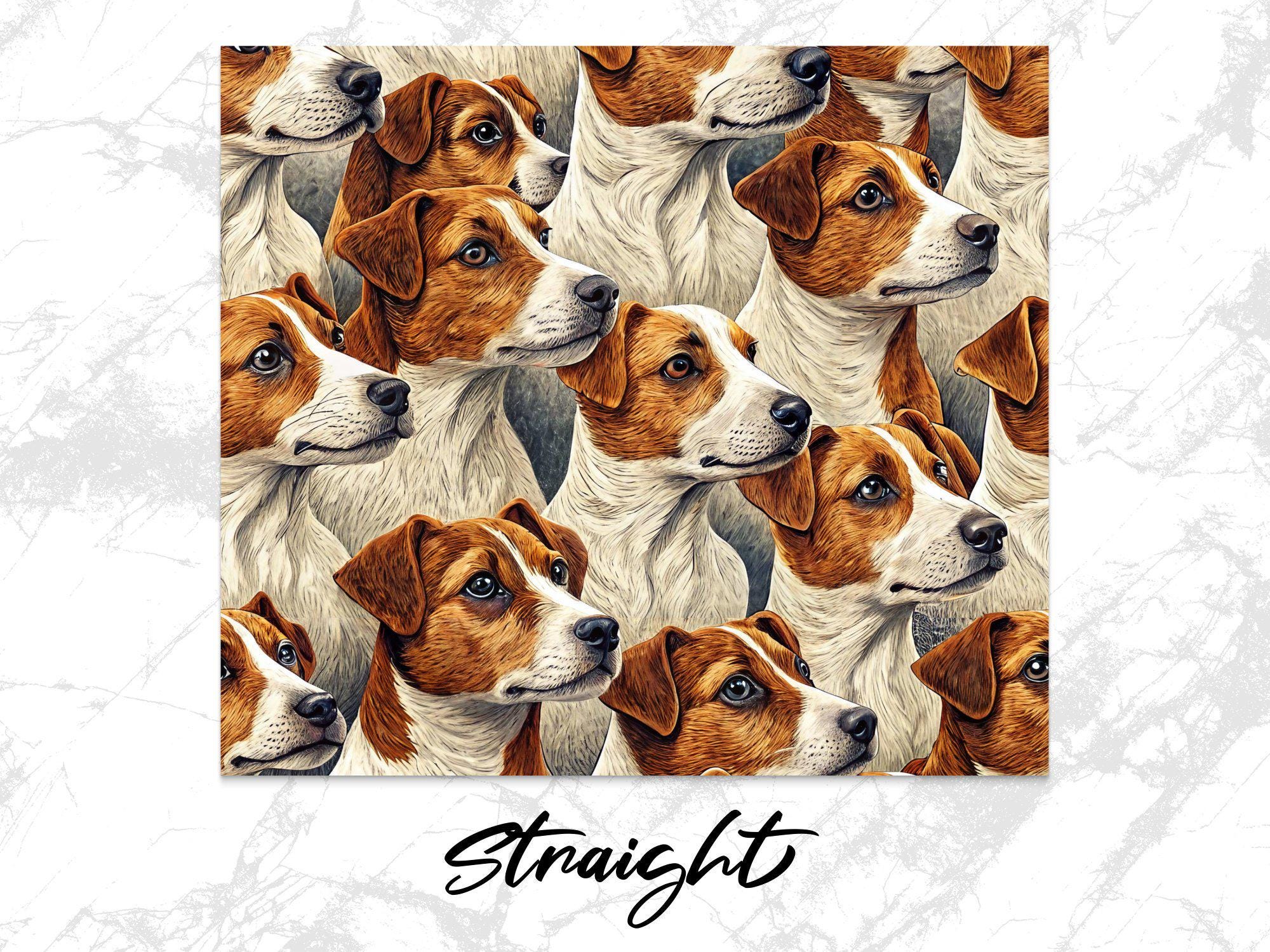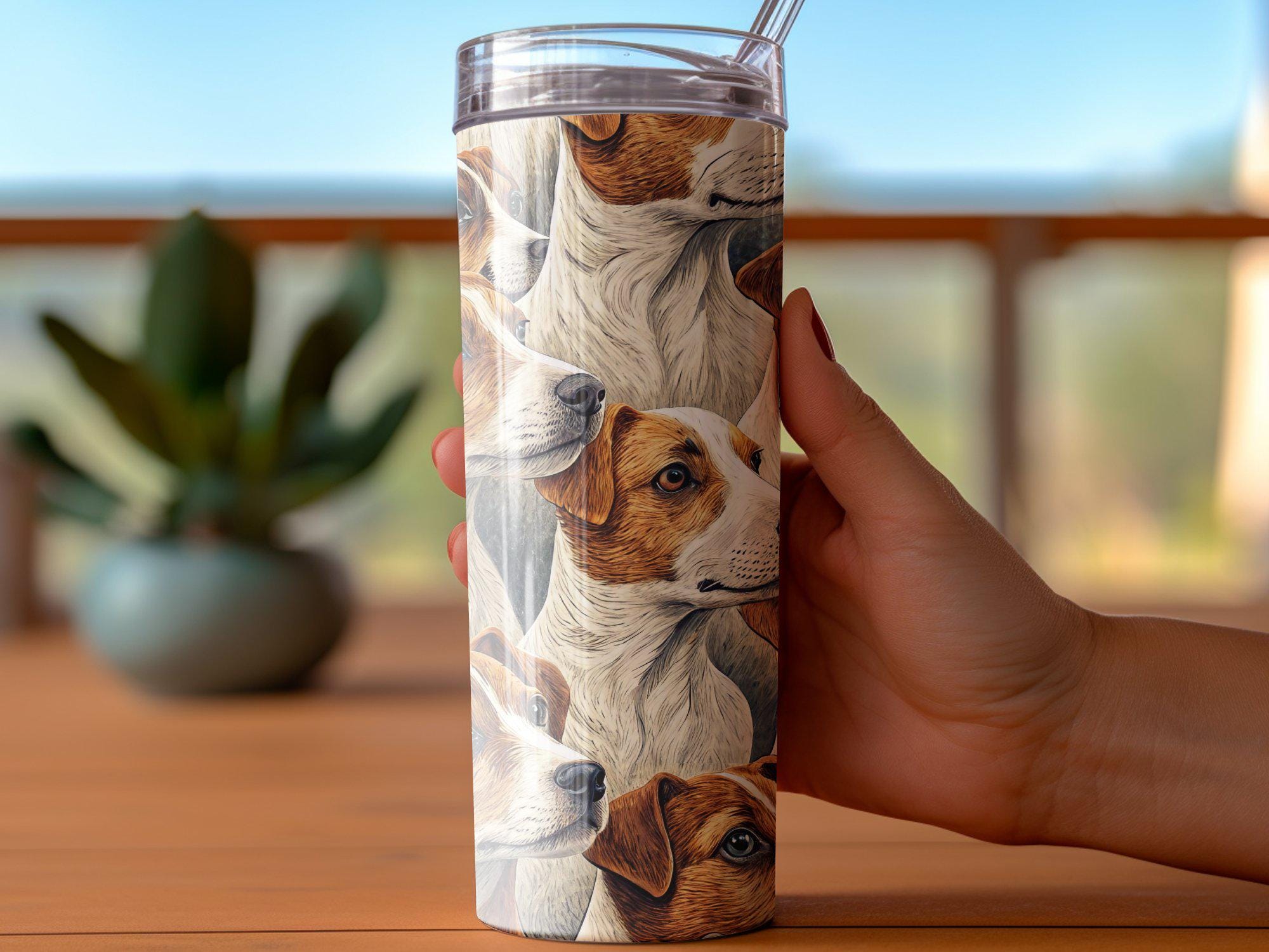 This is a digital download for a Jack Russell Terrier themed tumbler wrap design. It's perfect for creating unique and personalized gifts for dog lovers. This design is ideal for 20oz skinny tumblers and can be used for sublimation printing.