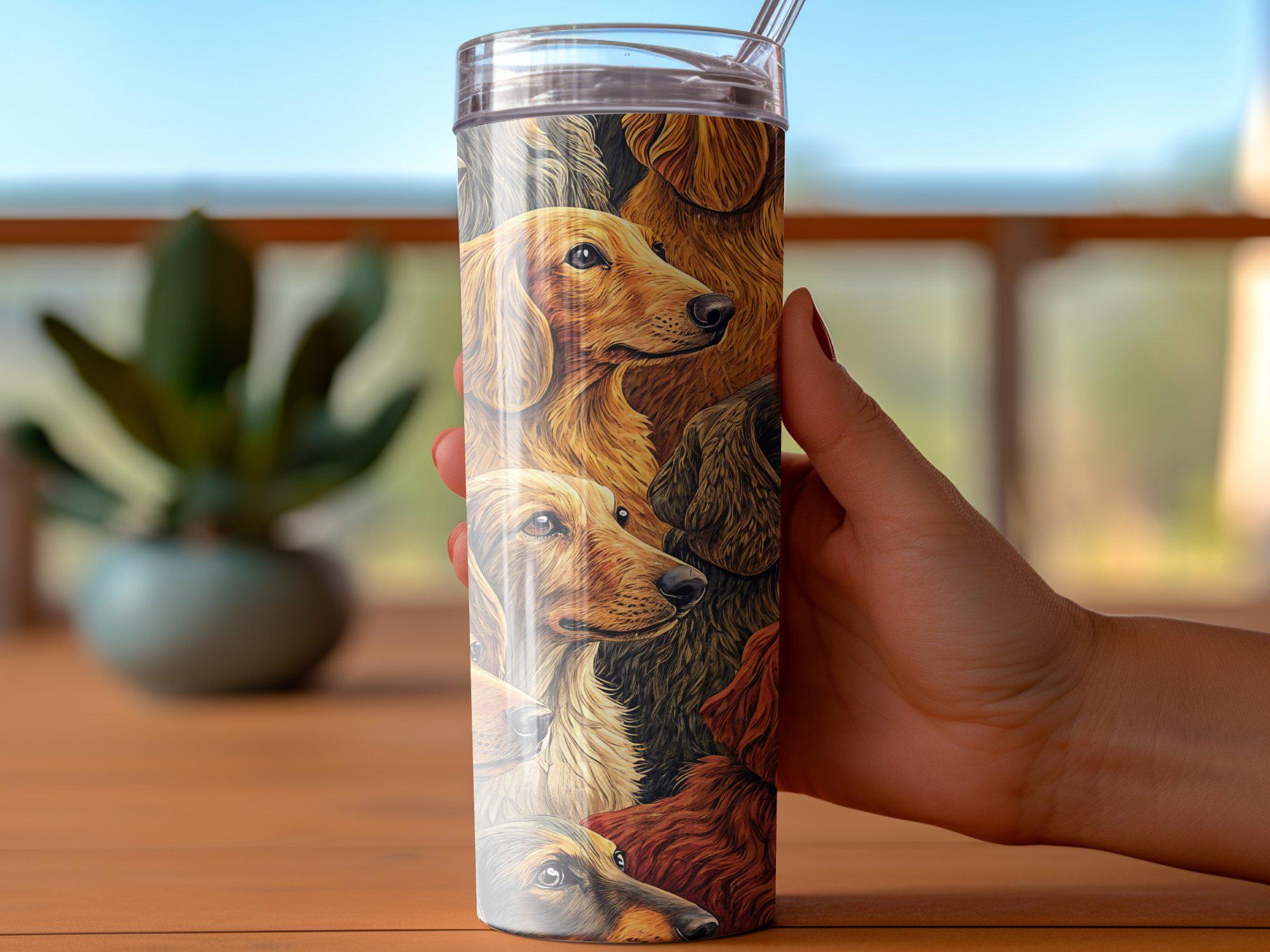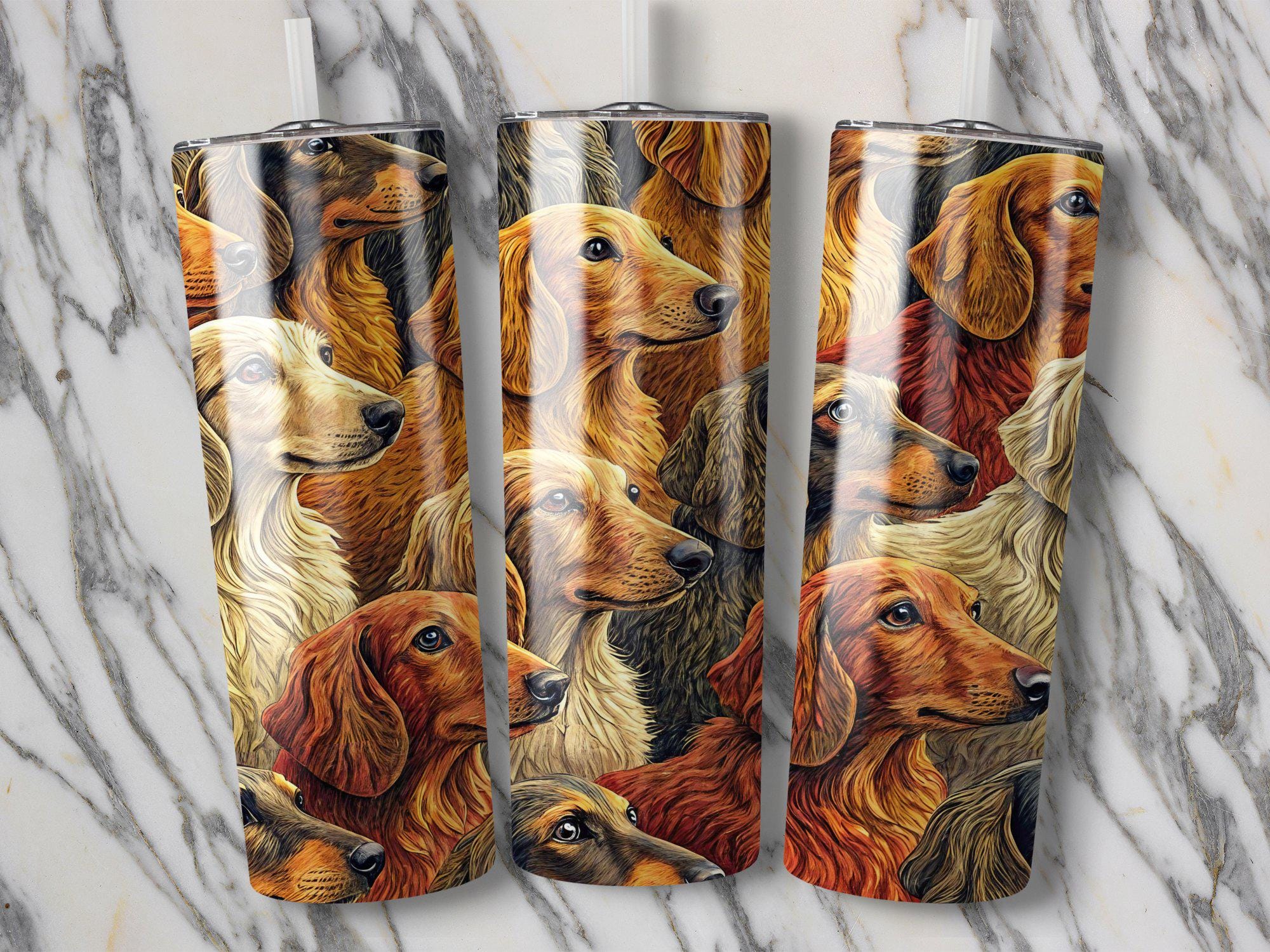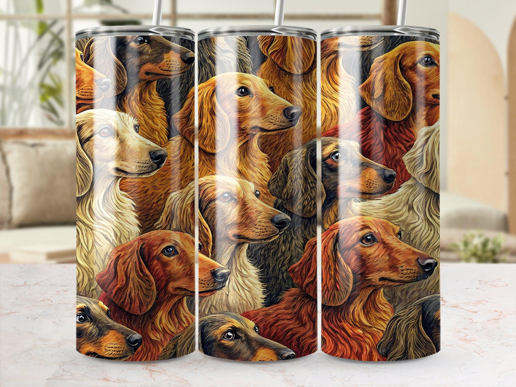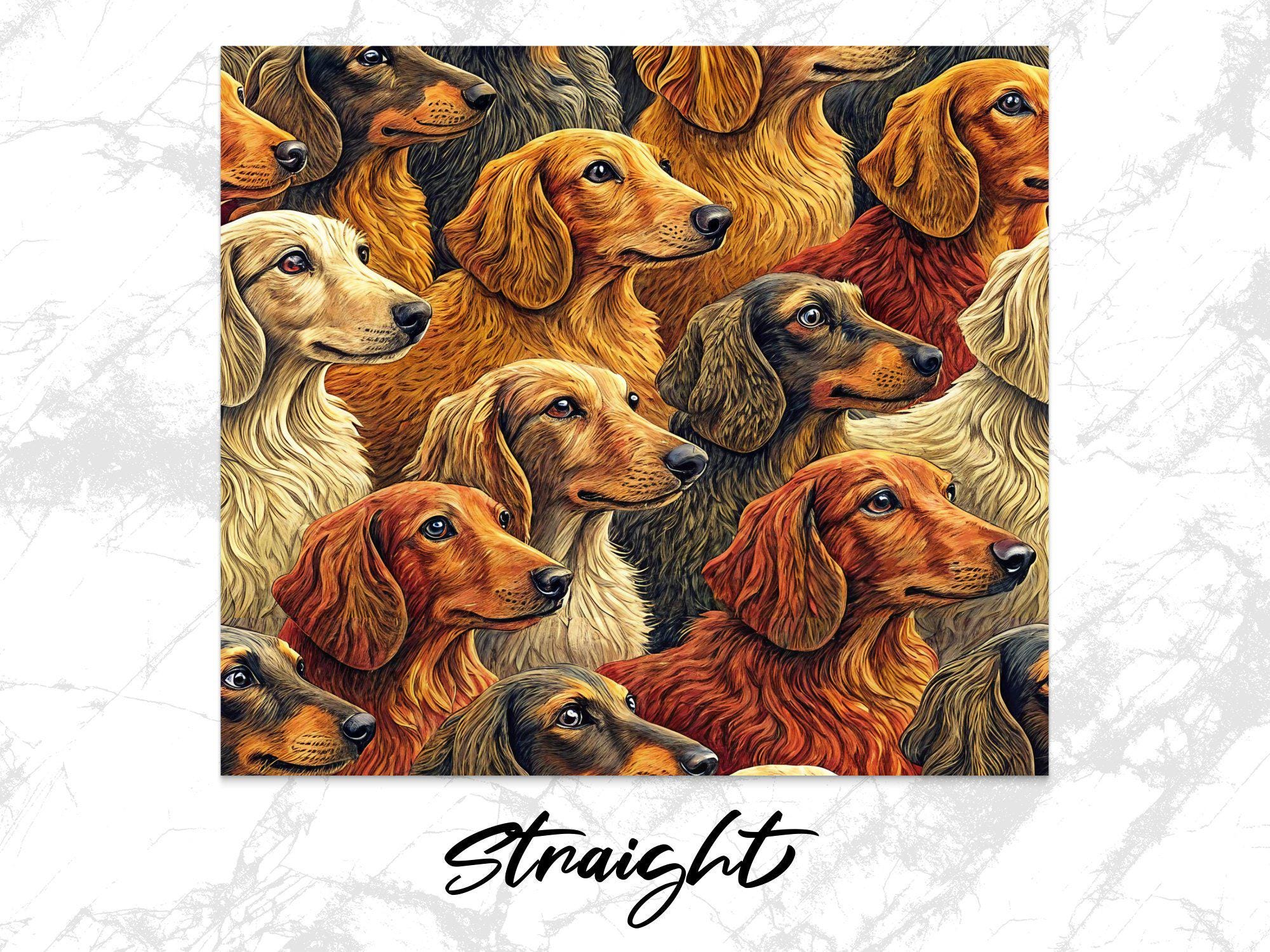 Instantly elevate your tumbler with this unique Dachshund themed wrap, ready for sublimation. Perfect for dog lovers and craft enthusiasts. This design features a collection of adorable Dachshunds in various colors and poses, creating a captivating and eye catching pattern.