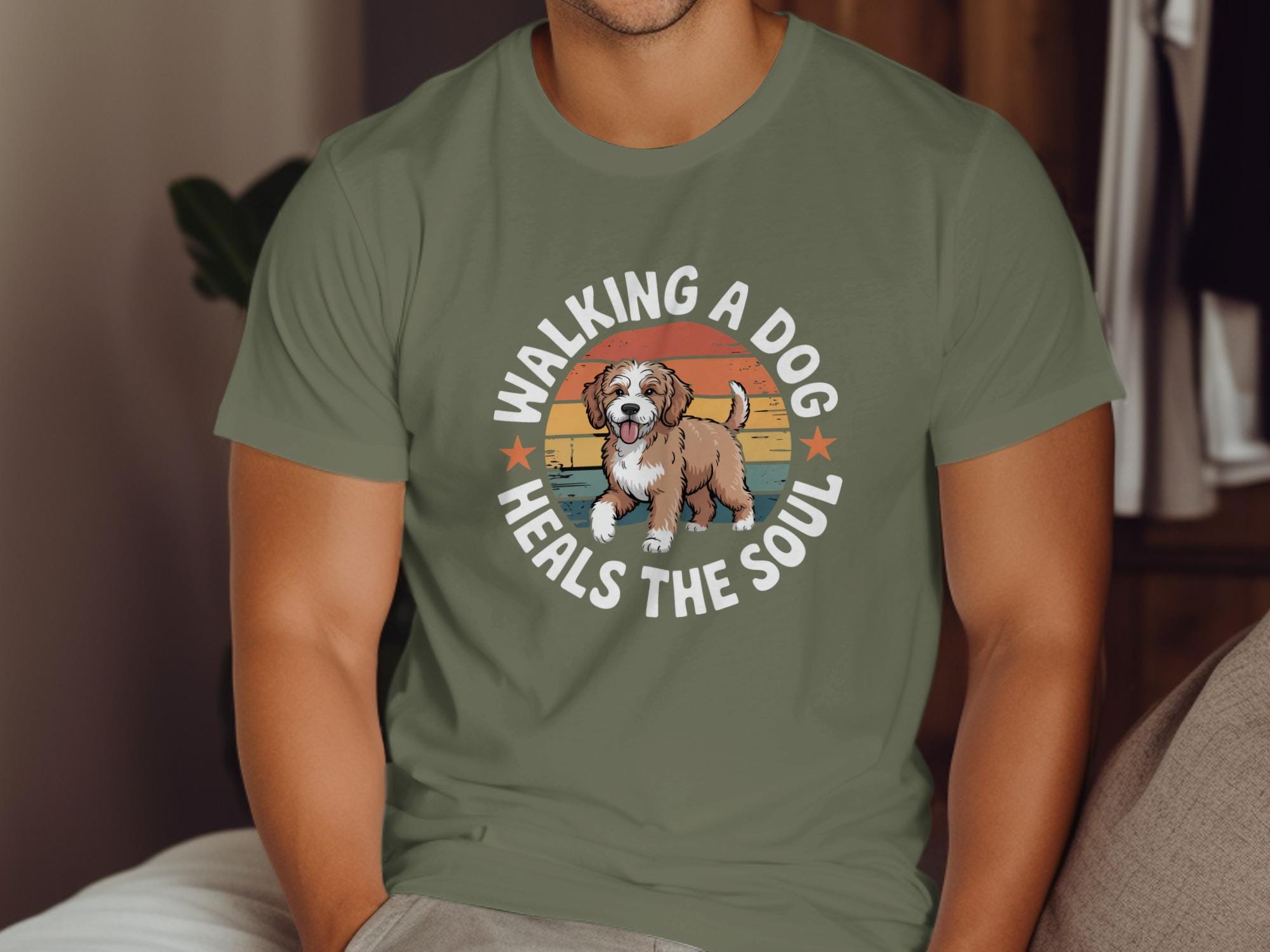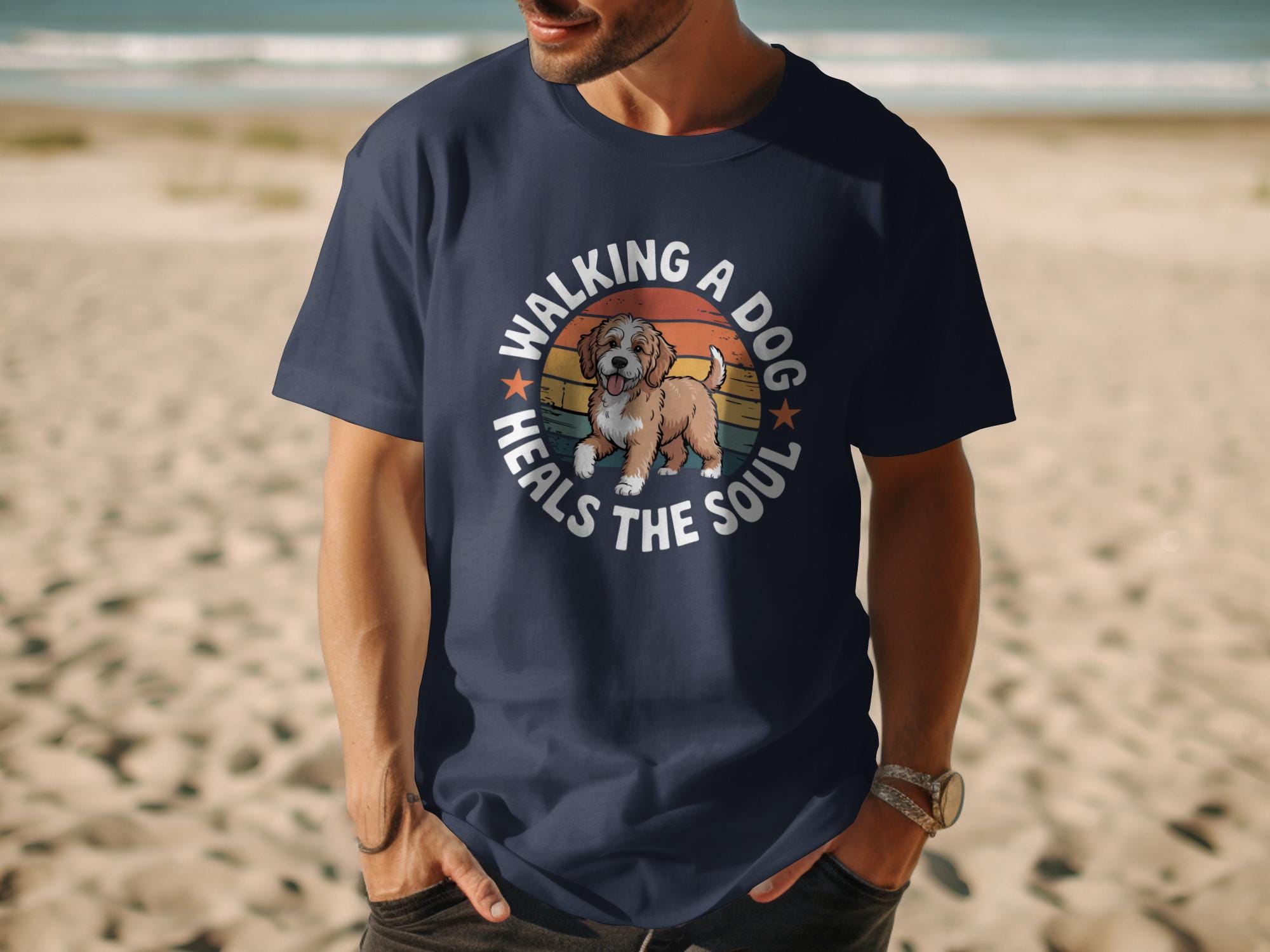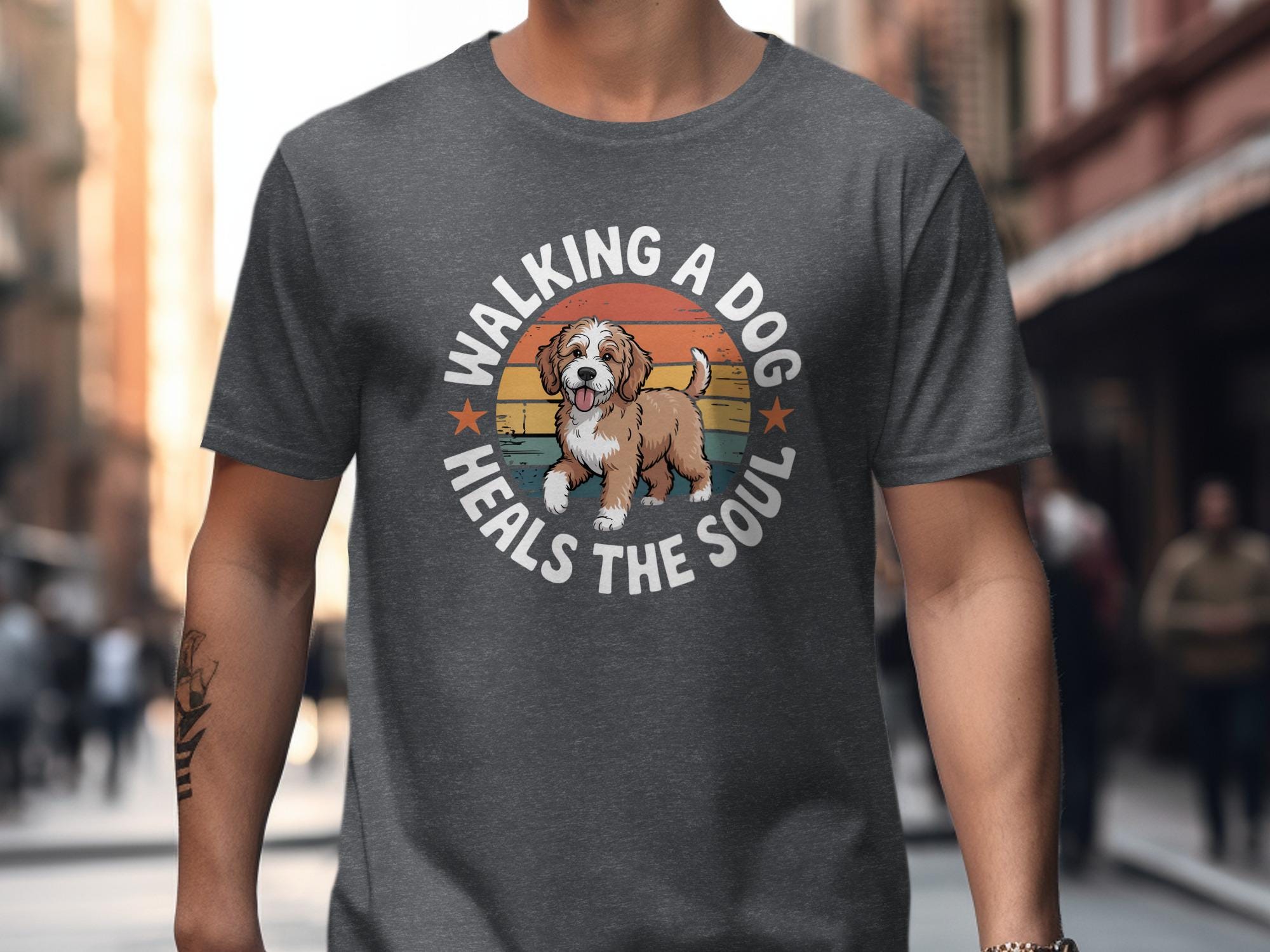 This charming T-shirt features a delightful design, perfect for any dog enthusiast, especially those who adore Goldendoodles. The heartwarming quote "Walking a Dog Heals the Soul" adds a touch of positivity and reflects the joy of pet ownership. Get this fantastic shirt today!