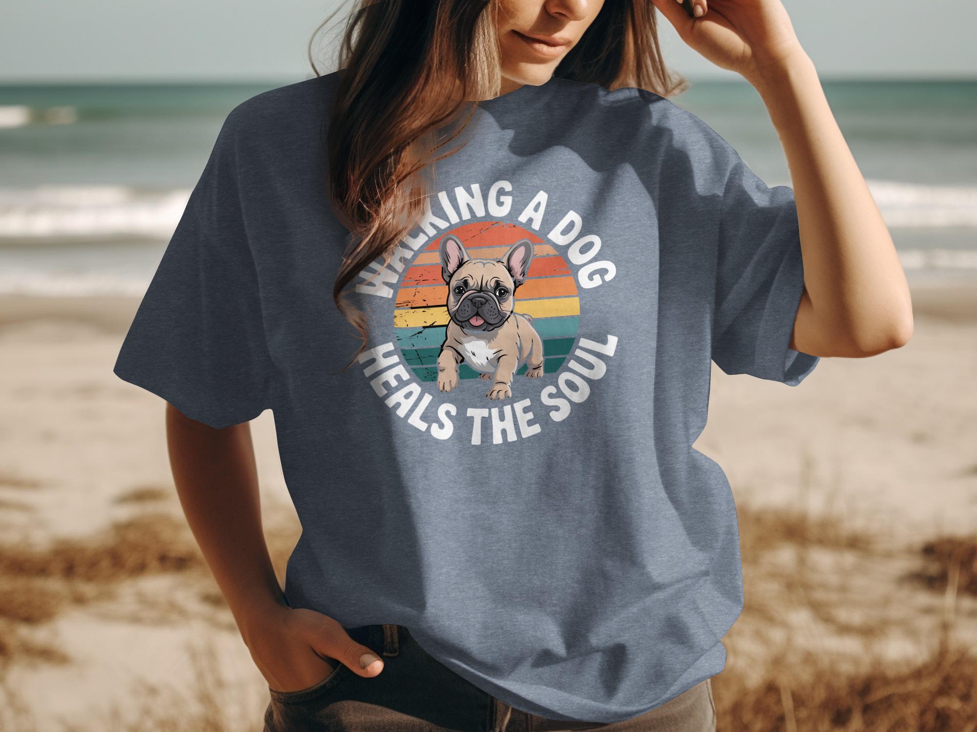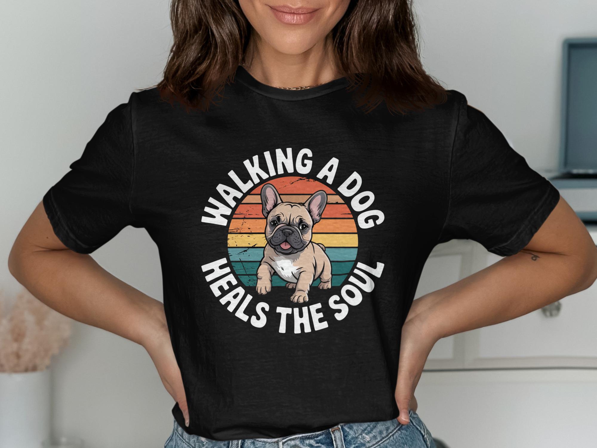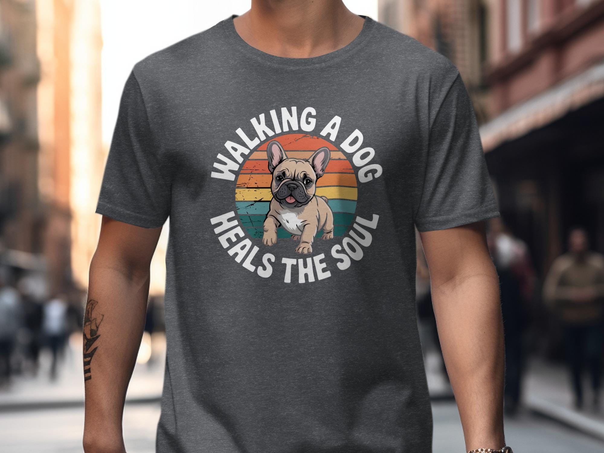 Show your love for dogs with this adorable T-Shirt! This design features a cute French Bulldog in front of a retro sunset, with the words "Walking a Dog Heals the Soul". Perfect for dog owners, dog walkers, and anyone who loves these furry friends.