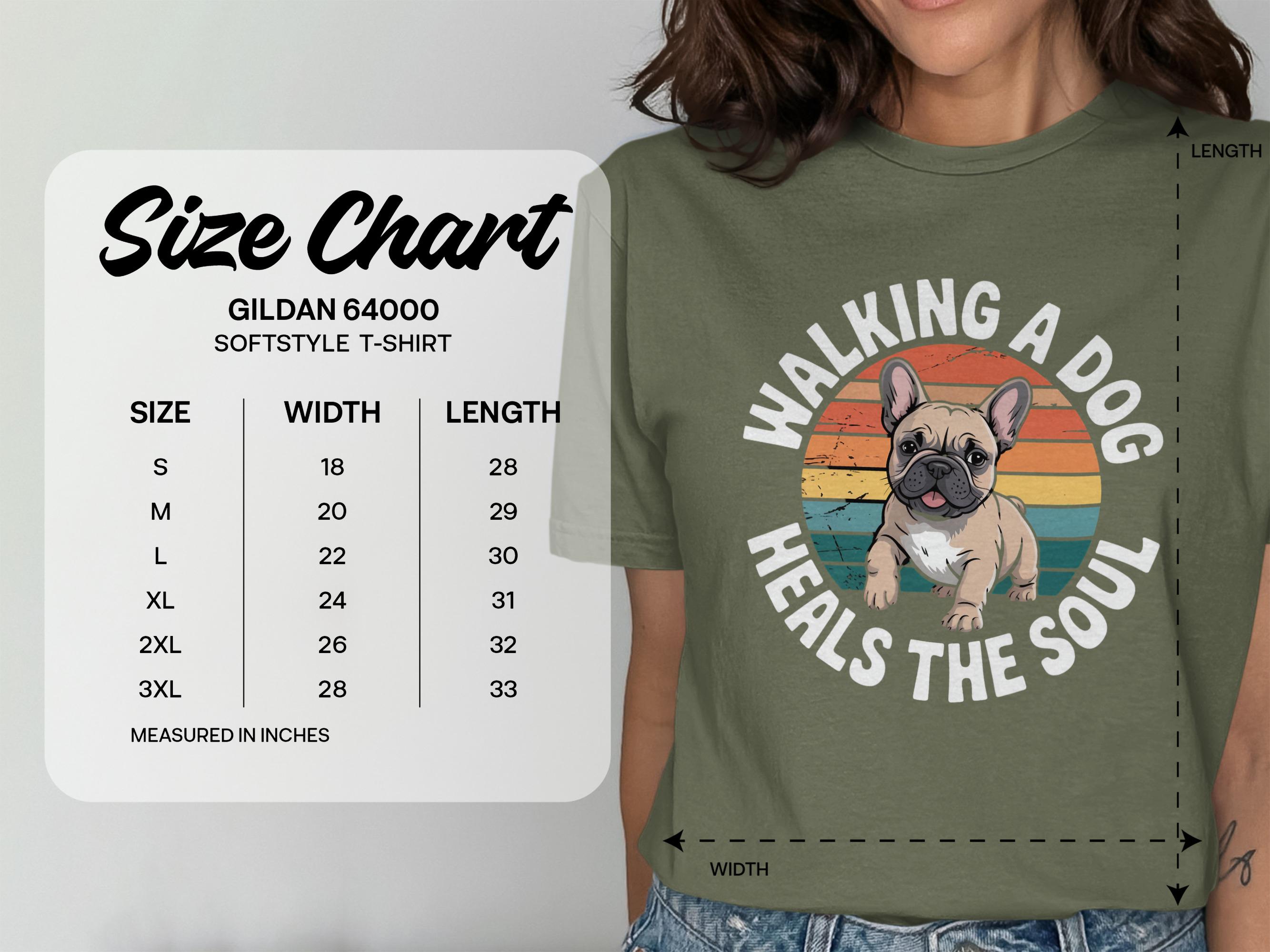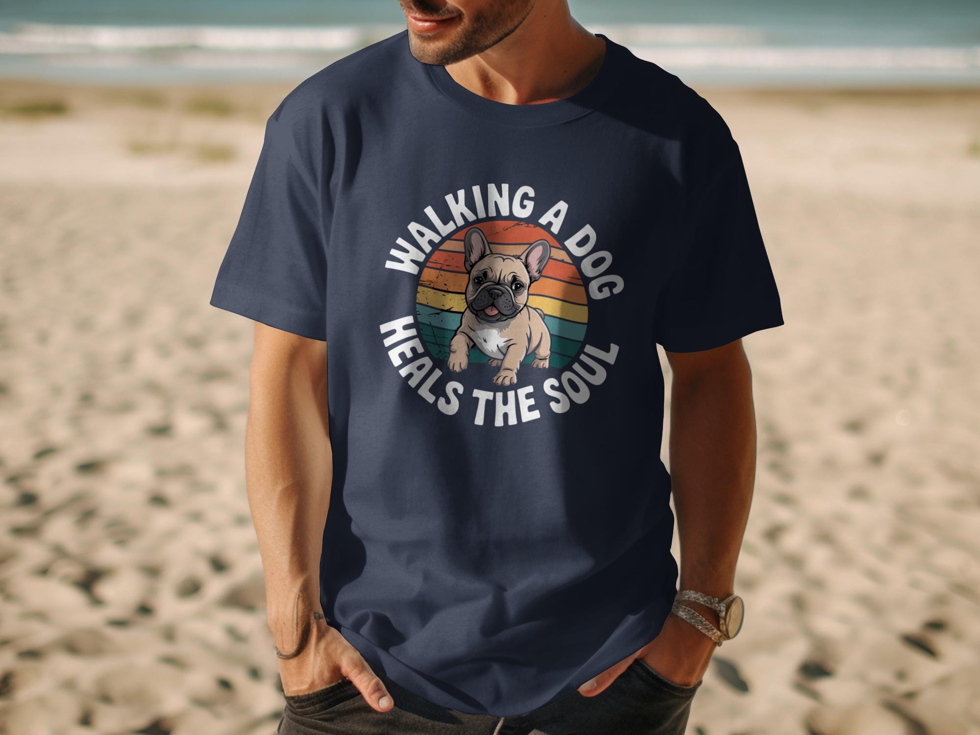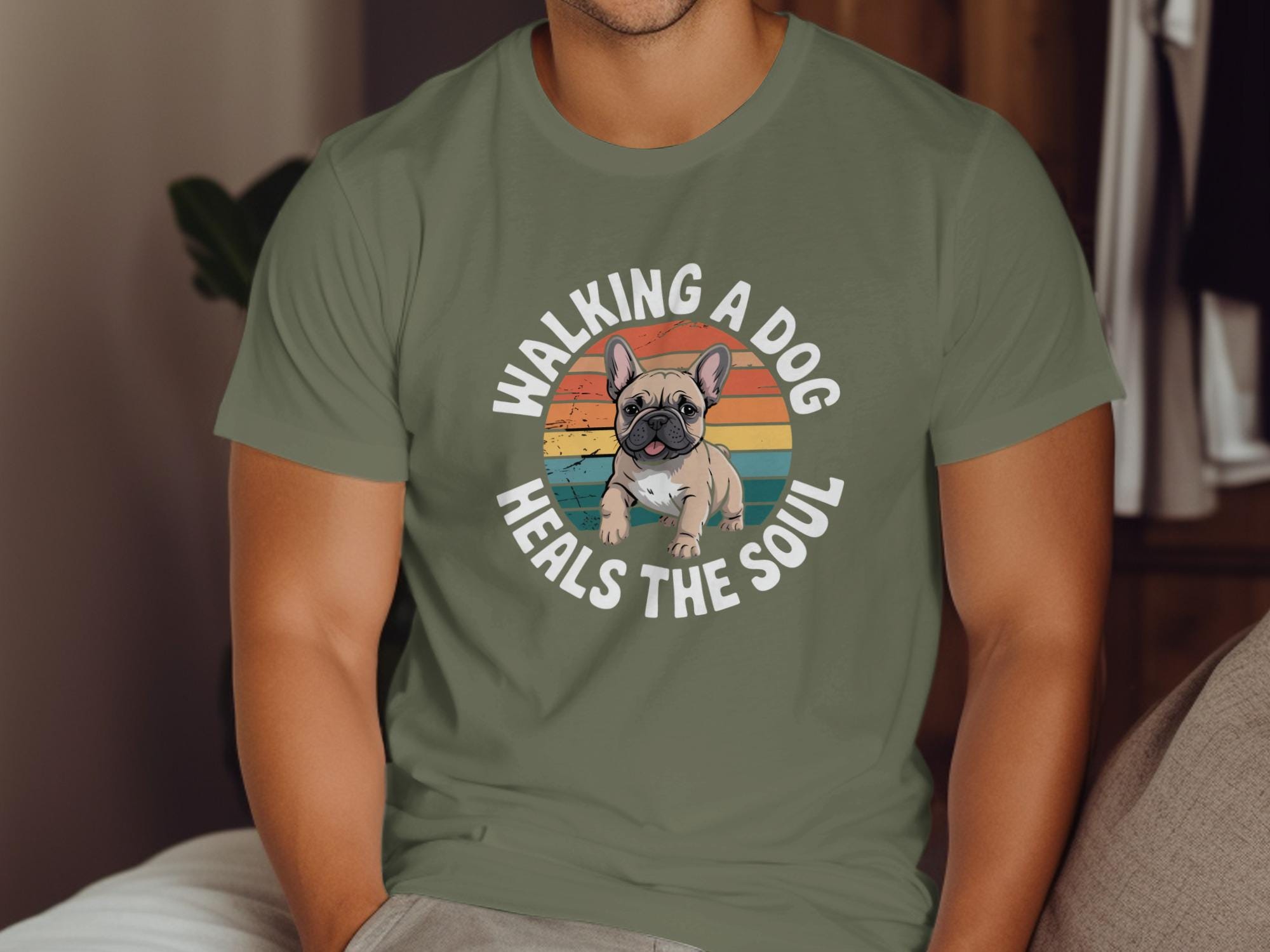 Show your love for dogs with this adorable T-Shirt! This design features a cute French Bulldog in front of a retro sunset, with the words "Walking a Dog Heals the Soul". Perfect for dog owners, dog walkers, and anyone who loves these furry friends.