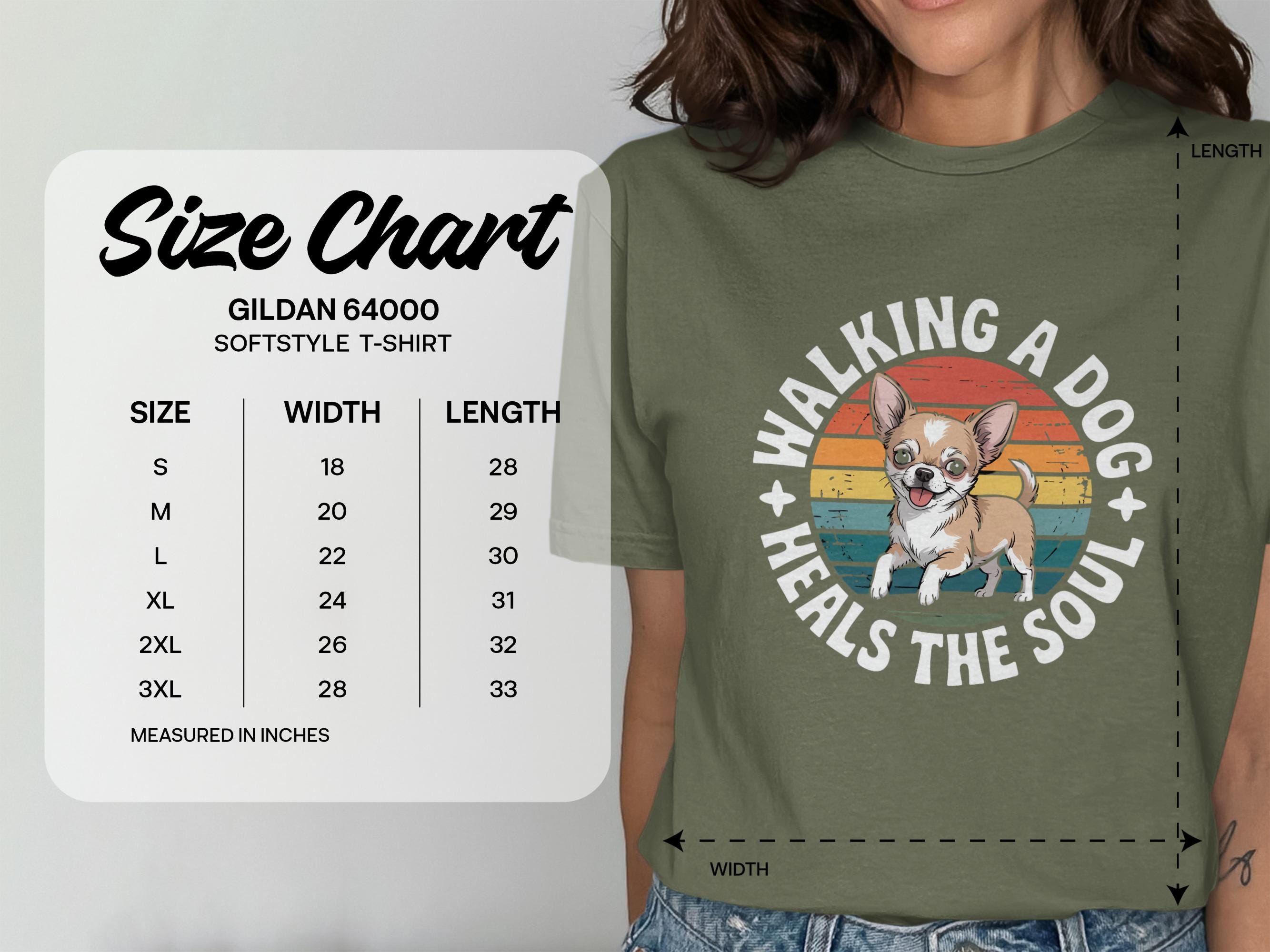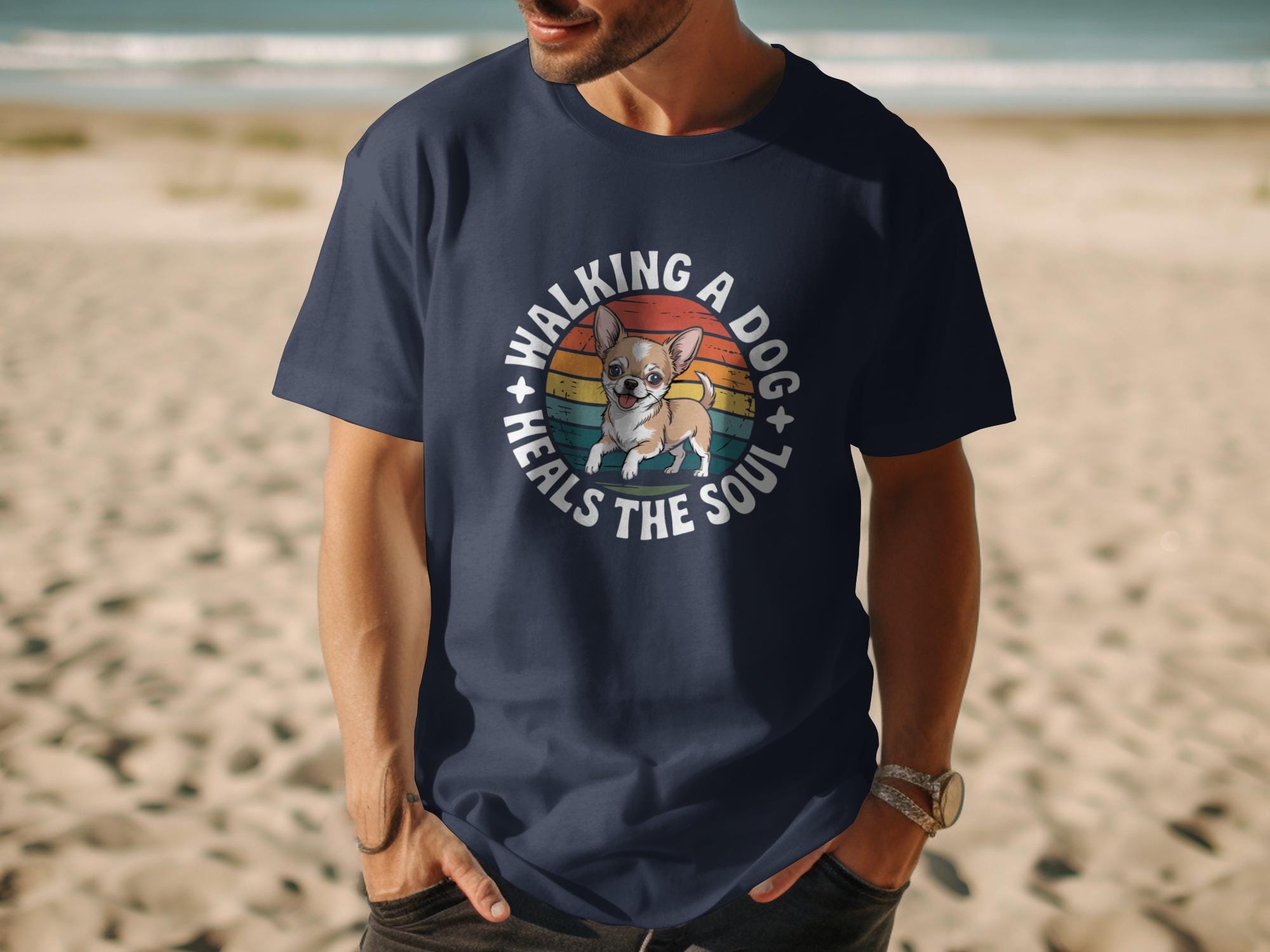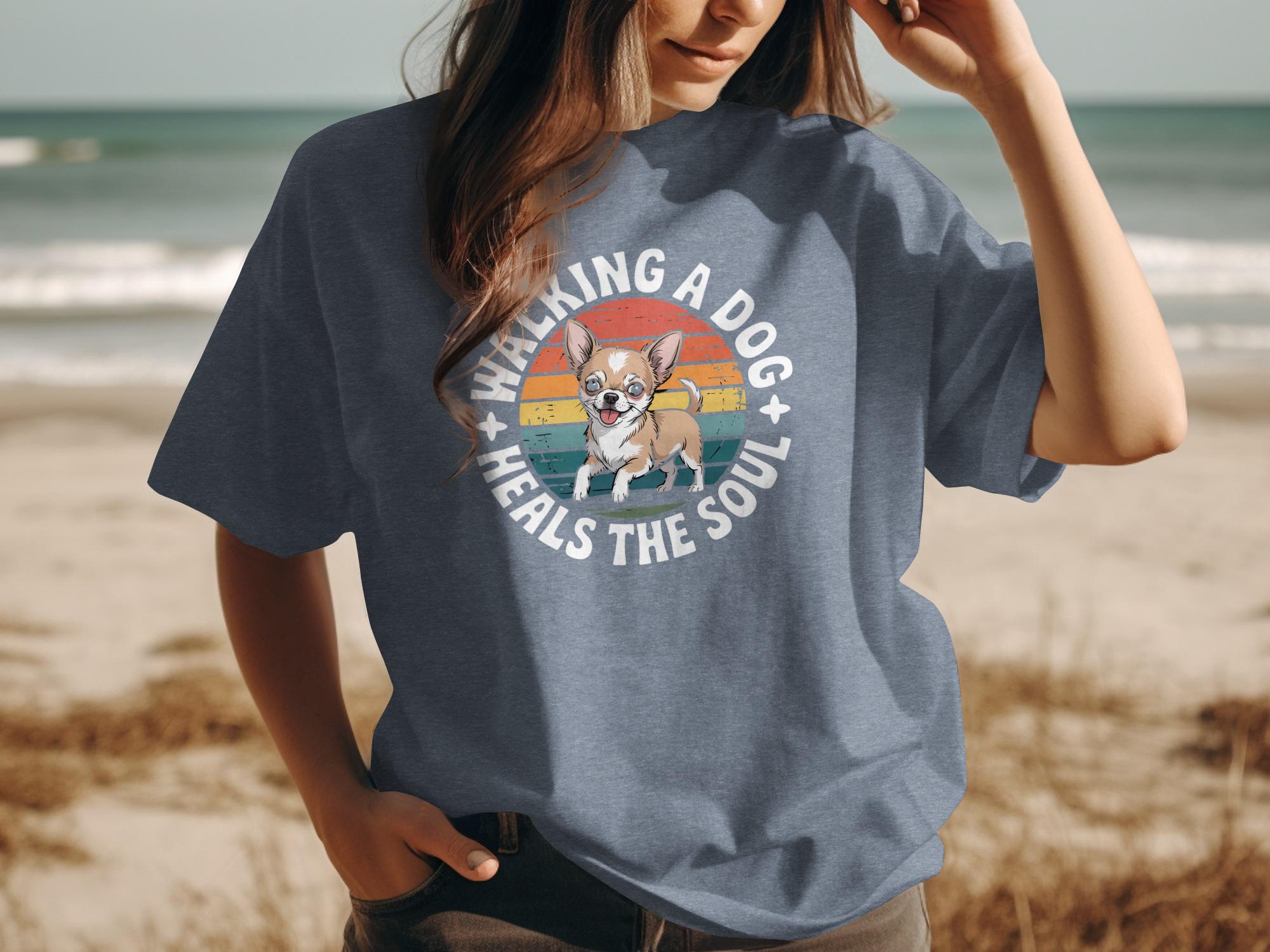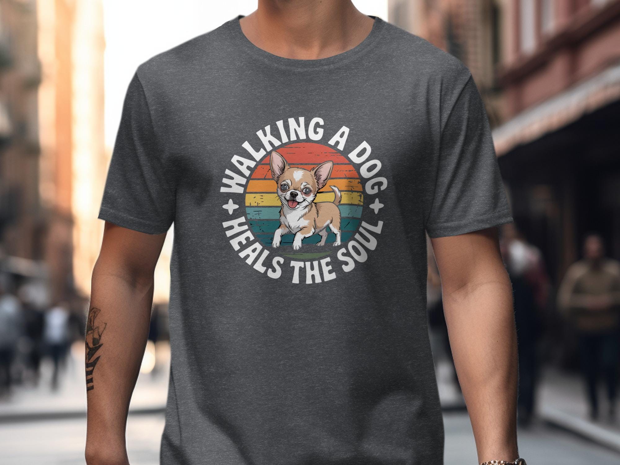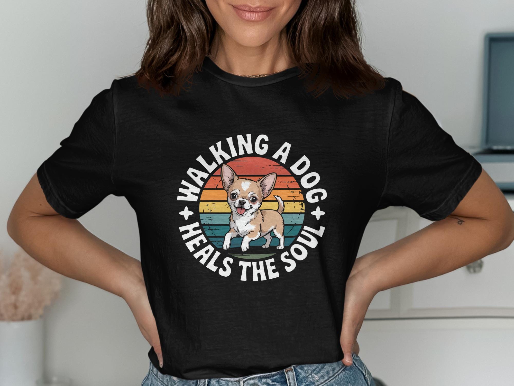 The text "Walking a Dog Heals the Soul" is featured around the chihuahua. The design is great for anyone who enjoys walking their dog and appreciates the companionship they provide.