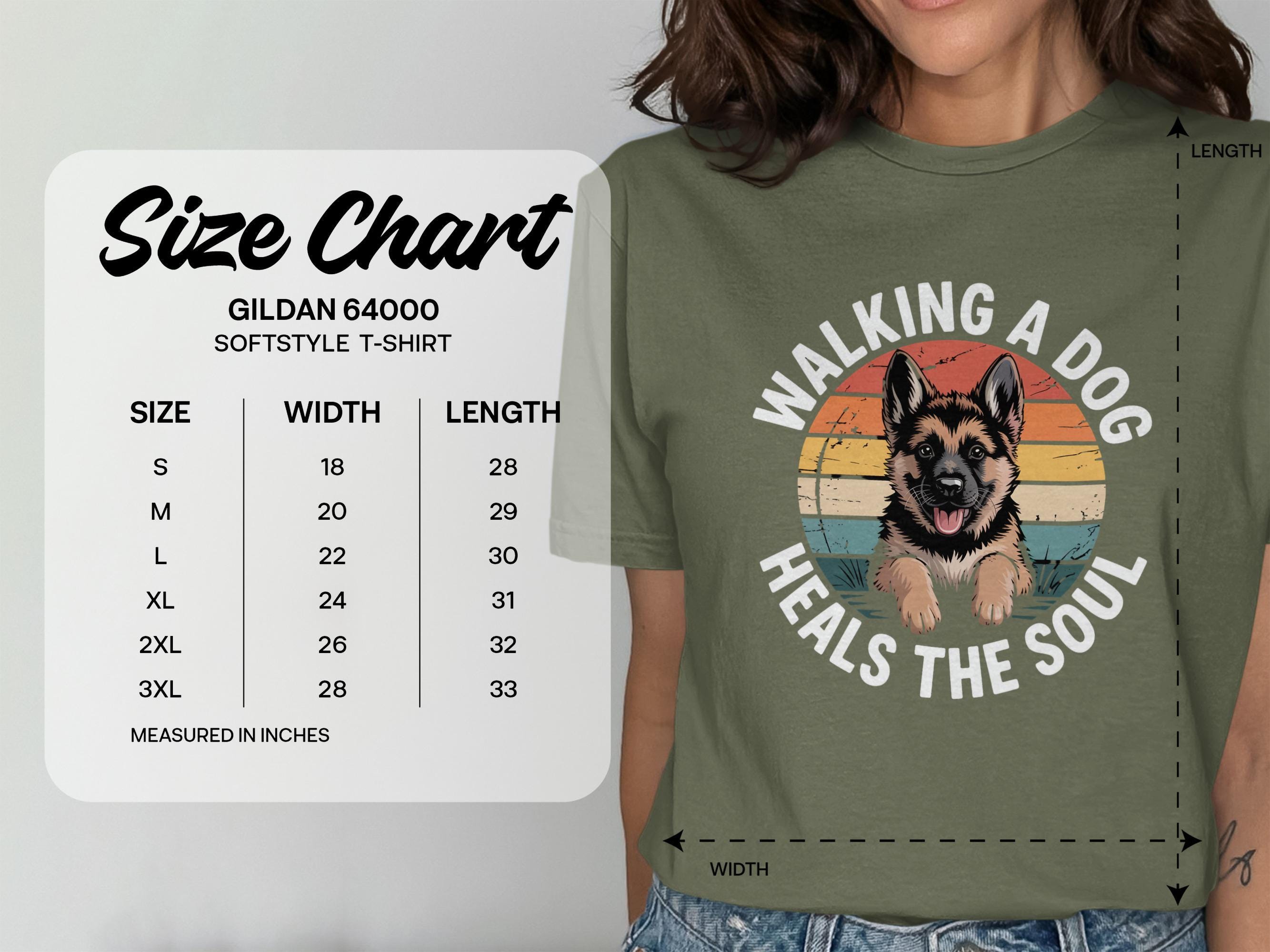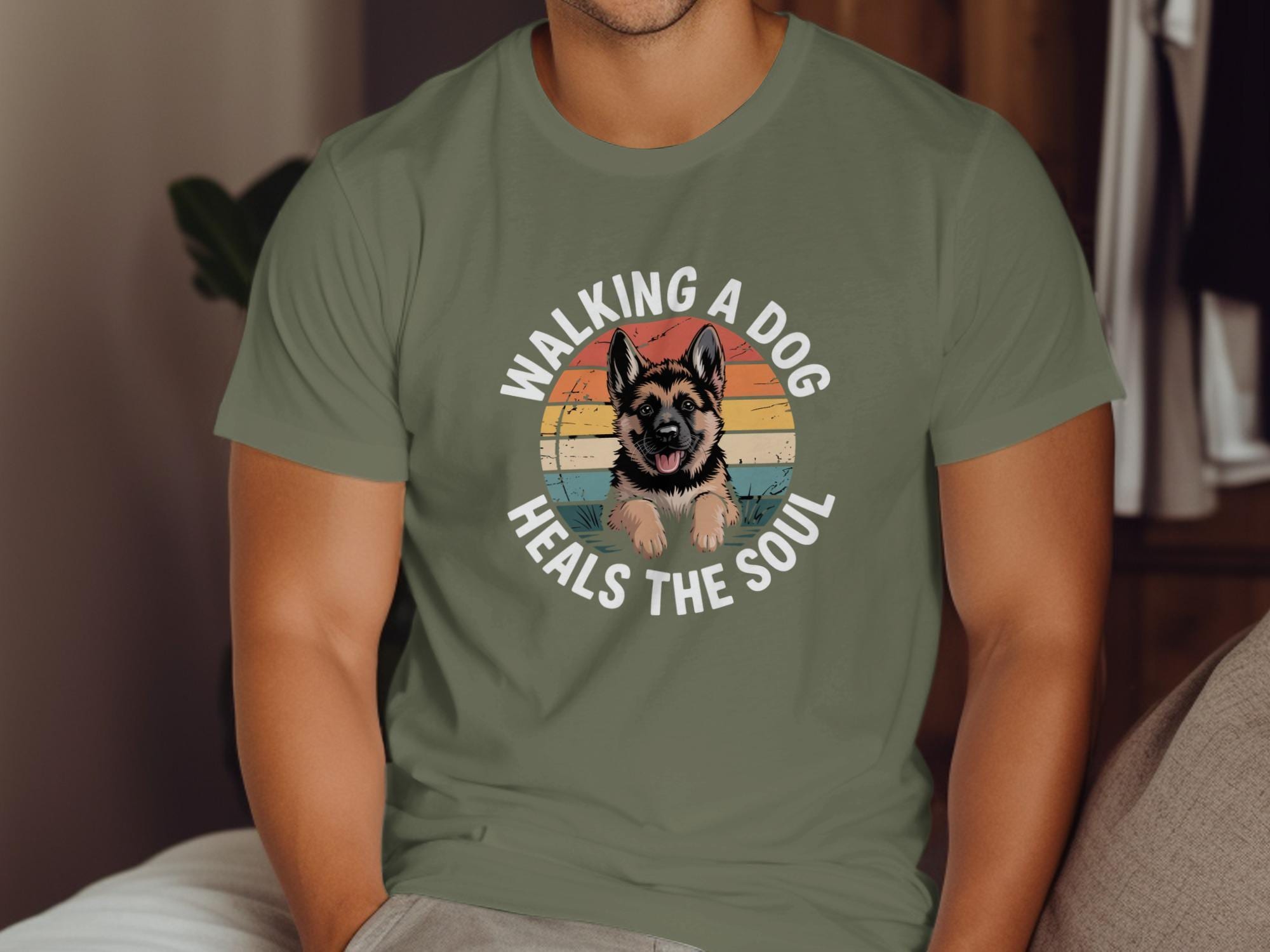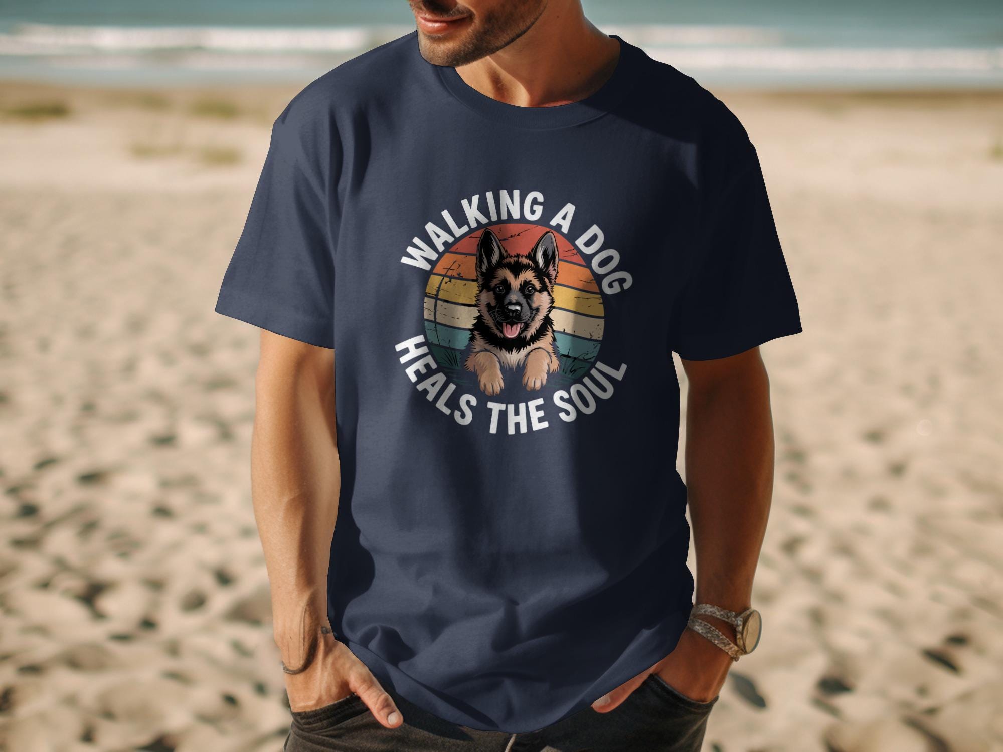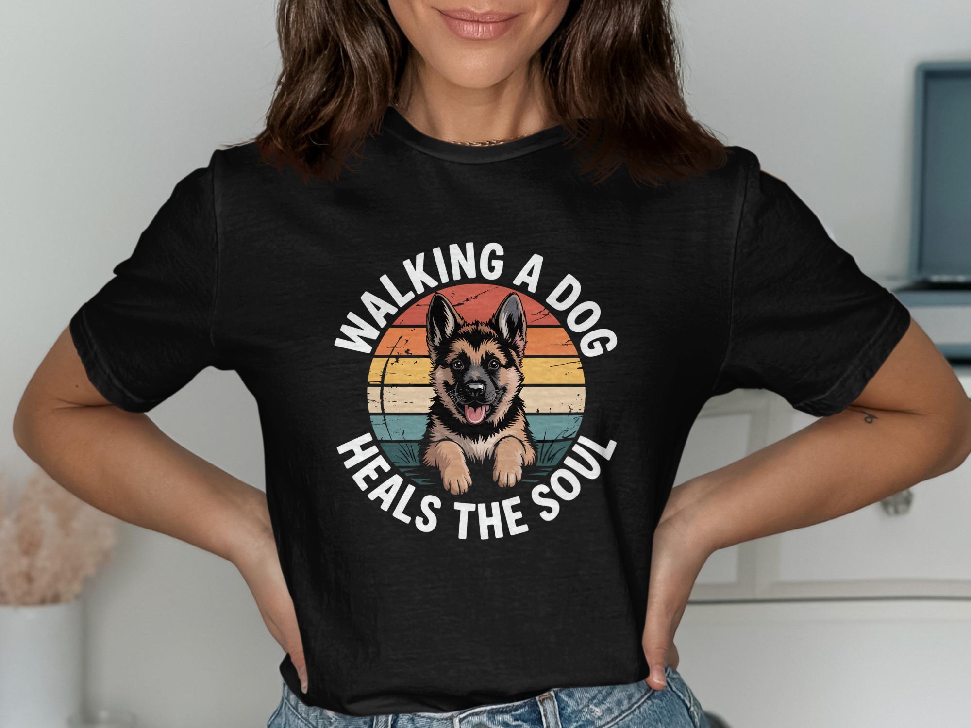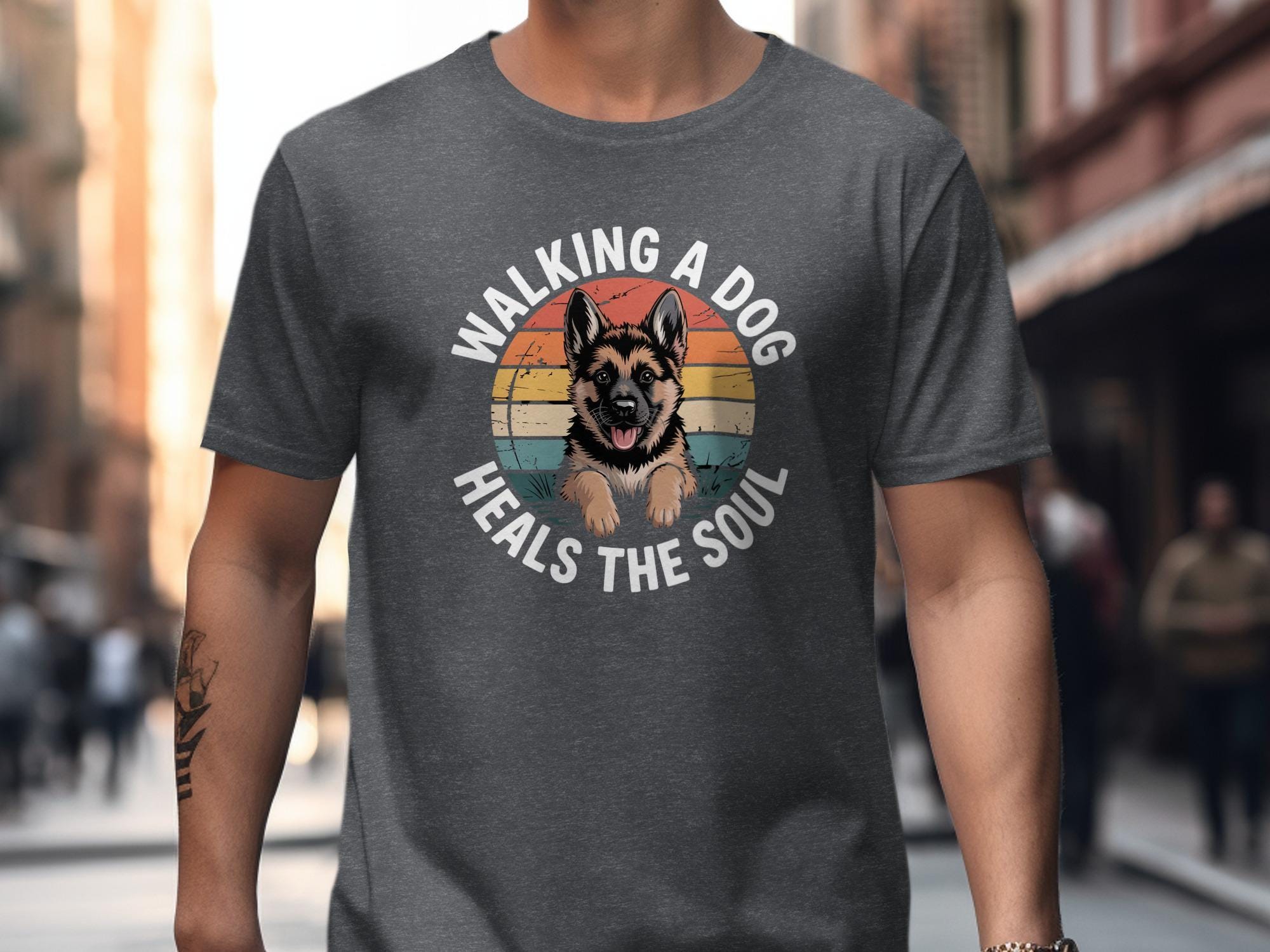 Show off your love for your furry friend with this German Shepherd shirt featuring the heartfelt message "Dog Walking Heals the Soul" in a stylish retro design. This vintage style healing tshirt makes the perfect gift idea for any dog lover or pet owner, combining comfort with a meaningful graphic that celebrates the soul-healing bond between humans and their German Shepherds. A wonderful addition to your dog apparel collection that men especially will appreciate.