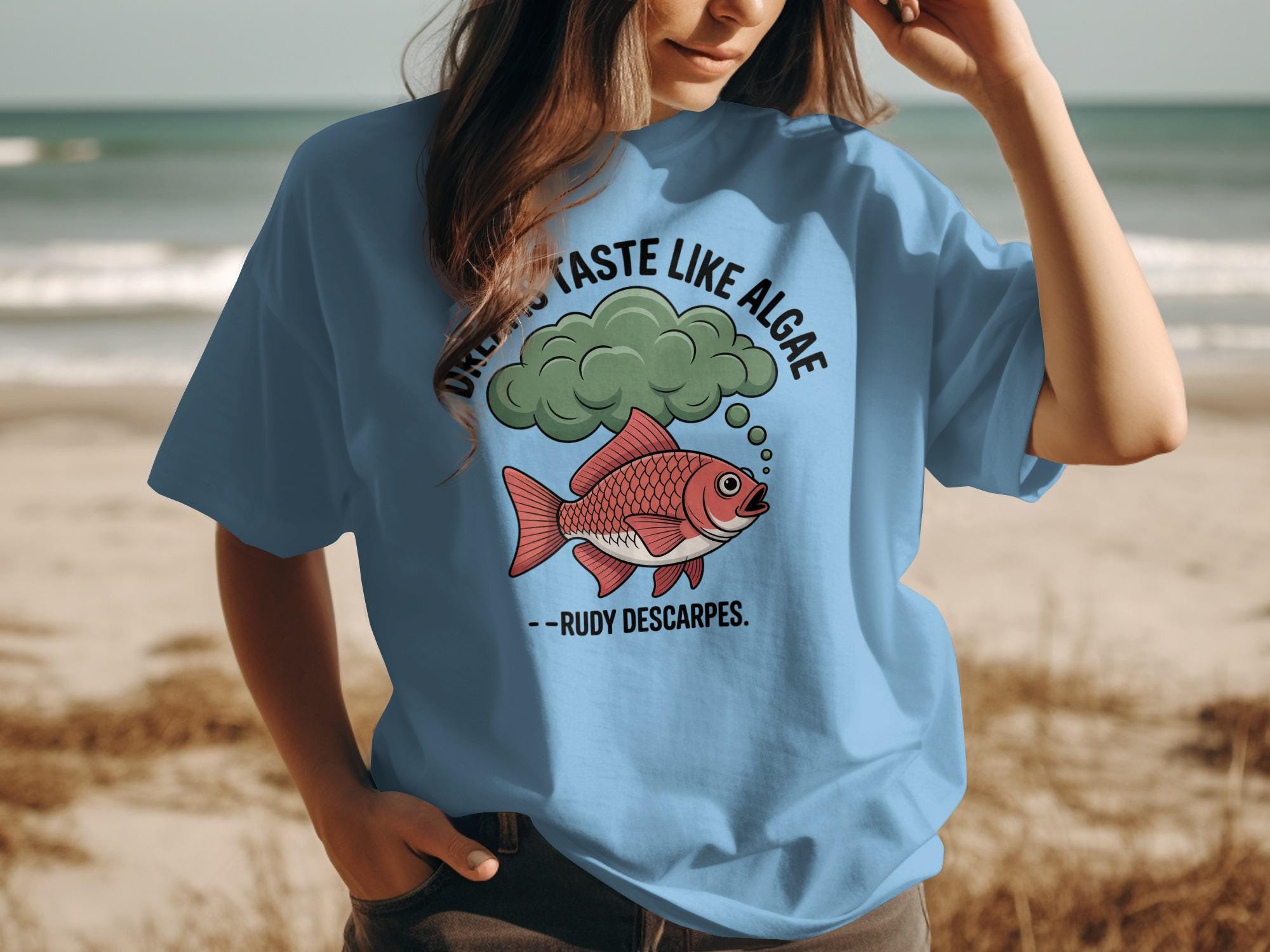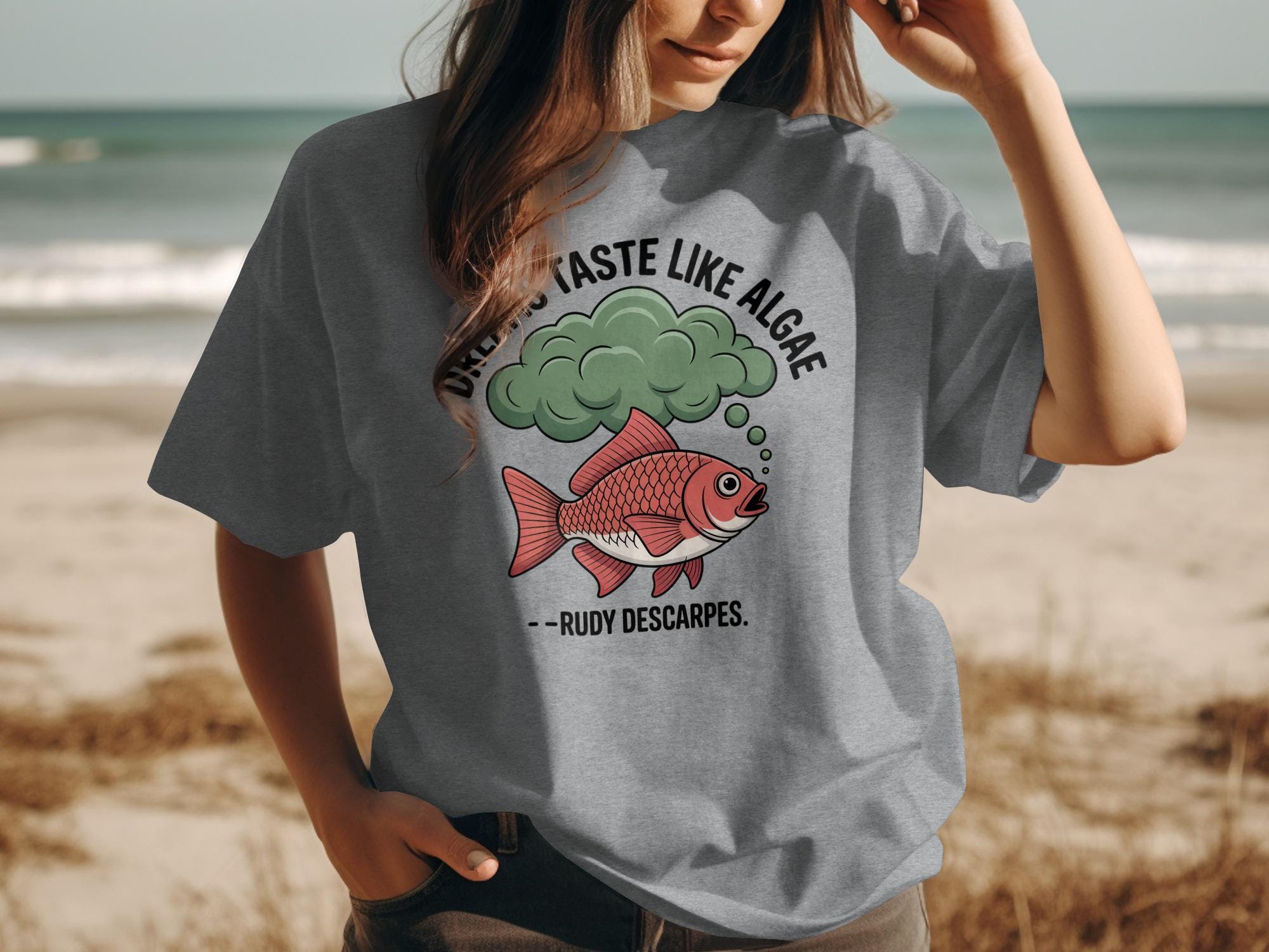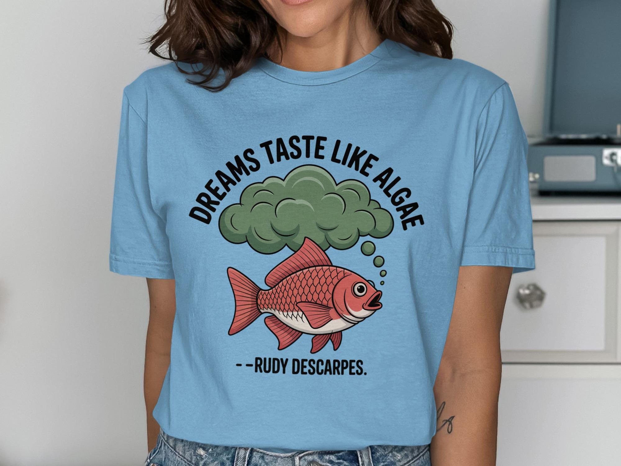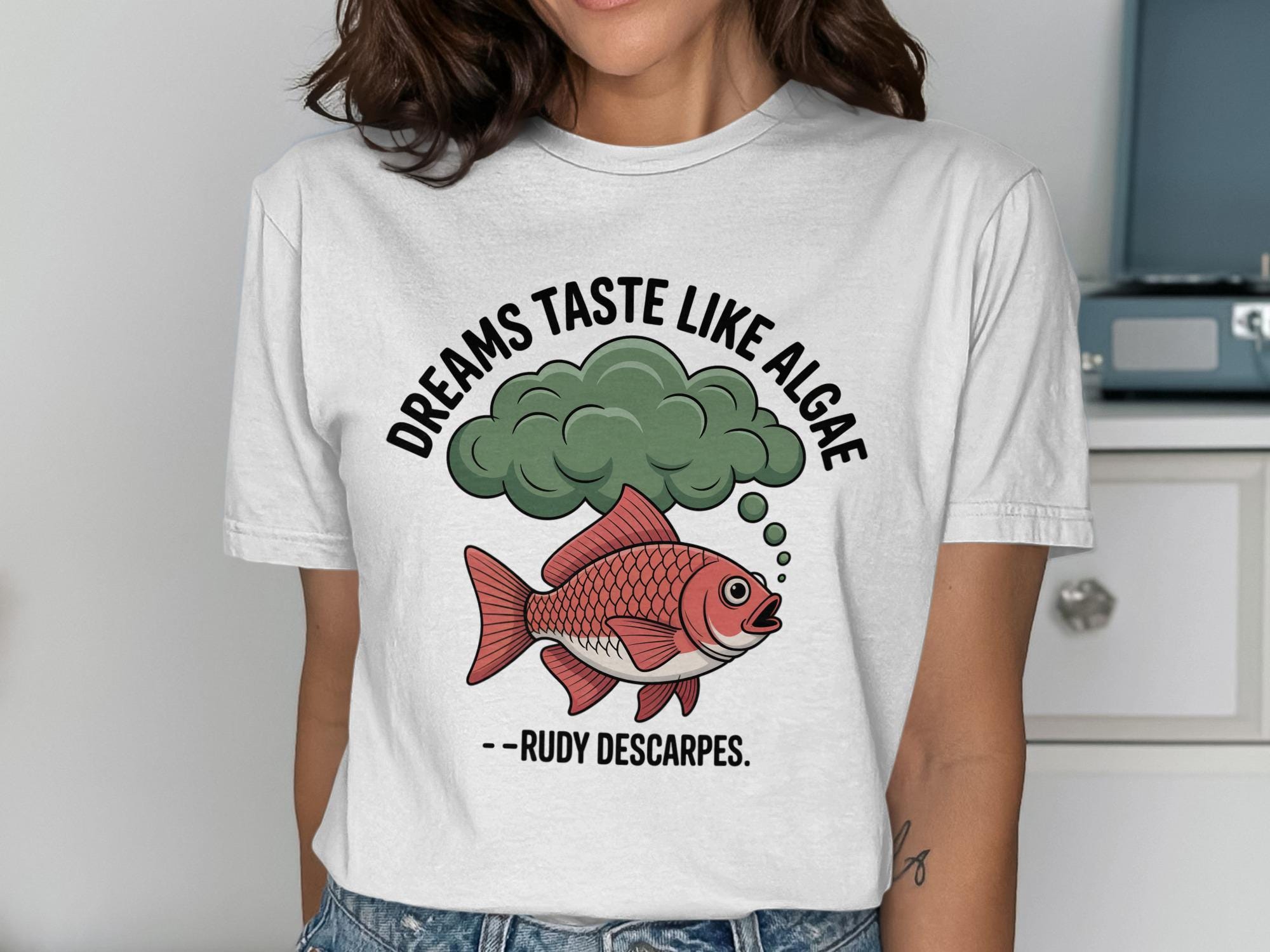 This unique T-Shirt features a whimsical design of a fish with a thought bubble containing the phrase "Dreams Taste Like Algae". It's a quirky and conversation-starting piece. Perfect for fish enthusiasts and anyone with a unique sense of humor, this tee is sure to turn heads.