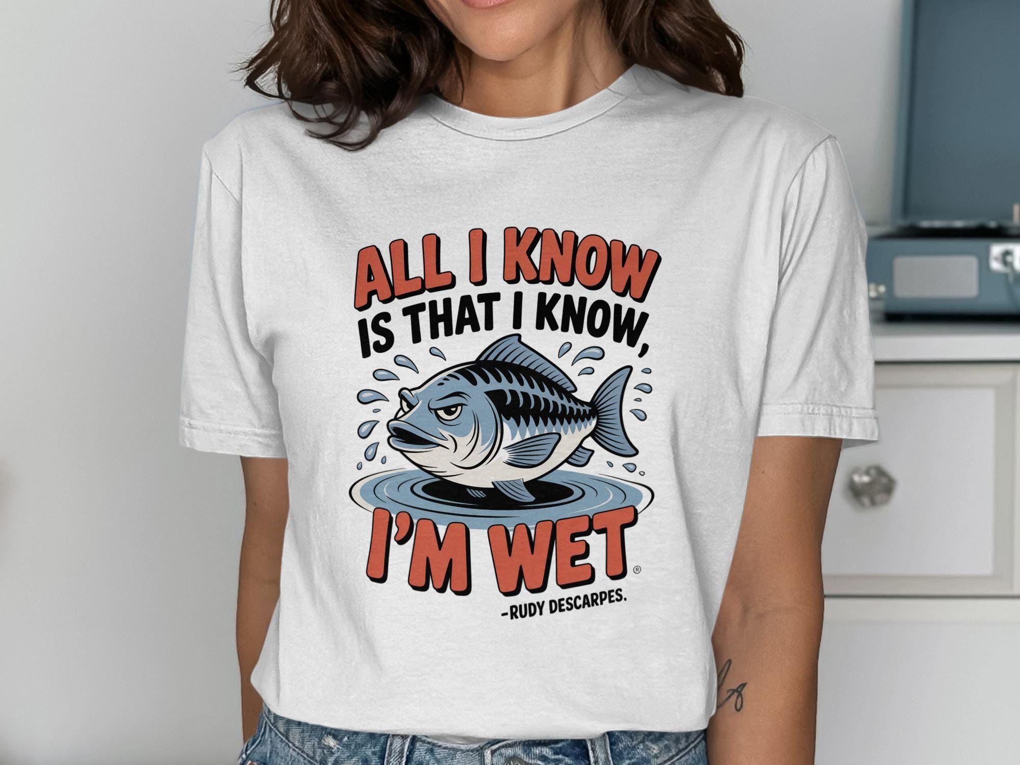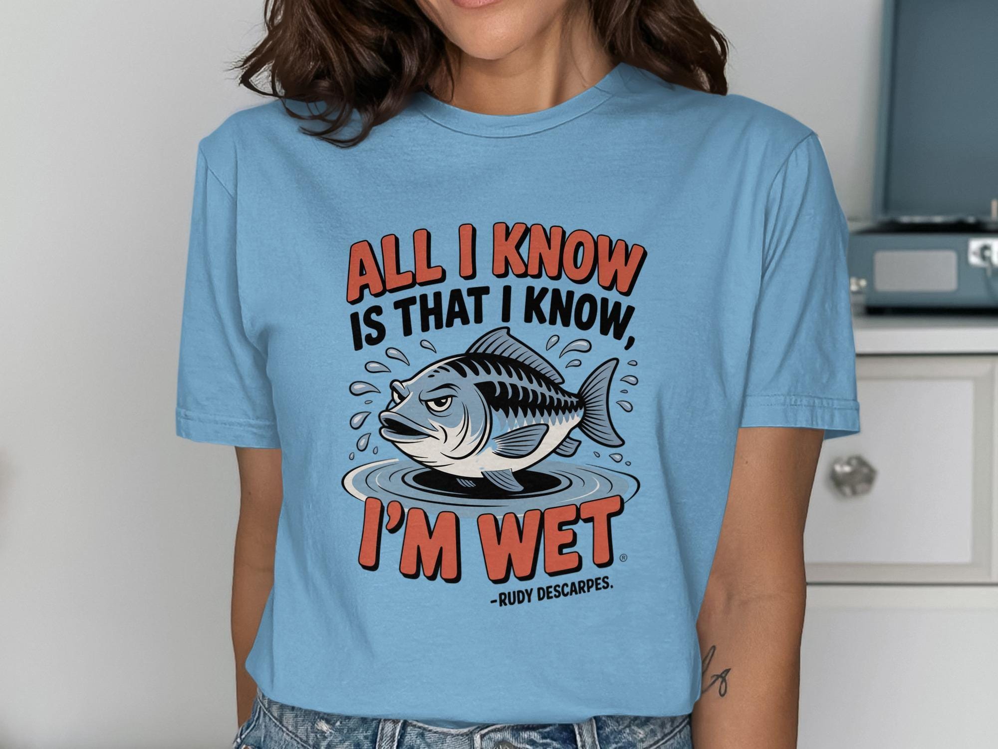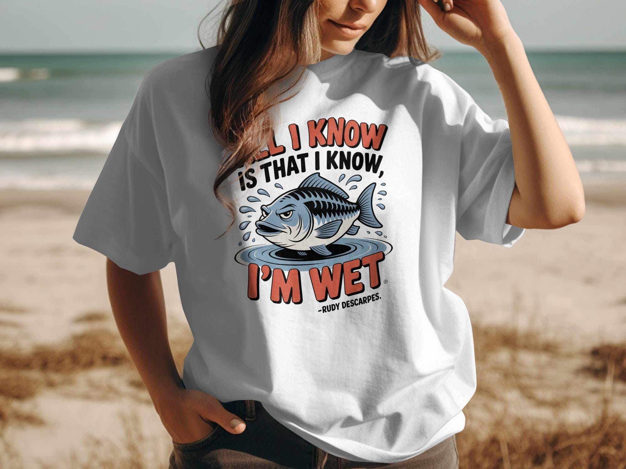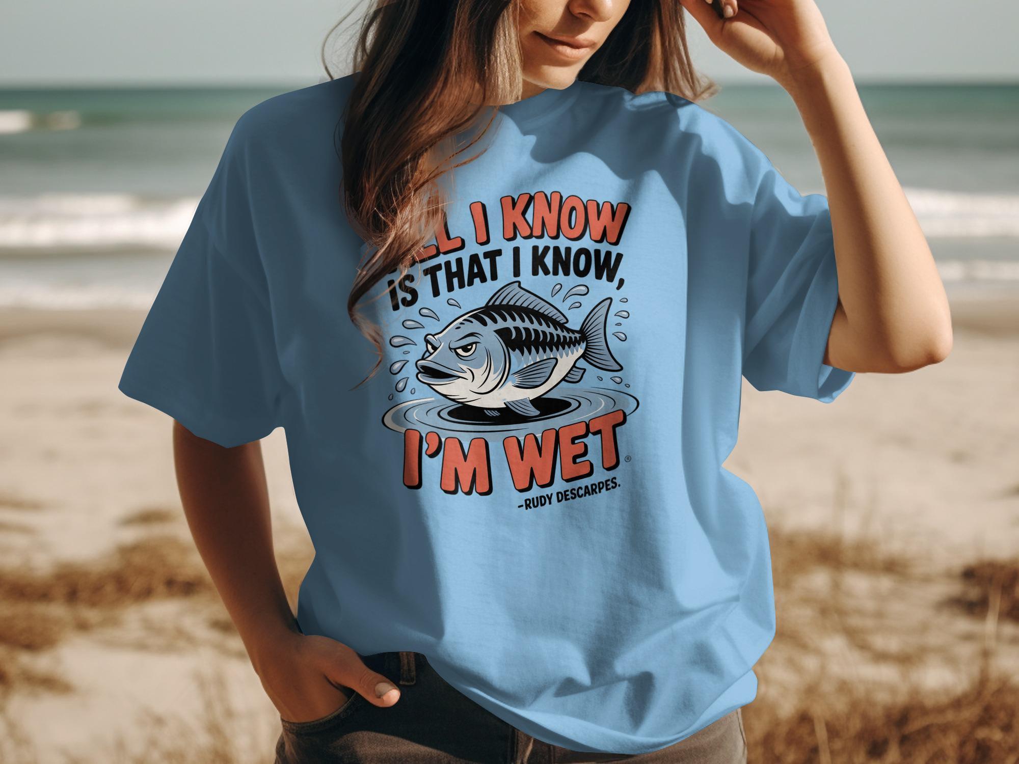 This funny fish shirt with its humor tee design makes the perfect fishing enthusiast gift idea and statement top for anyone who appreciates quirky design and witty graphics. Crafted from quality cotton apparel for comfortable casual wear, this conversation starter outfit will surely inspire unique style with its memorable "All I Know Is That I Know I'm Wet" quote.