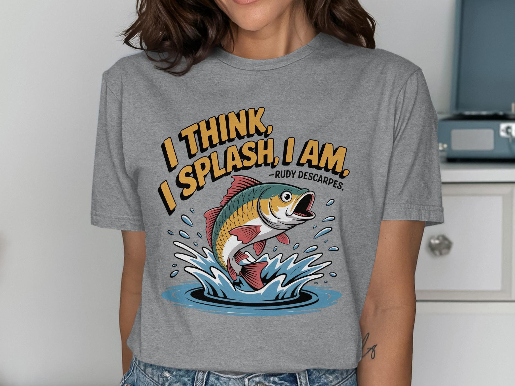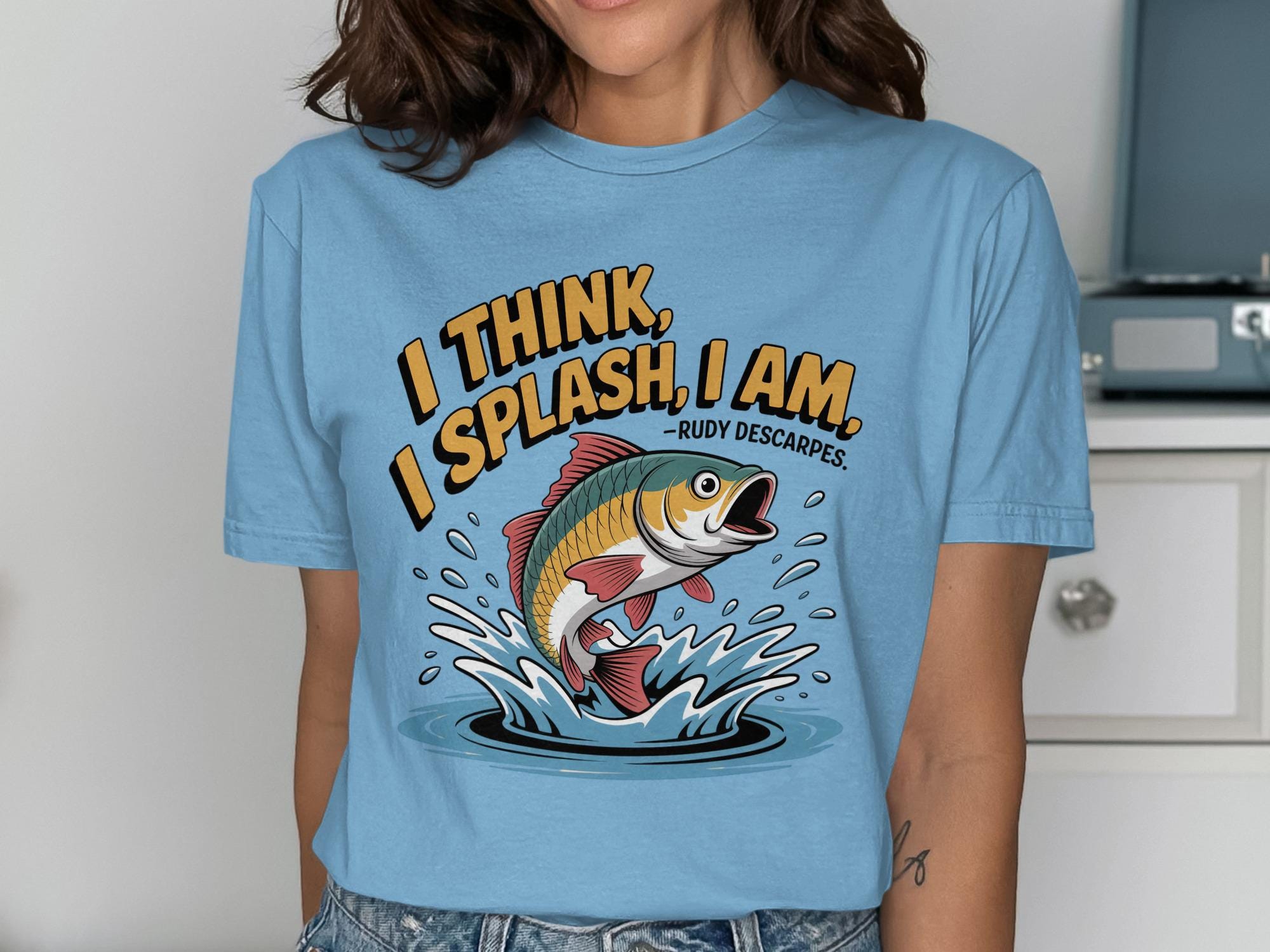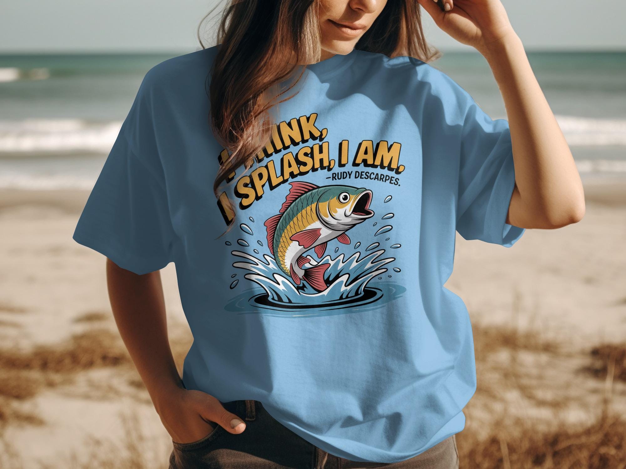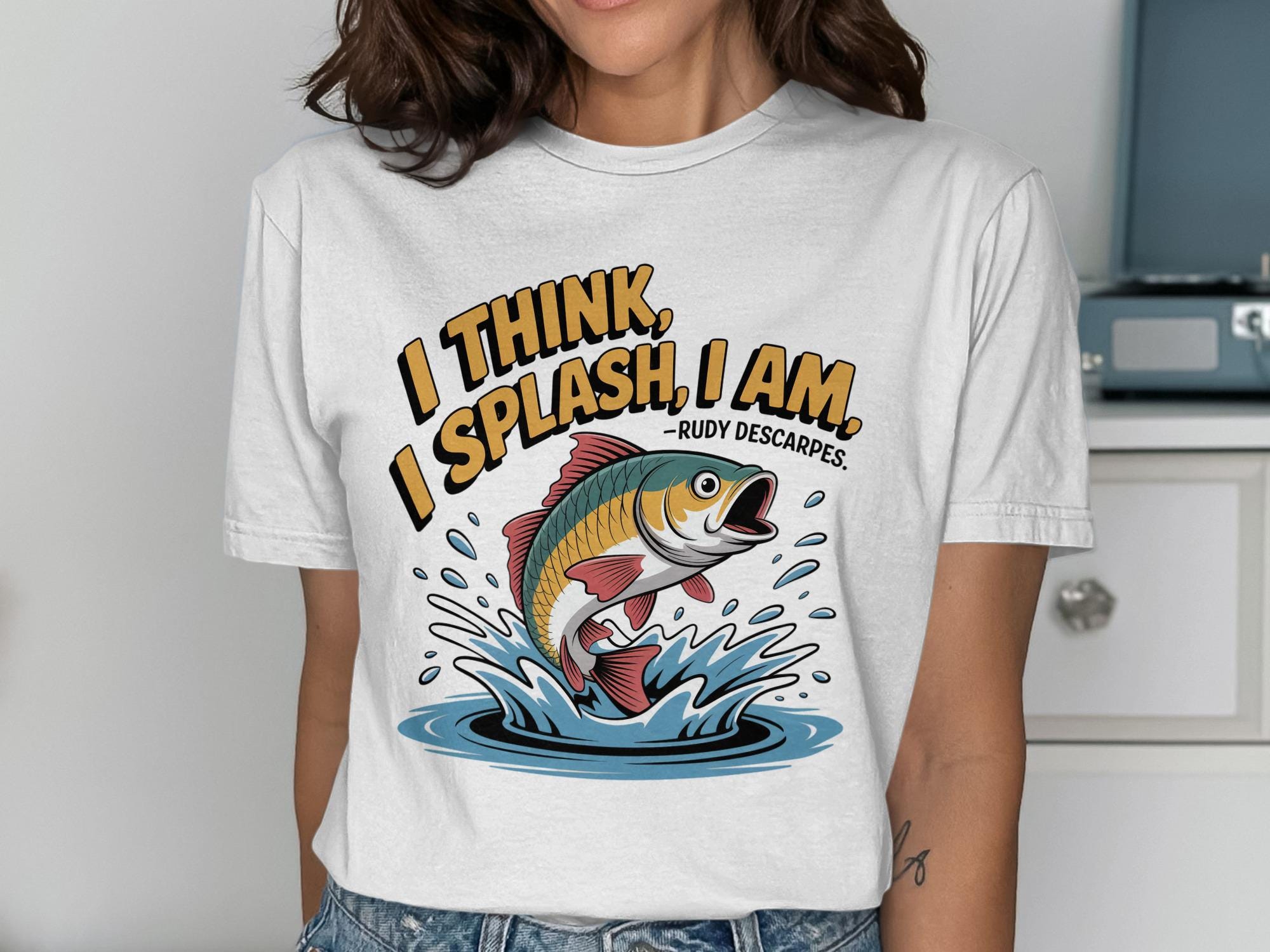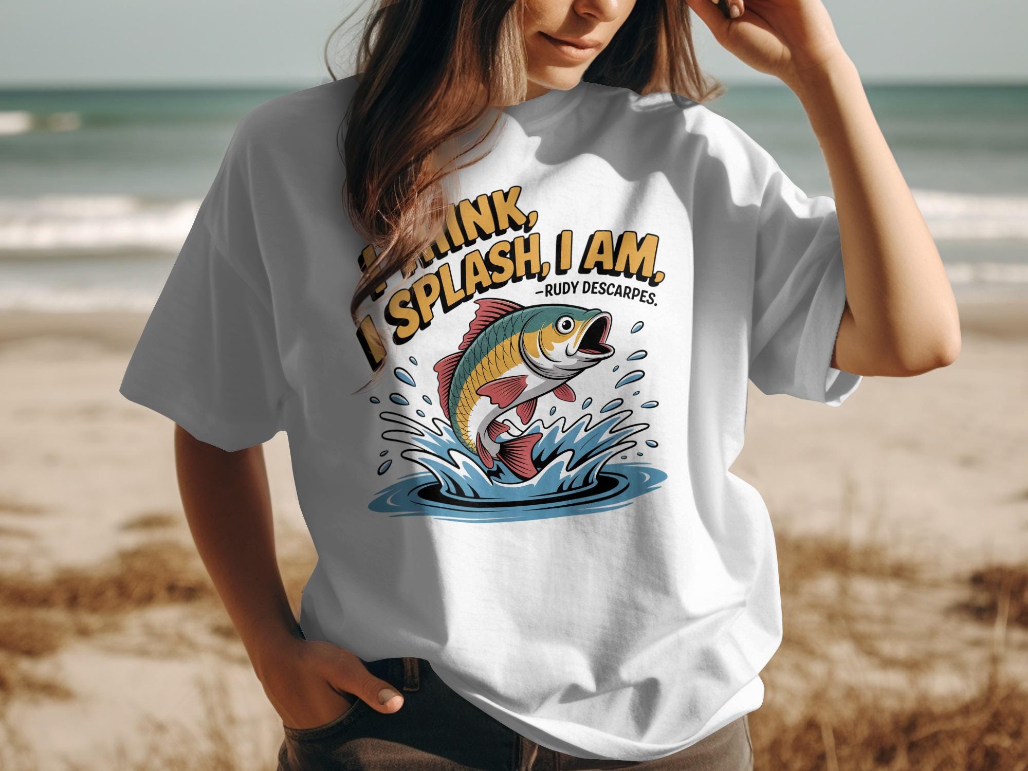 Dive into humor with our "I Think, Splash, I Am" T-Shirt, featuring a funny fish illustration and a witty quote from Rudy Descarpes. This tee is a great way to showcase your love for fishing, and cartoon animals.