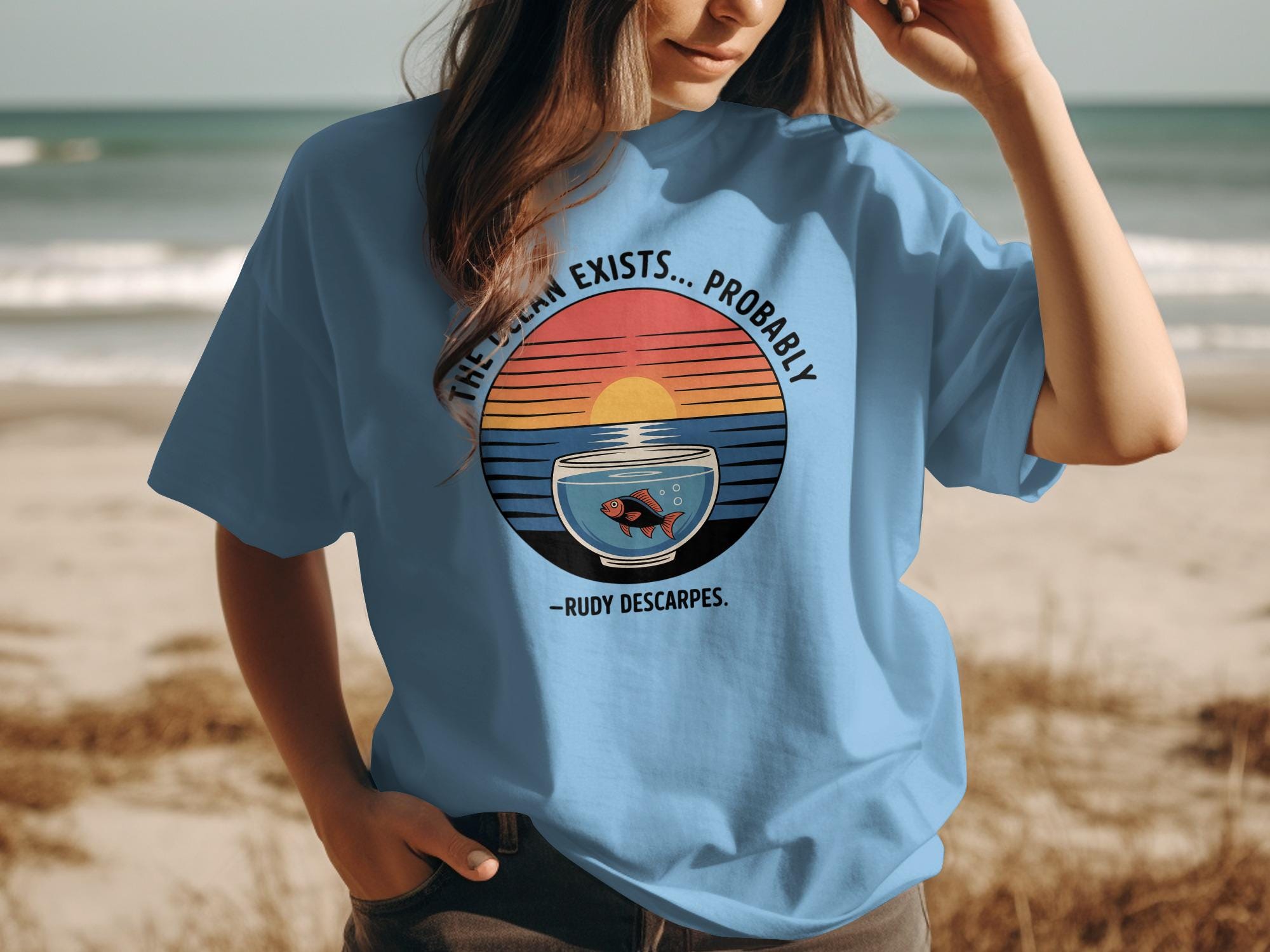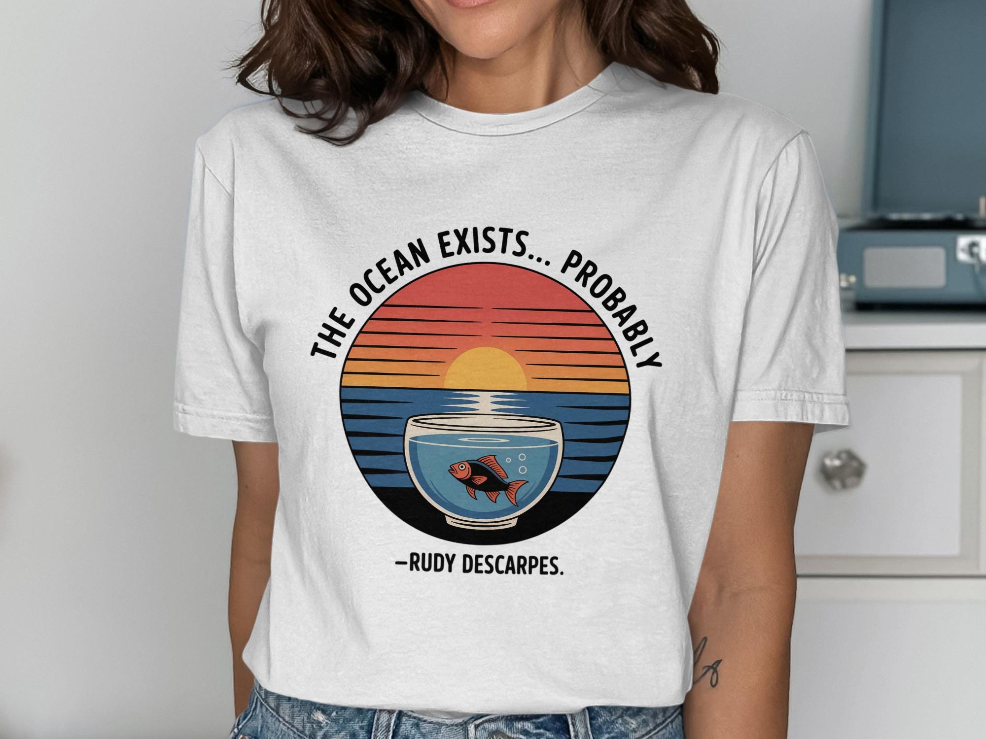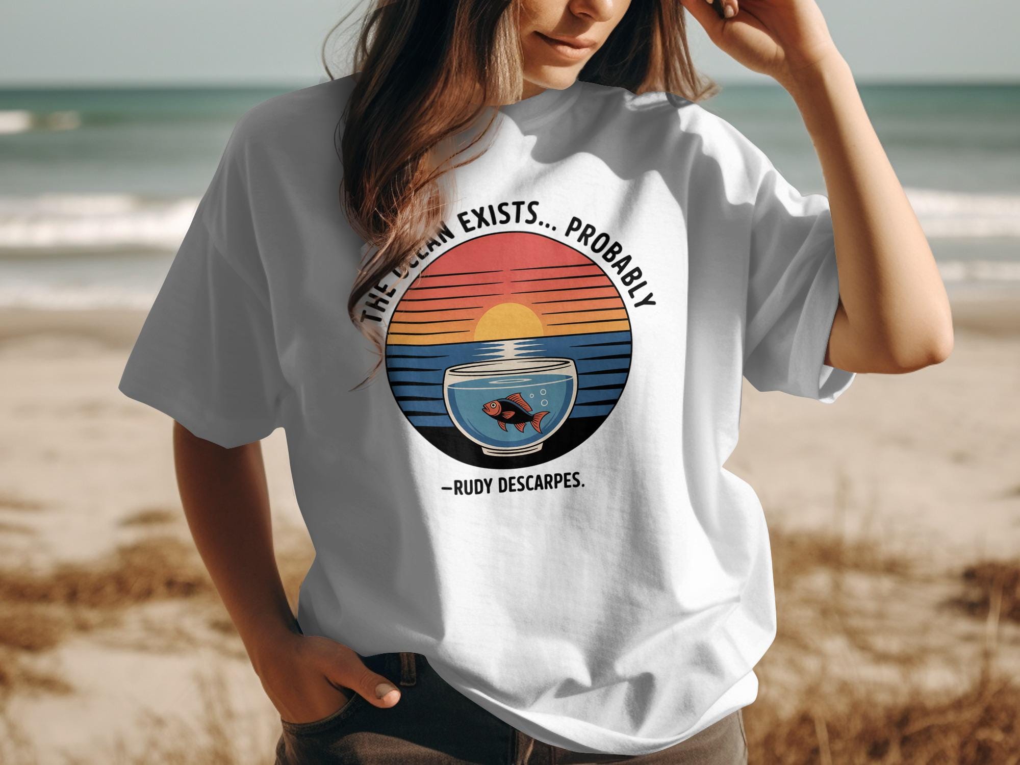 Dive into laughter with this unique T-Shirt! Featuring a funny and thought-provoking design that is sure to spark conversations and turn heads. This tee showcases a goldfish in a bowl superimposed over a retro sunset and ocean graphic, paired with the hilarious quote "The Ocean Exists... Probably" by Rudy Descarpes. It is a perfect blend of humor and artistic design. Get yours now and add a touch of wit to your wardrobe!