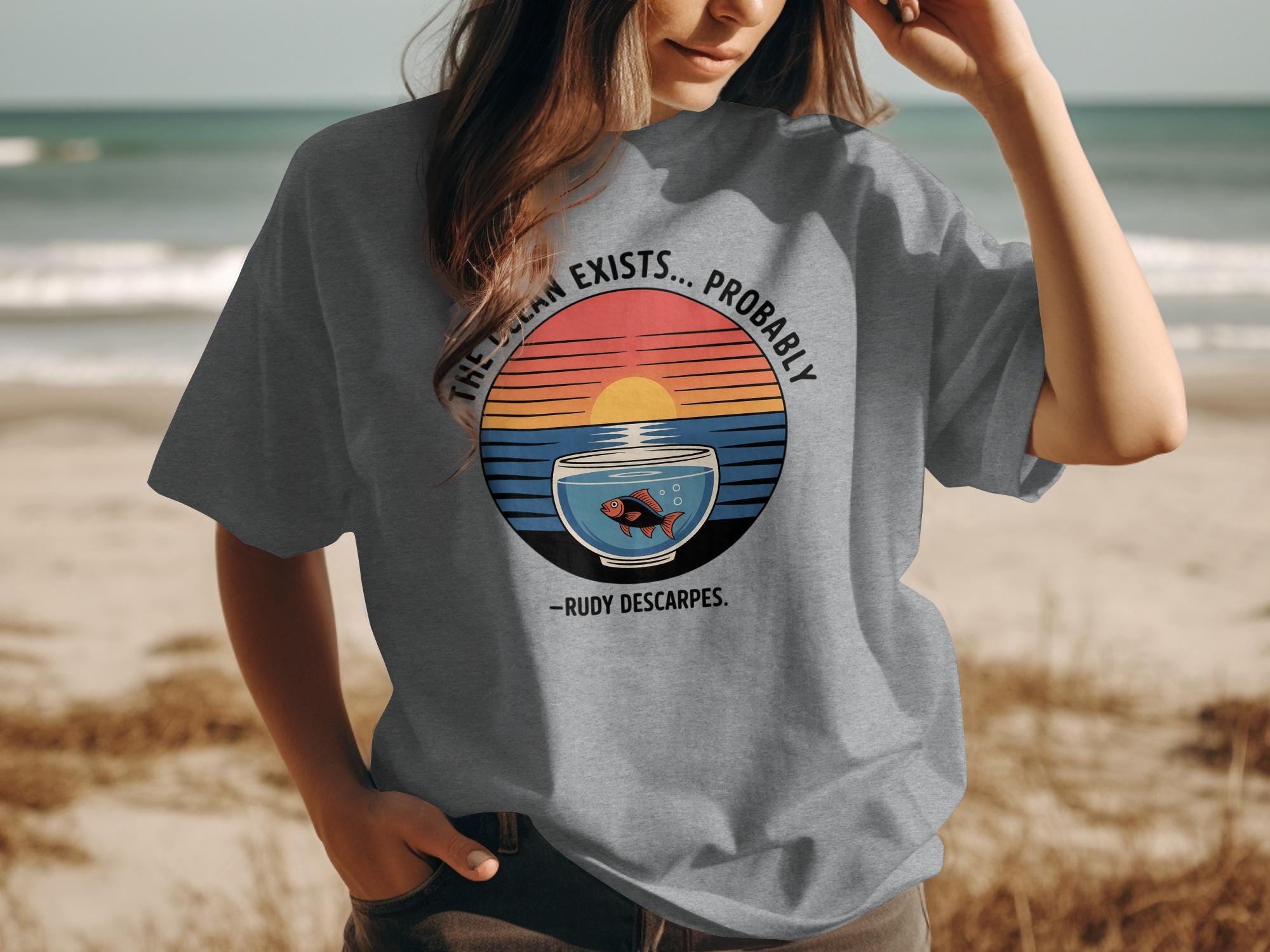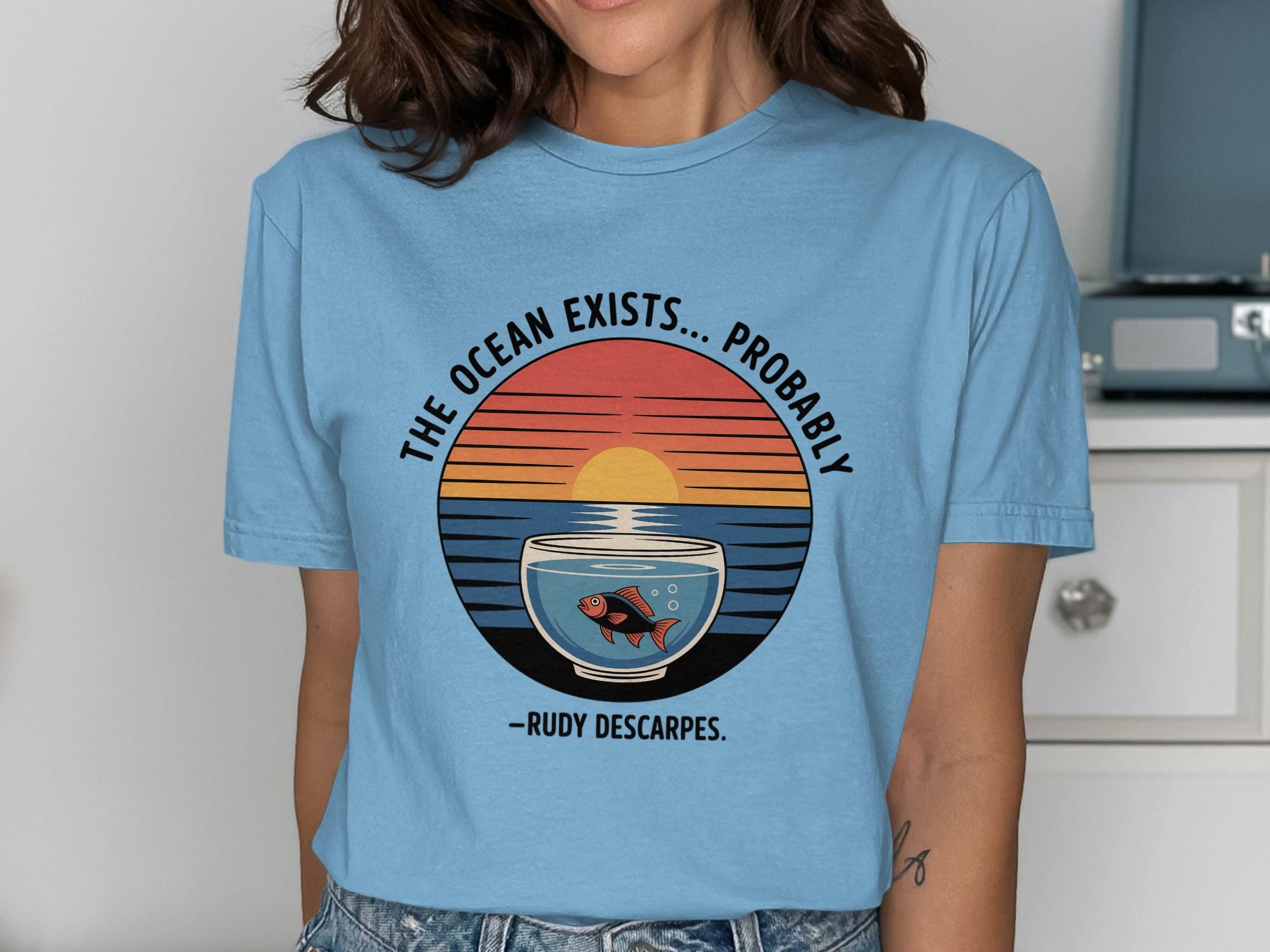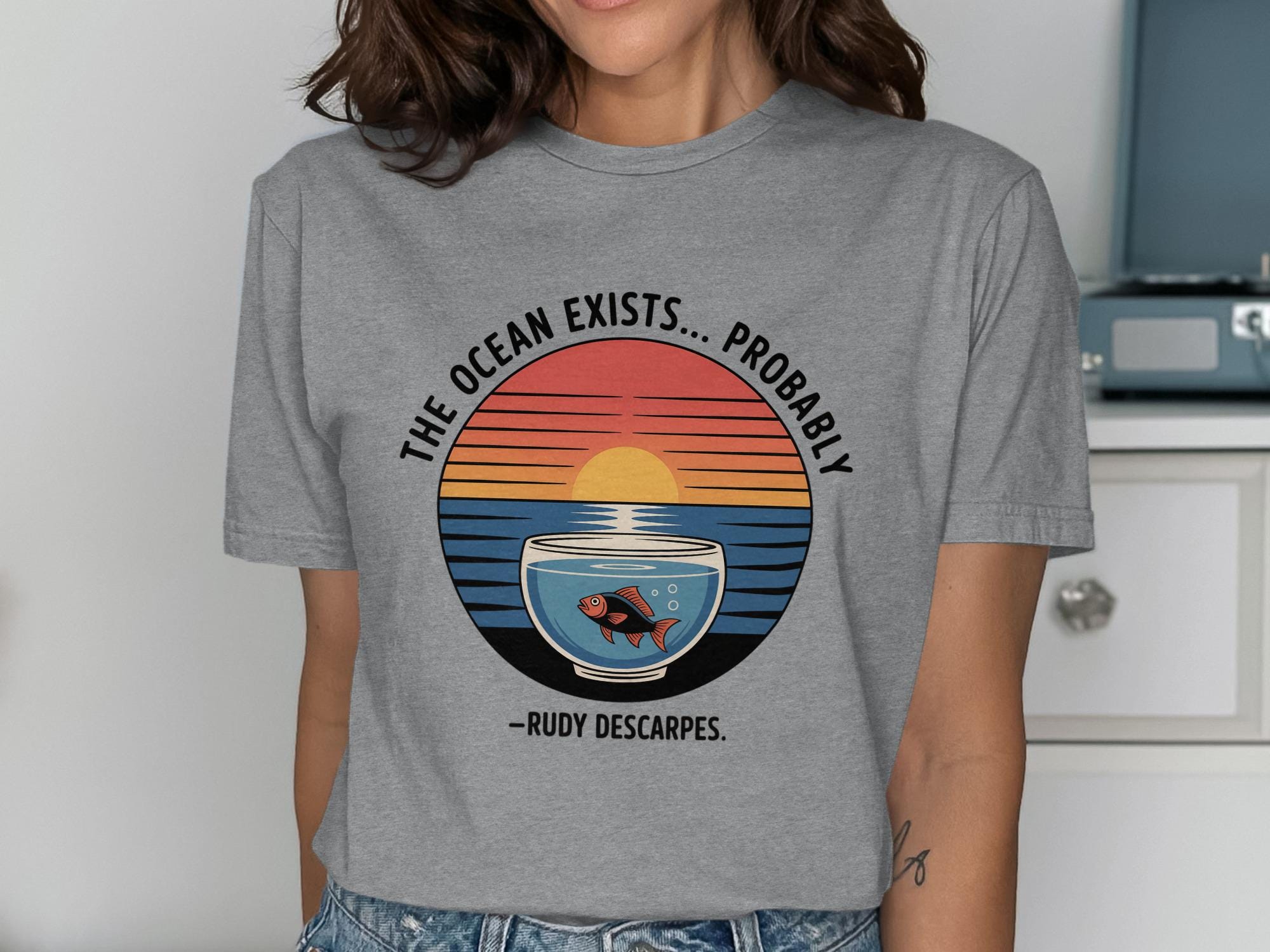 Dive into laughter with this unique T-Shirt! Featuring a funny and thought-provoking design that is sure to spark conversations and turn heads. This tee showcases a goldfish in a bowl superimposed over a retro sunset and ocean graphic, paired with the hilarious quote "The Ocean Exists... Probably" by Rudy Descarpes. It is a perfect blend of humor and artistic design. Get yours now and add a touch of wit to your wardrobe!