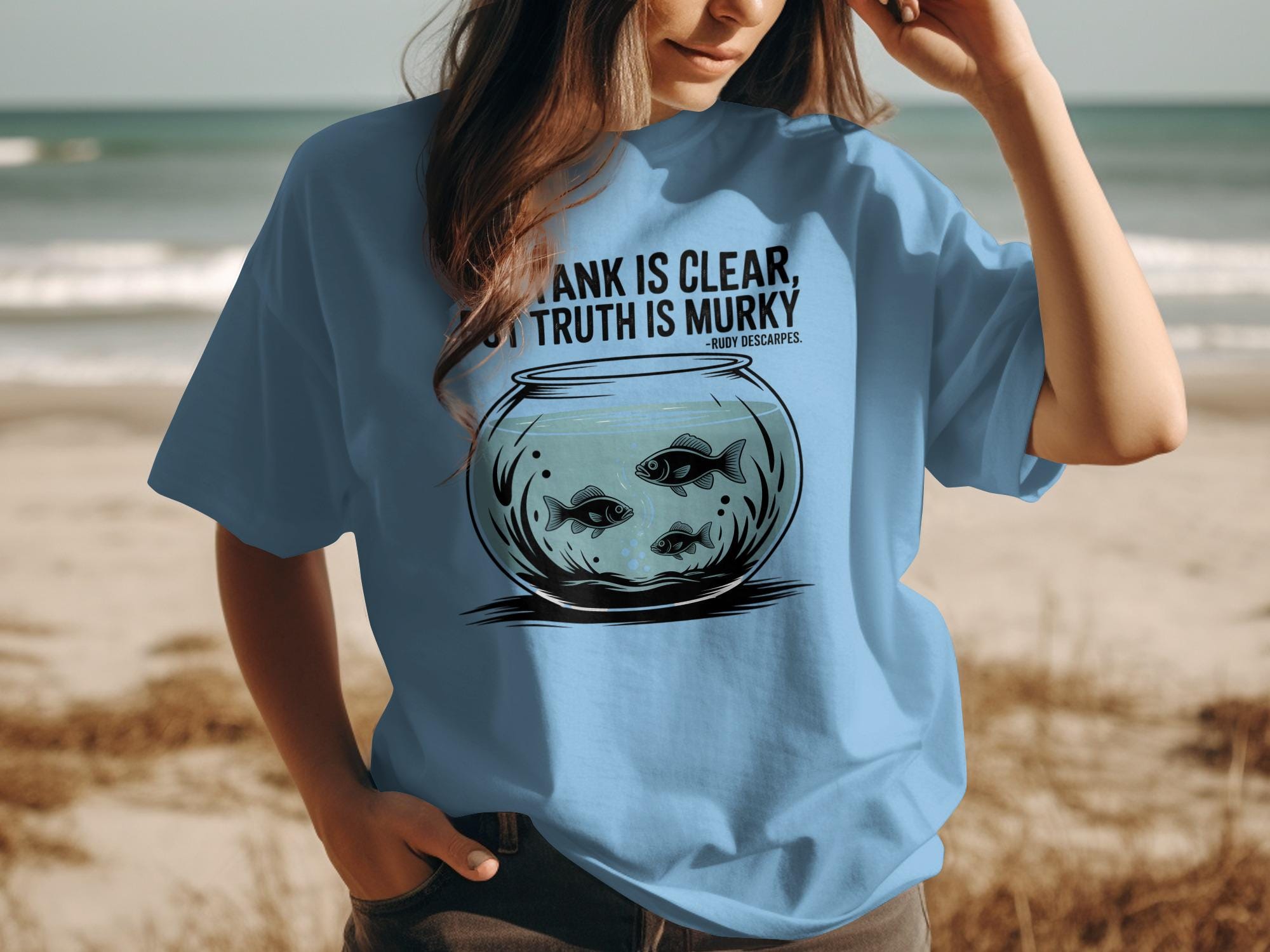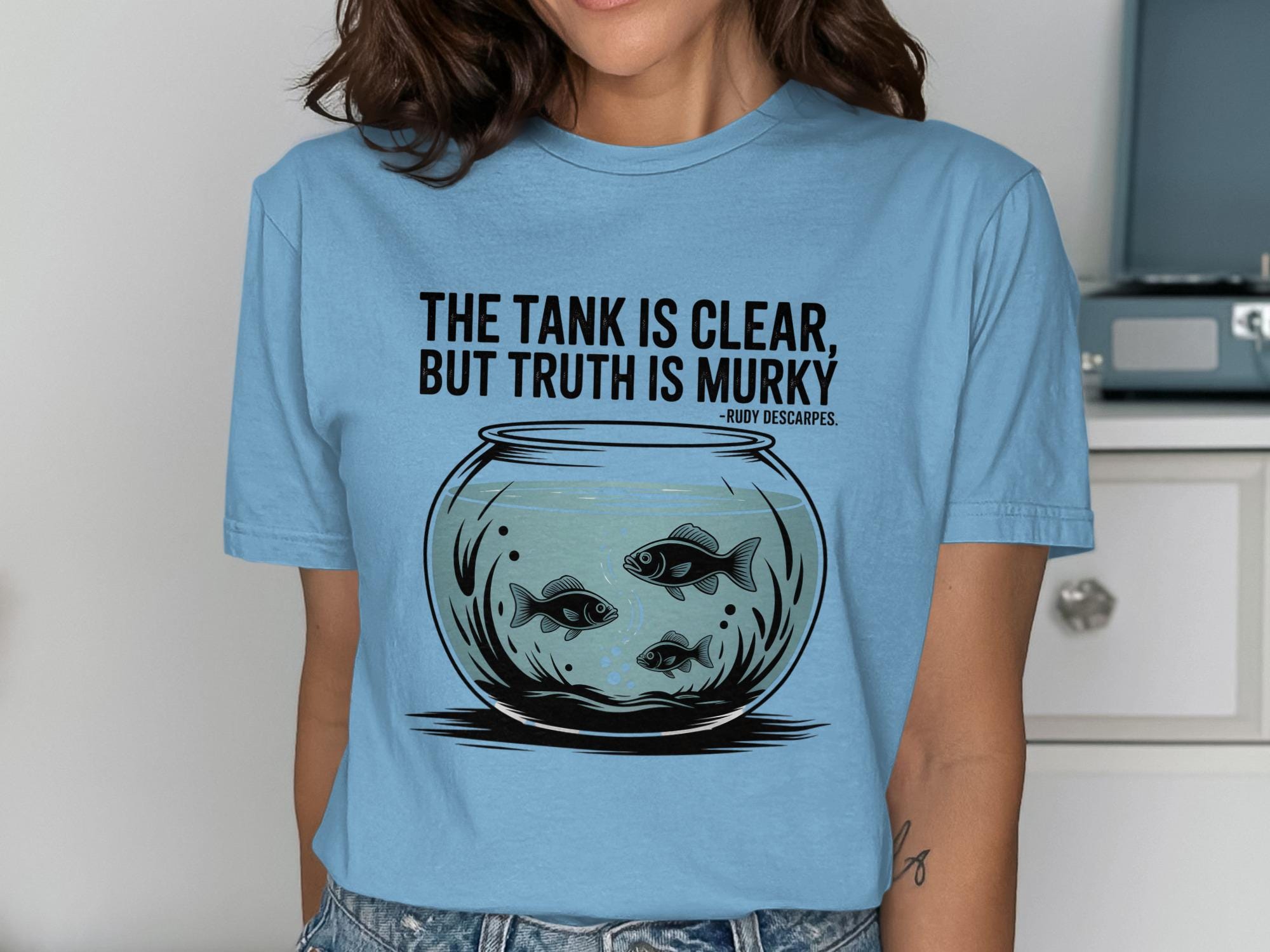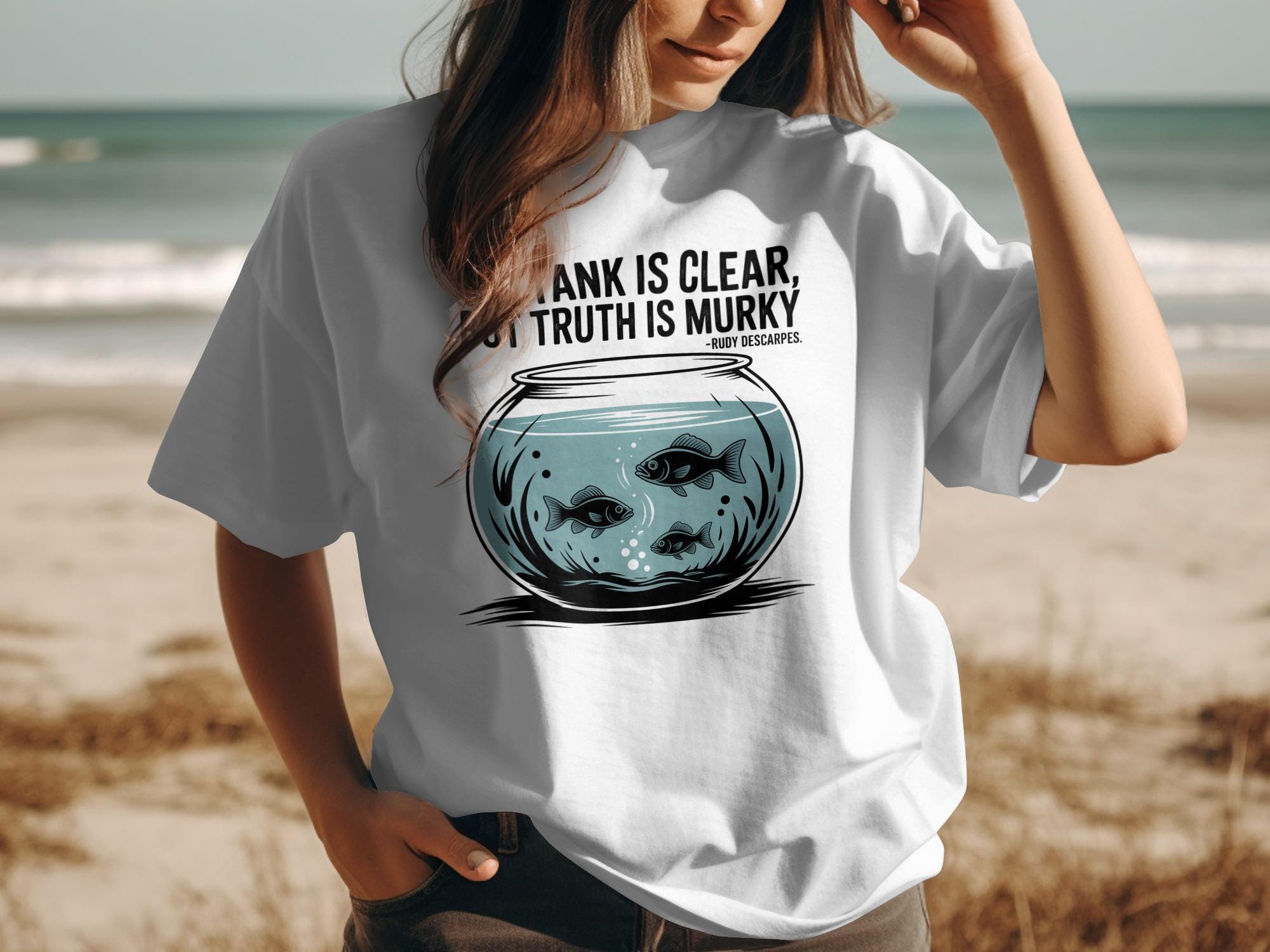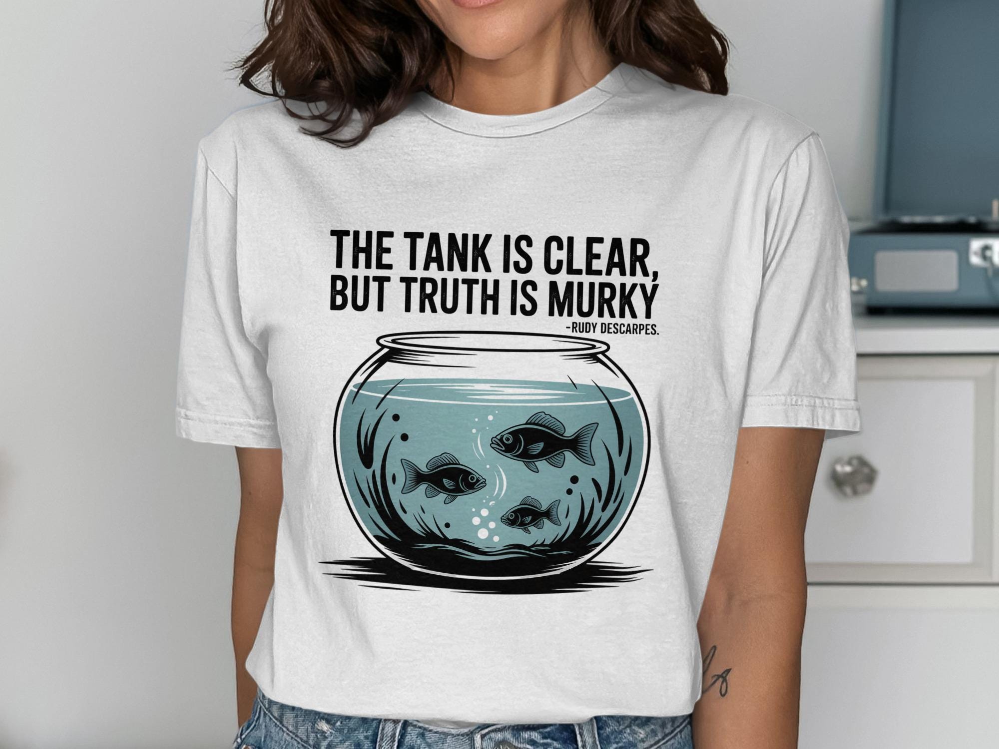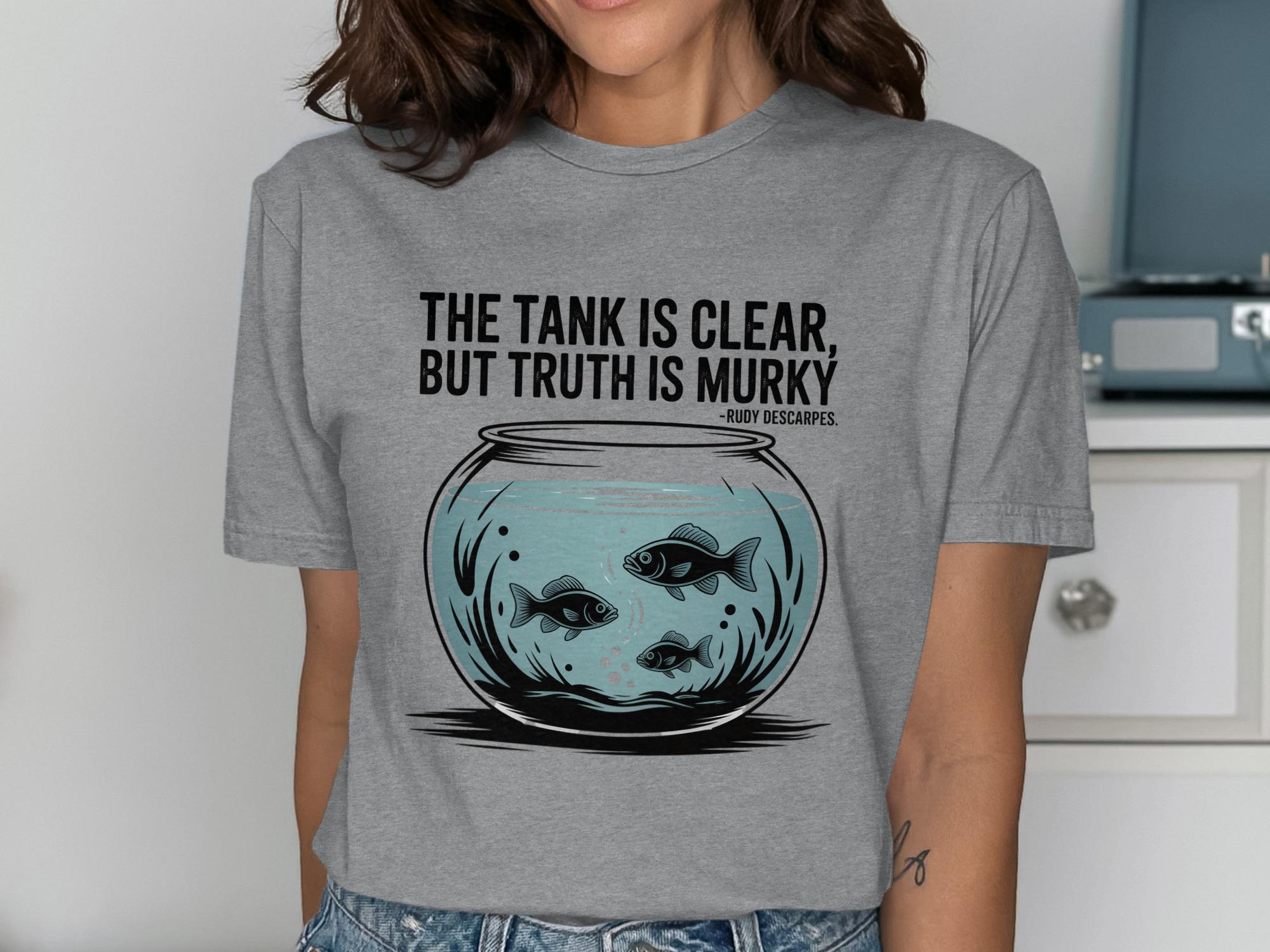 Dive into the depths of contemplation with our exclusive "The Tank Is Clear, Truth Is Murky" T-shirt. This thought provoking design features a captivating fish bowl illustration, complete with swimming fish and the insightful quote by Rudy Descarpes. It's the perfect conversation starter and a stylish addition to any wardrobe.