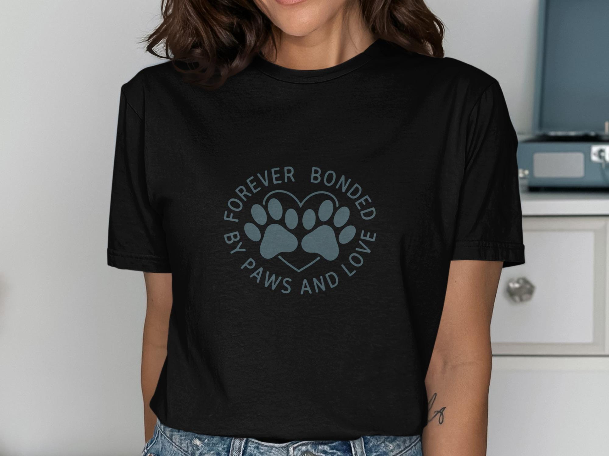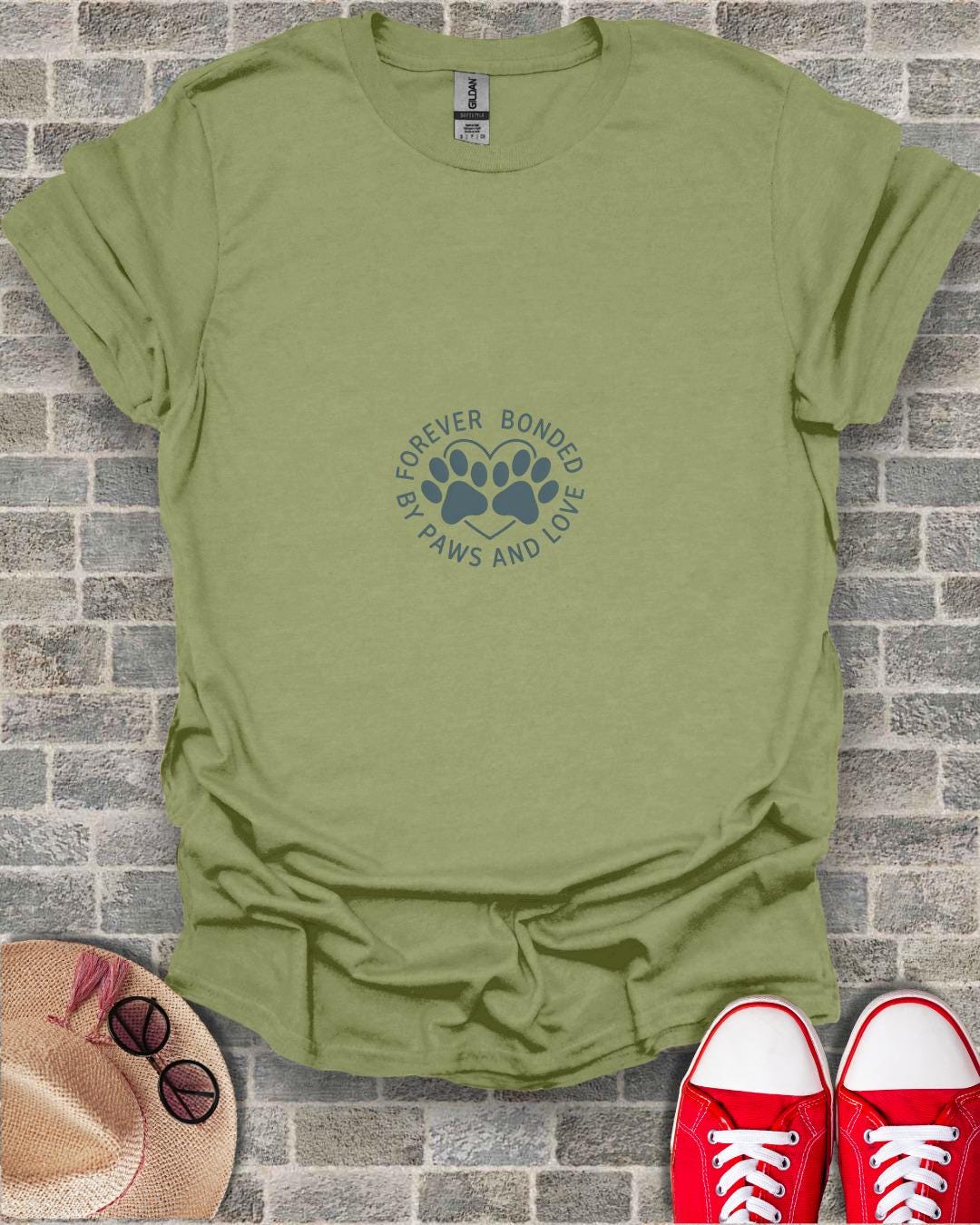 Show your love for pets with this adorable T-shirt featuring a heart-shaped paw design and the phrase "Forever Bonded By Paws And Love." Perfect for pet lovers, this tee makes a great gift for any occasion. Comfortable and stylish, it’s great for everyday wear.
