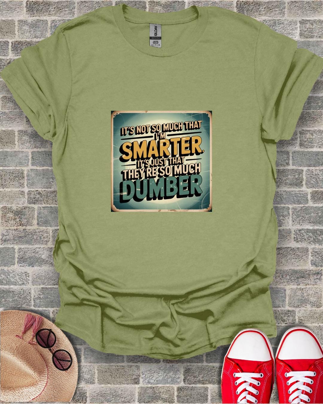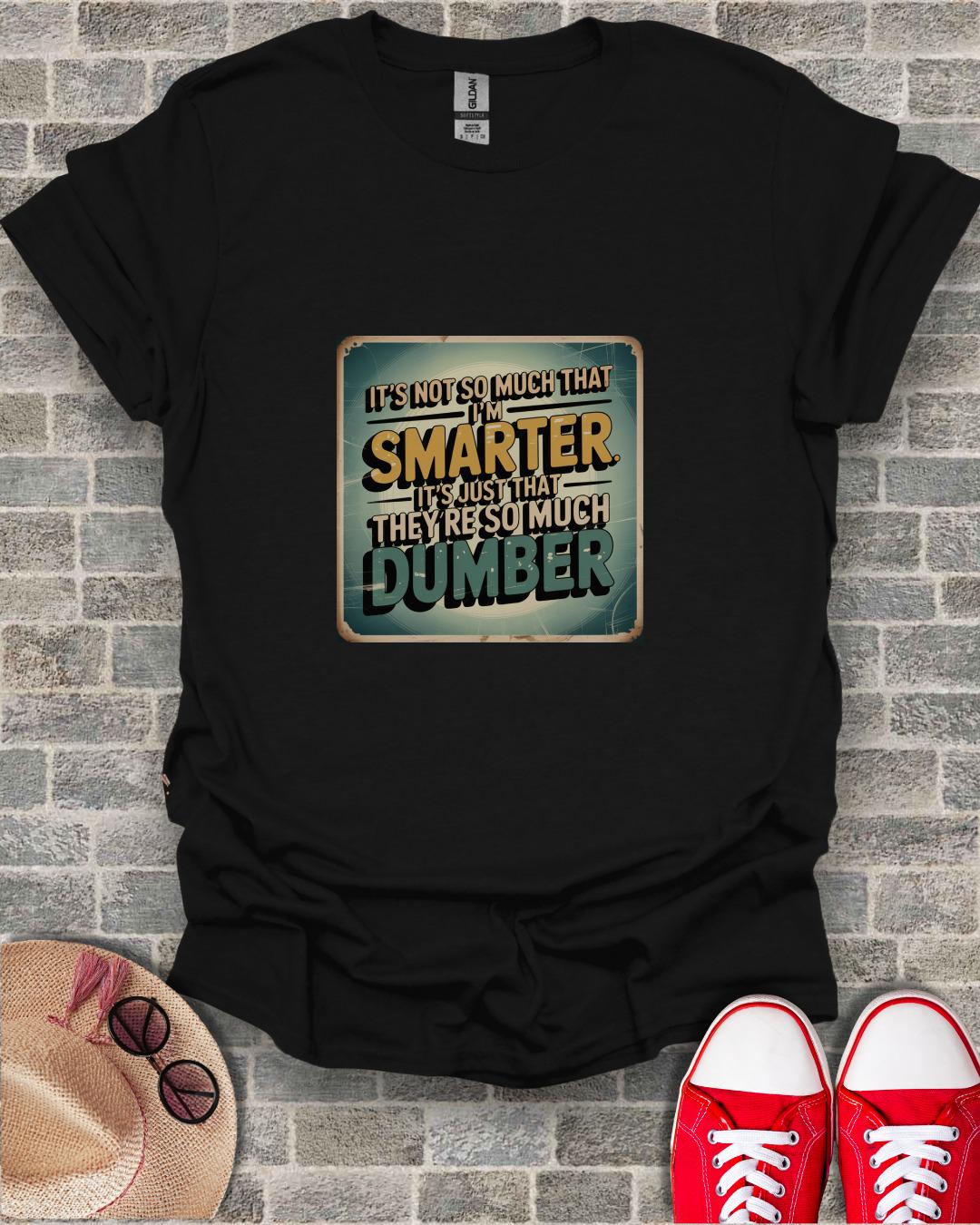 This T-shirt features a hilarious quote that says "It's Not So Much That I'm Smarter, It's Just That They're So Much Dumber". Perfect for those who love sarcastic humor and witty statements, this tee will surely make a statement and get a few laughs. Ideal for casual outings, gatherings with friends, or just to show off your clever side. Available in various sizes for both men and women.