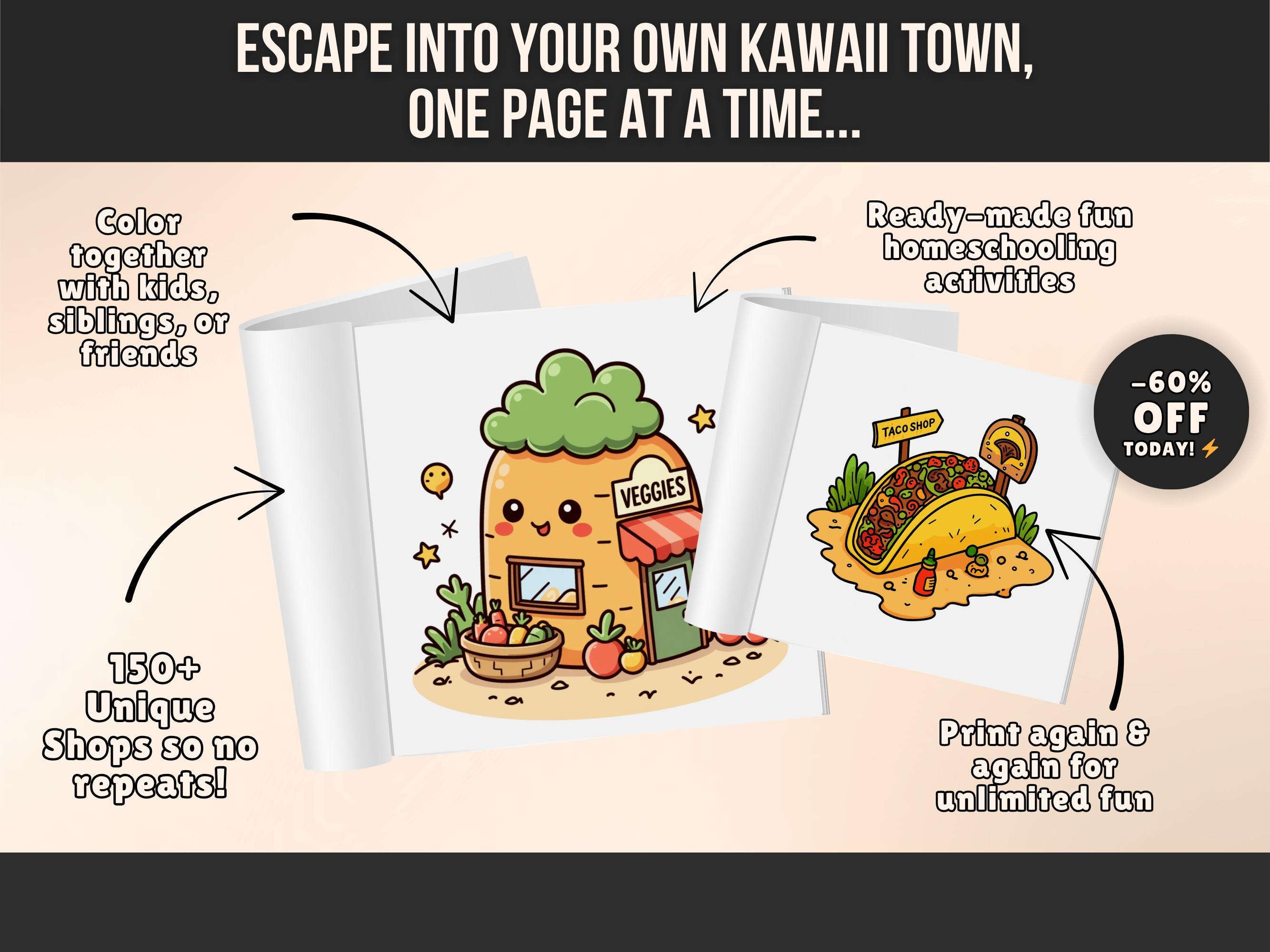 With this 150 Tiny Shops Kawaii Coloring Book Printable PDF, you’ll not only enjoy hours of creative fun, but you’ll also experience the calm focus that coloring brings. Imagine feeling – stress melting away, kids entertained without screens, a sense of accomplishment with each page finished.