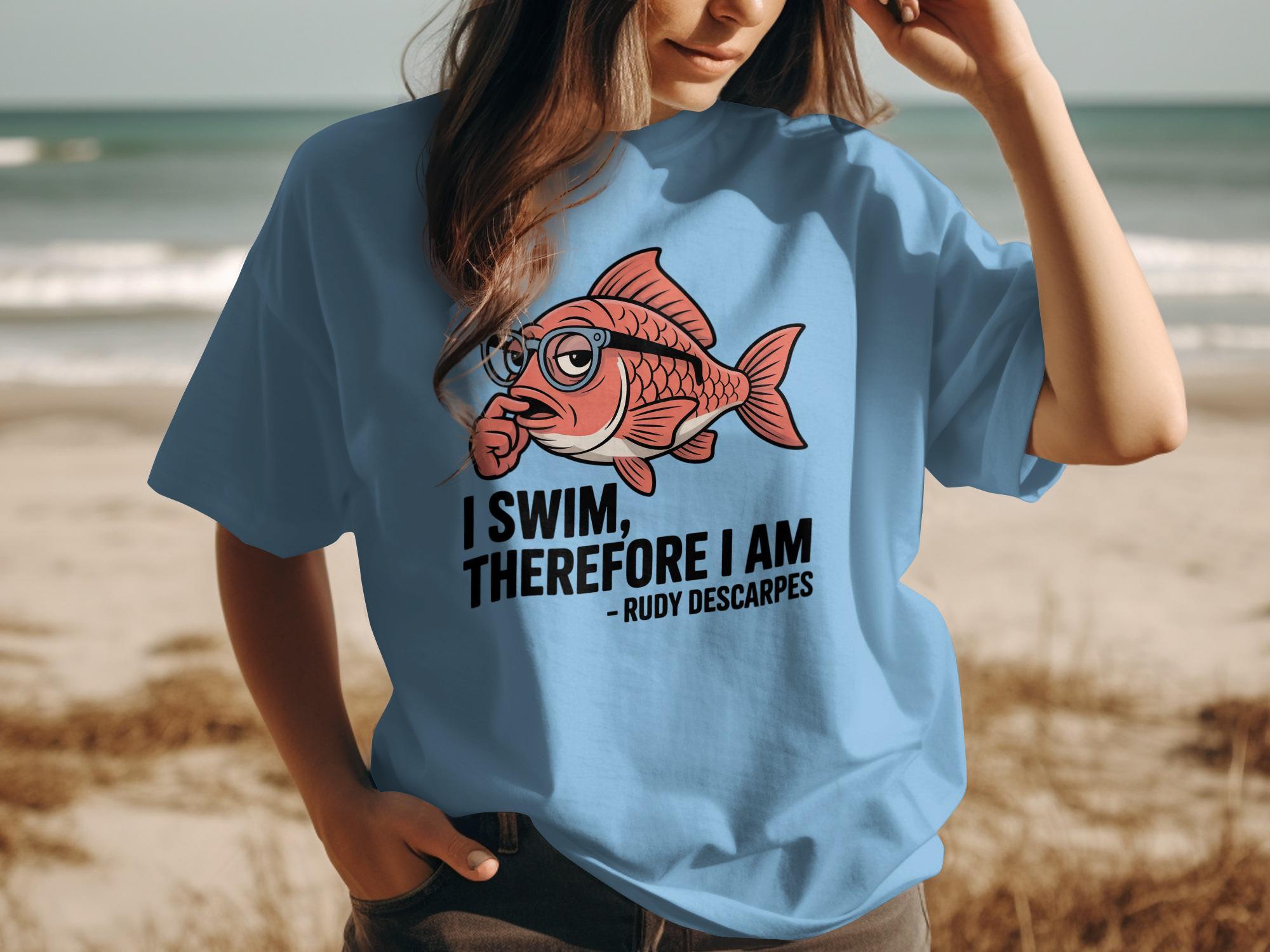 • Features a humorous illustration of a contemplative red fish wearing glasses with a finger on its chin, alongside the clever pun "I swim, therefore I am" by "Rudy Descarpes"