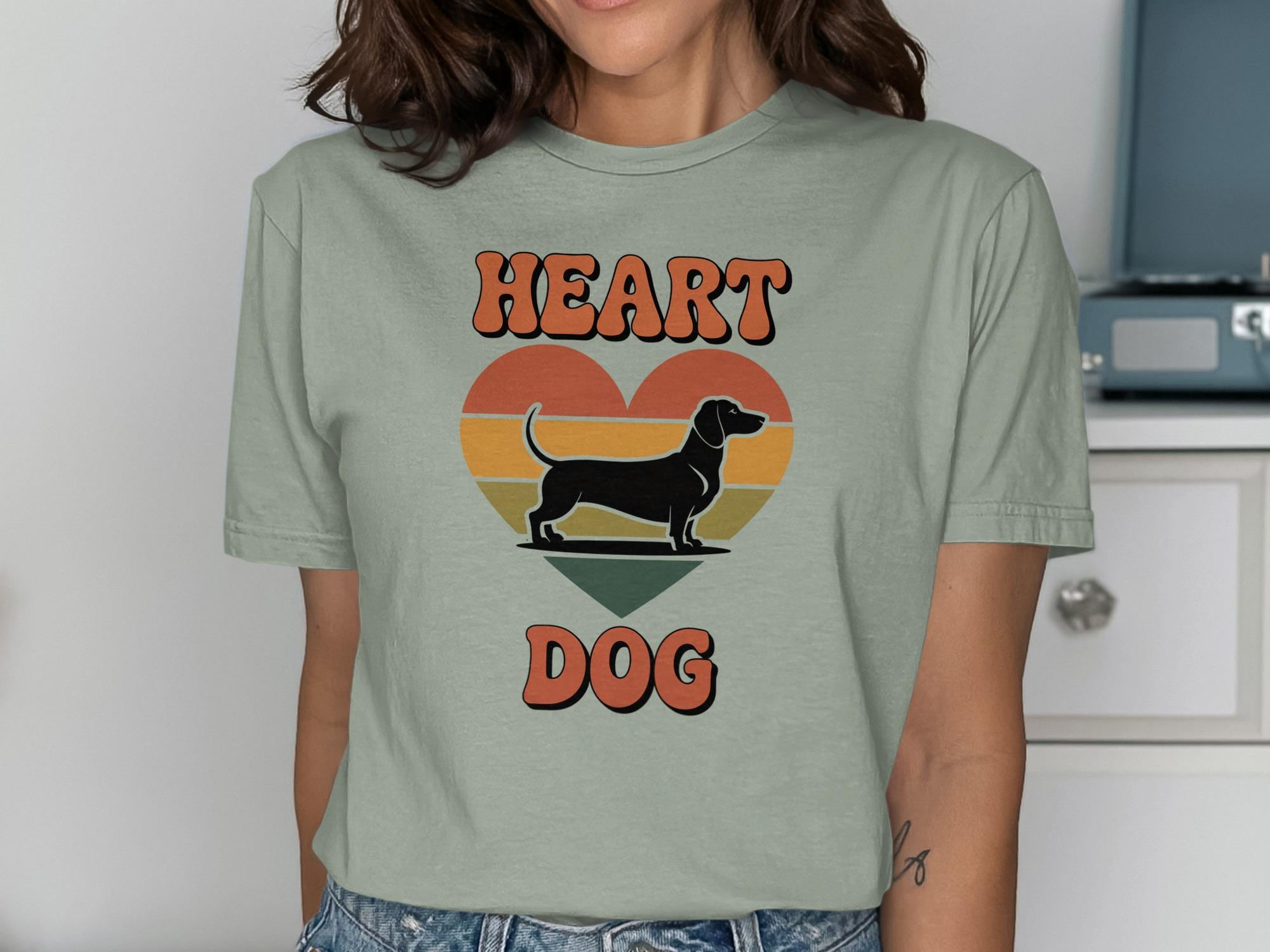 Show your love for Dachshunds with this adorable T-shirt! Featuring a retro style heart design with a Dachshund silhouette, this shirt is perfect for any dog lover.