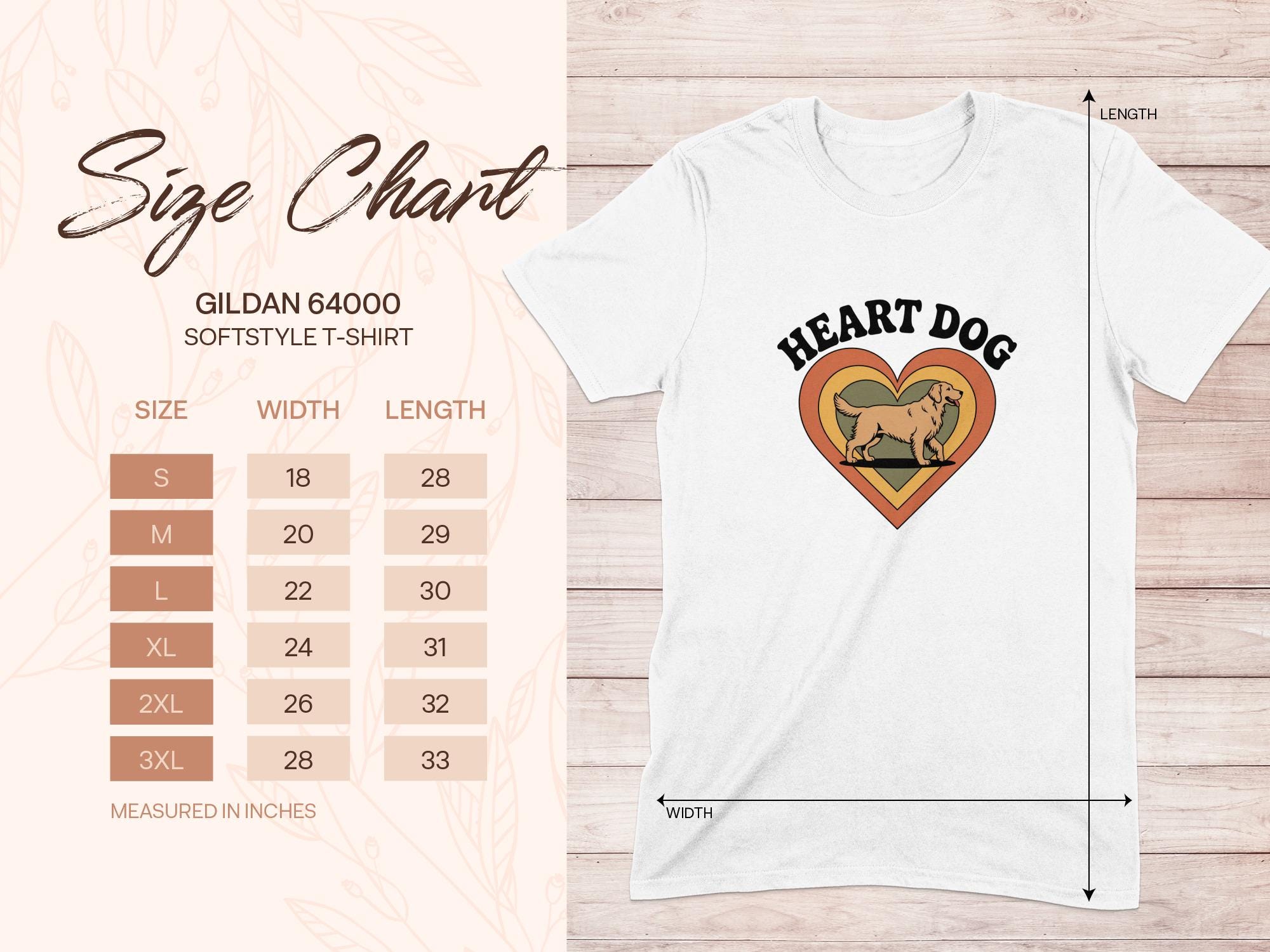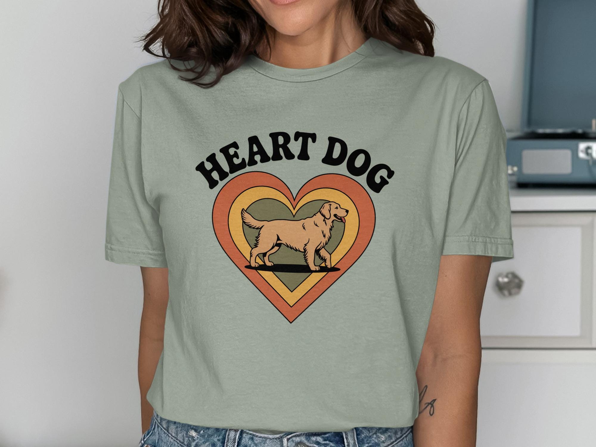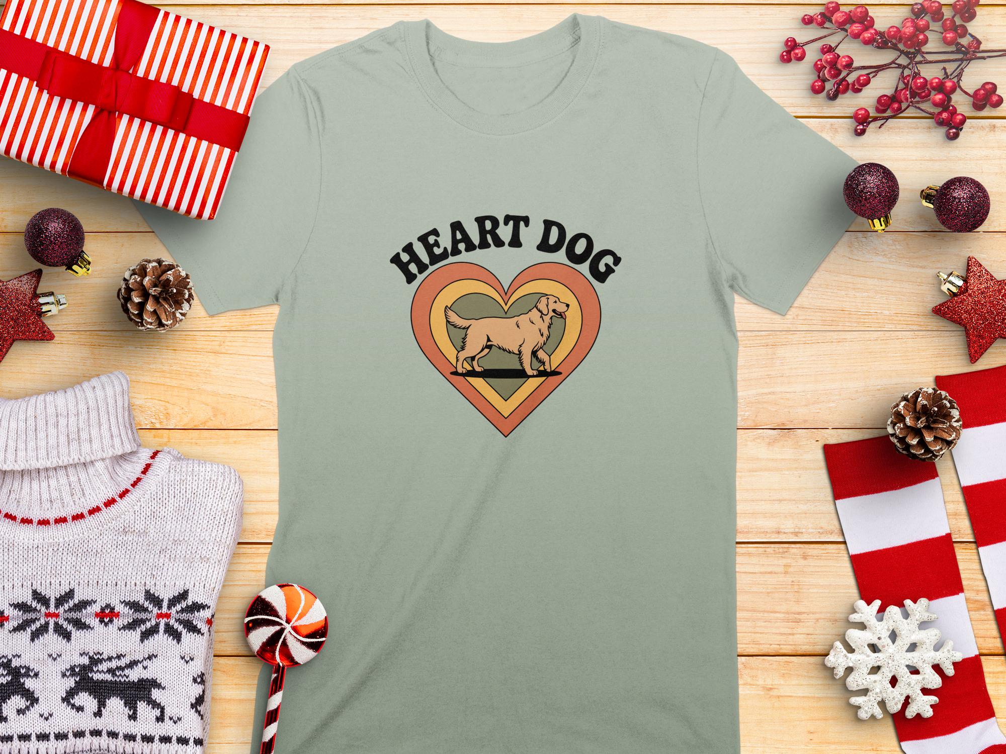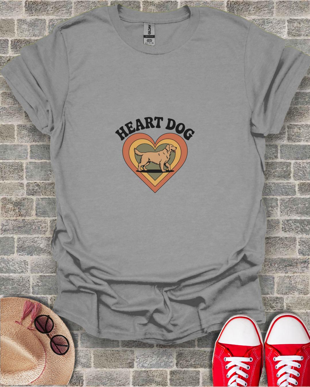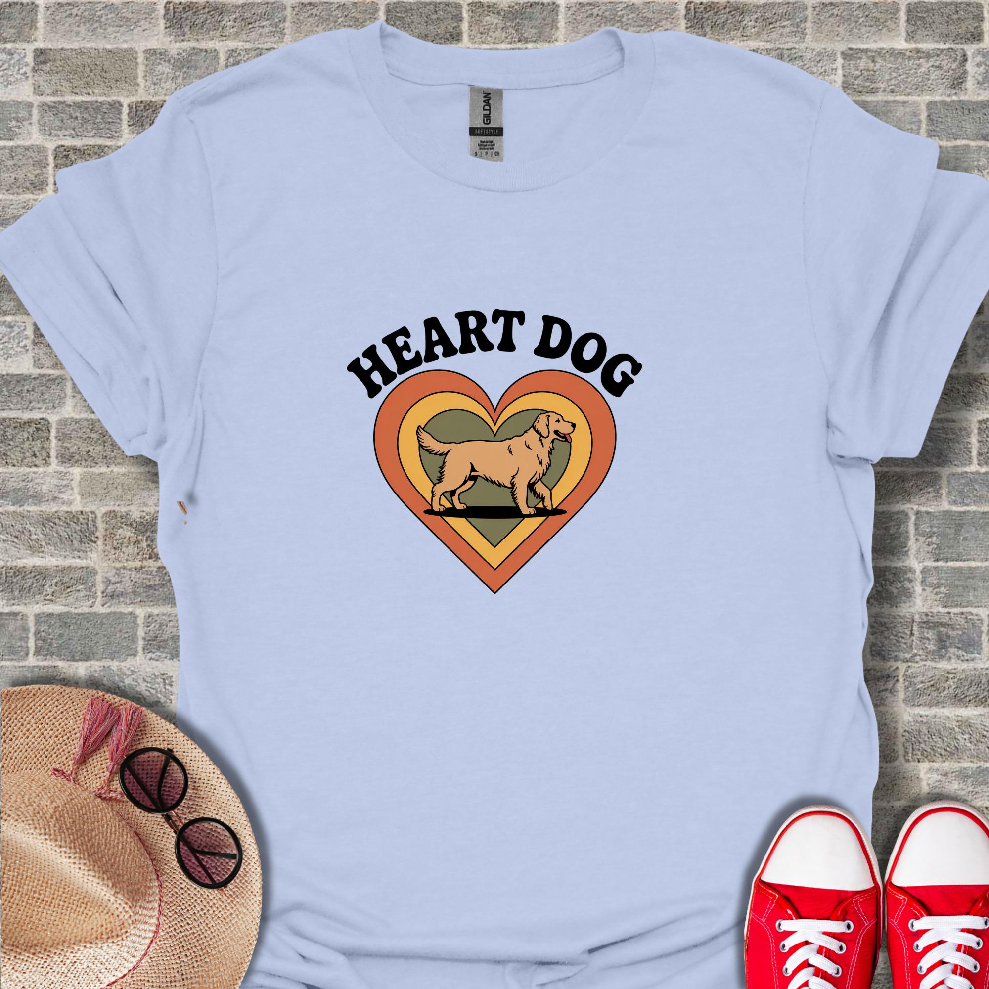 Show your love for dogs with this unique Heart Dog T-Shirt. Featuring a charming design of a Golden Retriever inside a retro-style heart, this shirt is perfect for any dog lover.