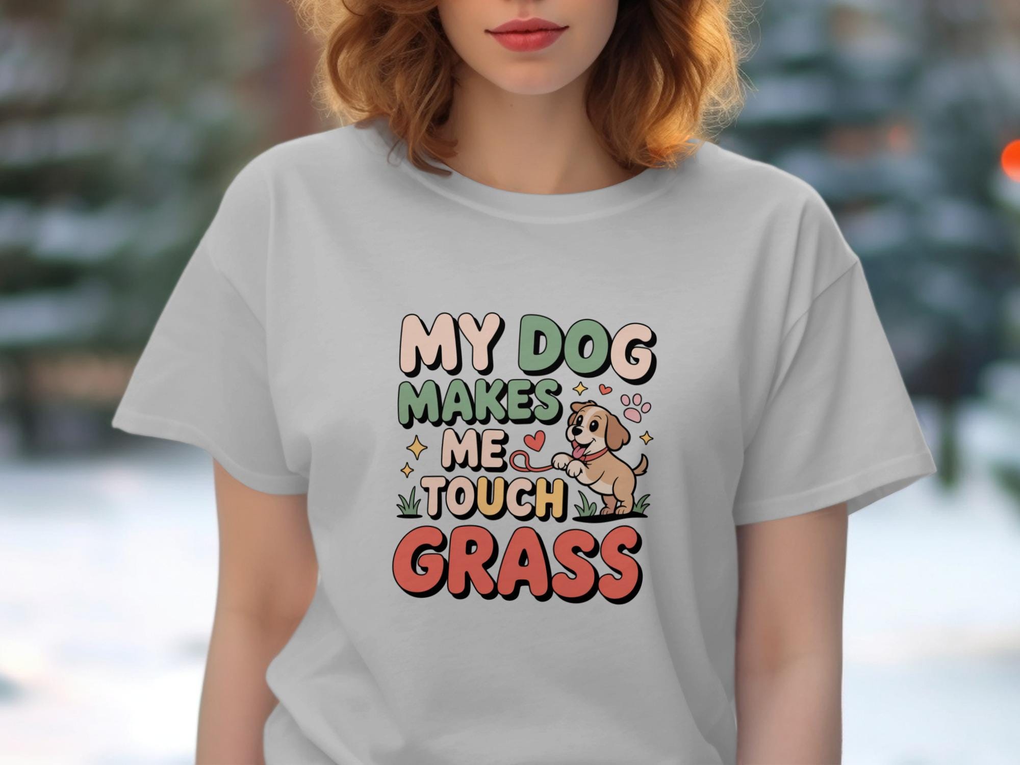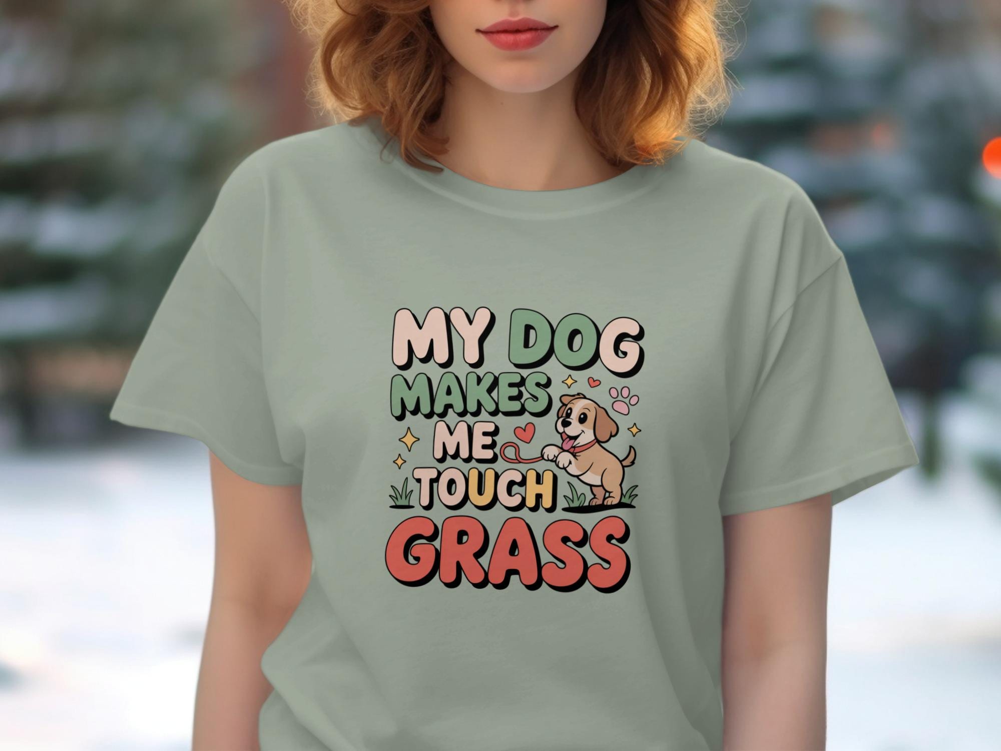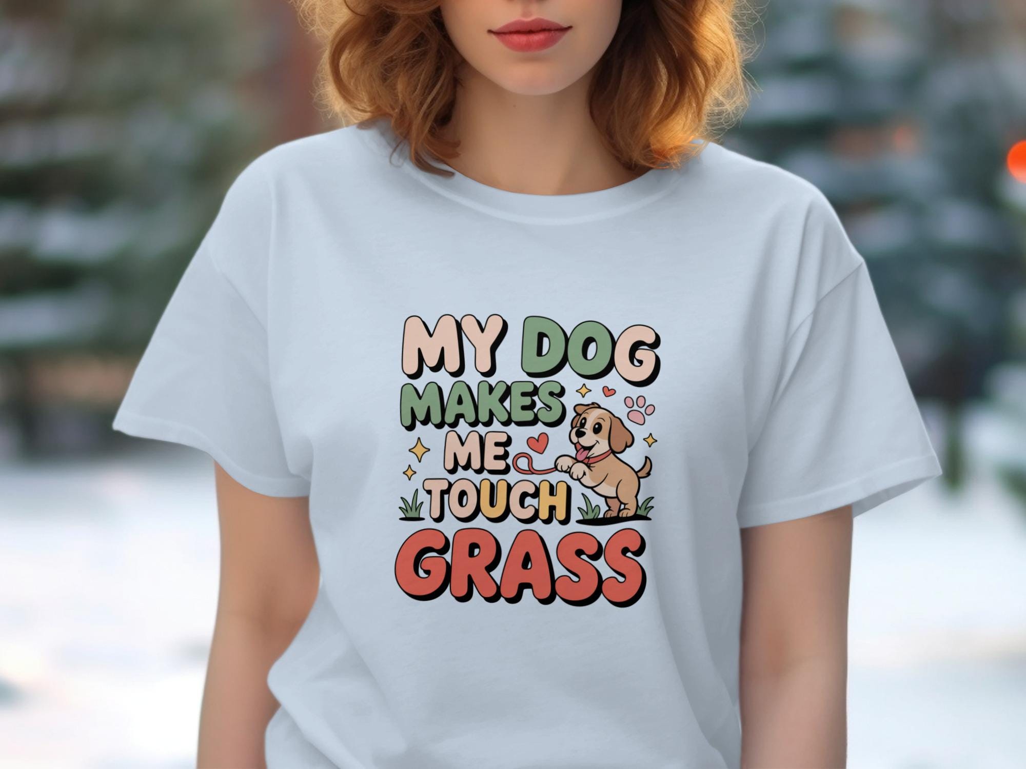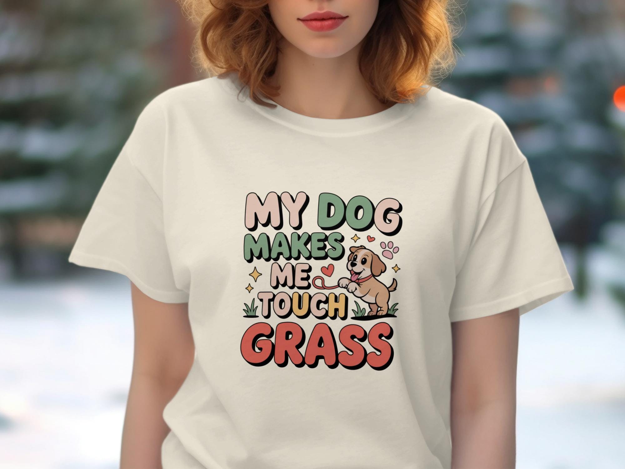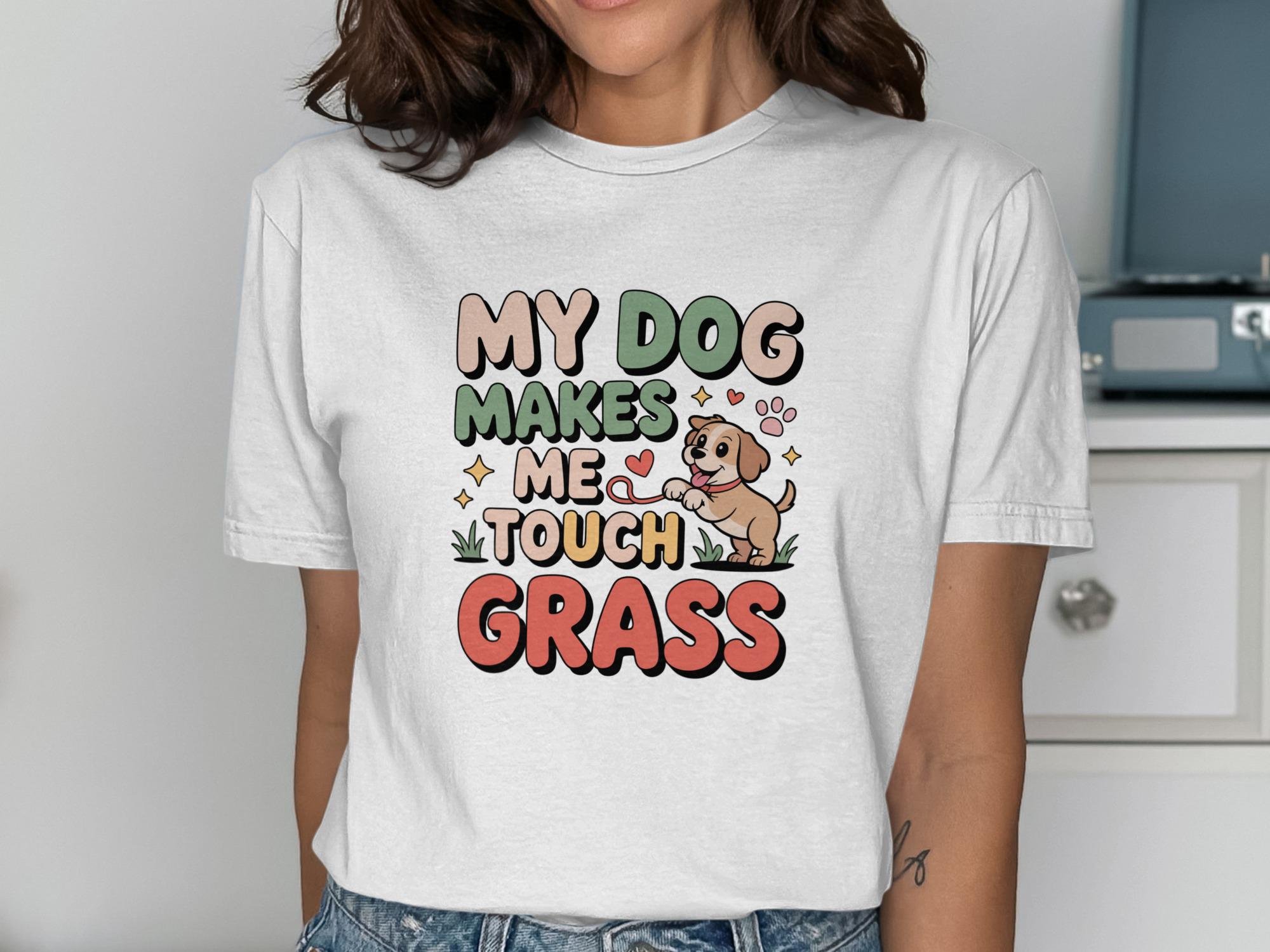 This fun and whimsical T-shirt is perfect for any dog lover. The design features a cute cartoon dog and the phrase "My Dog Makes Me Touch Grass."