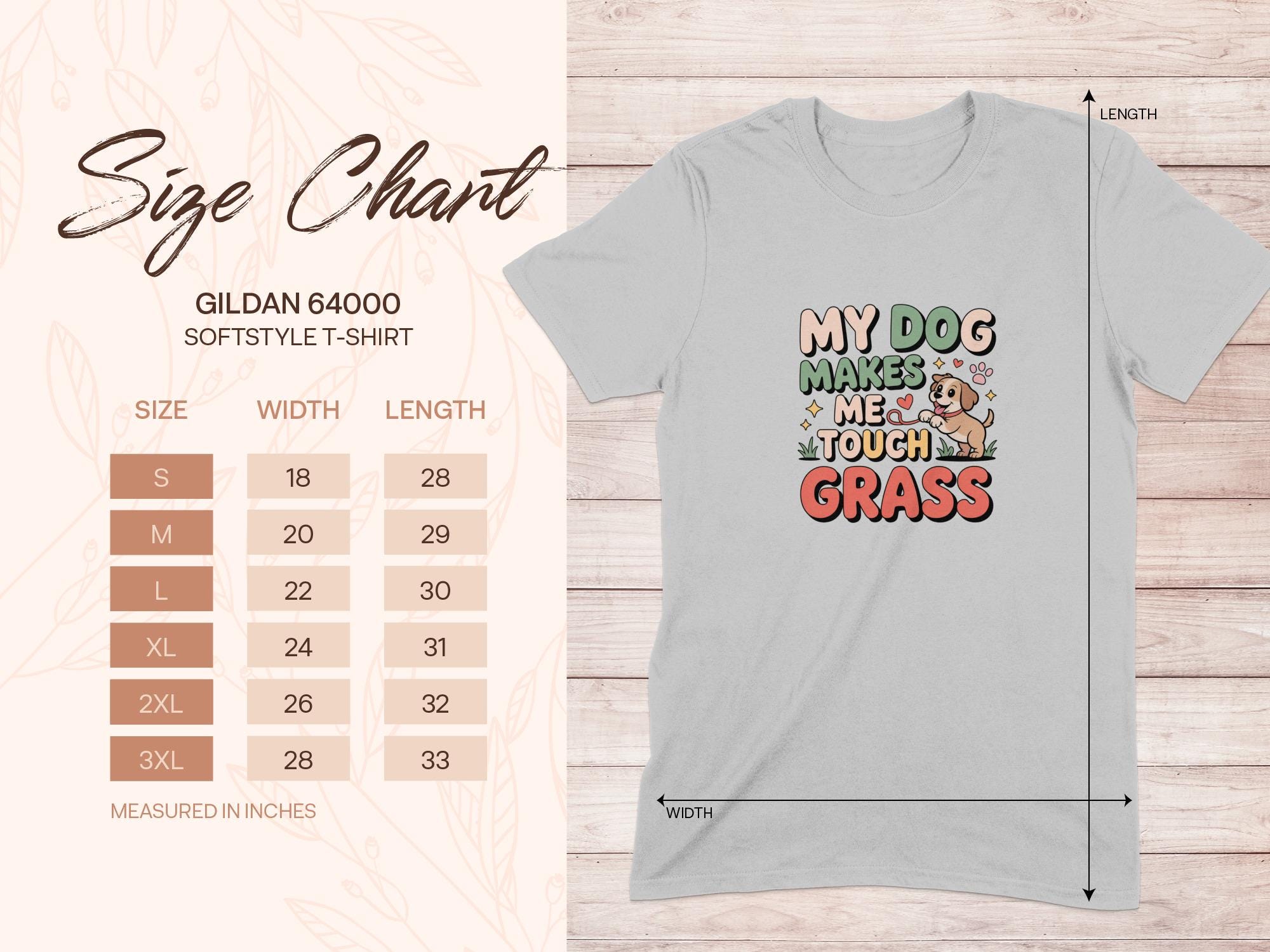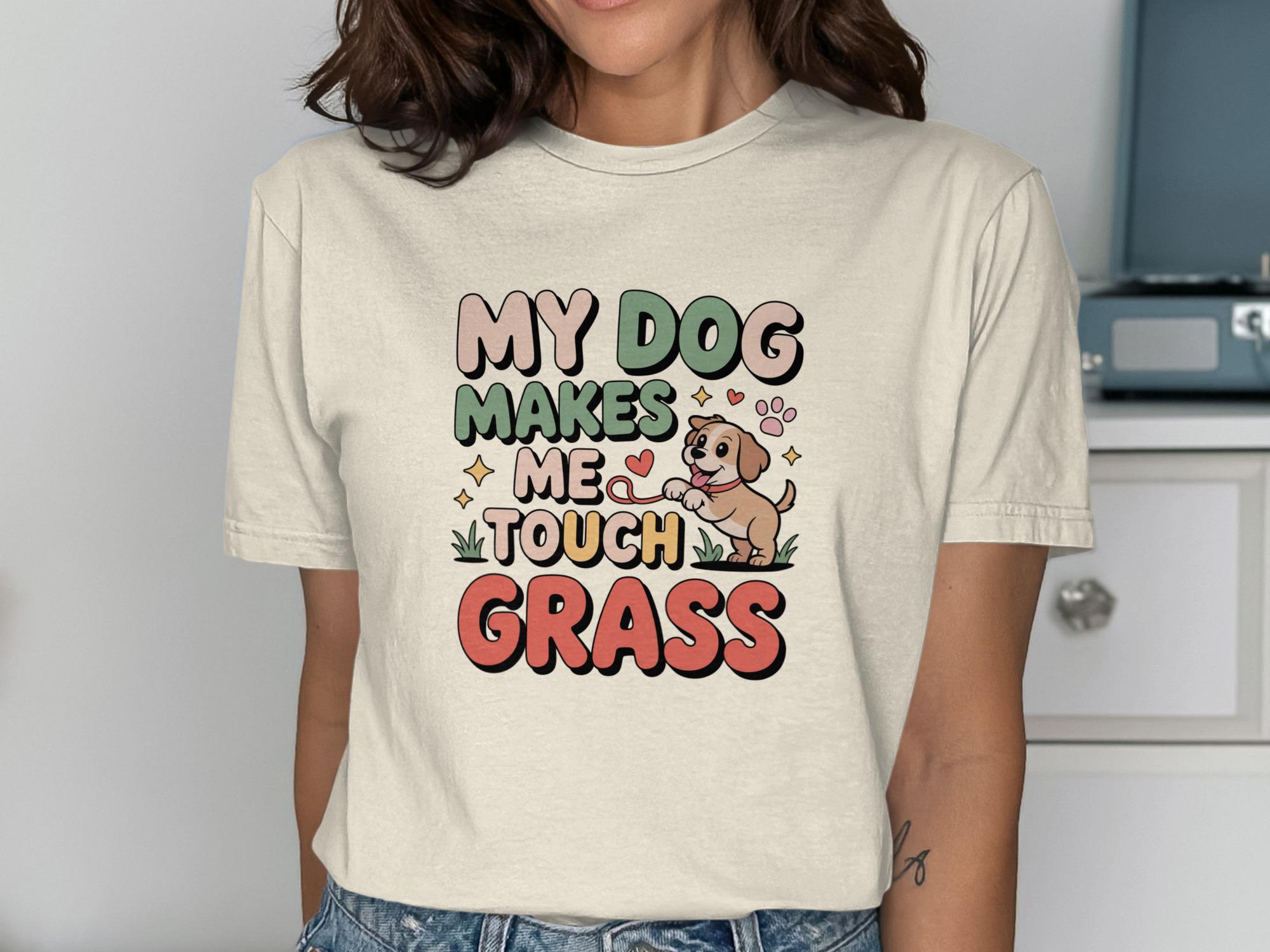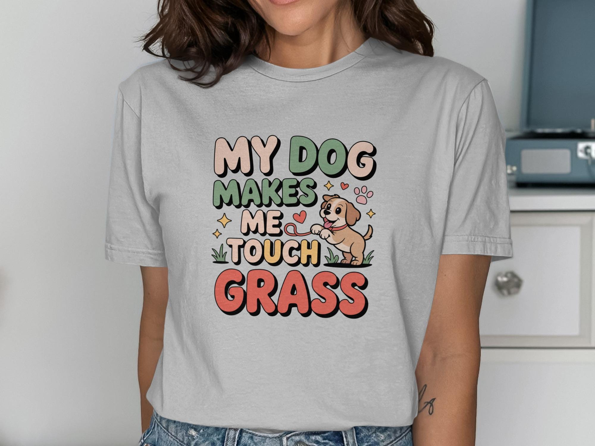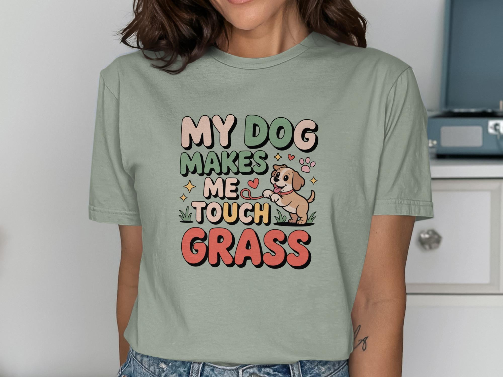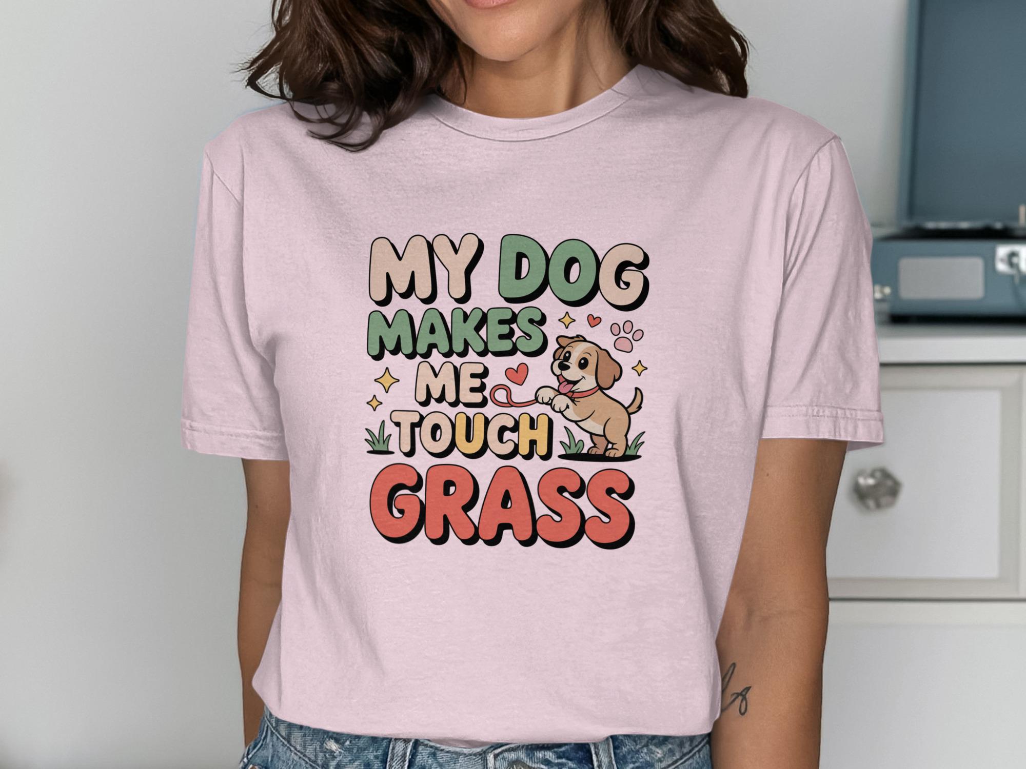 This fun and whimsical T-shirt is perfect for any dog lover. The design features a cute cartoon dog and the phrase "My Dog Makes Me Touch Grass."
