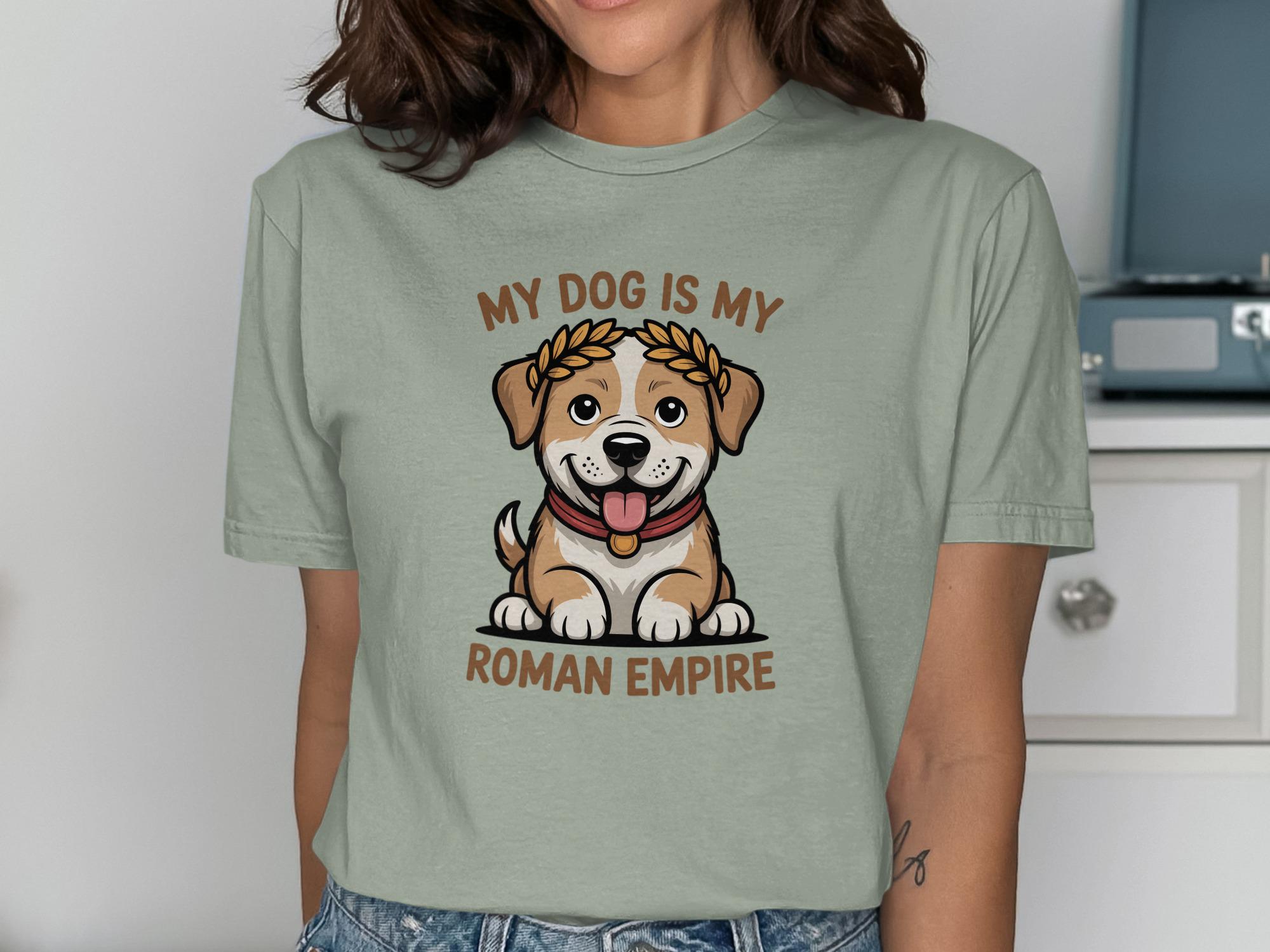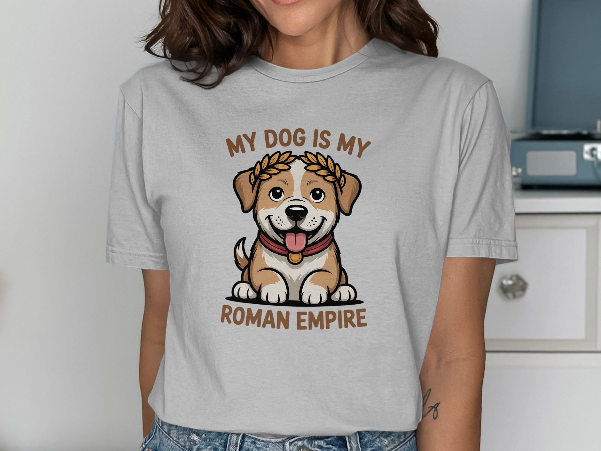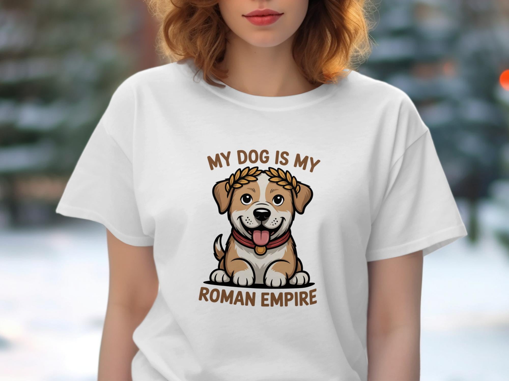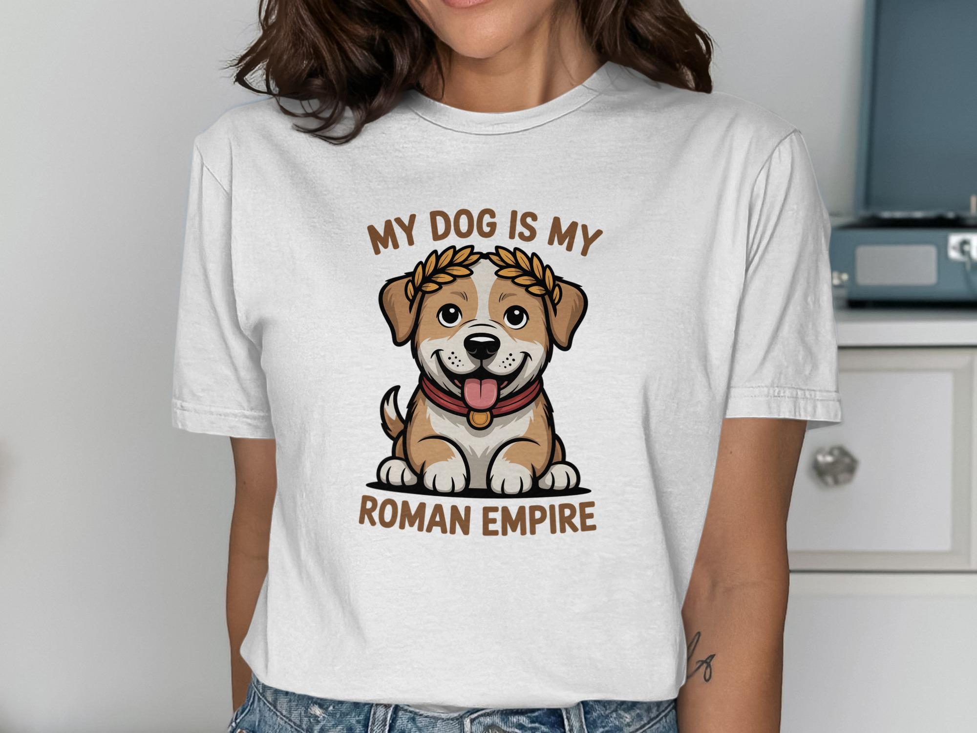 This T-Shirt features a cute dog wearing a laurel crown, accompanied by the phrase "My Dog is My Roman Empire". It's the perfect gift for dog lovers who find joy and comfort in their furry friends. This trendy T-Shirt is sure to bring a smile to anyone's face.