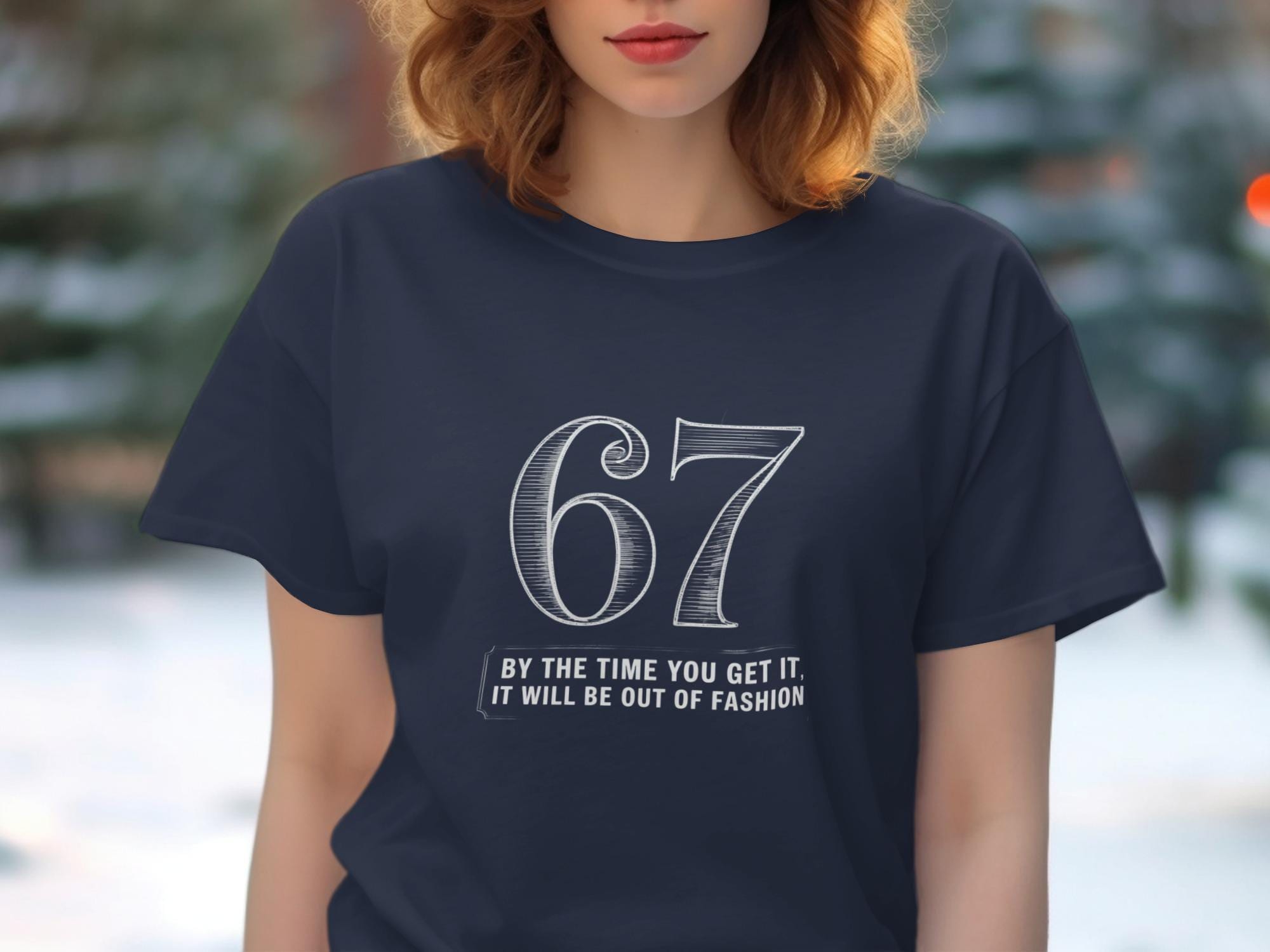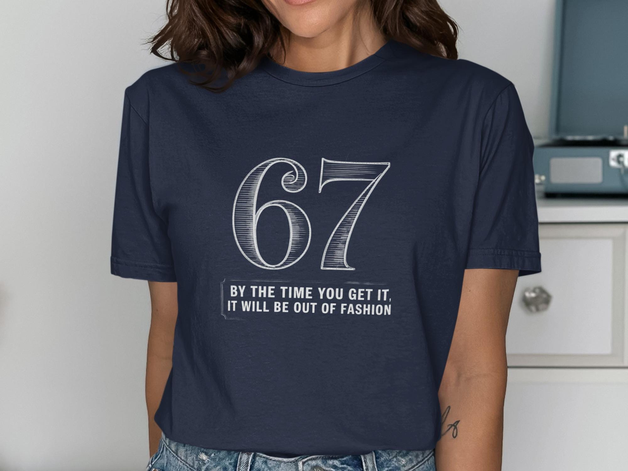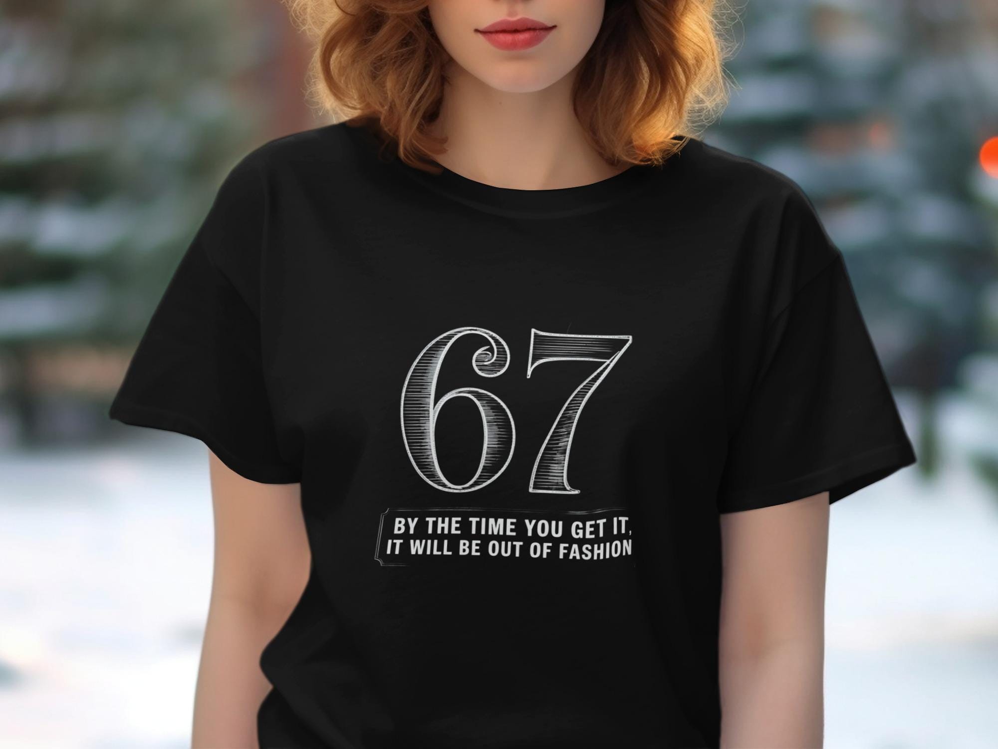 • Eye-catching design featuring a bold "67" graphic and the amusing statement "By the time you get it, it will be out of fashion"
