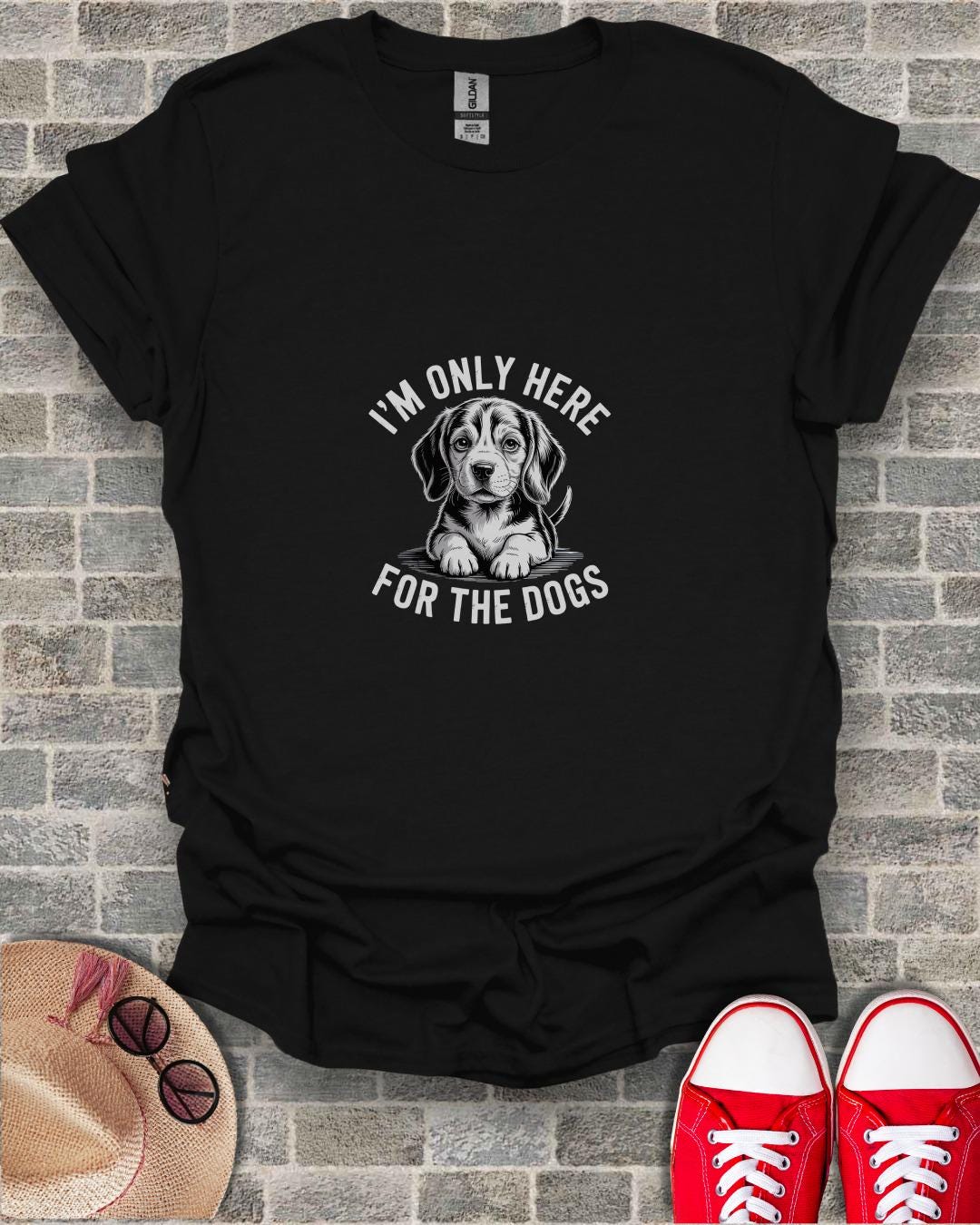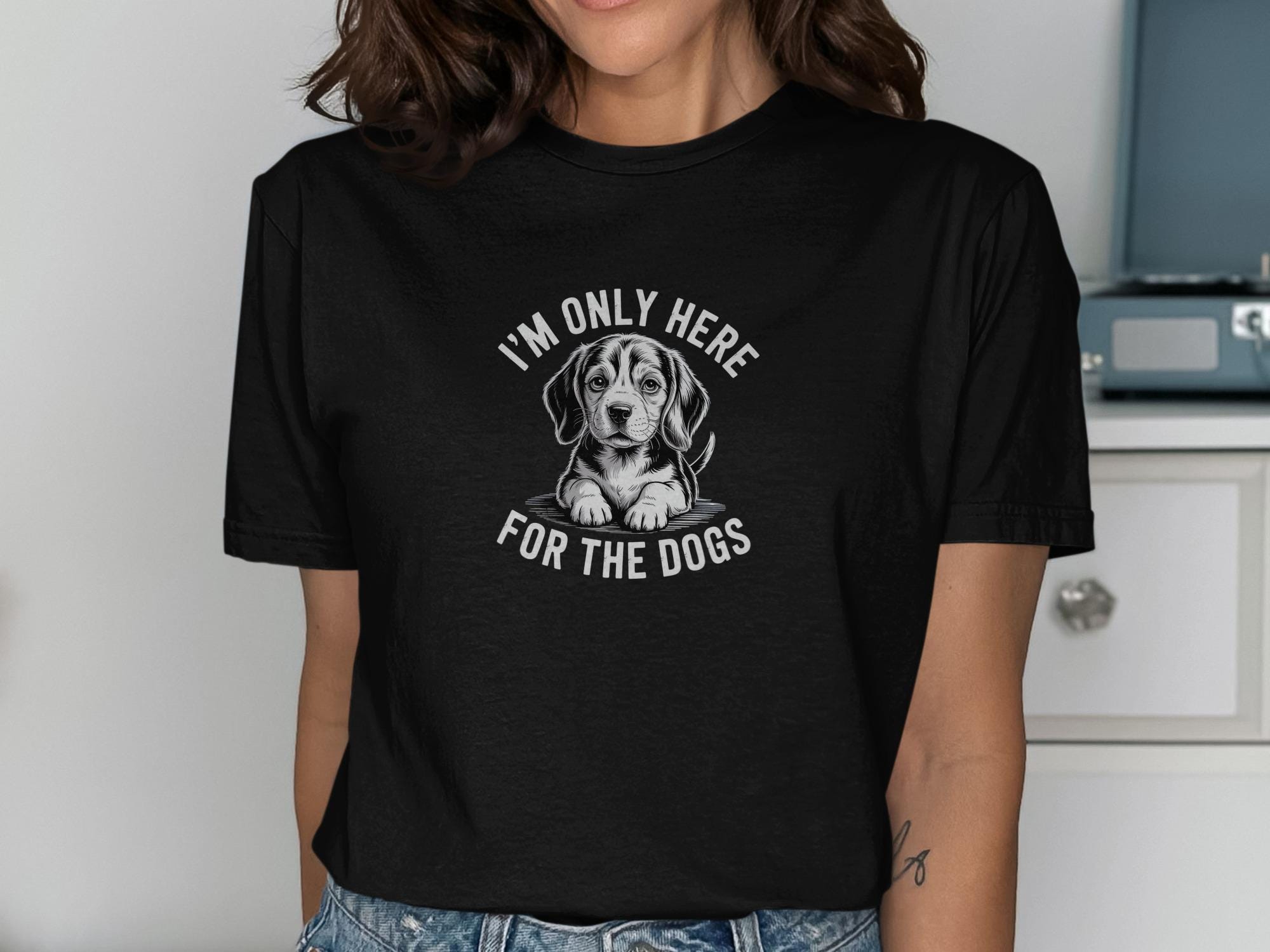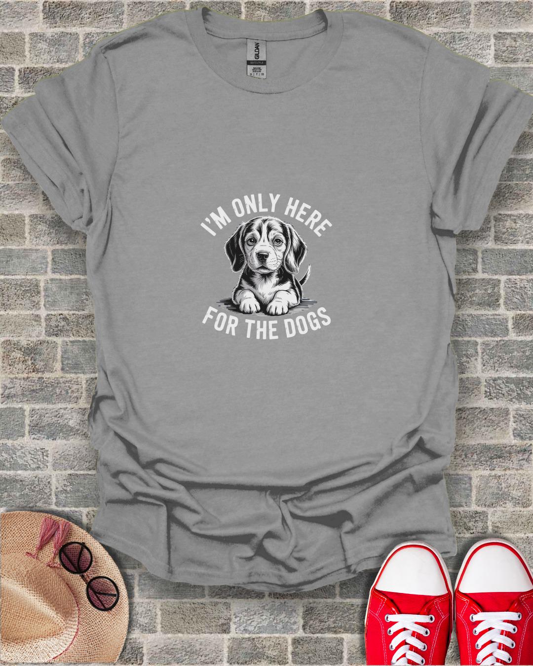 This T-shirt features a cute beagle puppy and the text "I'm Only Here For The Dogs".