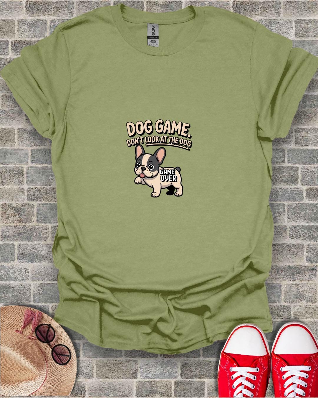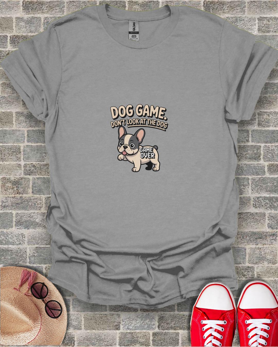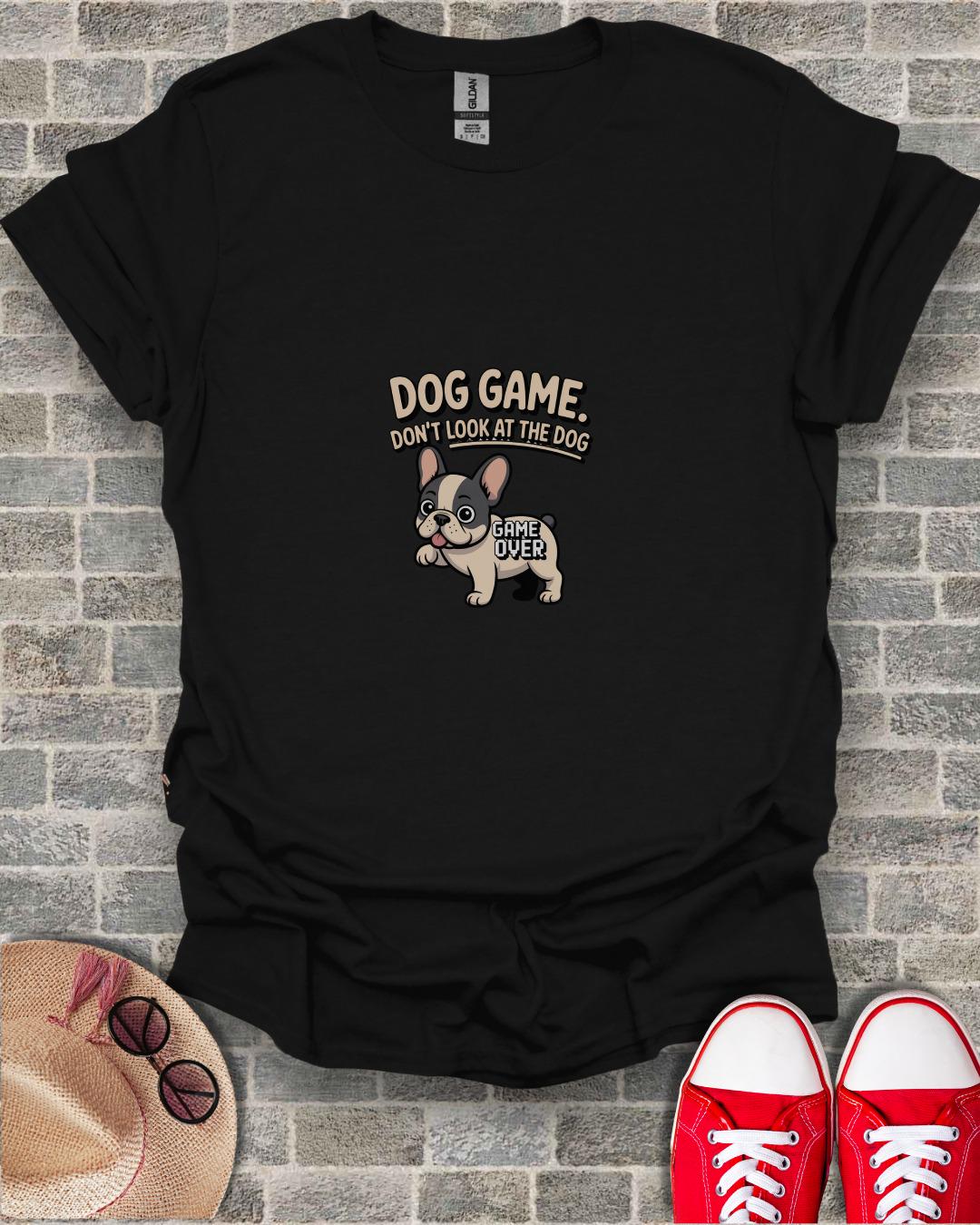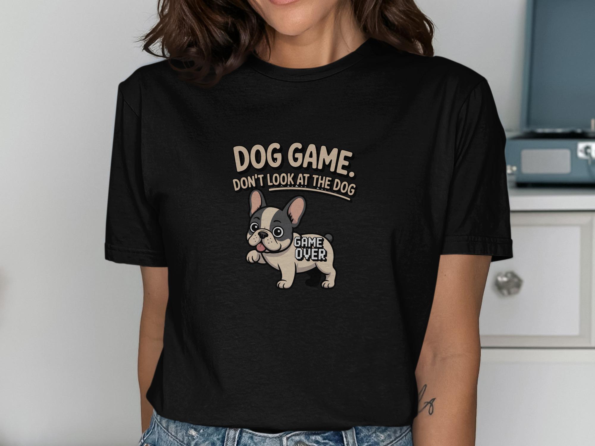 Adorable French Bulldog T-Shirt for dog lovers and gamers. This playful design features a cute cartoon Frenchie with the phrase "Dog Game. Don't Look at the Dog." and "Game Over", perfect for adding a touch of humor to your wardrobe. Get this unique tee now.