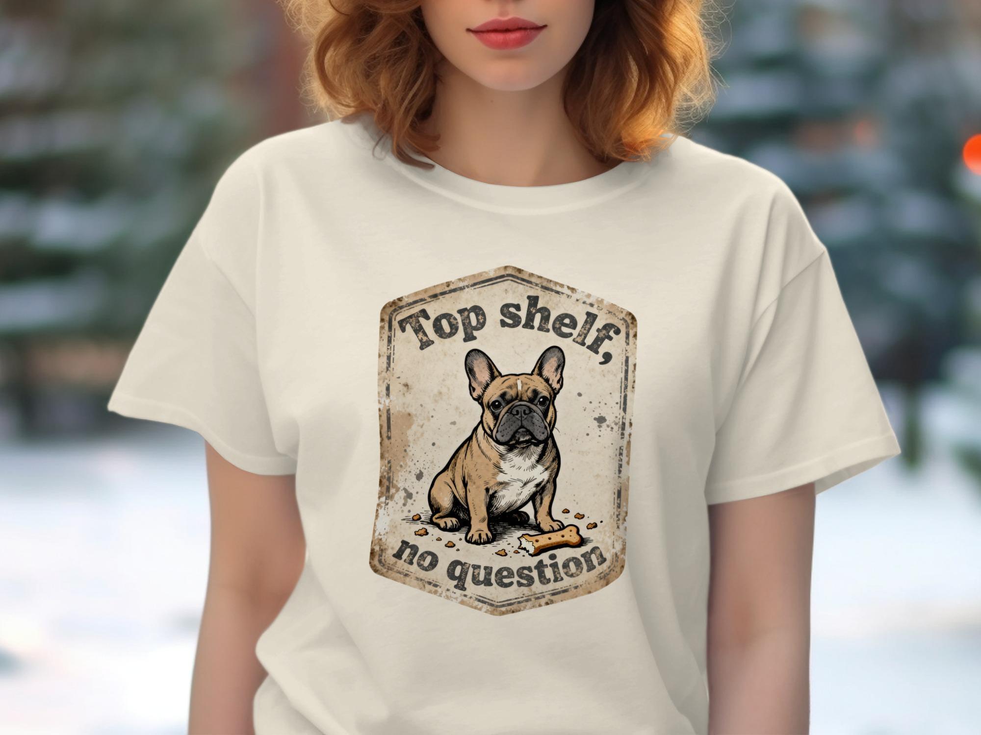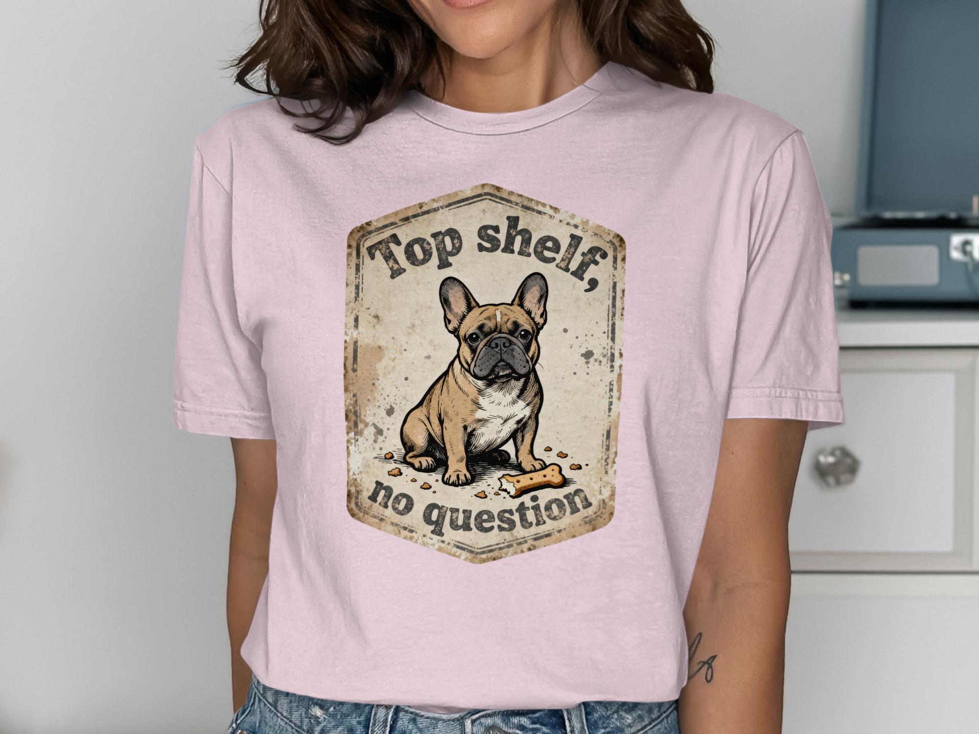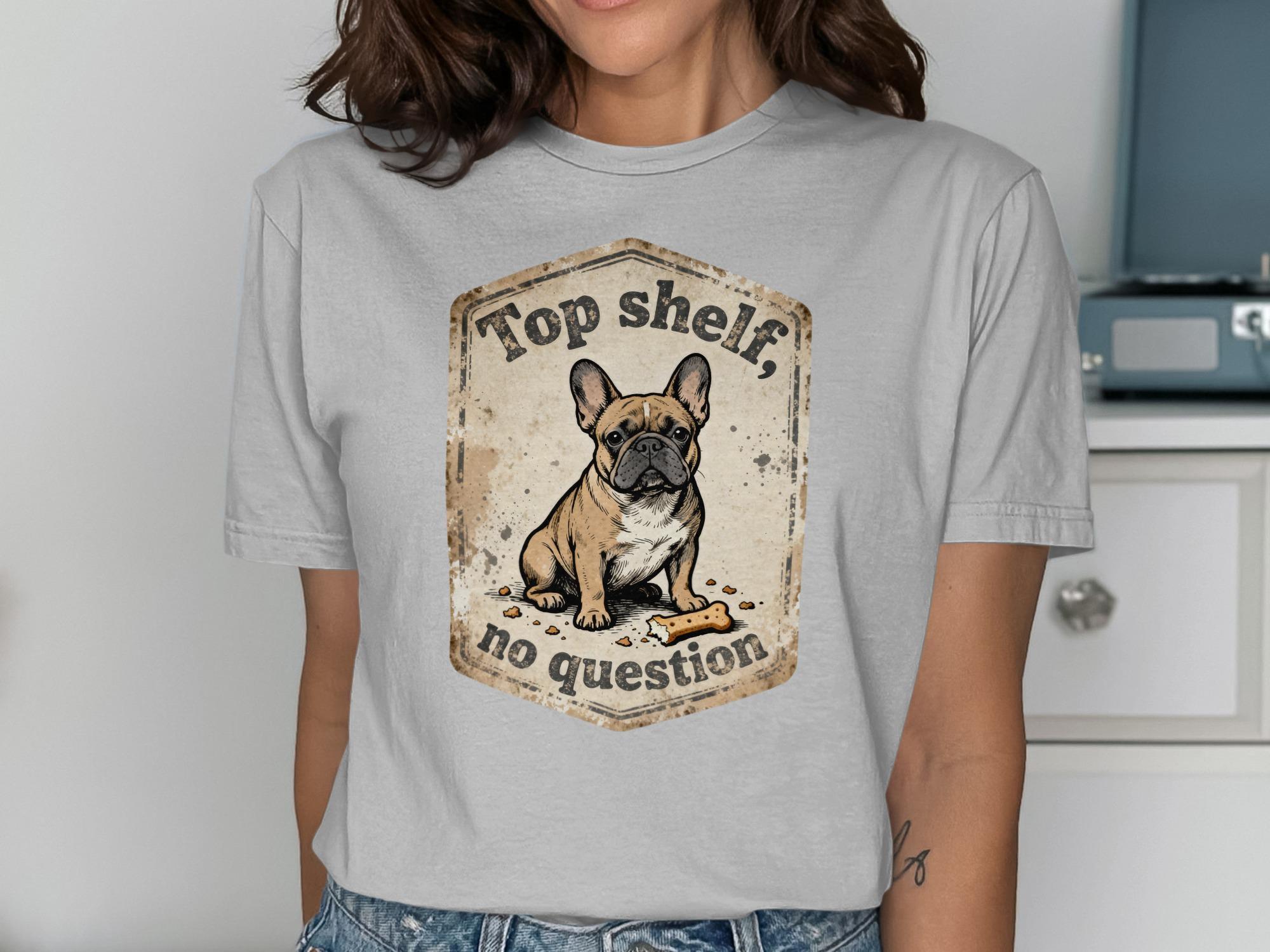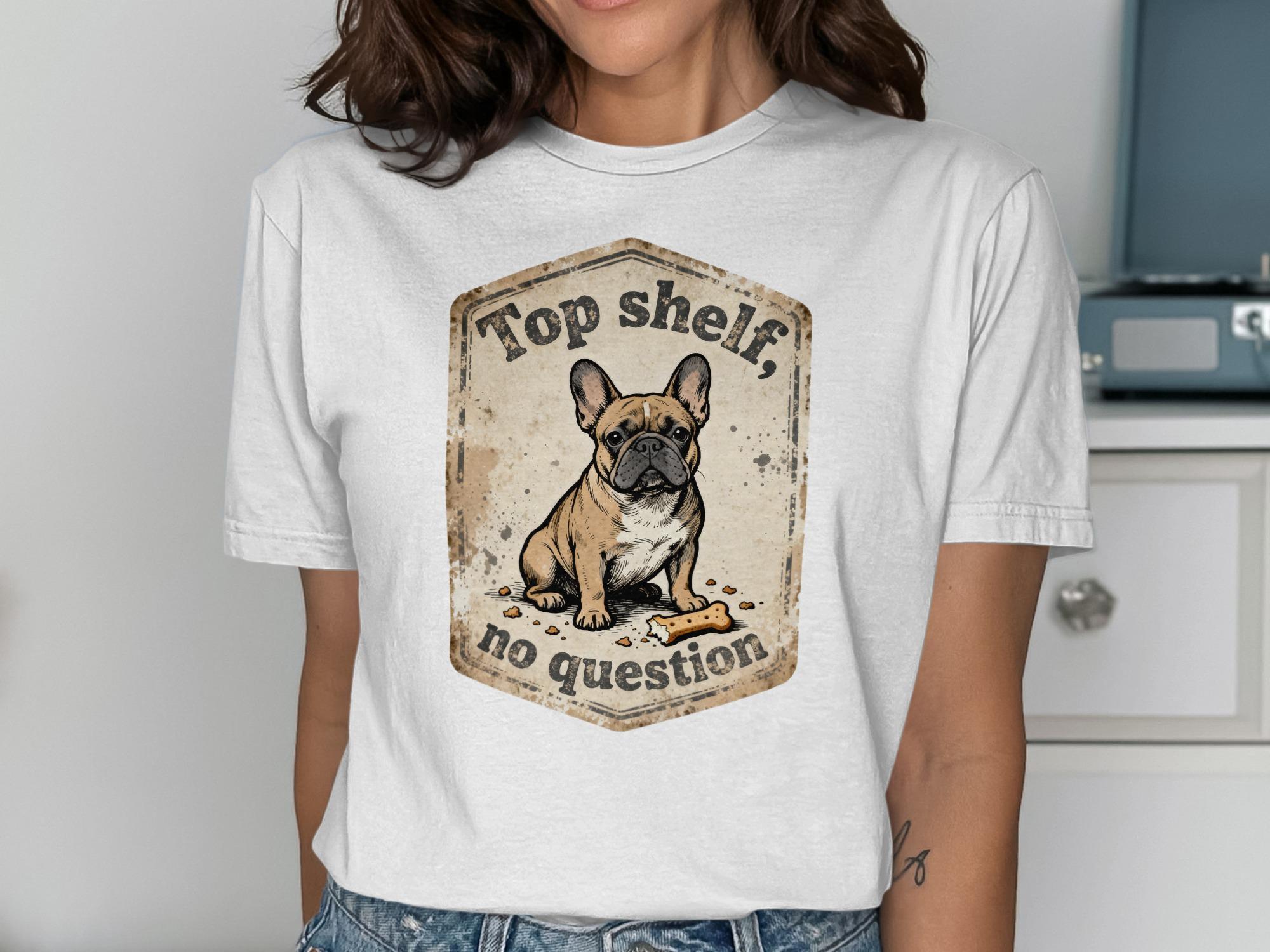 Showcase your love for French Bulldogs with this uniquely designed dog lover gift idea featuring an adorable Frenchie sitting pretty next to a tasty bone with a funny tee quote "Top shelf, no question". This trendy fashion tshirt combines vintage style graphic design with charming animal print elements to create the perfect Frenchie apparel for any dog enthusiast.