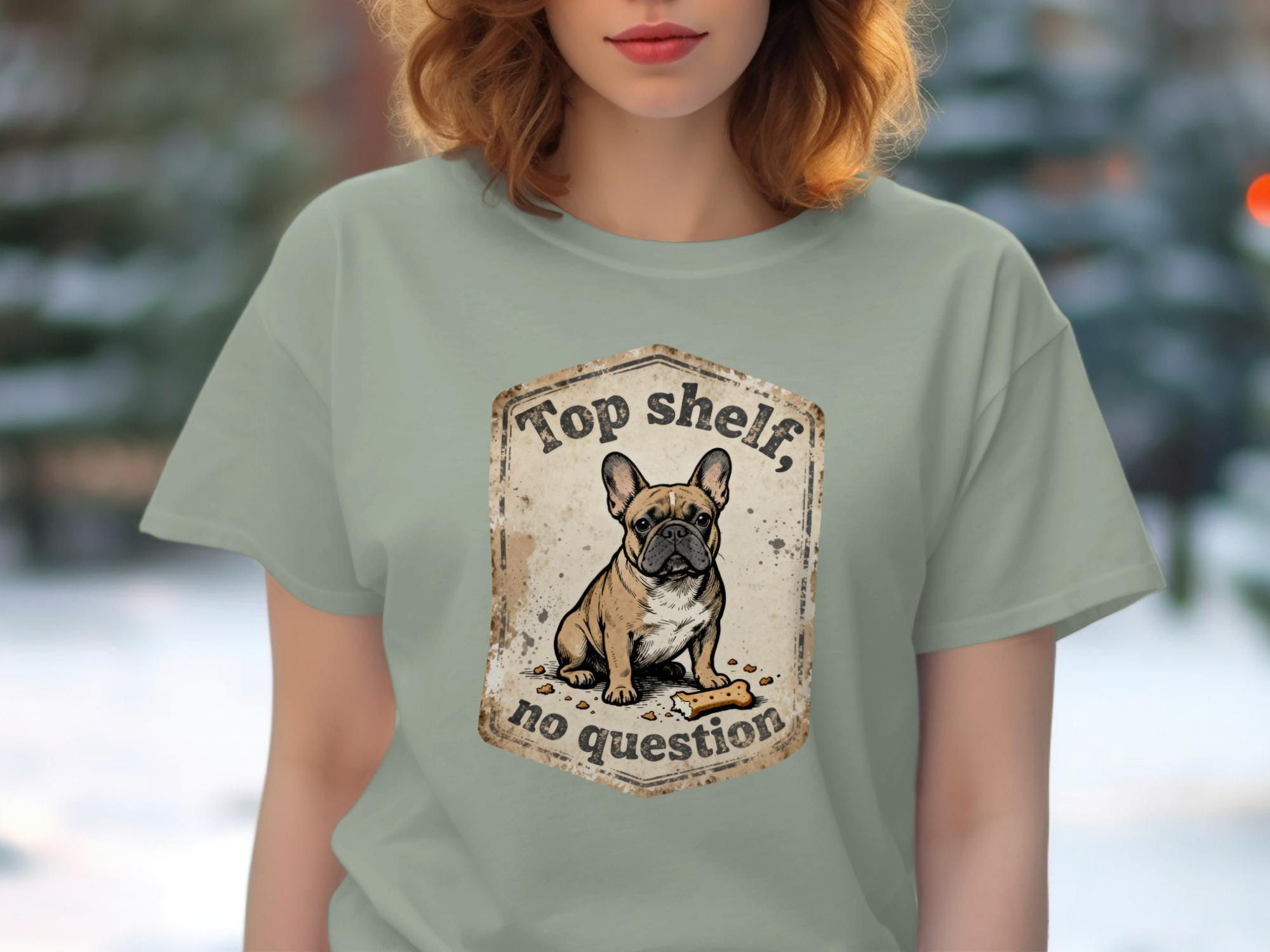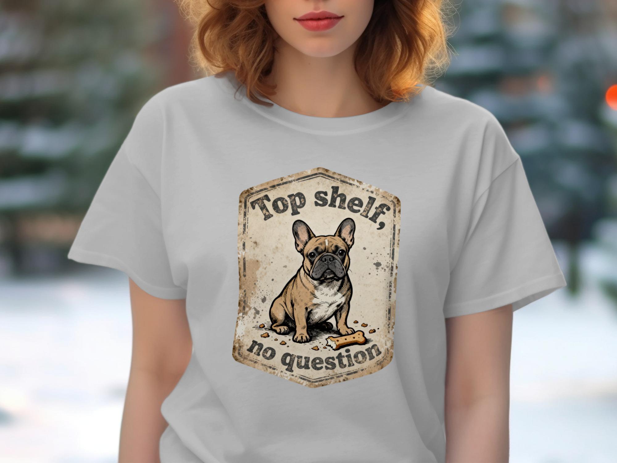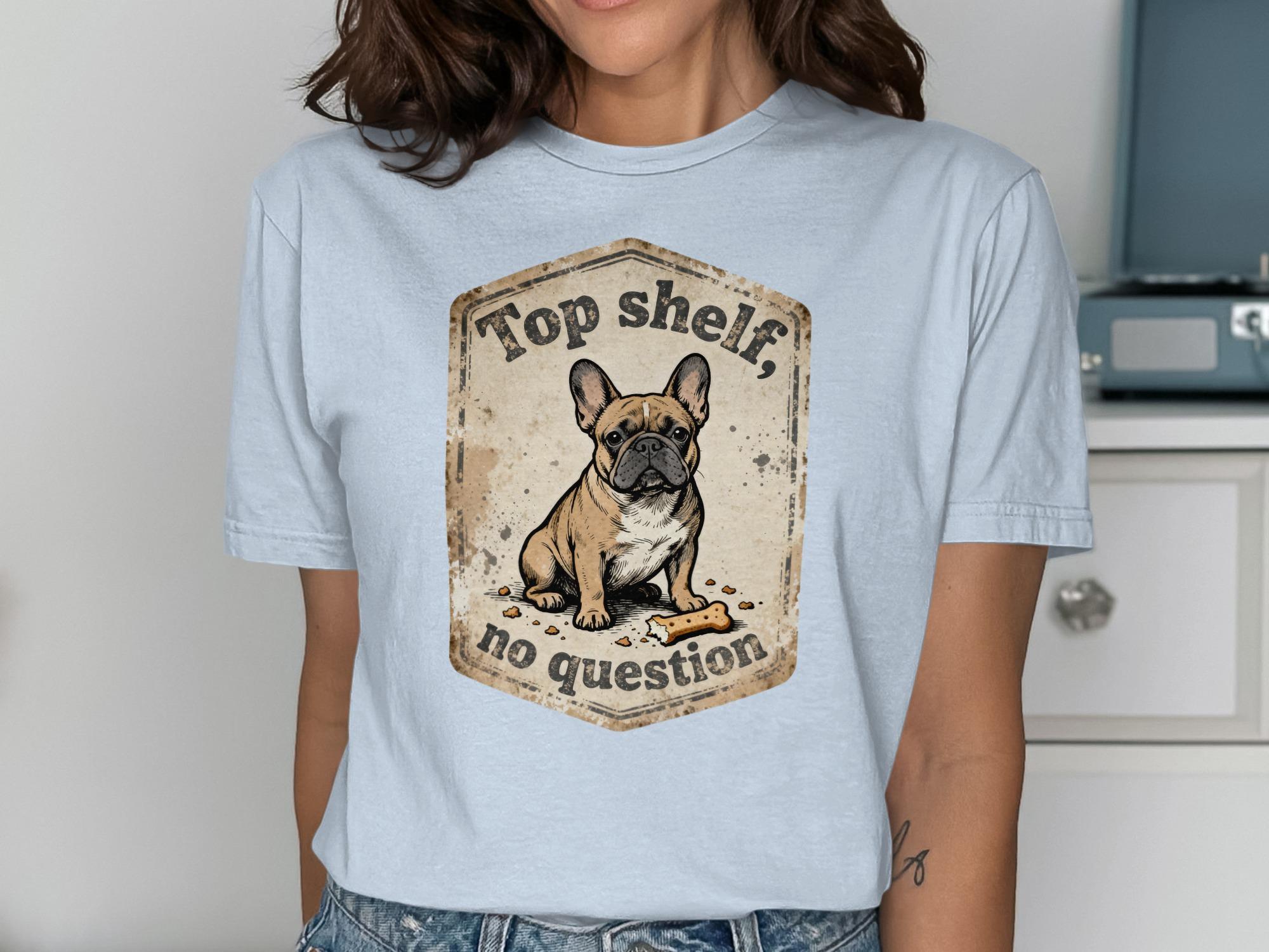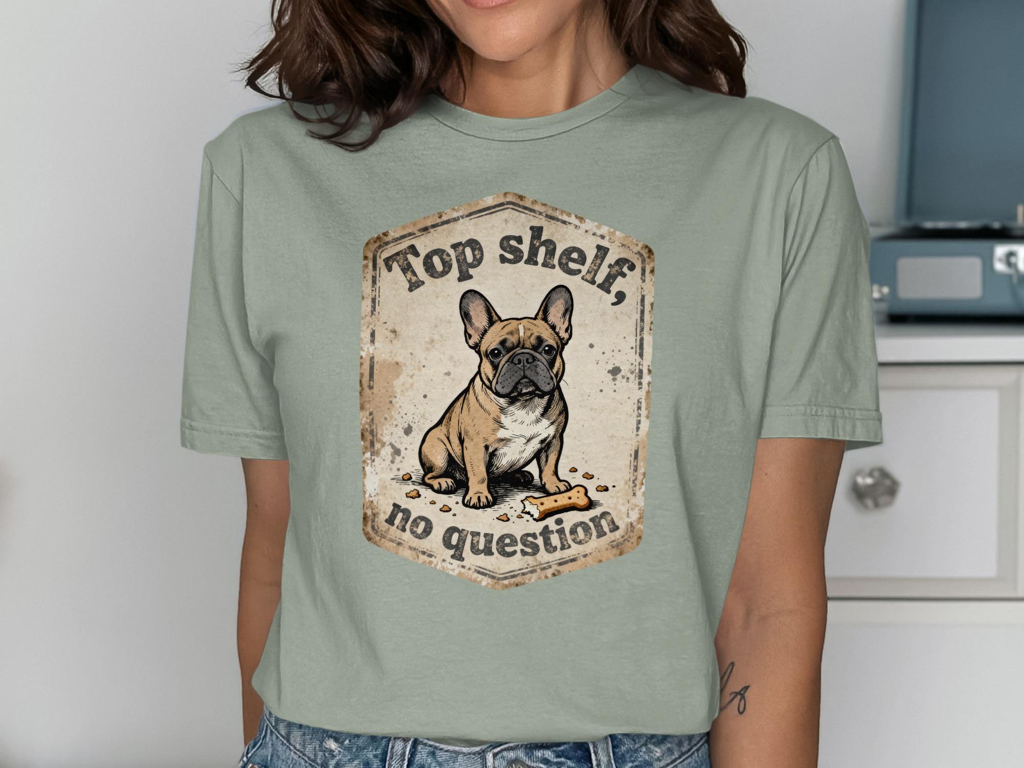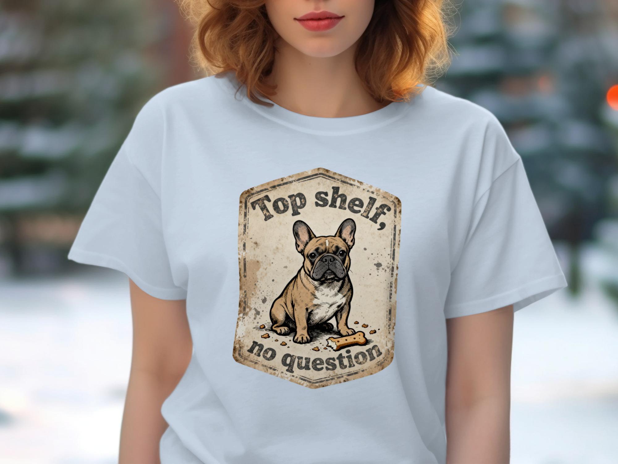 Showcase your love for French Bulldogs with this uniquely designed dog lover gift idea featuring an adorable Frenchie sitting pretty next to a tasty bone with a funny tee quote "Top shelf, no question". This trendy fashion tshirt combines vintage style graphic design with charming animal print elements to create the perfect Frenchie apparel for any dog enthusiast.