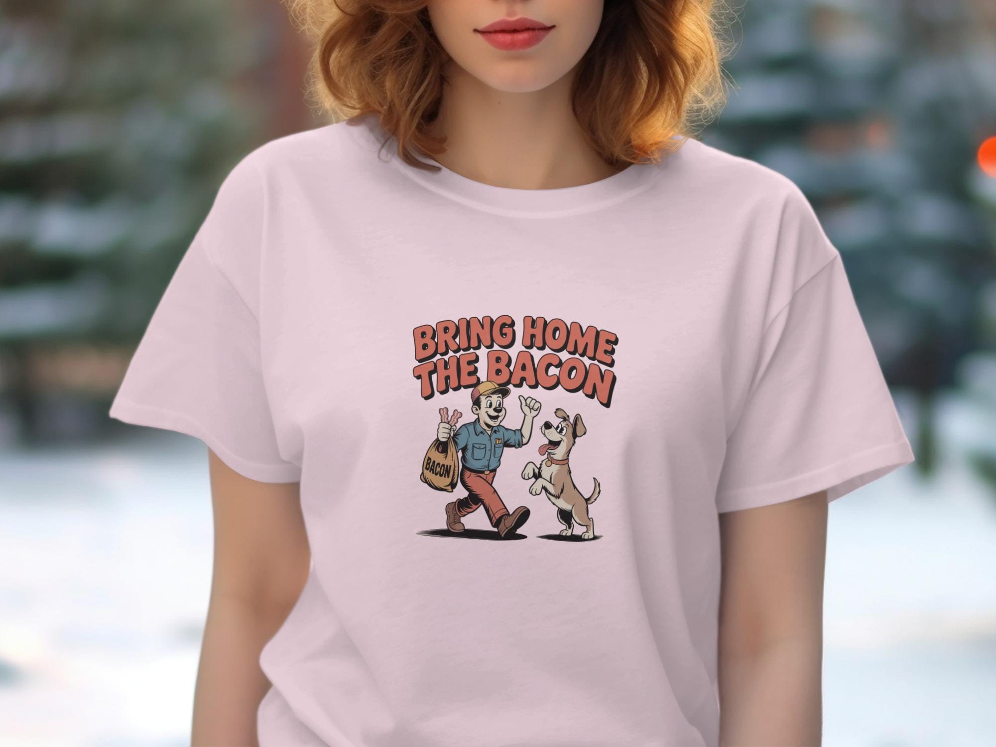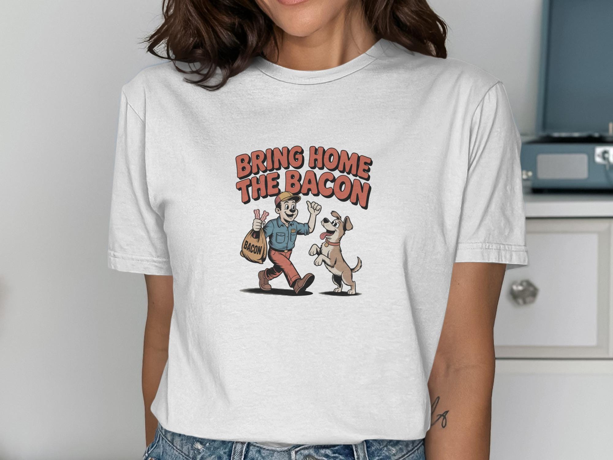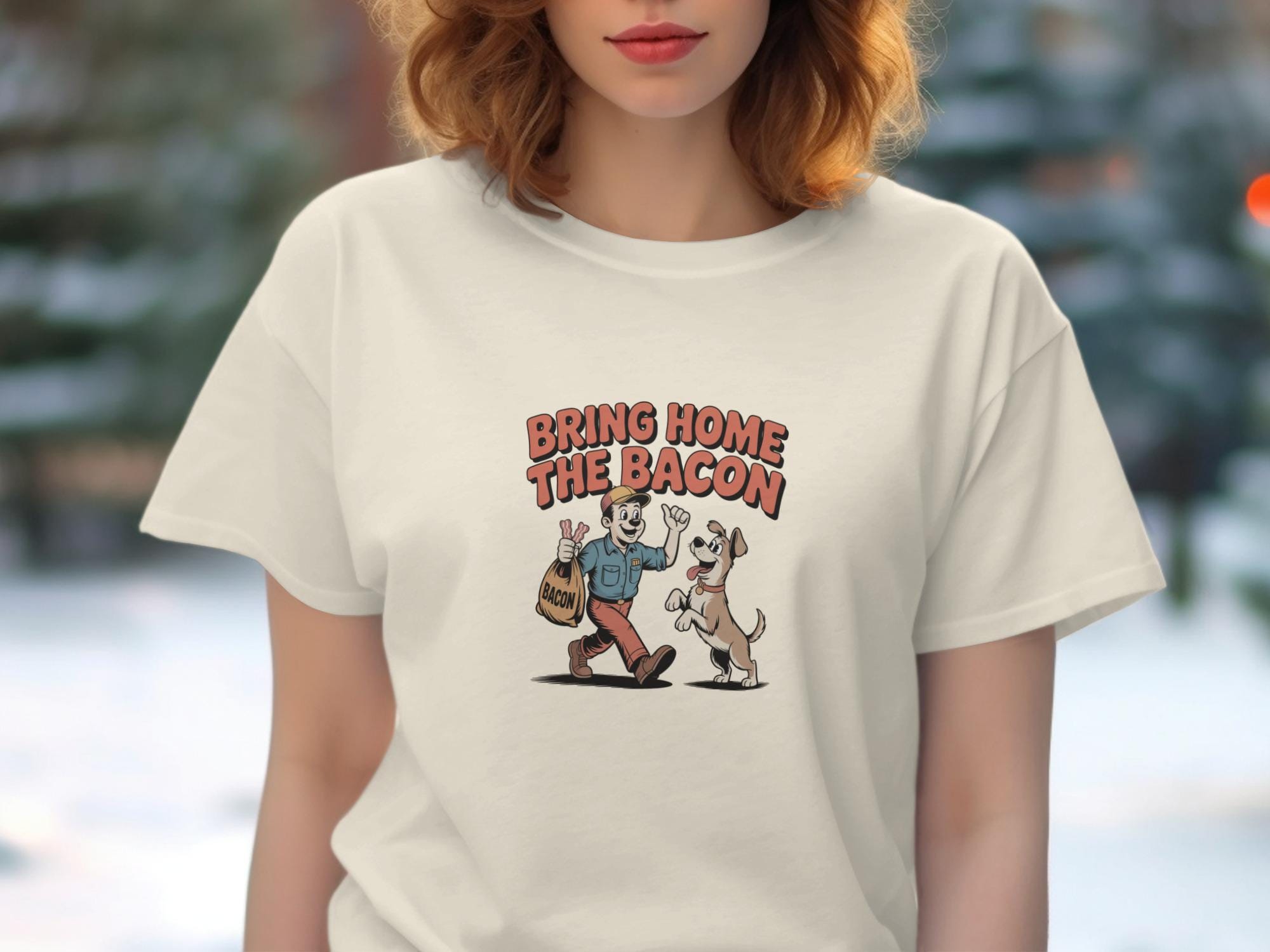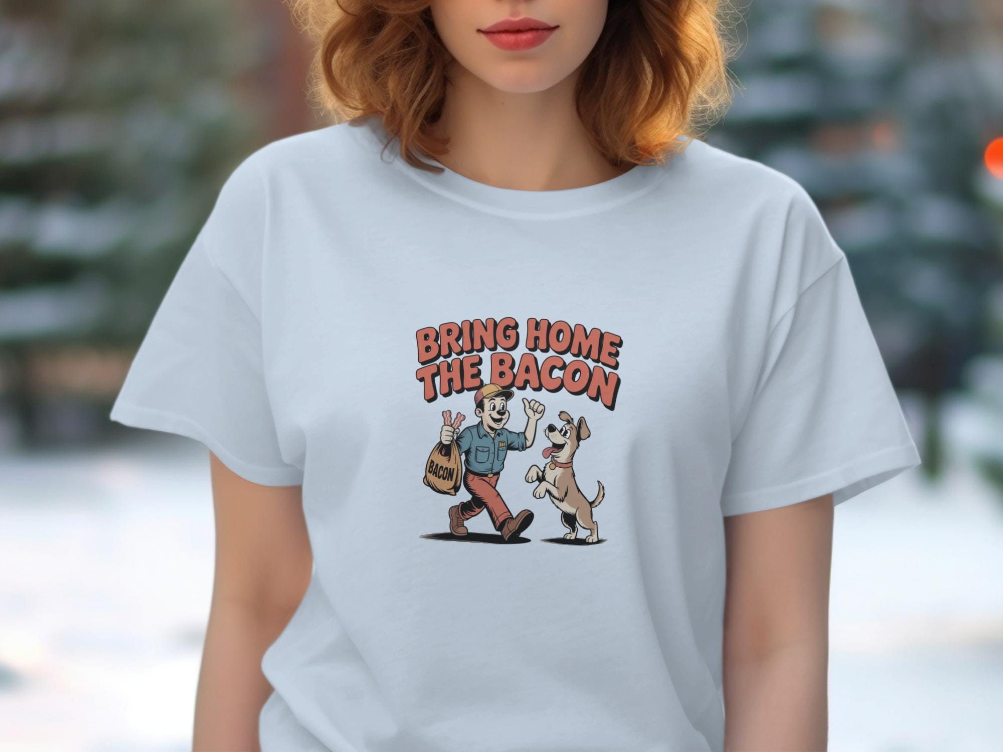 This funny T-Shirt features a retro cartoon style illustration of a man bringing home a bag of bacon, eagerly greeted by his happy dog. This whimsical design is perfect for dog lovers, bacon enthusiasts, and anyone who appreciates a touch of humor in their wardrobe. It's a great conversation starter and a fun way to show off your personality.