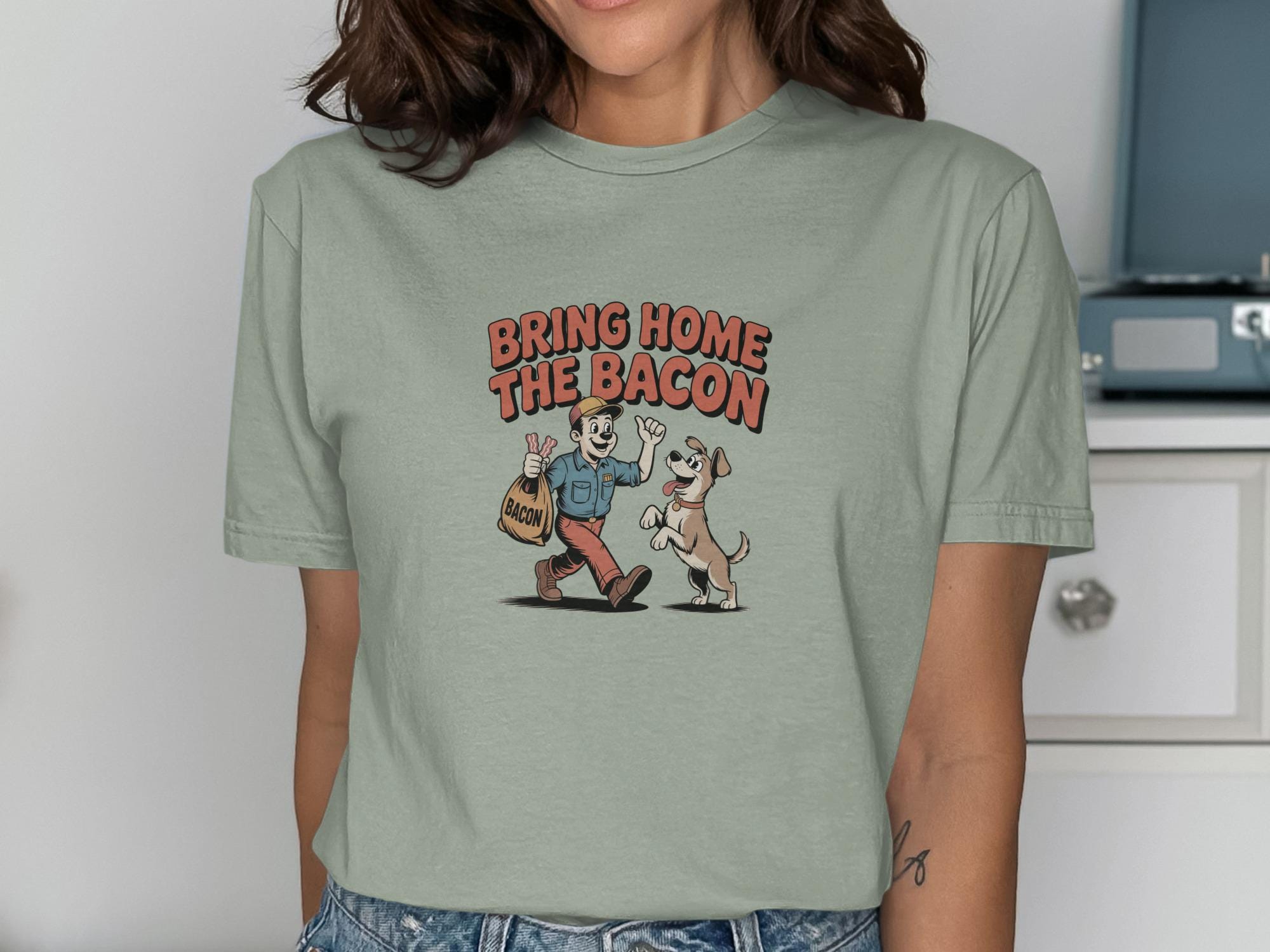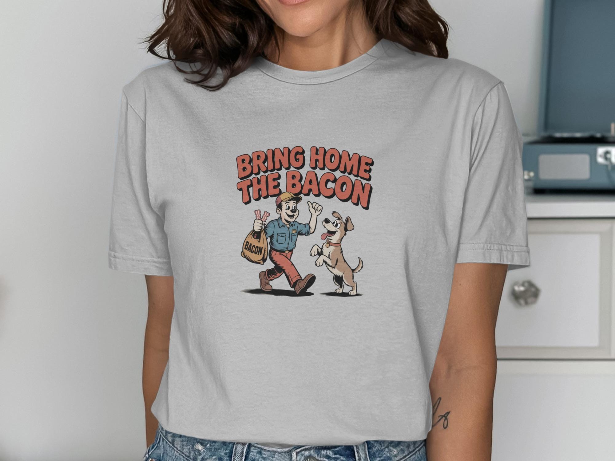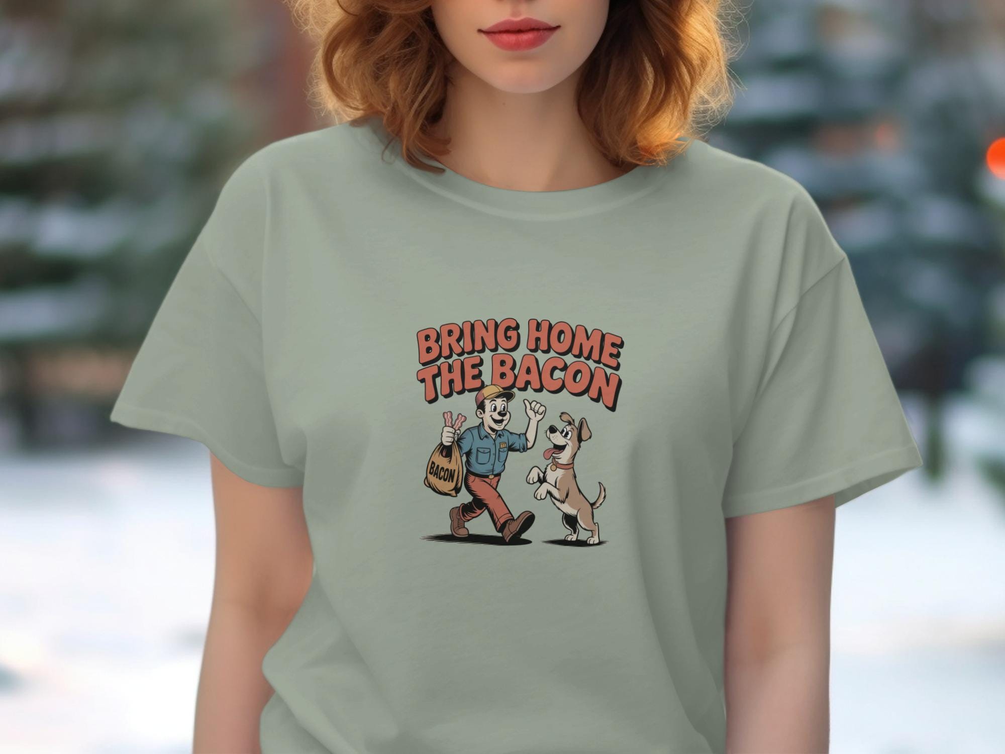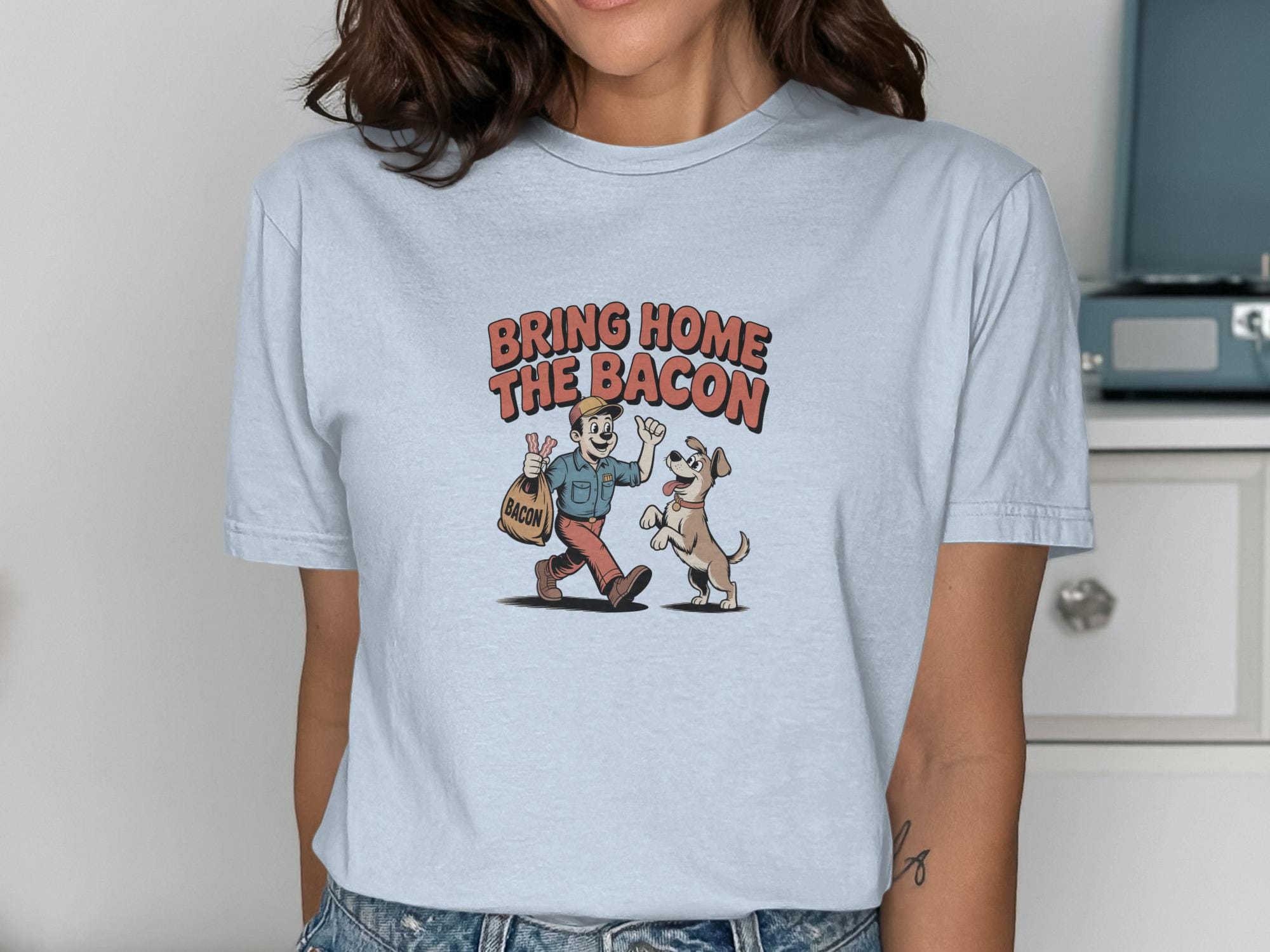This funny T-Shirt features a retro cartoon style illustration of a man bringing home a bag of bacon, eagerly greeted by his happy dog. This whimsical design is perfect for dog lovers, bacon enthusiasts, and anyone who appreciates a touch of humor in their wardrobe. It's a great conversation starter and a fun way to show off your personality.