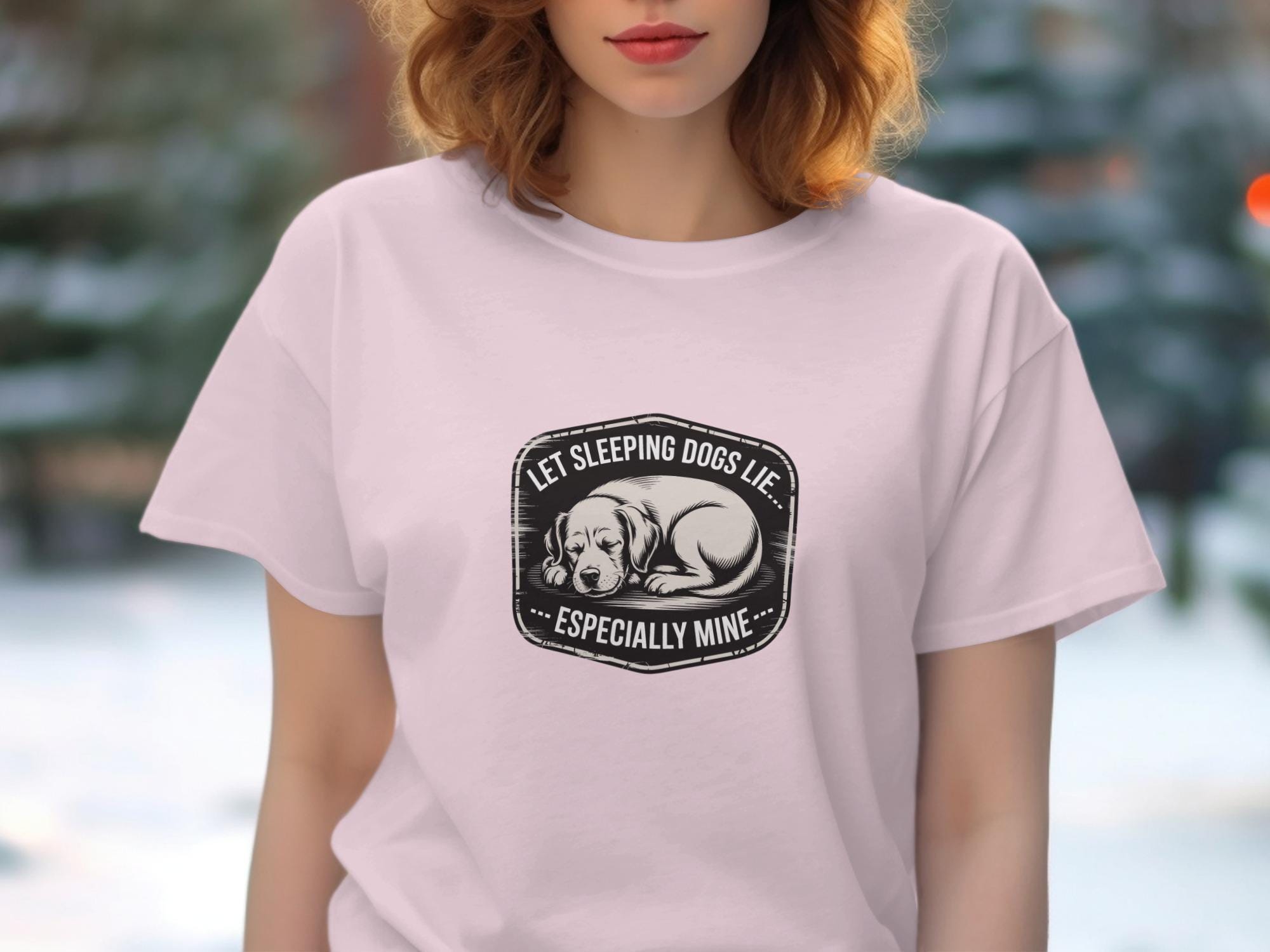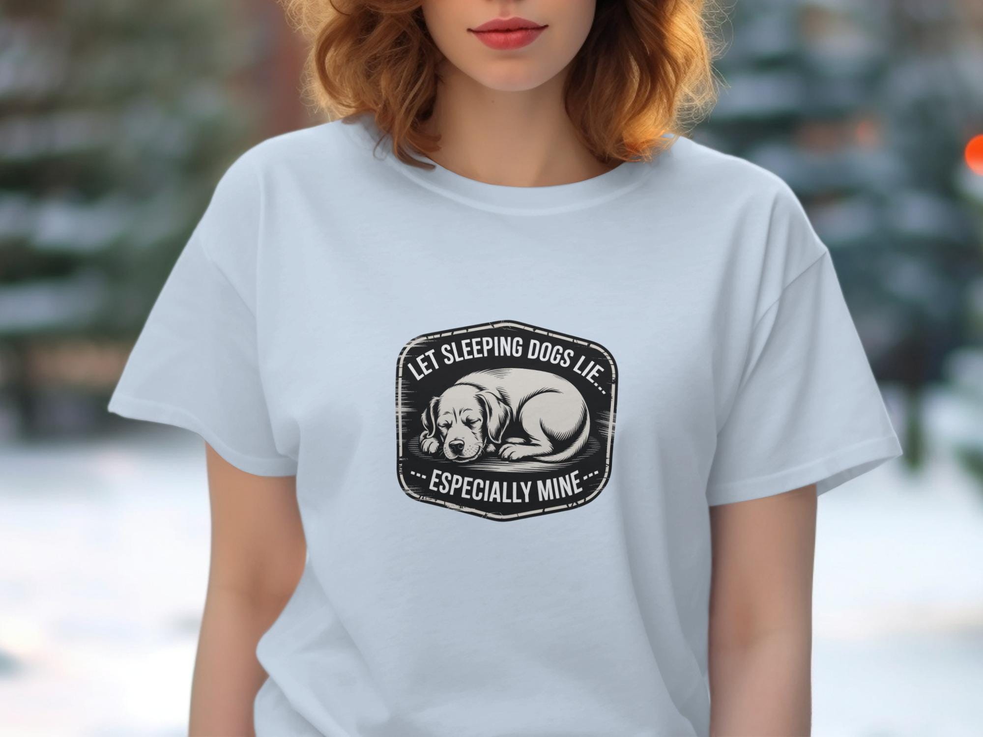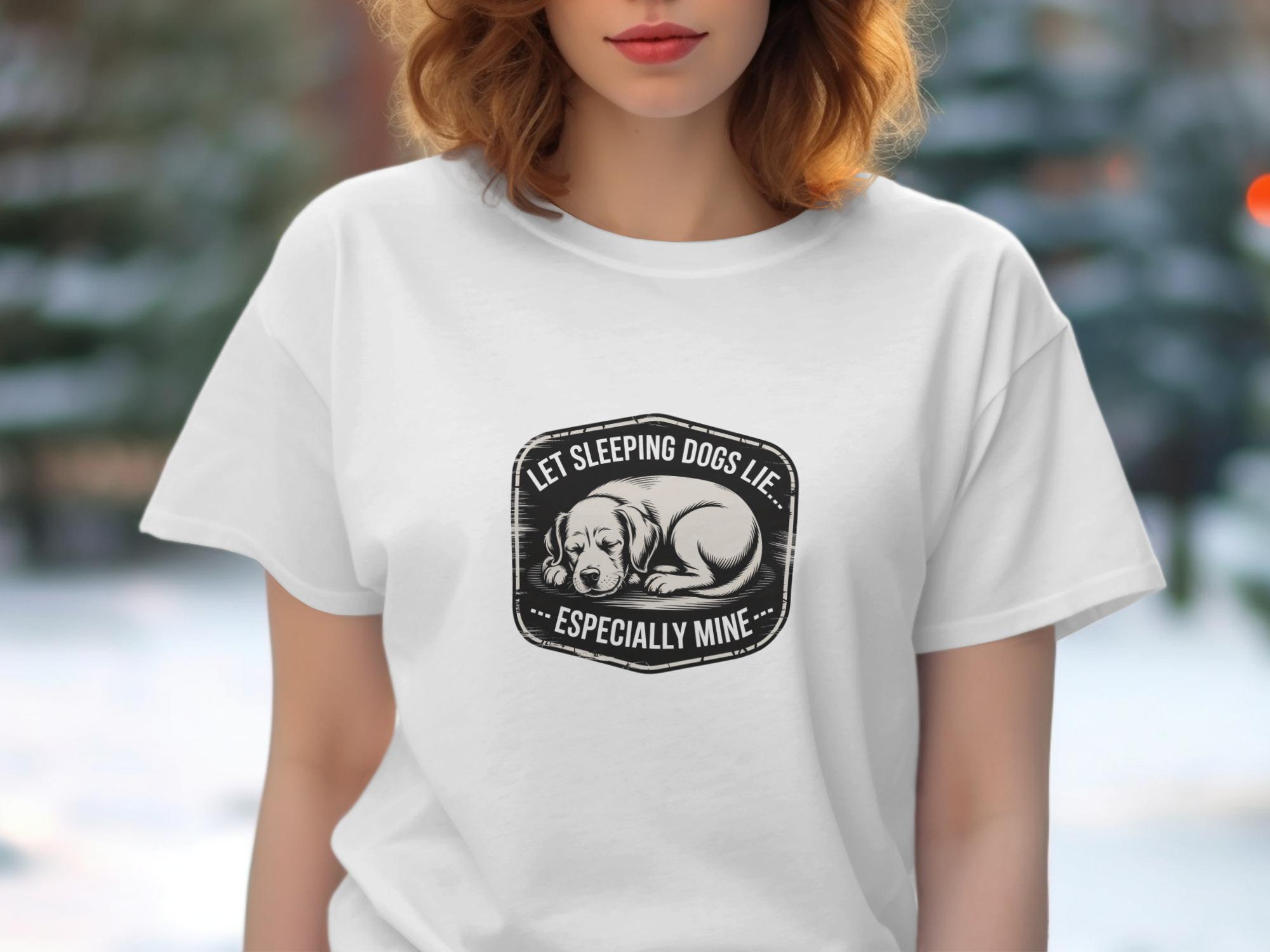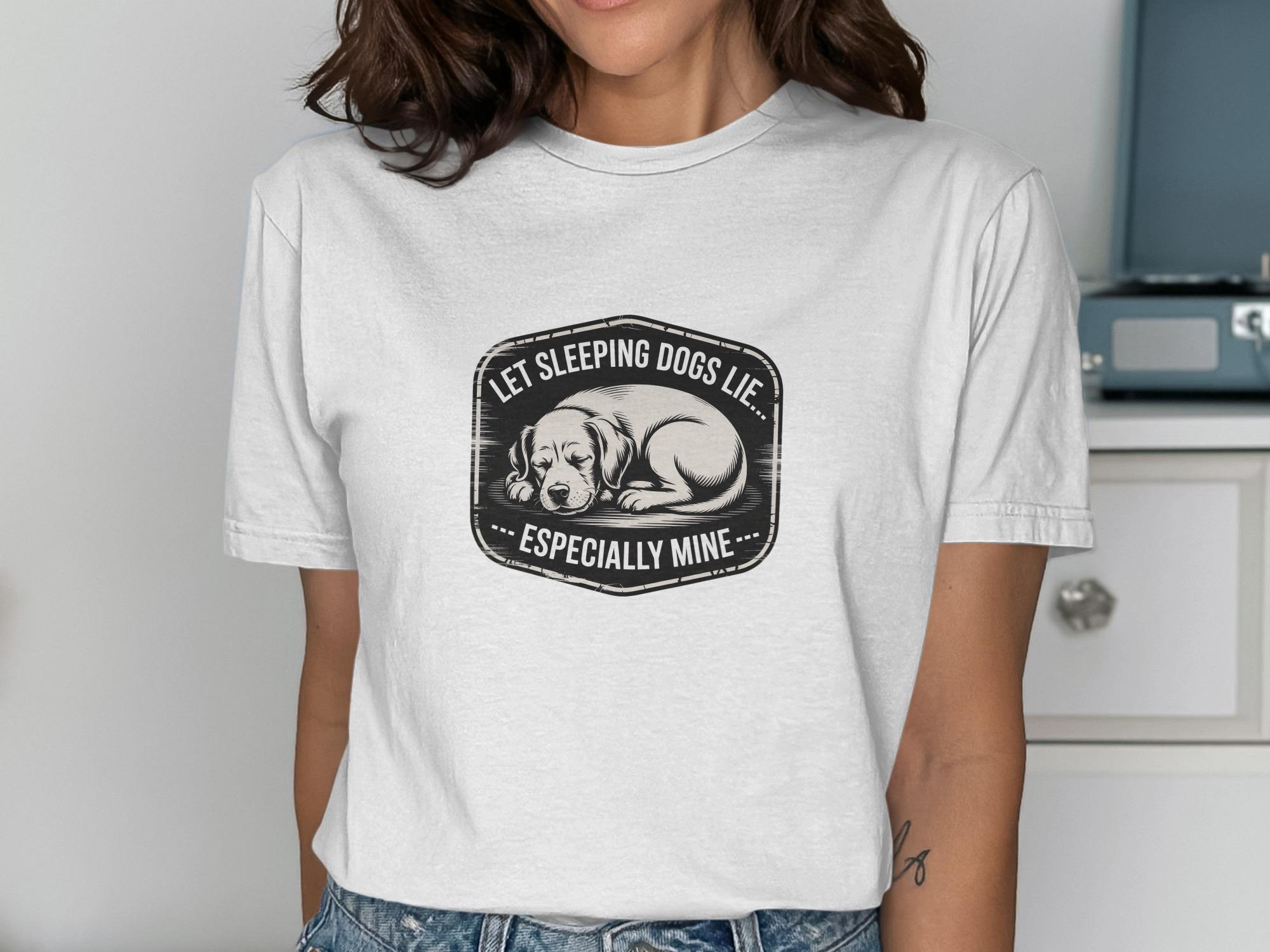 This T-Shirt features a cute sleeping dog design with the humorous quote "Let Sleeping Dogs Lie Especially Mine". It's a perfect gift for any dog lover or pet owner.
