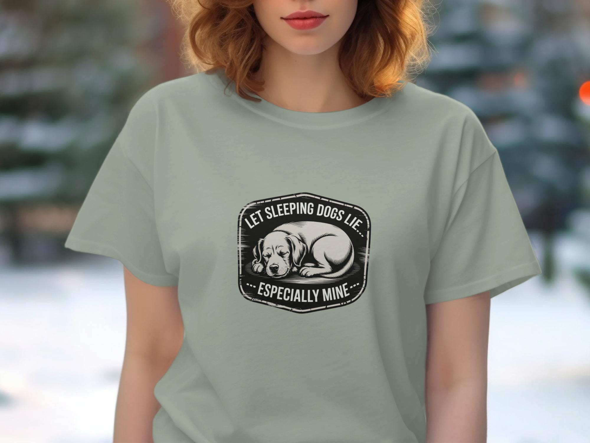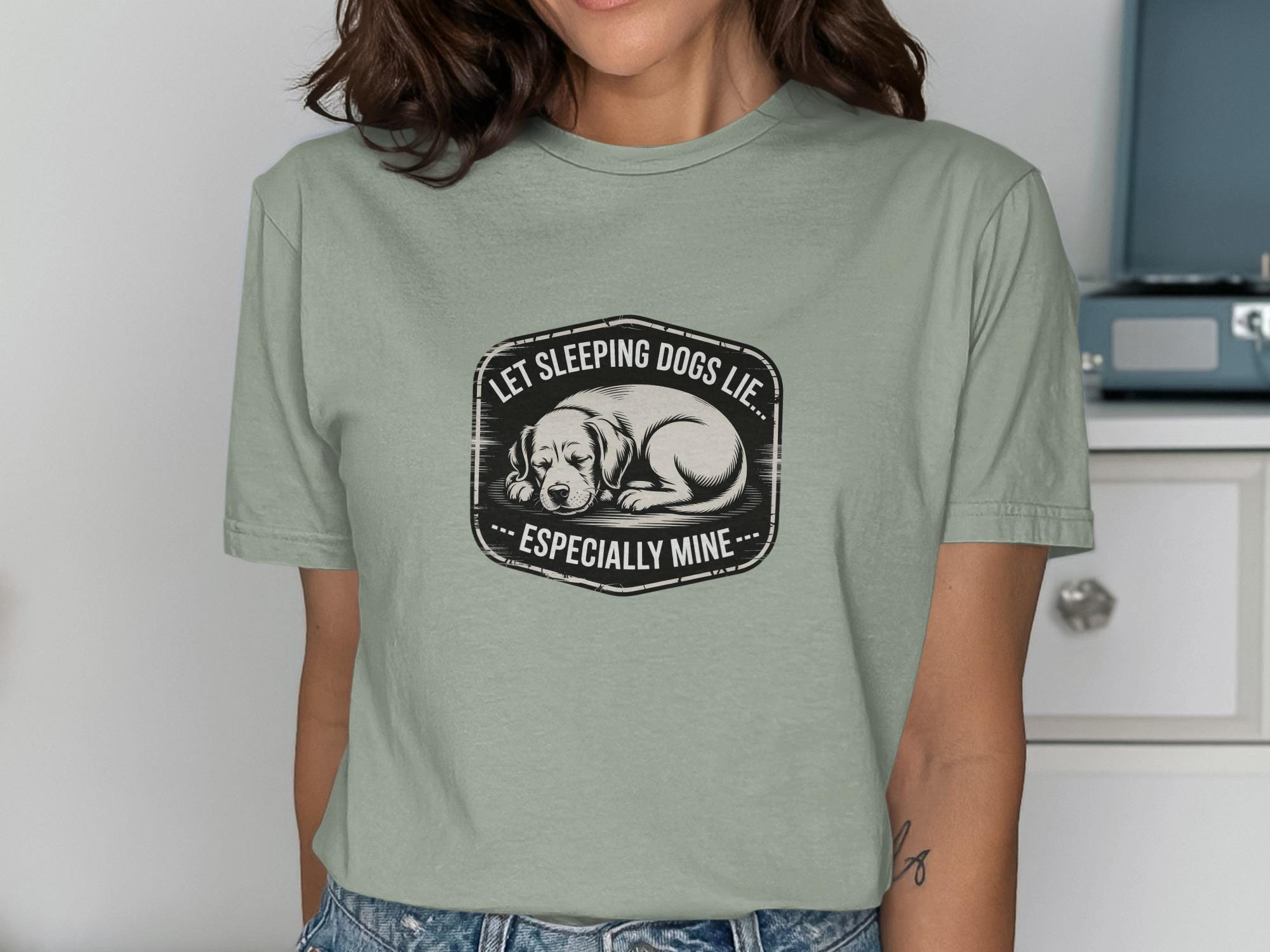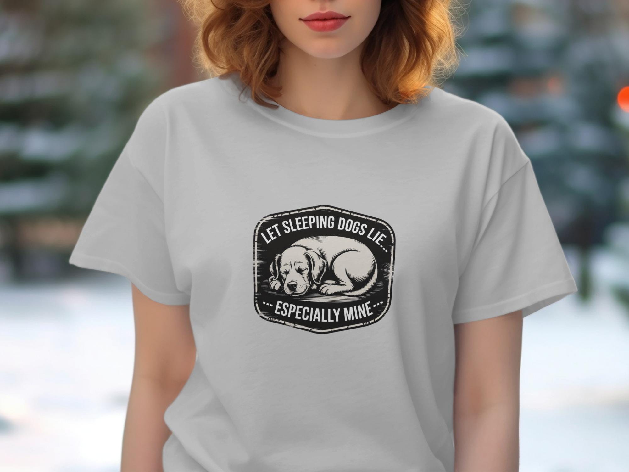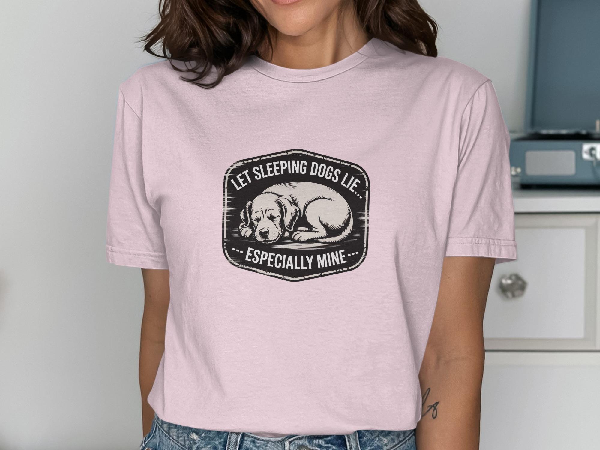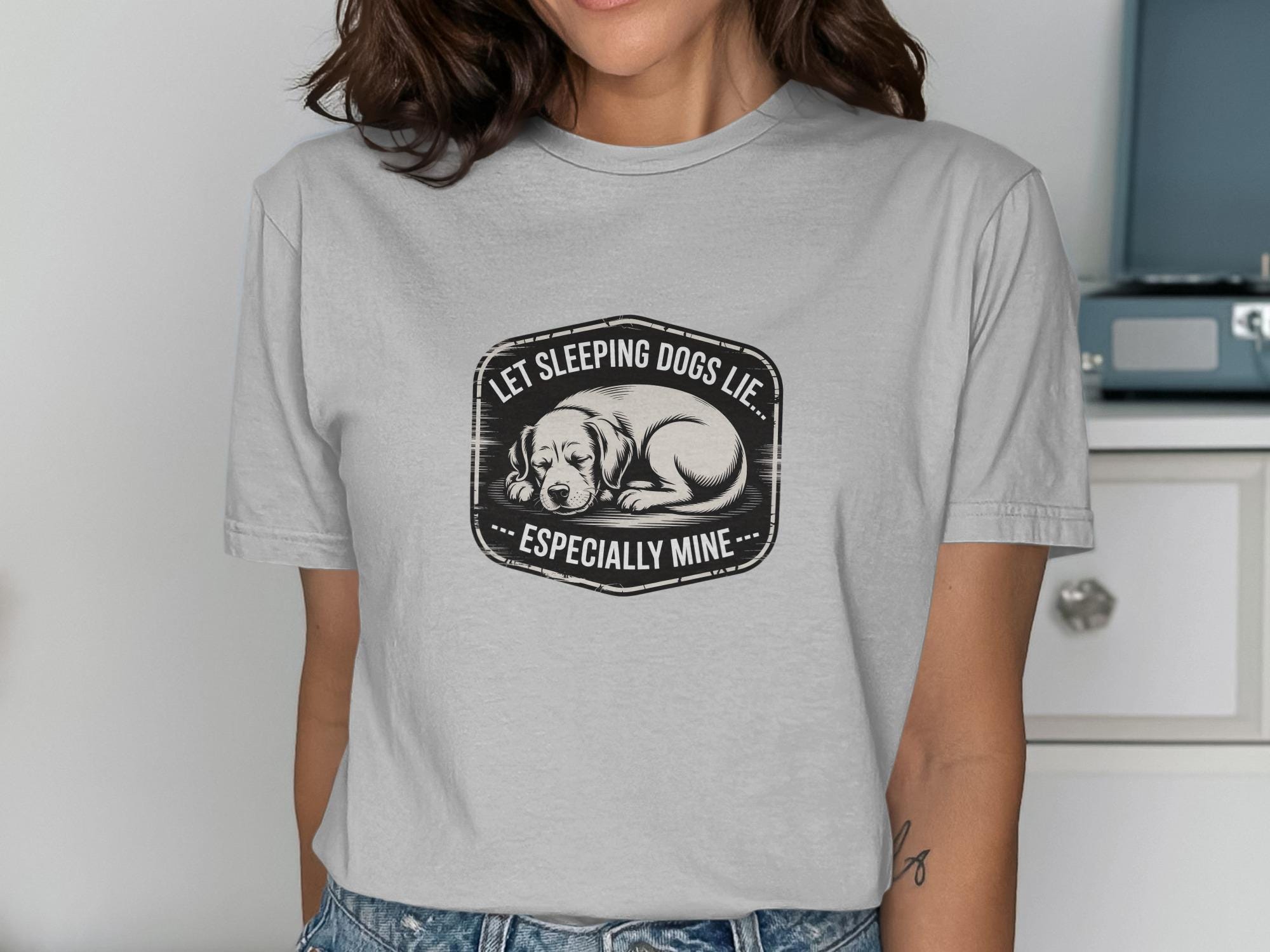 This T-Shirt features a cute sleeping dog design with the humorous quote "Let Sleeping Dogs Lie Especially Mine". It's a perfect gift for any dog lover or pet owner.