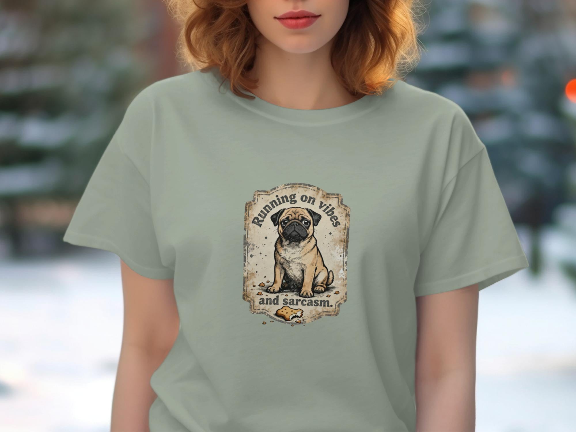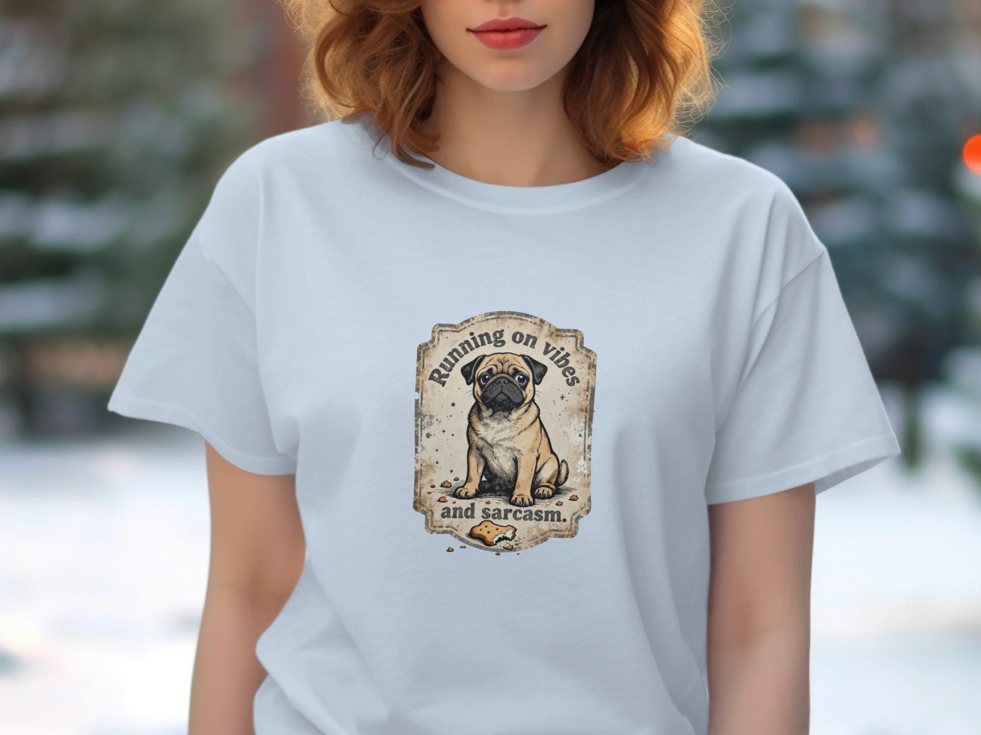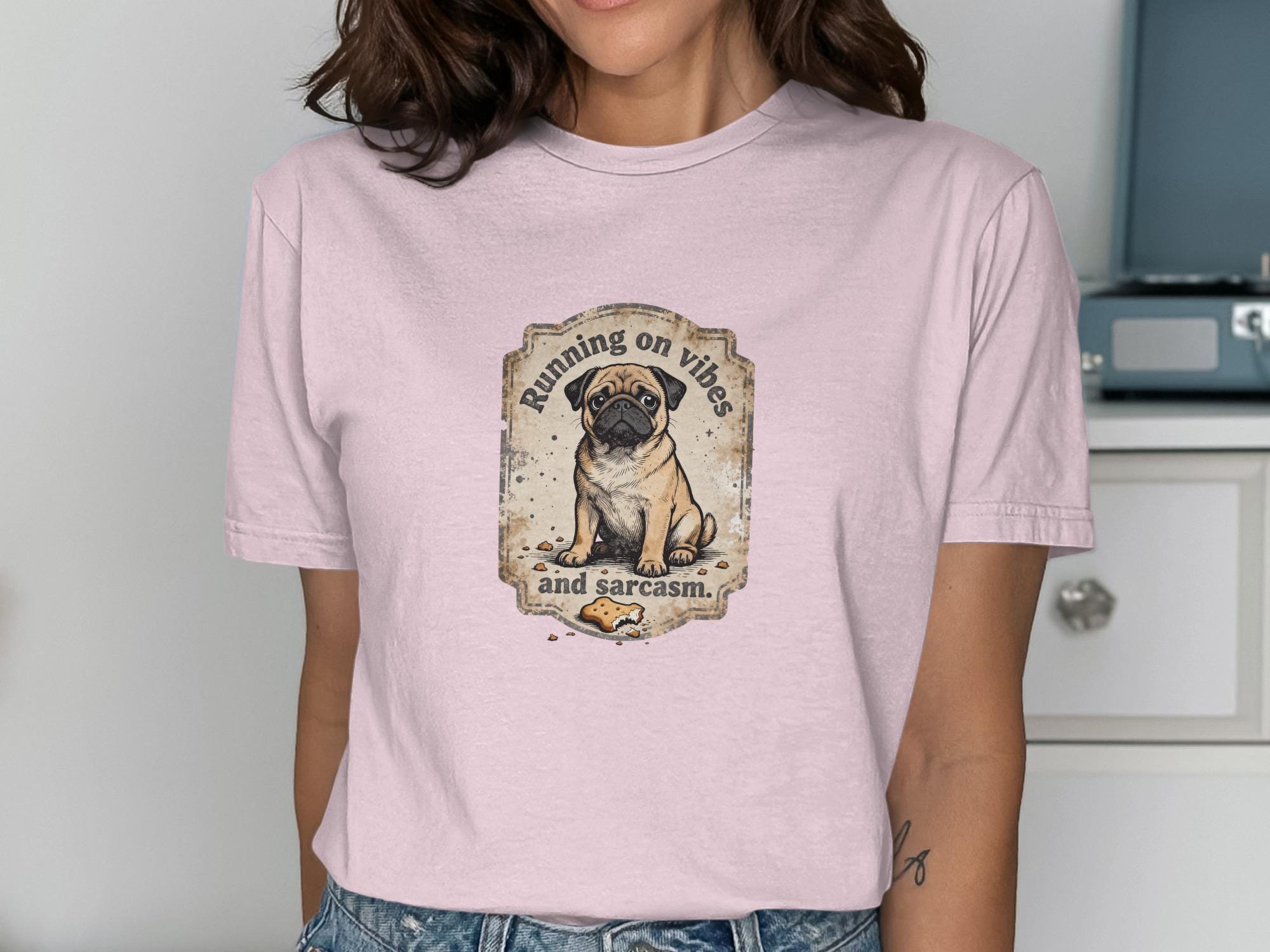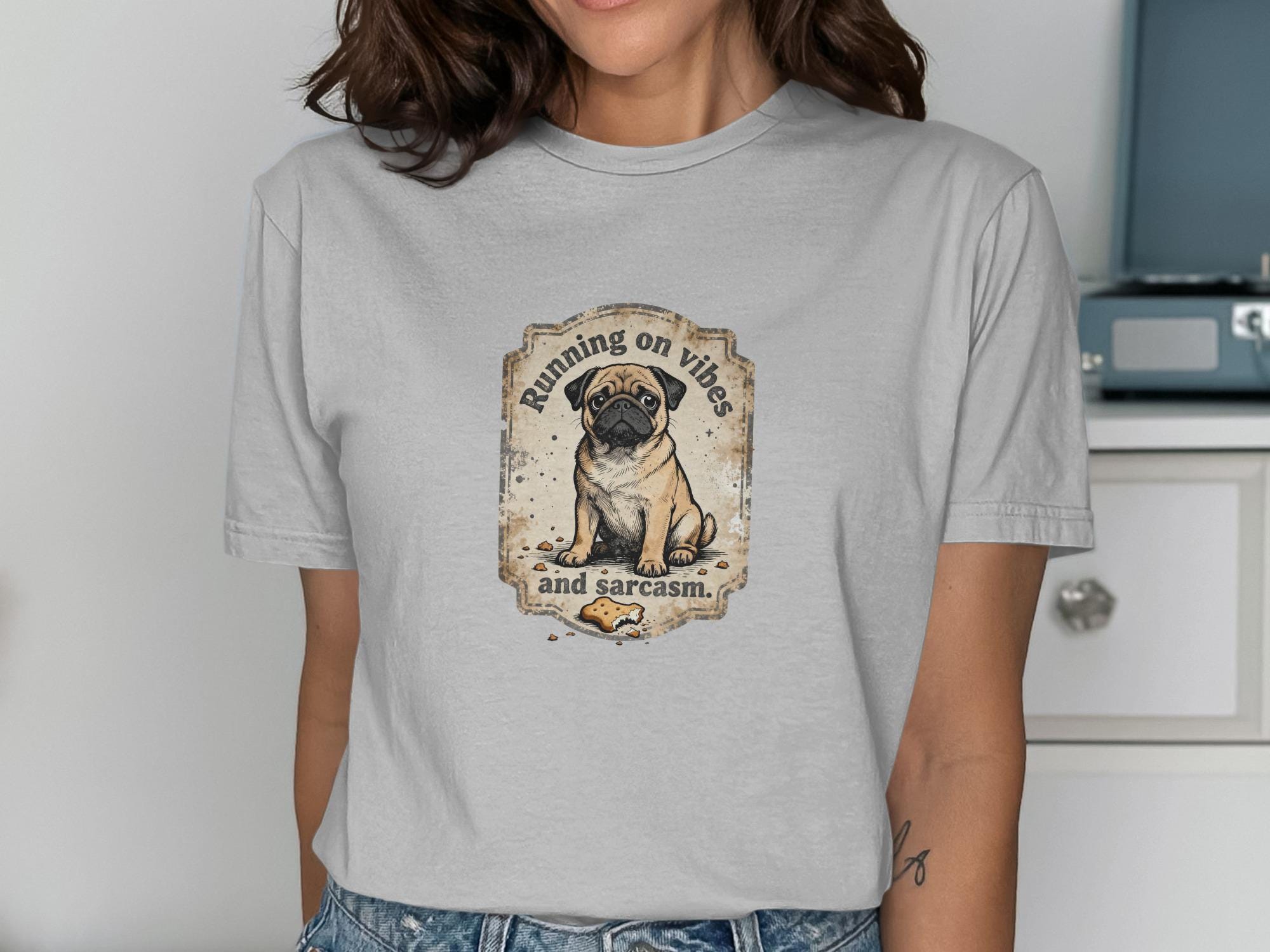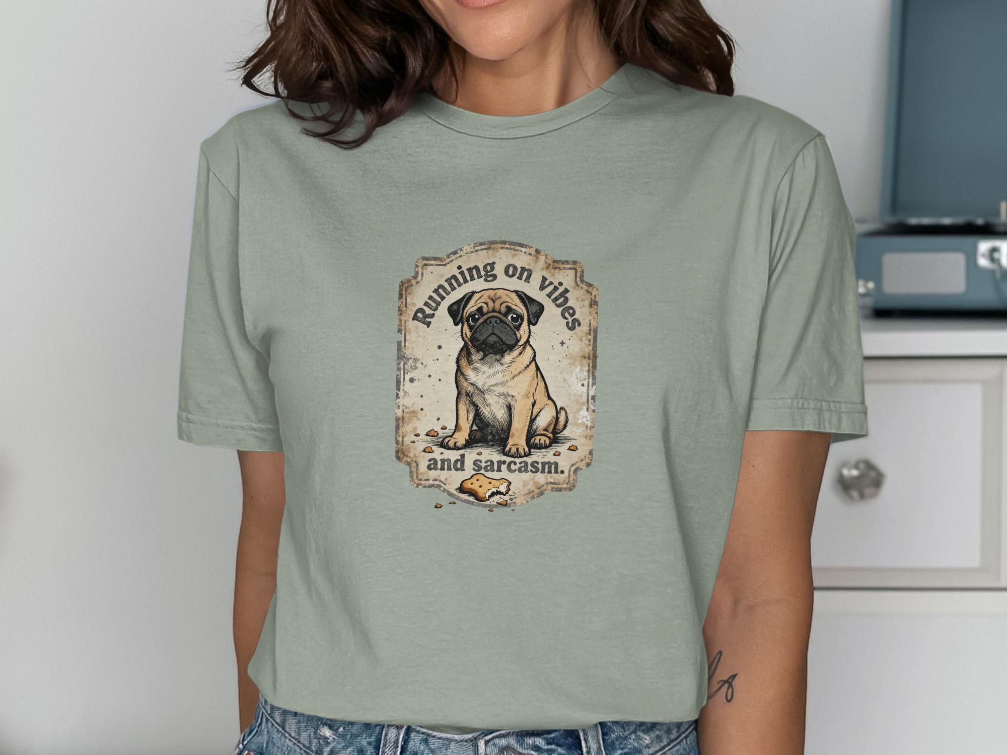 This eye-catching shirt features a playful design of a cute pug with the words "Running on Vibes and Sarcasm".