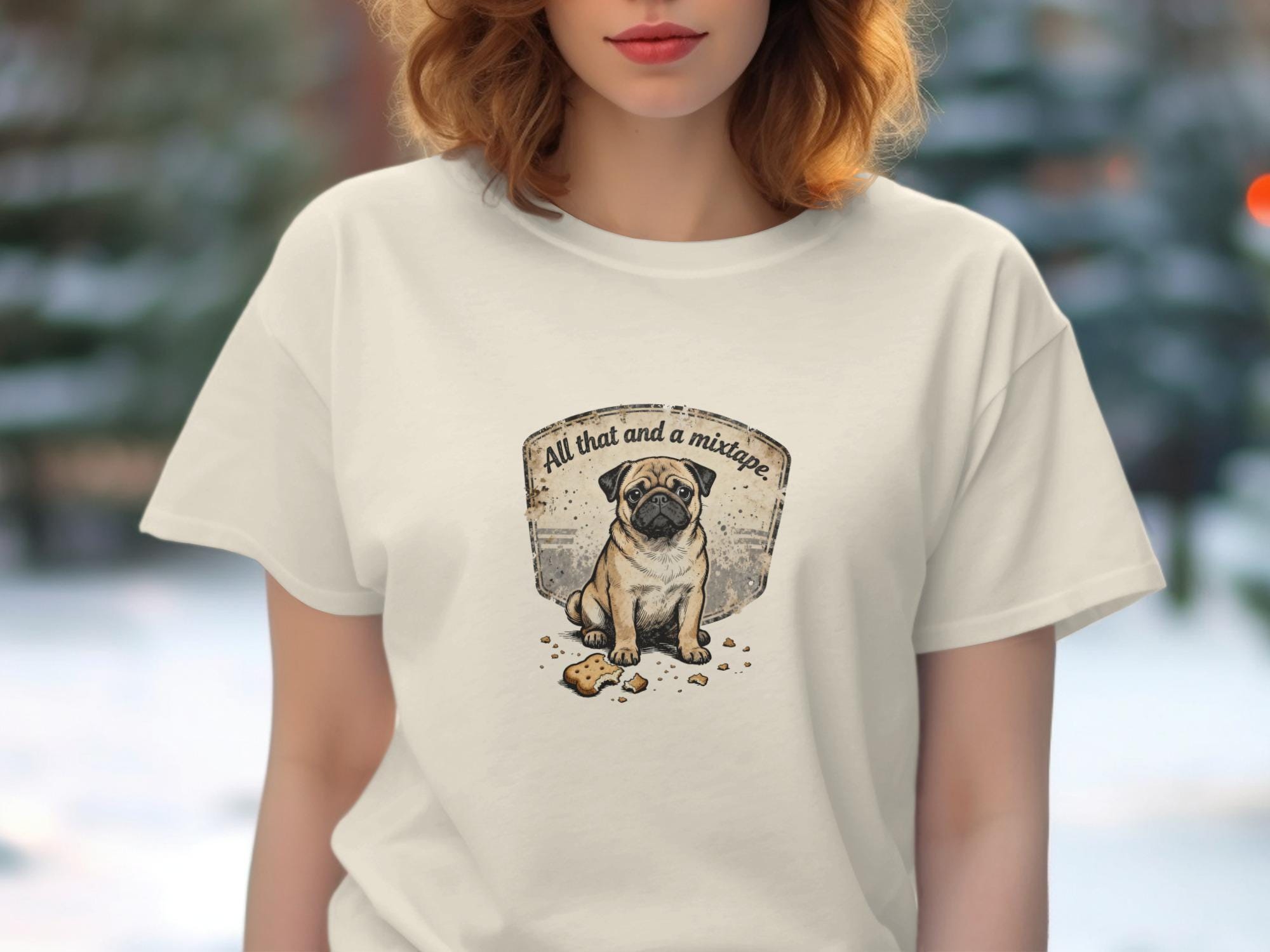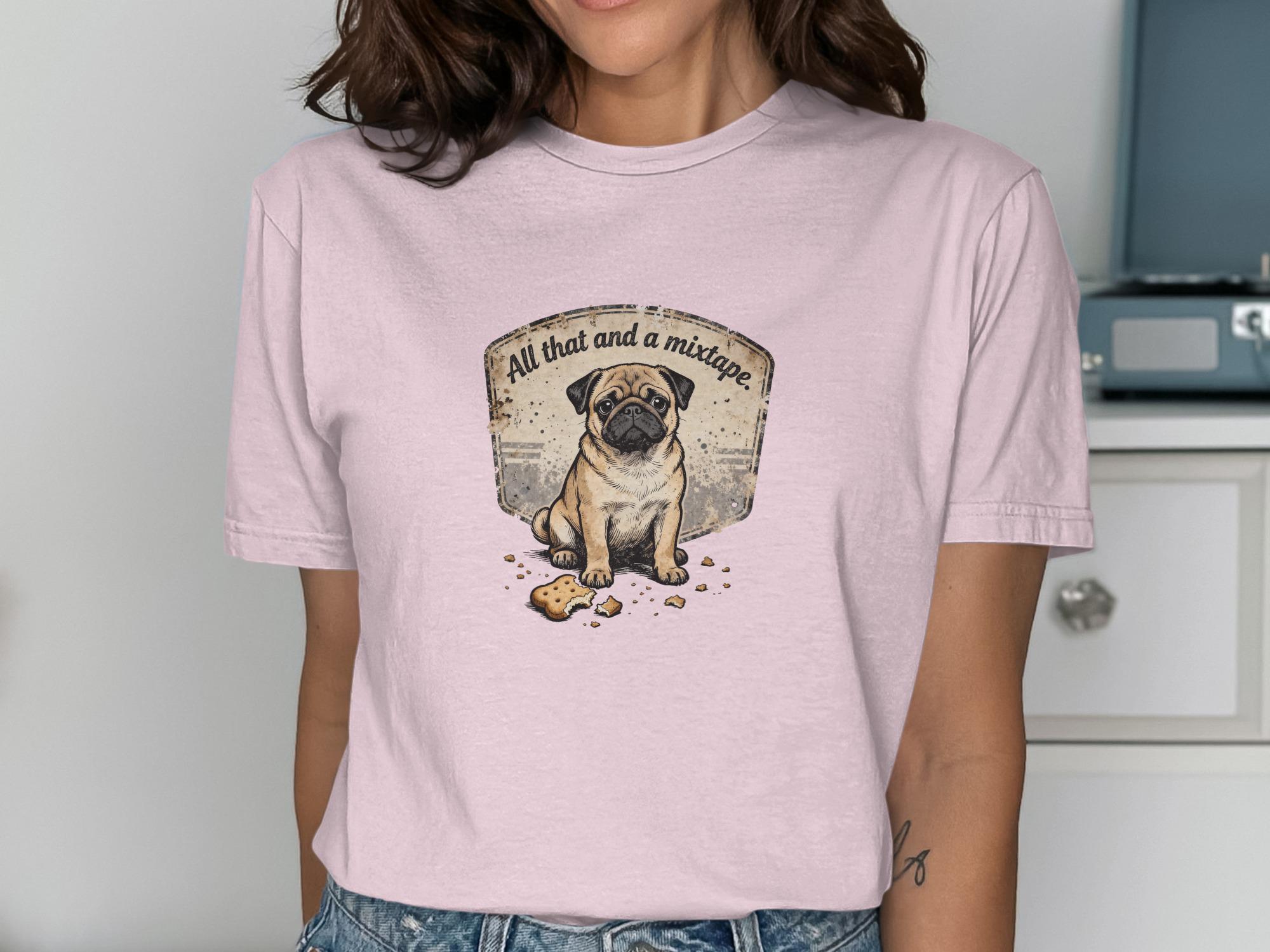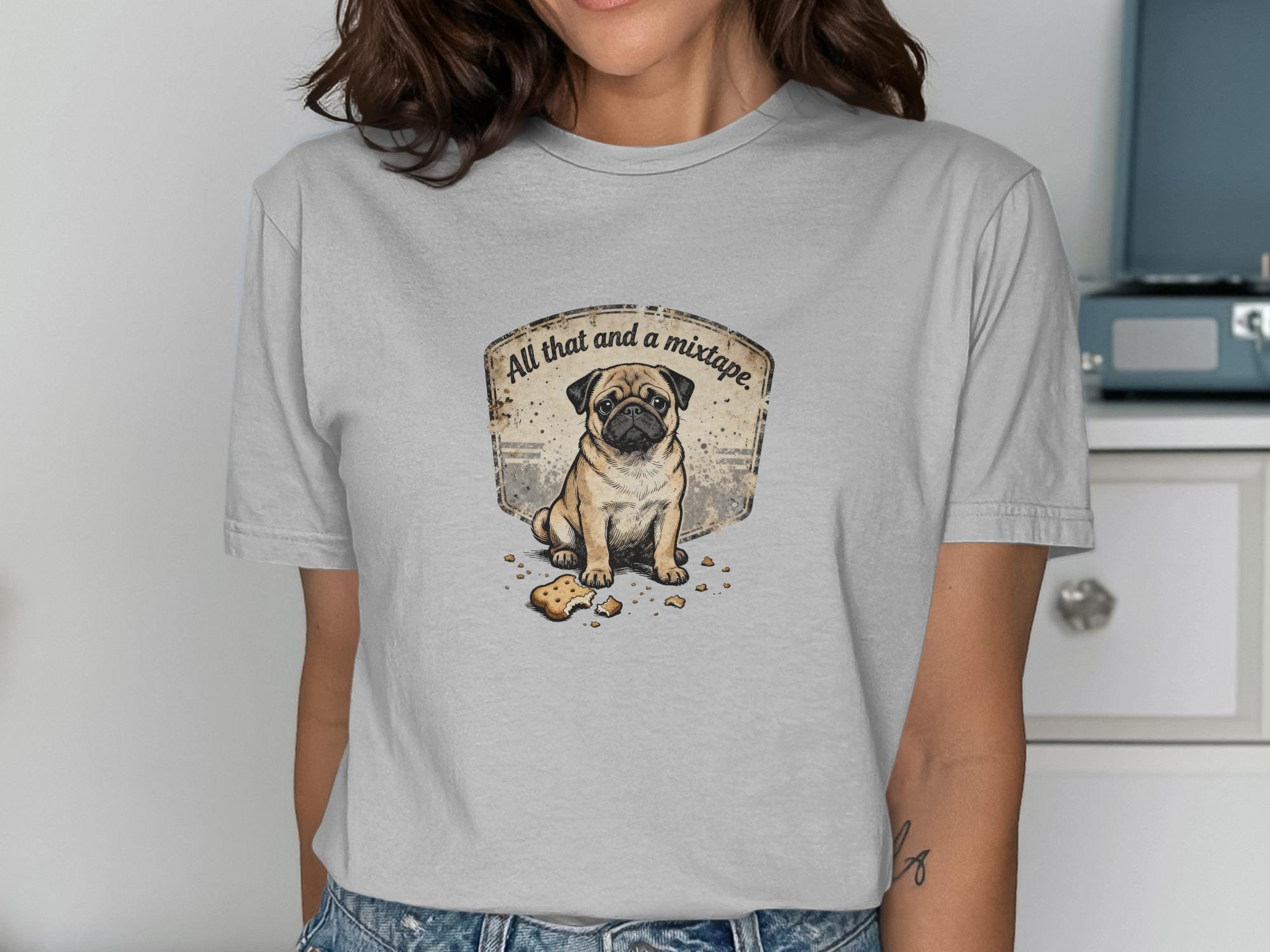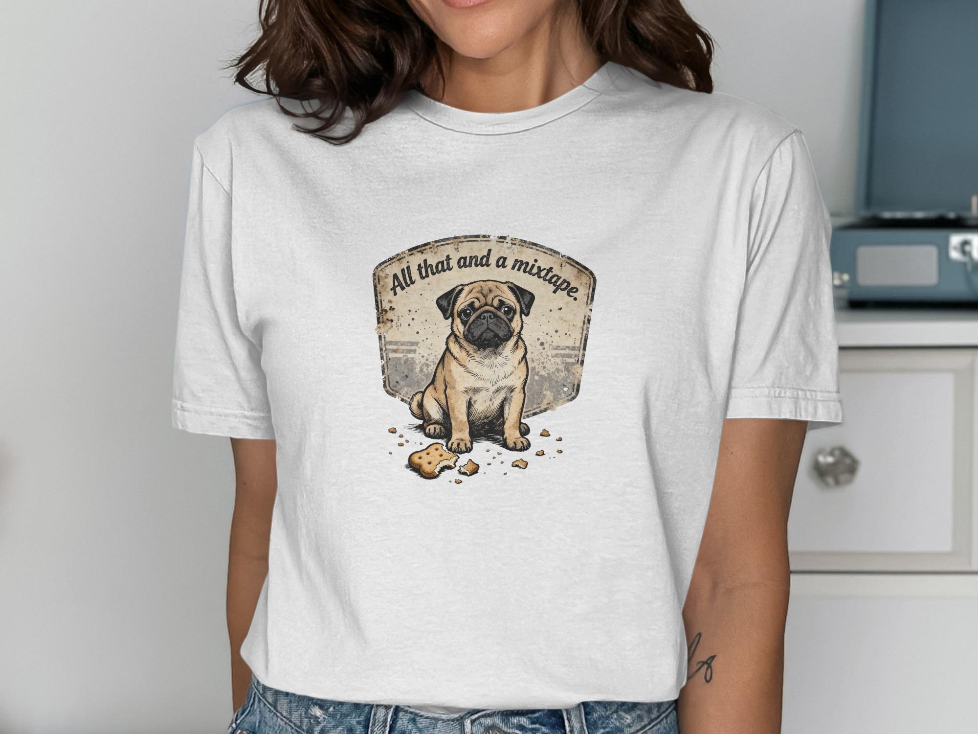This unique T-shirt features a charming pug with a playful twist. The design showcases a cute pug sitting next to a half-eaten cookie, accompanied by the phrase "All that and a mixtape." It is perfect for dog lovers and anyone with a sense of humor.