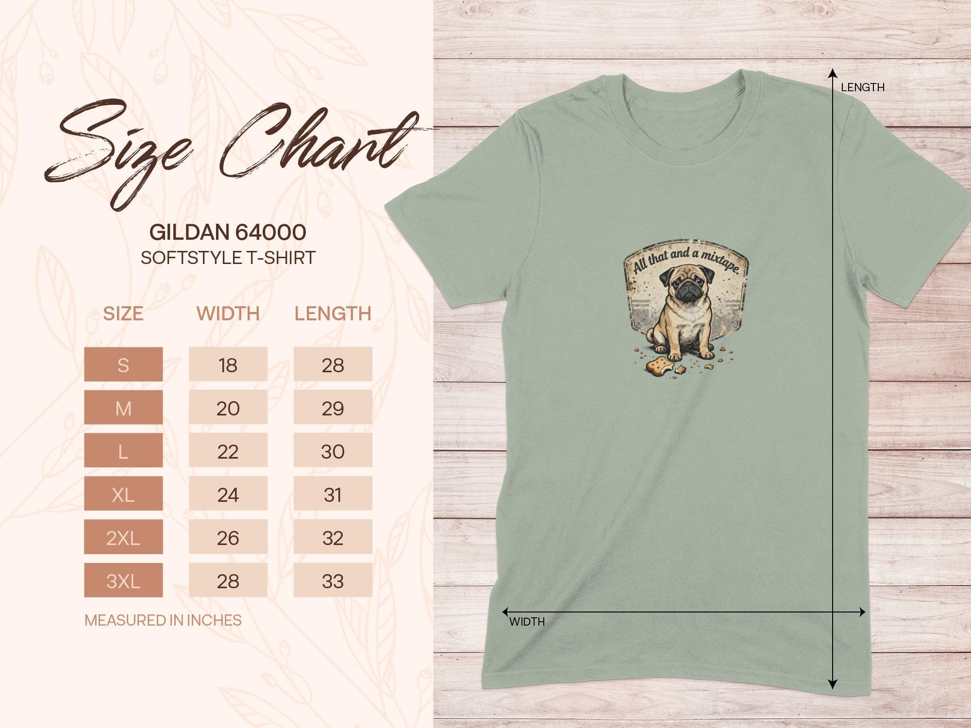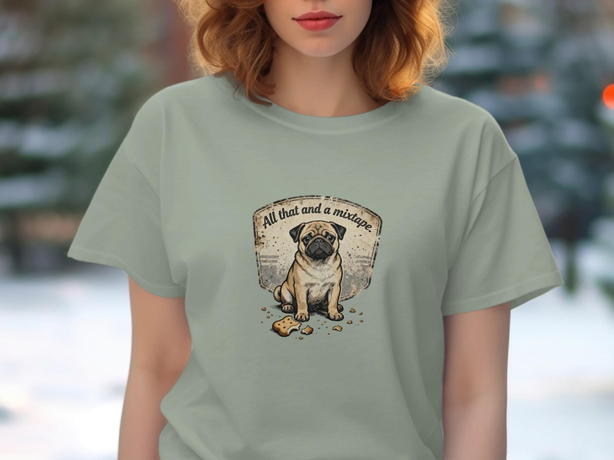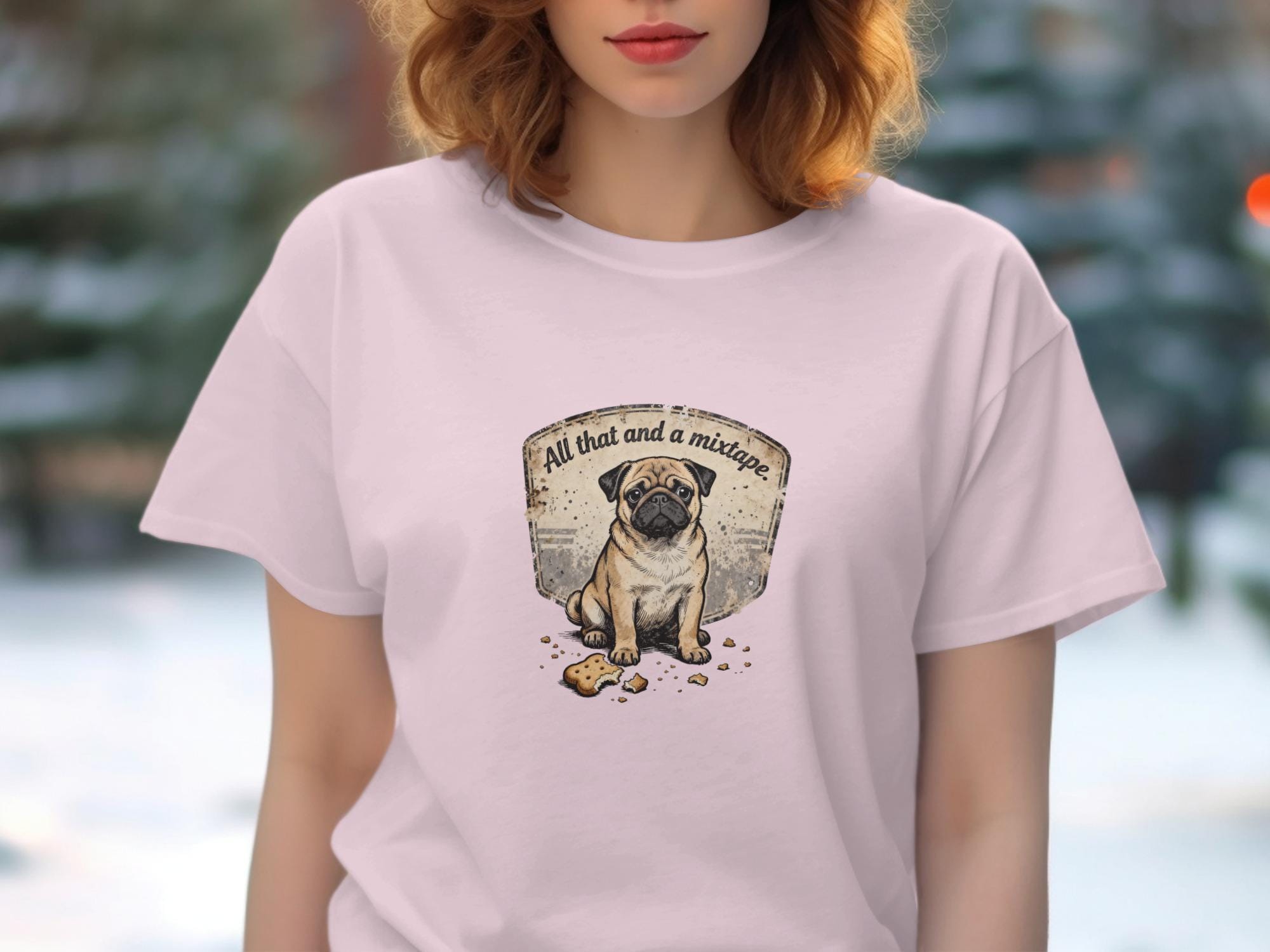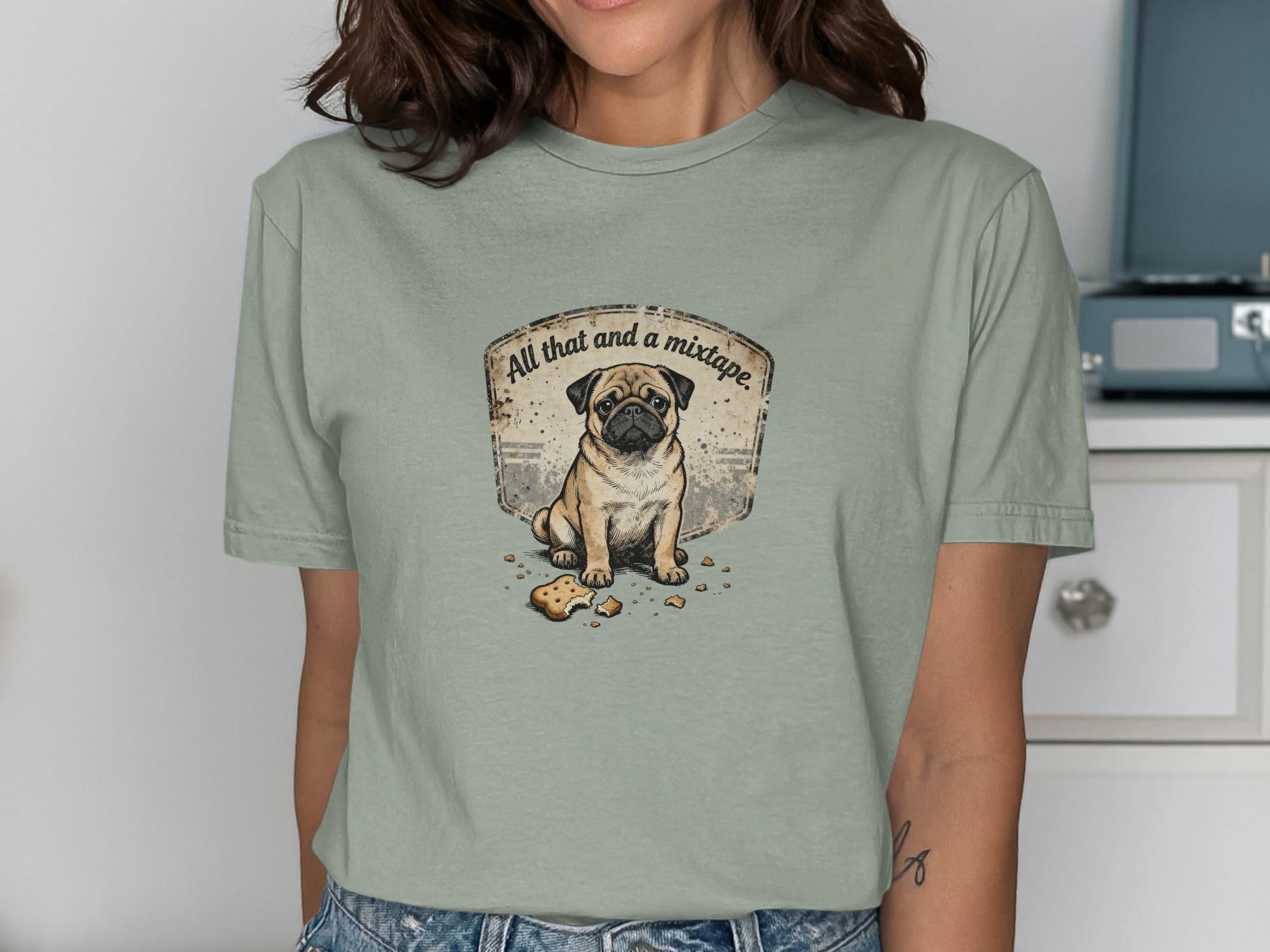 This unique T-shirt features a charming pug with a playful twist. The design showcases a cute pug sitting next to a half-eaten cookie, accompanied by the phrase "All that and a mixtape." It is perfect for dog lovers and anyone with a sense of humor.