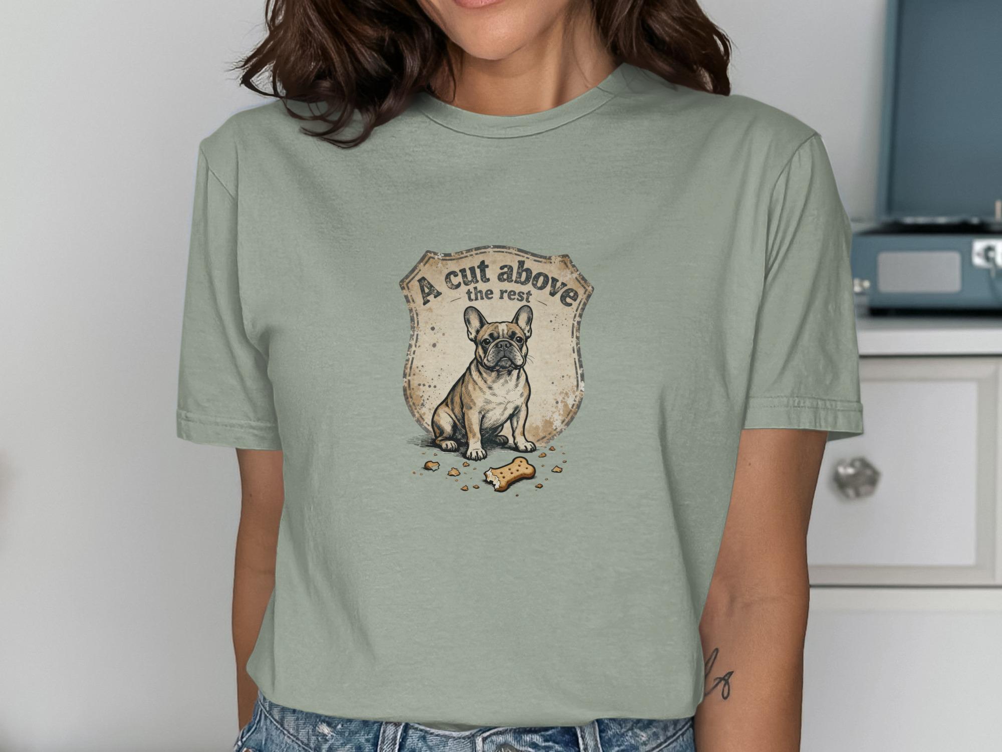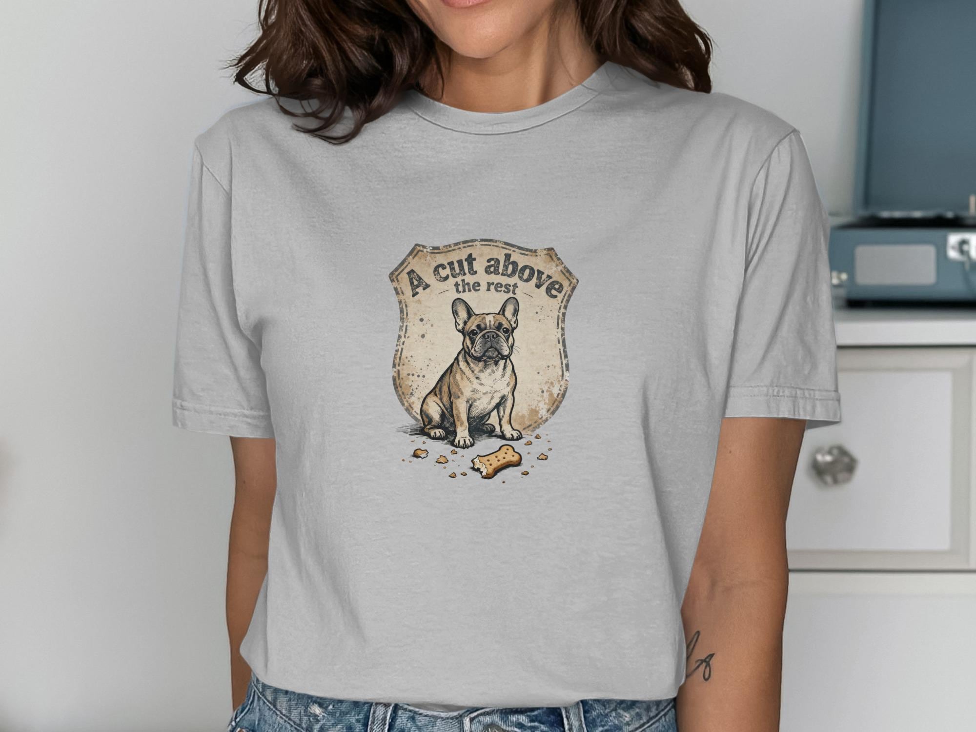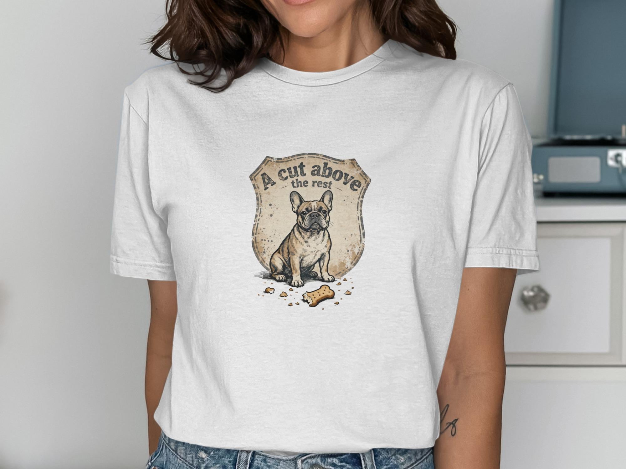 This T-Shirt features an adorable French Bulldog sitting in front of a partially eaten bone, set within a shield with the phrase "A cut above the rest." The design is humorous and appealing. Perfect for Frenchie lovers.
