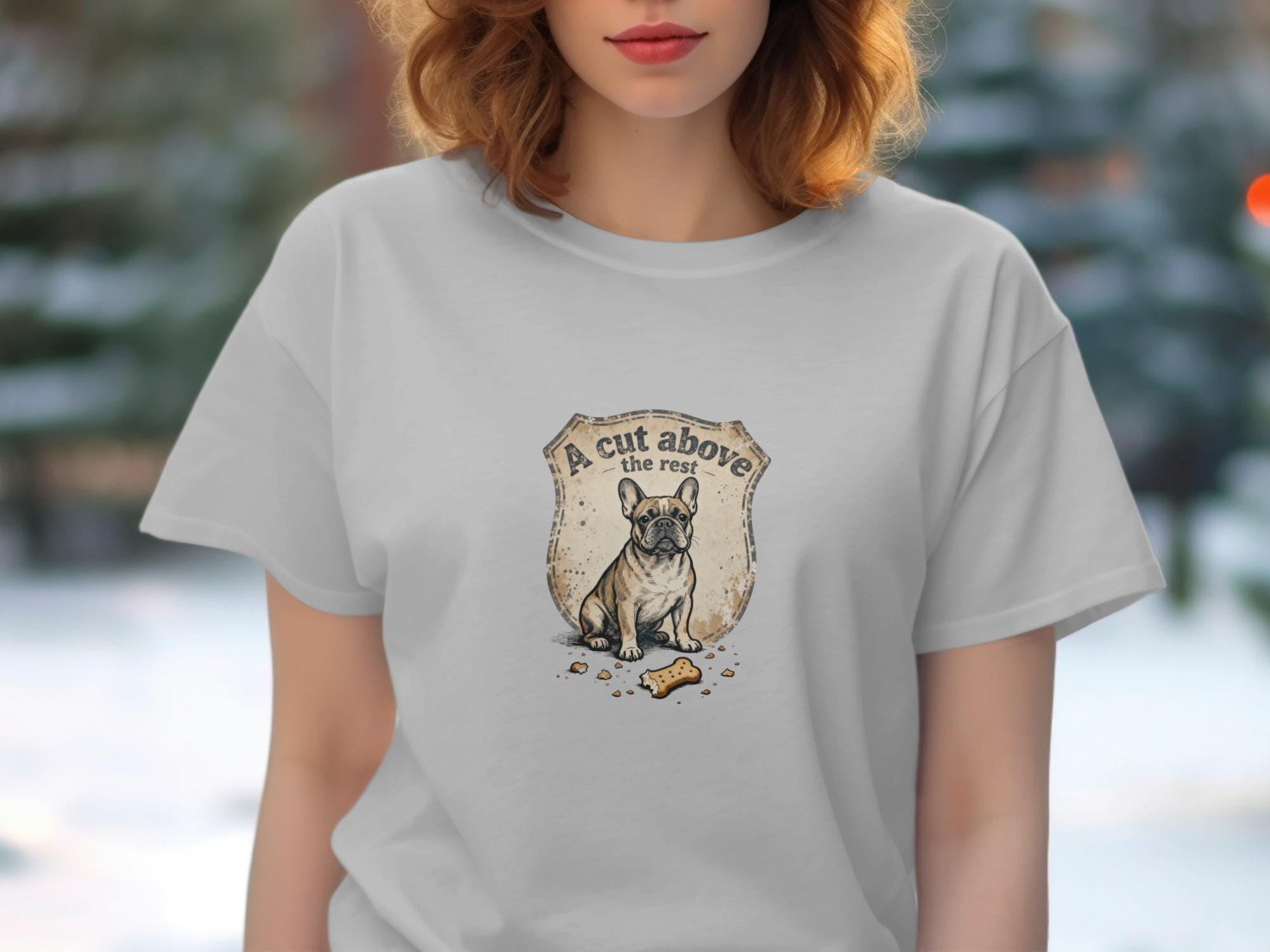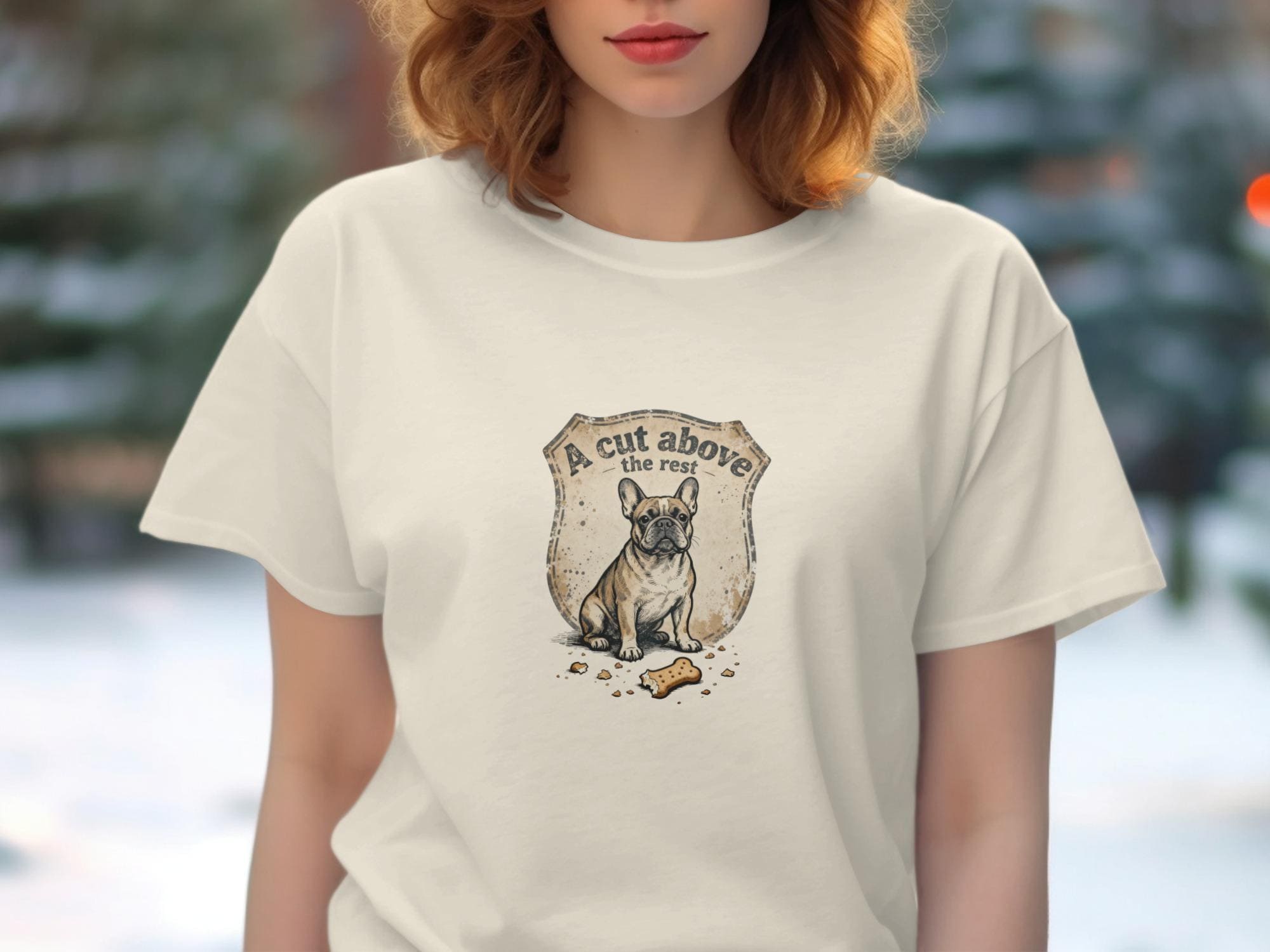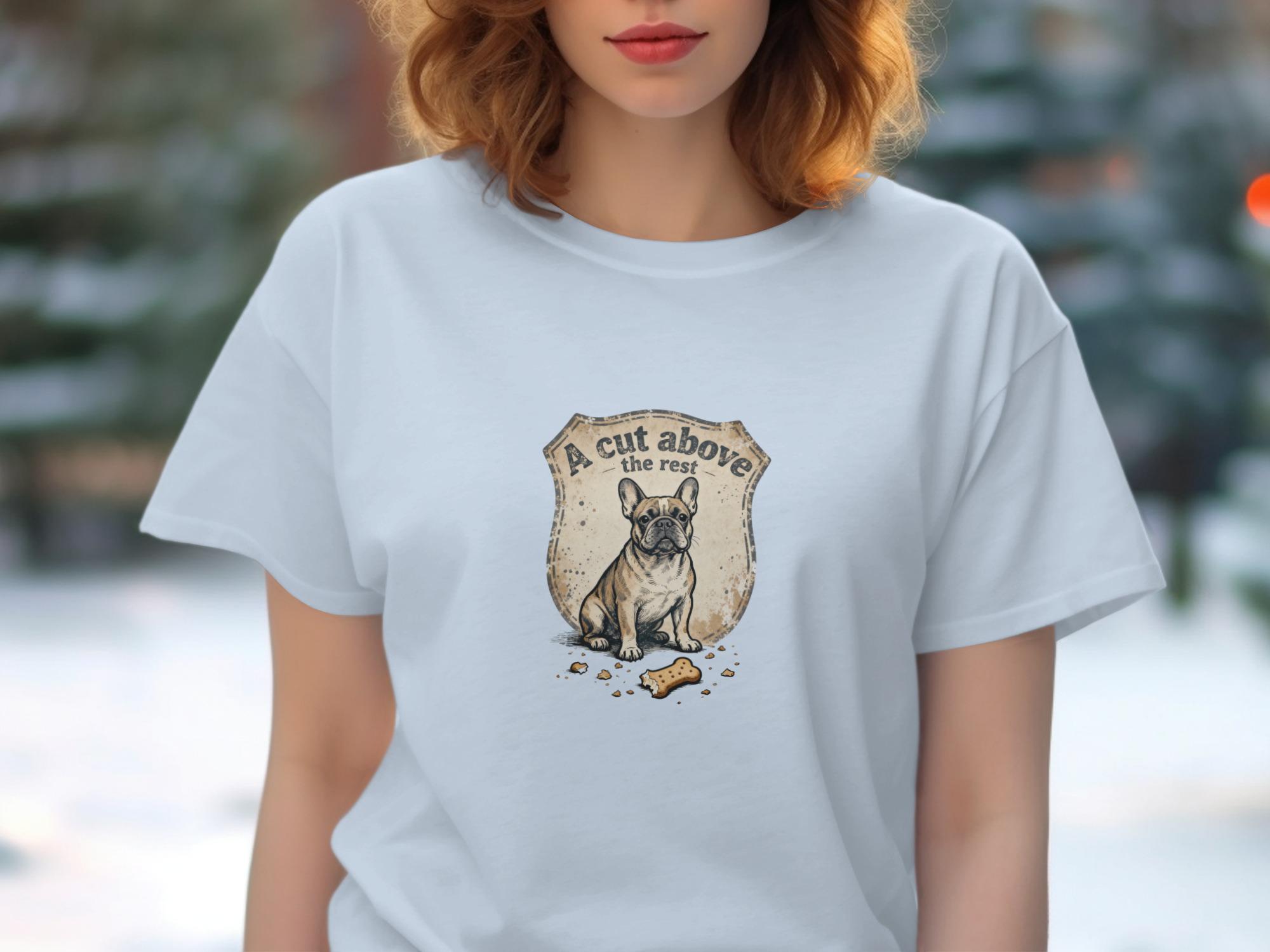 This T-Shirt features an adorable French Bulldog sitting in front of a partially eaten bone, set within a shield with the phrase "A cut above the rest." The design is humorous and appealing. Perfect for Frenchie lovers.