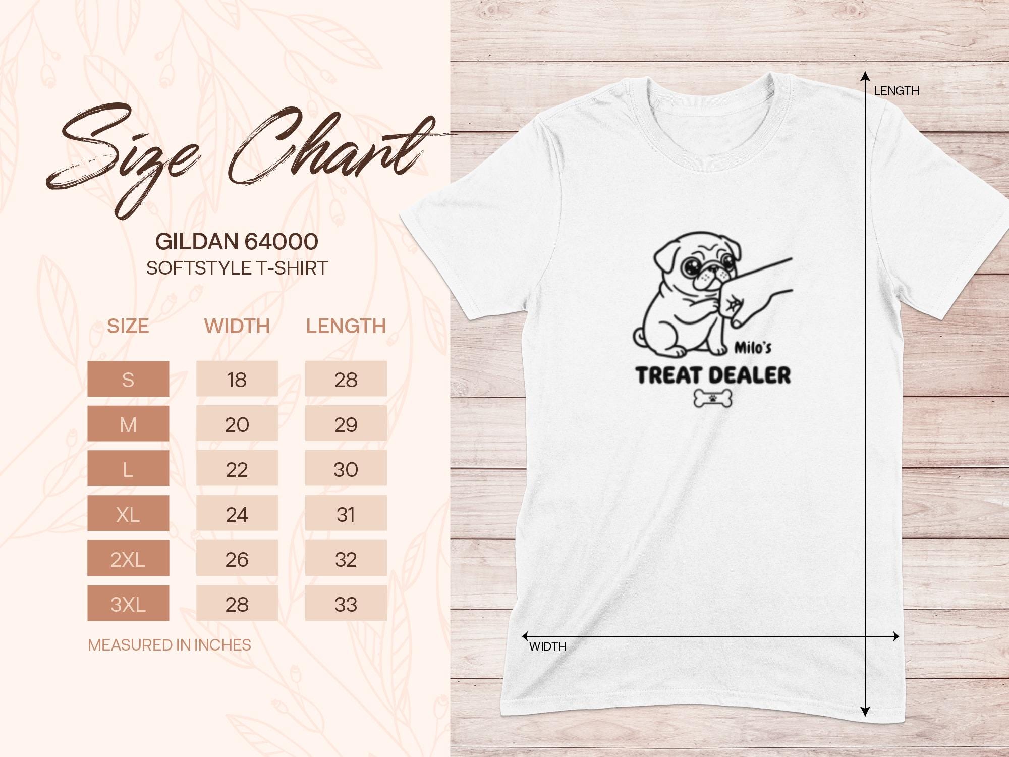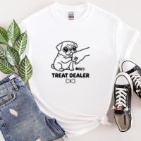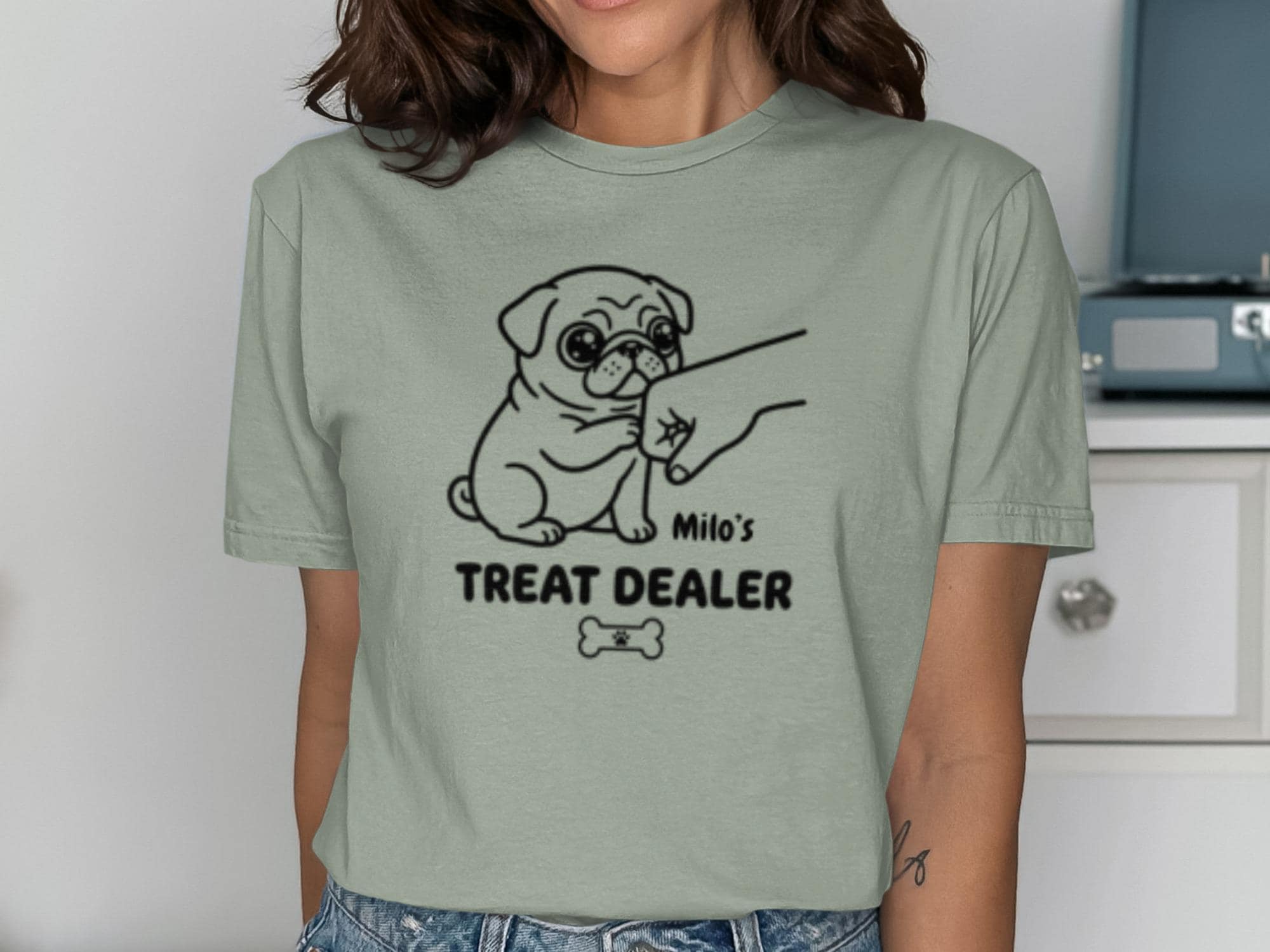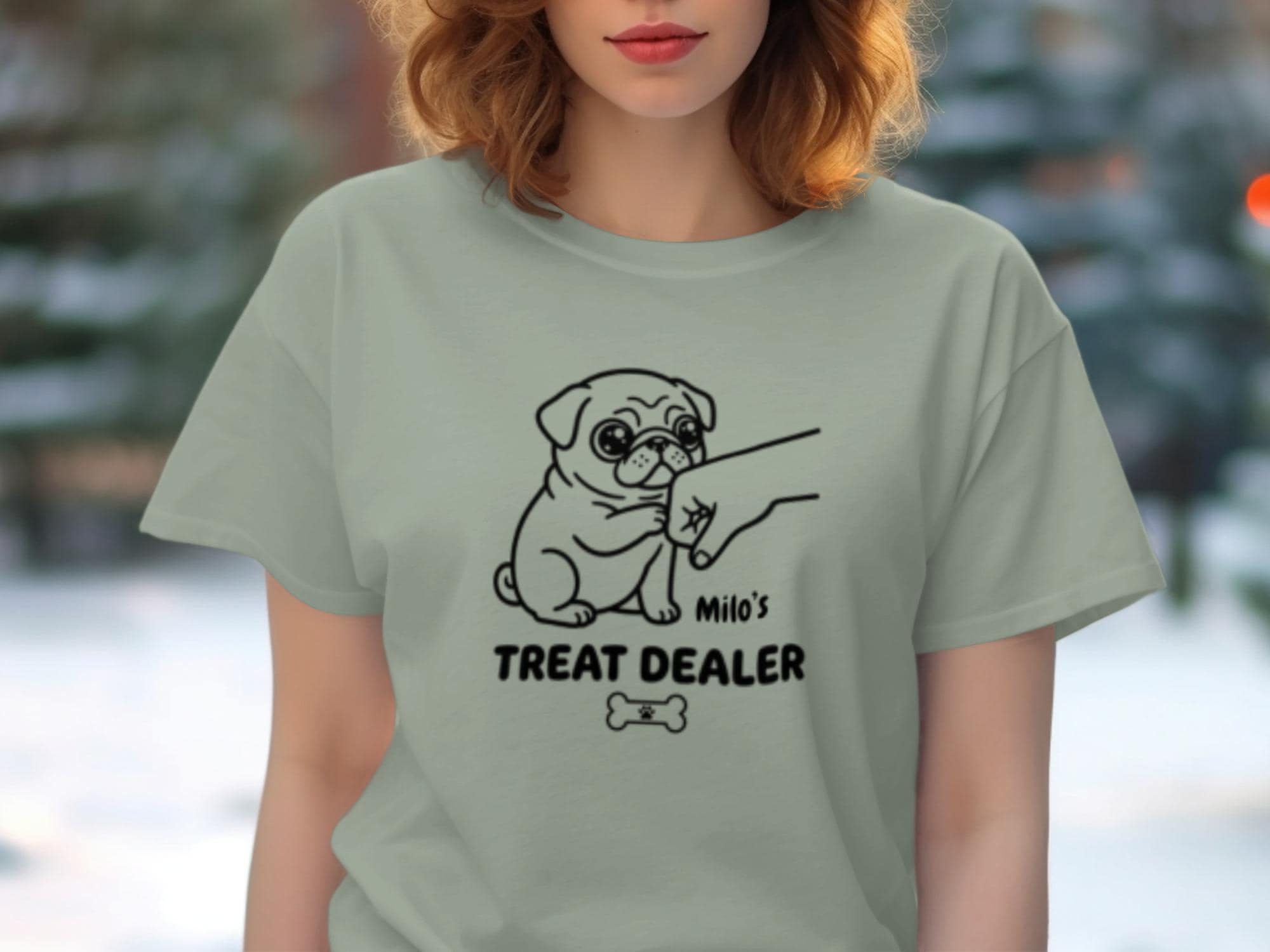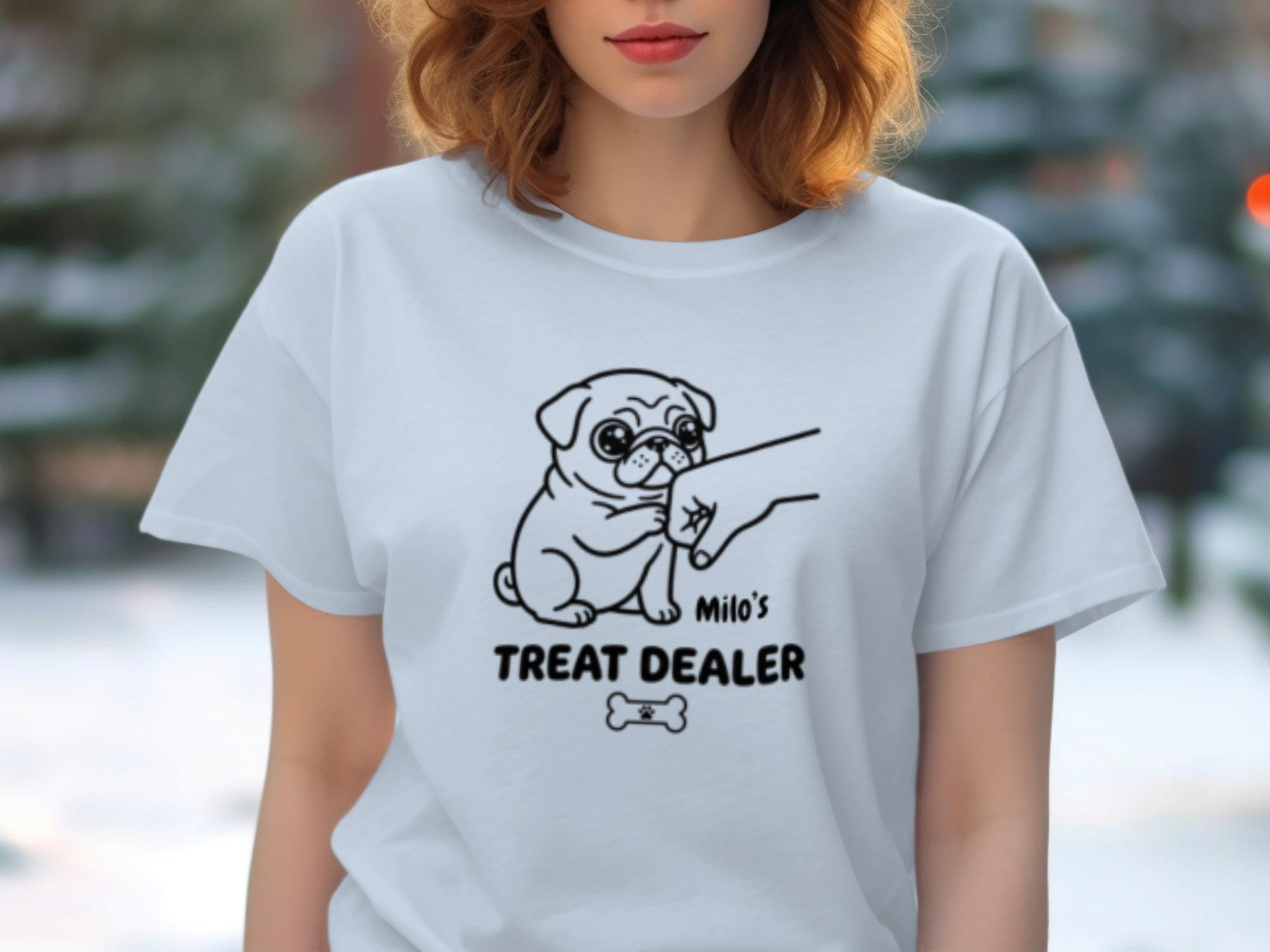 This T-shirt features an adorable pug getting a treat. "Milo's Treat Dealer" is written in bold letters, perfect for dog lovers.