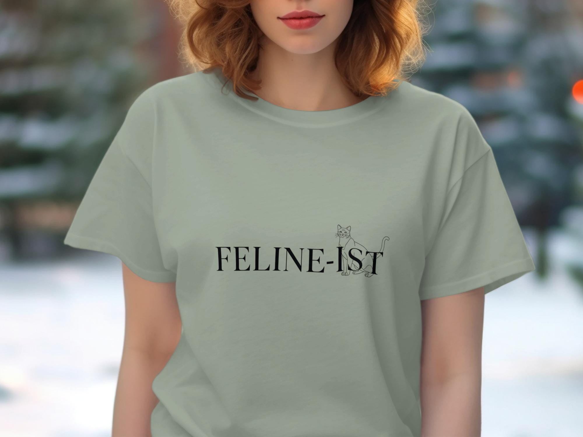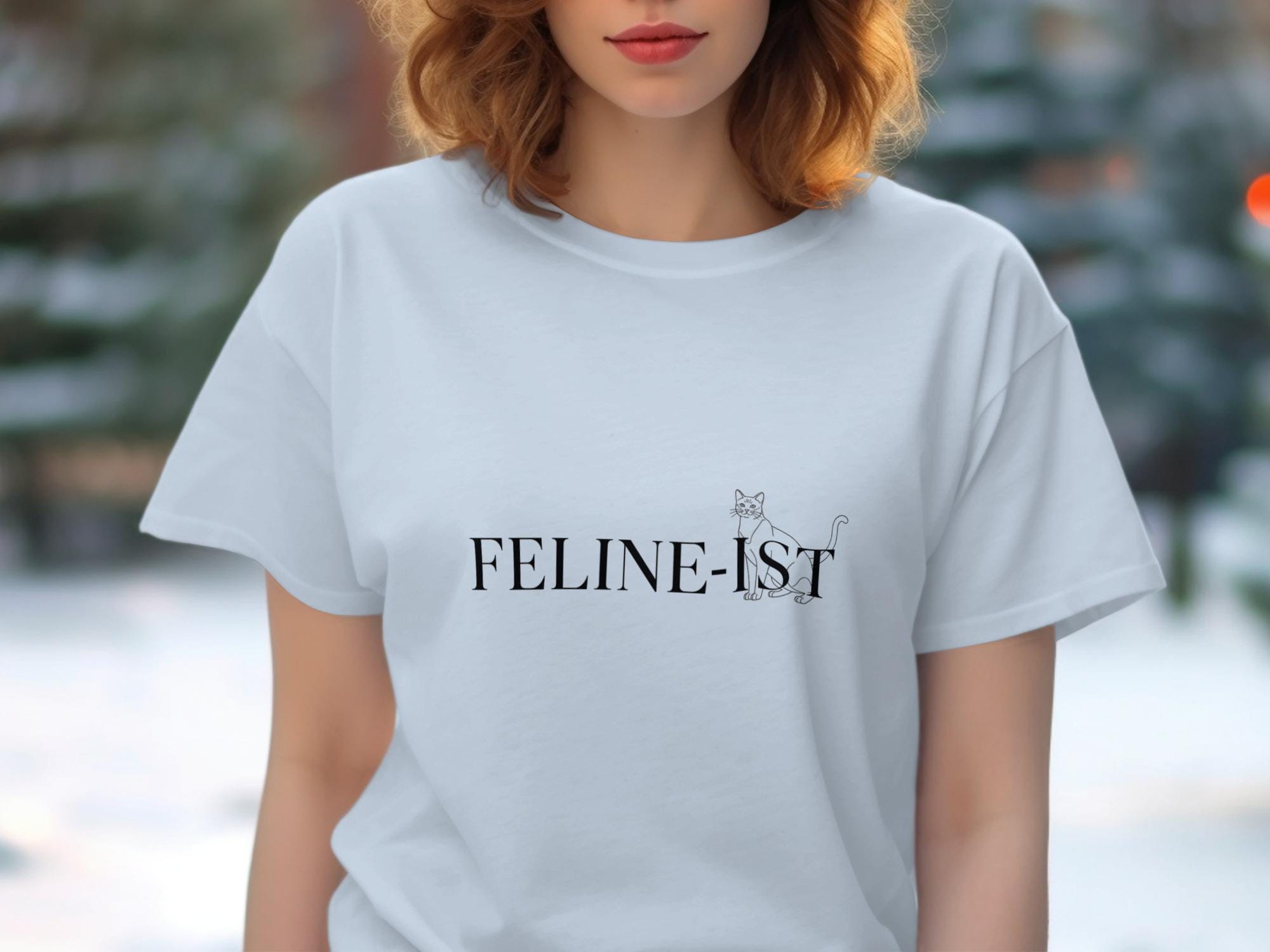 Show your love for feline friends with this unique "Feline-ist" graphic cat tee. The minimalist cat tee stands out with its clean, minimalist design featuring a simple cat outline and bold text—creating a modern cat apparel classic for any animal lover gift. Whether you’re shopping for yourself or searching for cat lover gifts, this cat themed gift is a thoughtful choice. It’s a quirky cat gift that fits effortlessly into any wardrobe and makes an ideal thinking of you cat present.