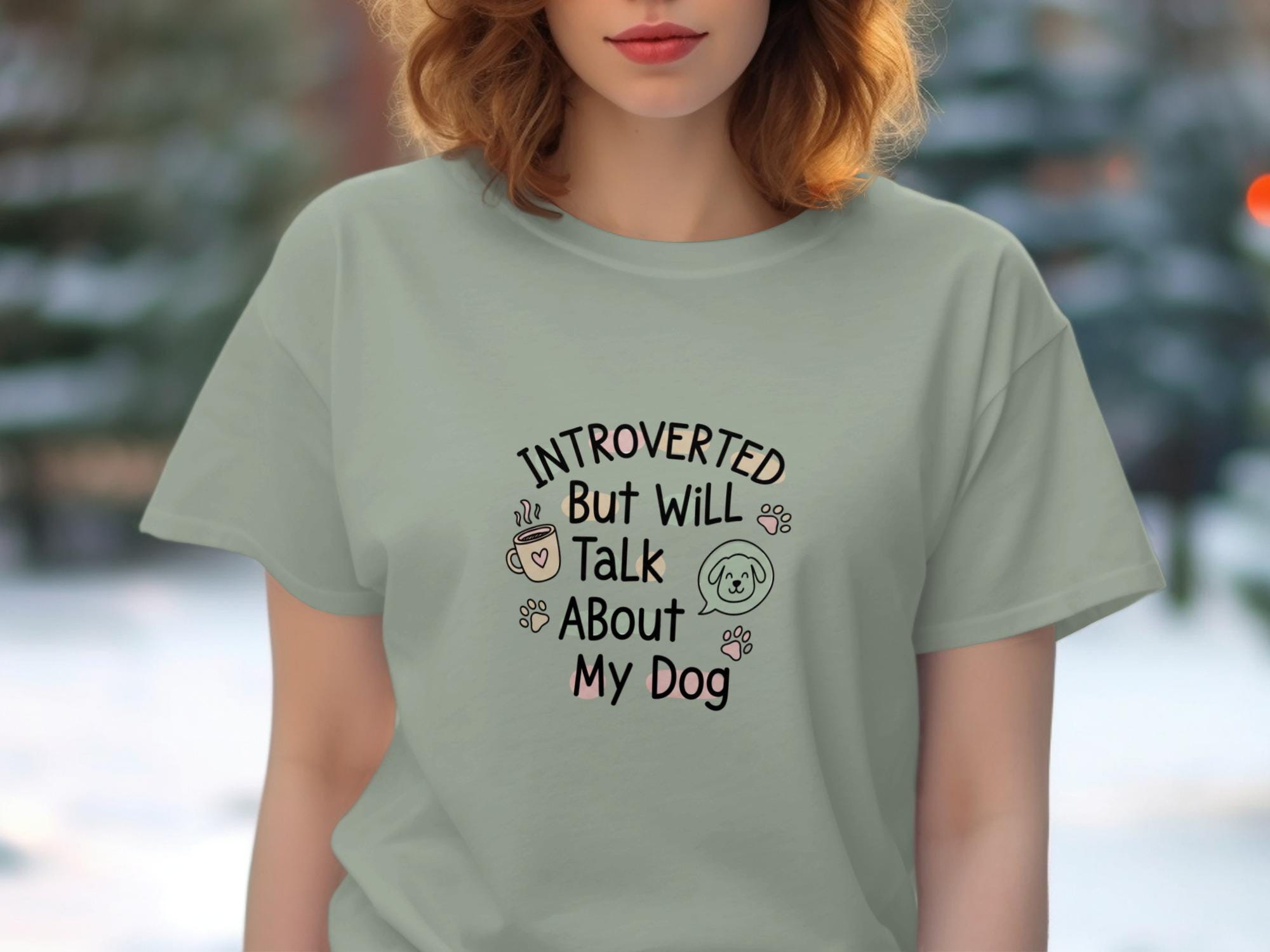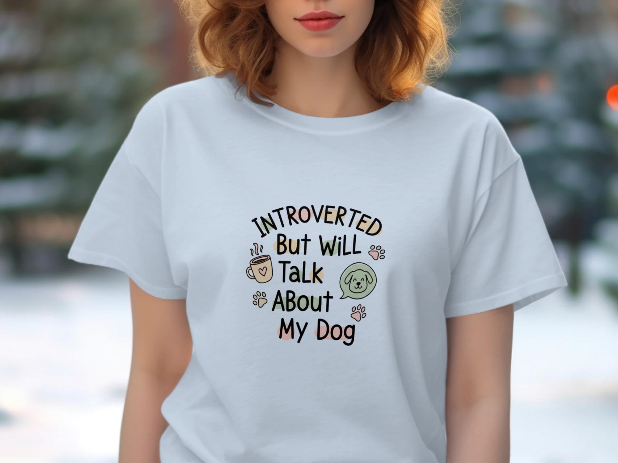 Express your love for your canine companion with this charming T-Shirts! This design features the text "Introverted But Will Talk About My Dog" accompanied by a cute dog illustration, paw prints and coffee cup, perfect for any dog parent who loves a cozy day at home.