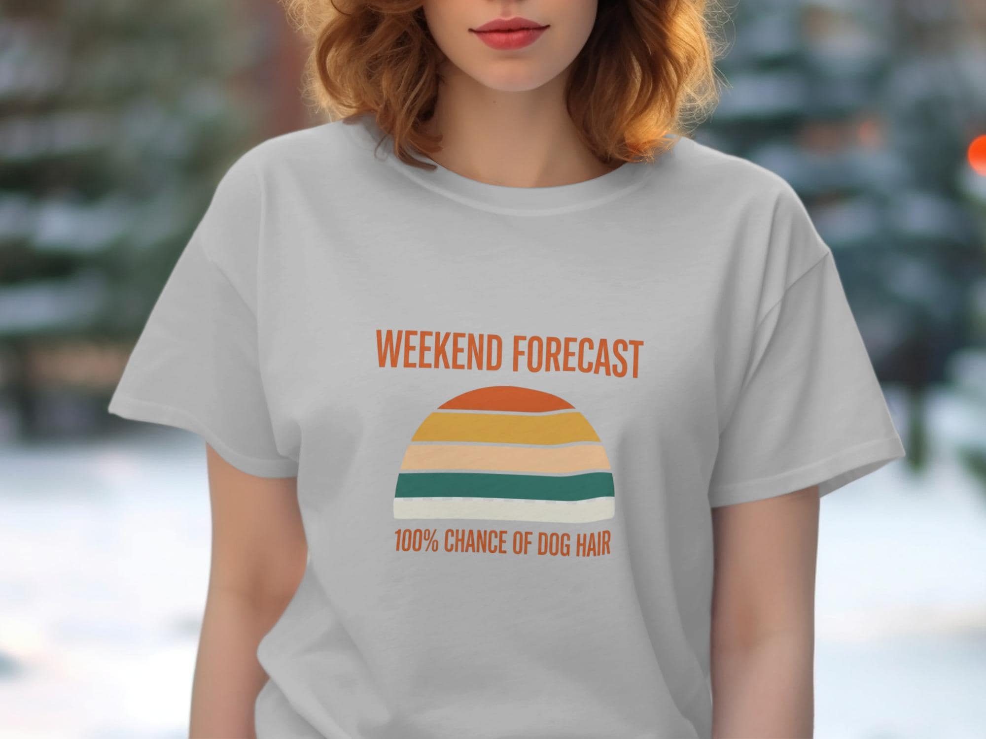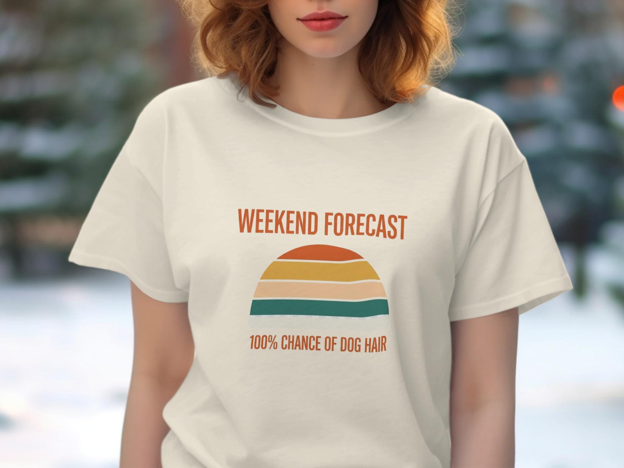 This charming T-Shirt is sure to bring a smile to any dog lover's face. Featuring a retro-inspired design with the humorous phrase "Weekend Forecast: 100% Chance of Dog Hair," it's a perfect gift for dog moms, dog dads, or any pet owner who embraces the joys (and the fur) of canine companionship.