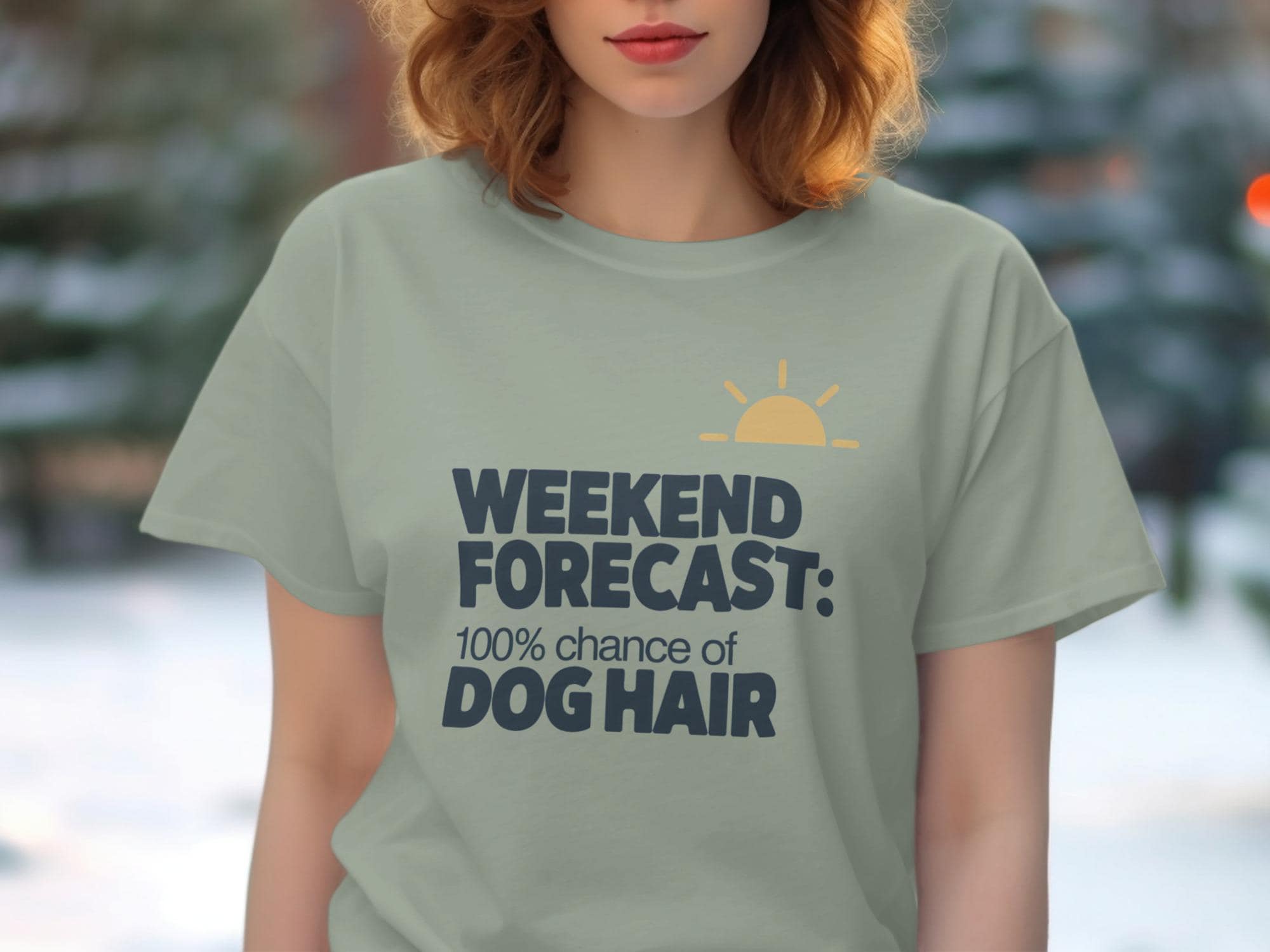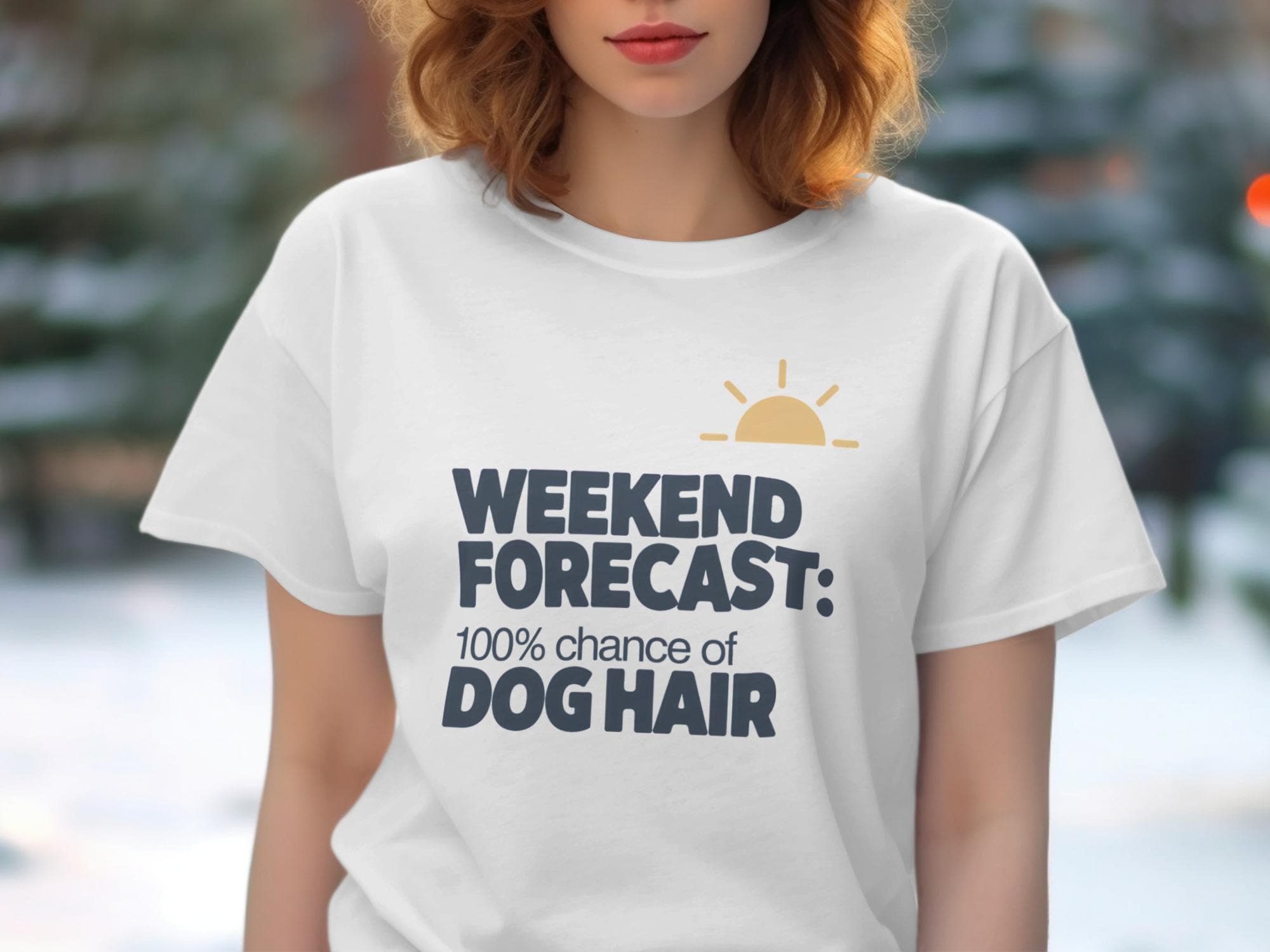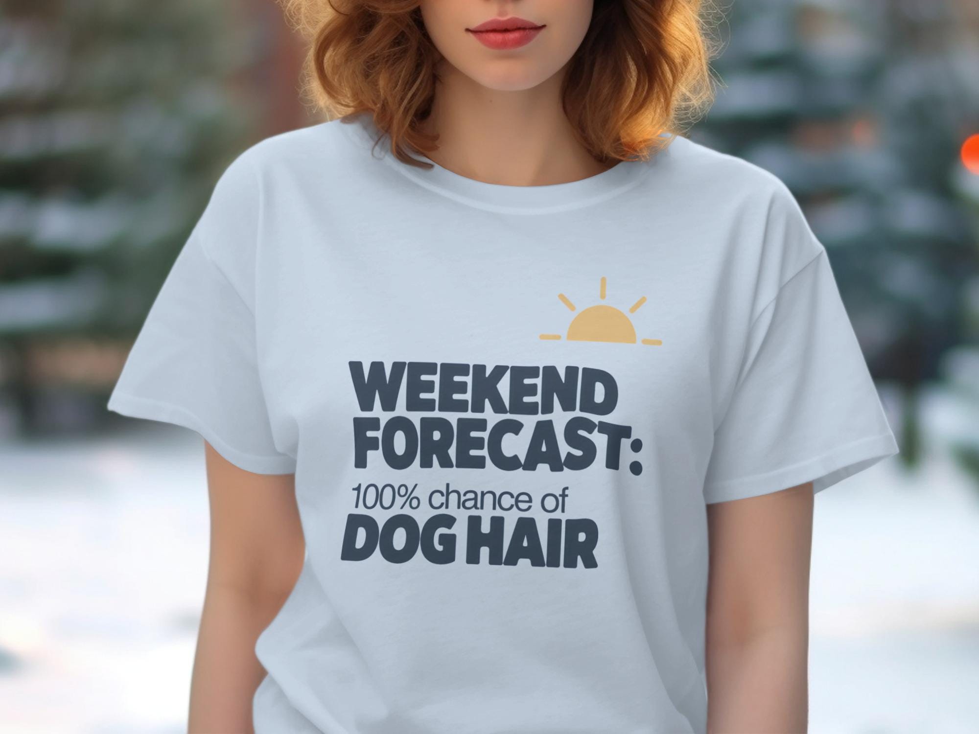 Are you a proud dog parent who knows the joys of a furry companion? This hilarious "Weekend Forecast 100% Chance of Dog Hair" design is perfect for you. Show off your love for your furry friend with this fun and relatable T-Shirt. A must have design for everyday dog lovers.