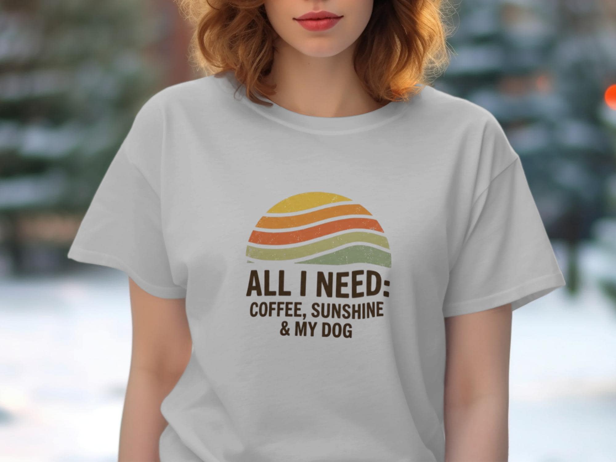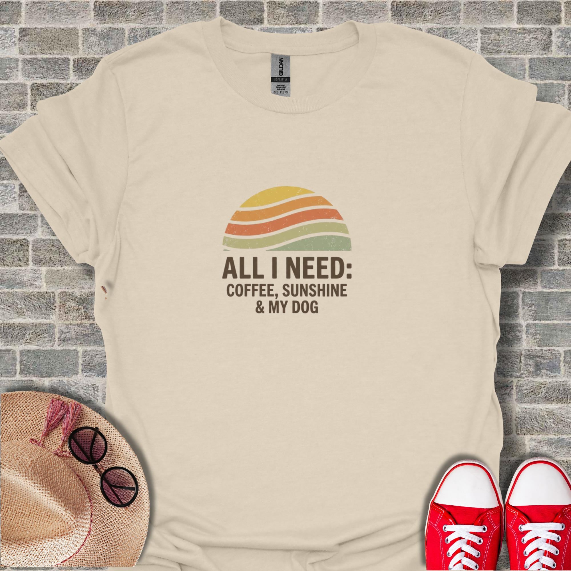 This T-shirt features a vintage inspired design perfect for dog lovers. The design showcases a retro sun graphic with the saying "All I Need: Coffee, Sunshine and My Dog". It is a perfect dog mom or dad gift!