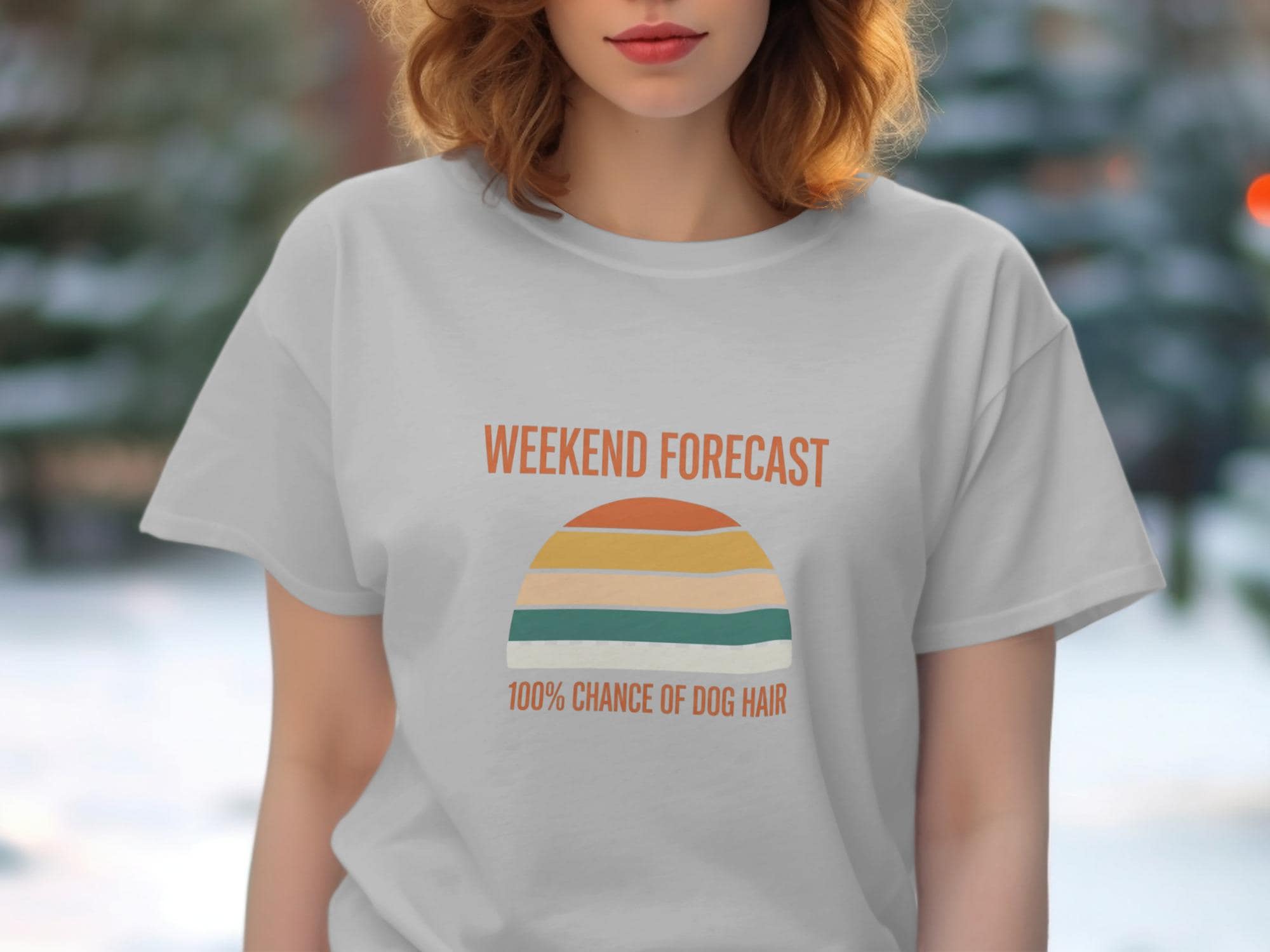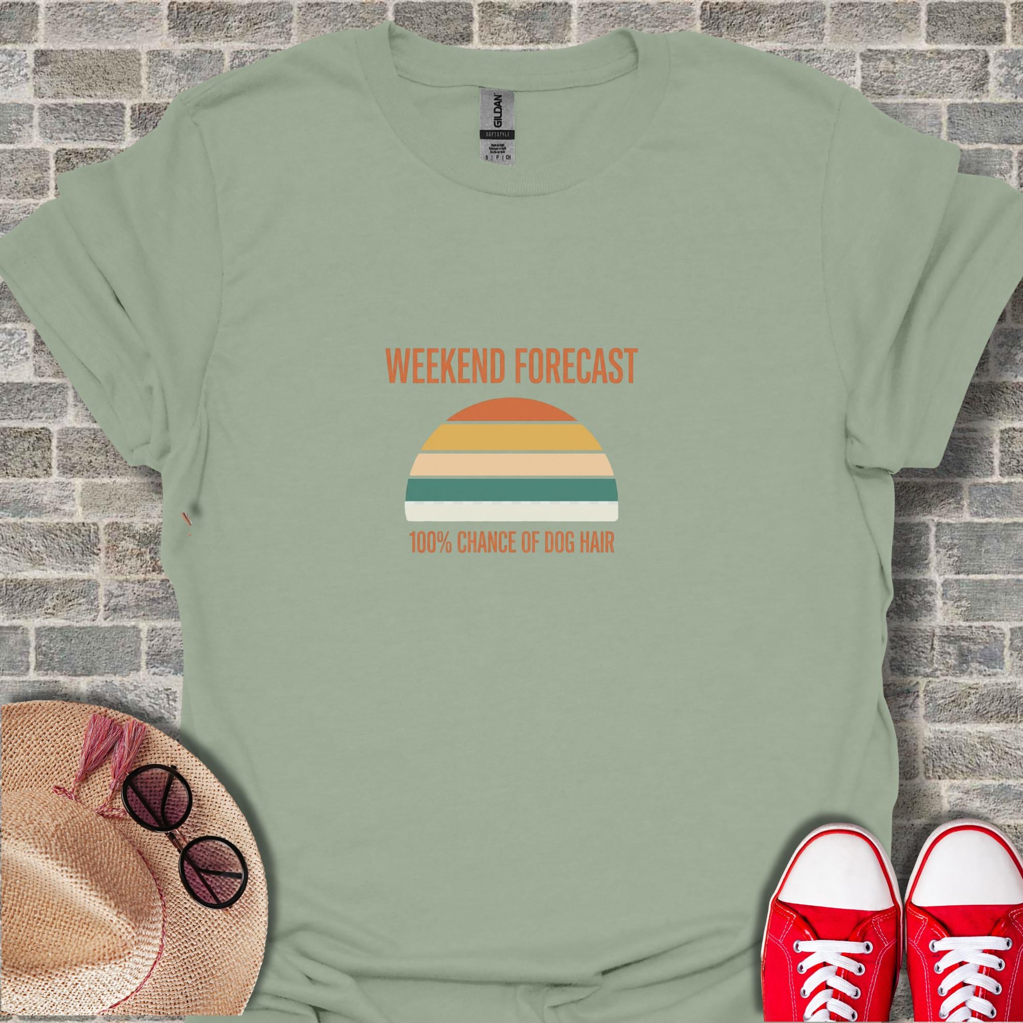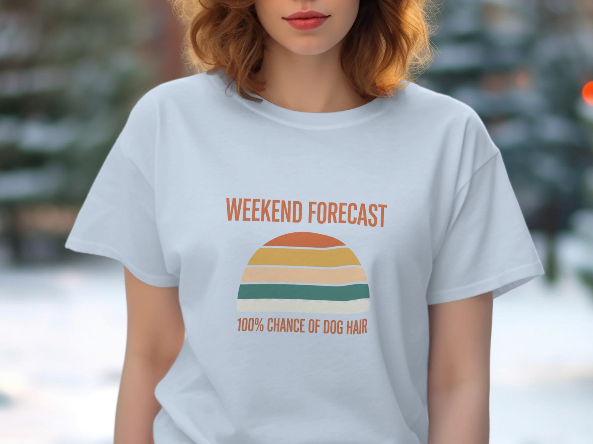 Embrace your love for dogs with this adorable "Weekend Forecast: 100% Chance of Dog Hair" design on a T-shirt. Perfect for dog moms, dog dads, and anyone who adores their furry friends. This funny and relatable shirt is sure to bring a smile to everyone's face. Get yours today and show off your dog-loving pride!