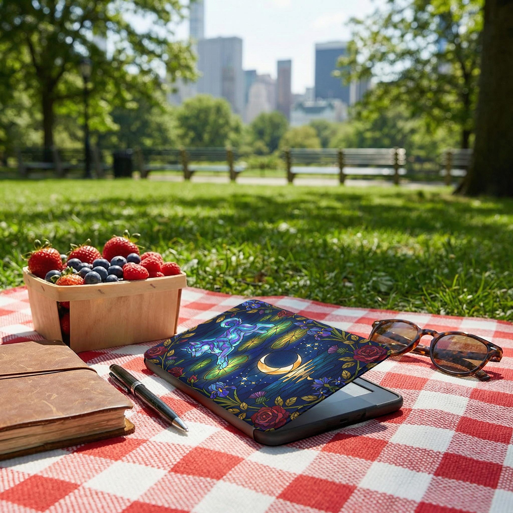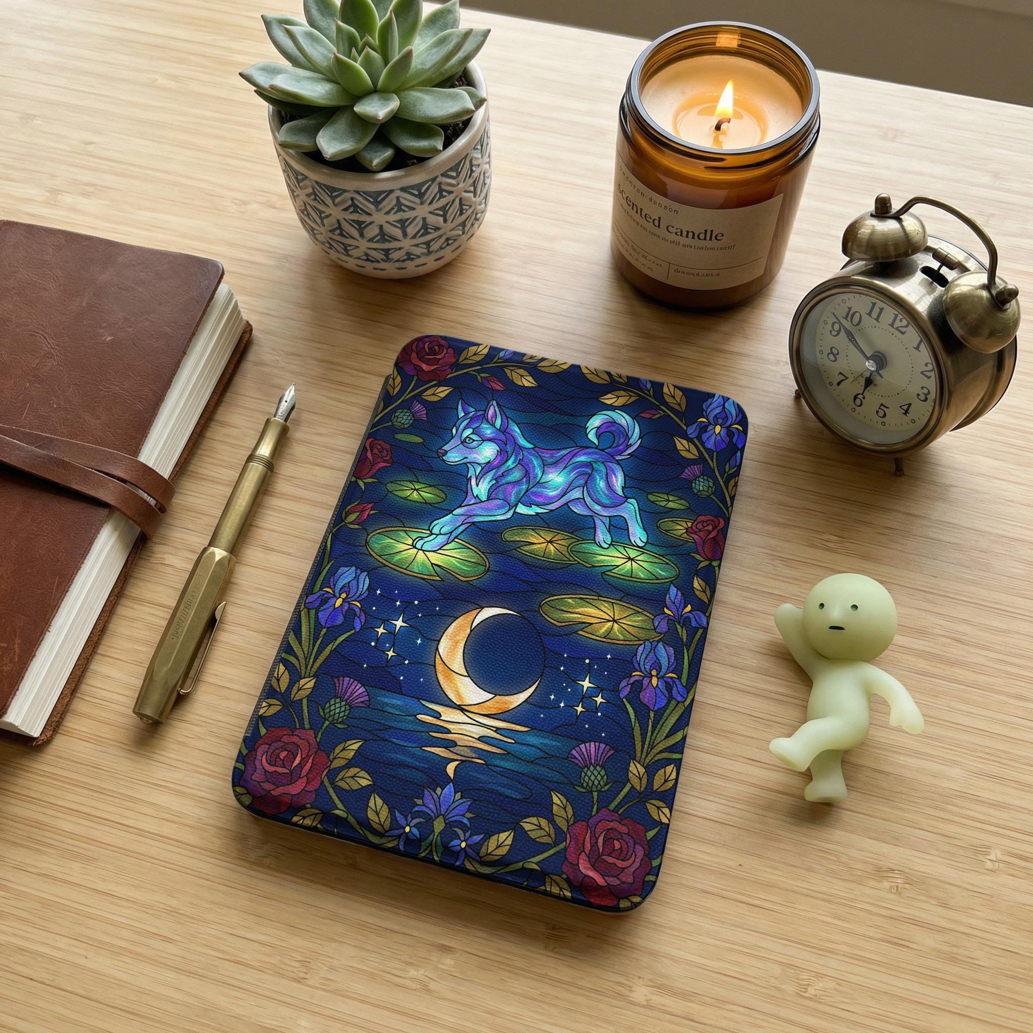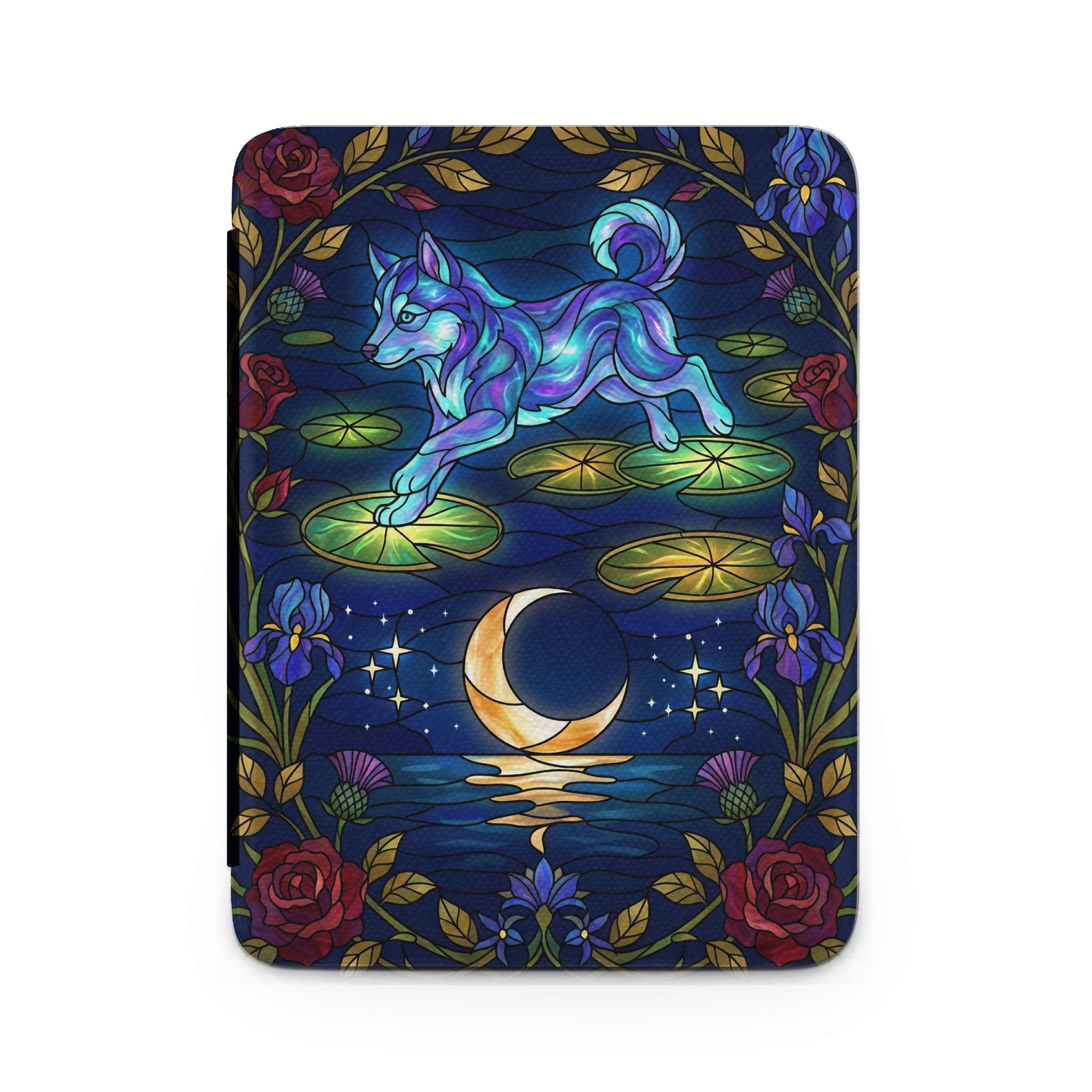 Enhance your reading experience with this stunning Kindle Case featuring a captivating stained glass design. The artwork showcases a majestic wolf gracefully leaping across lily pads under the enchanting glow of the moon and stars. Surrounded by beautiful roses, thistles and irises, this case is not only visually appealing but also provides reliable protection for your Kindle.